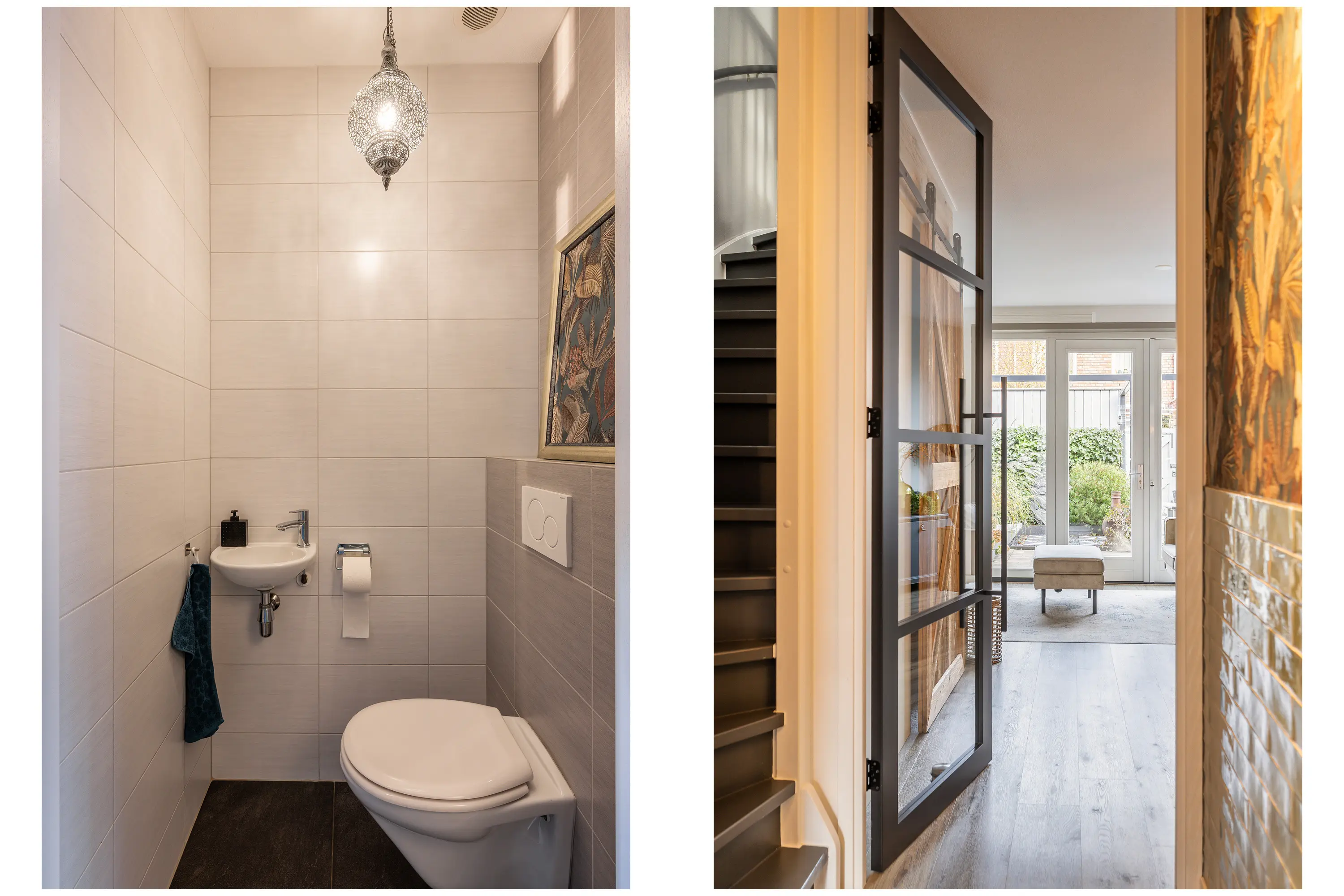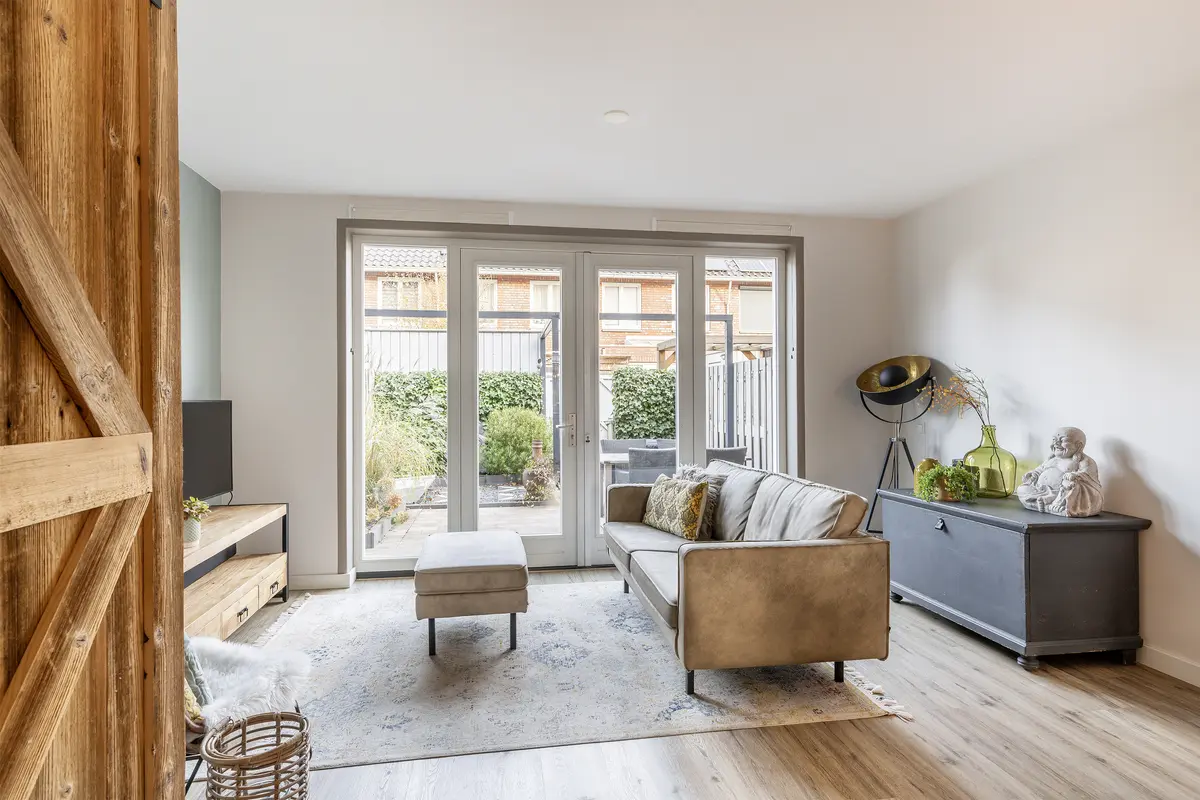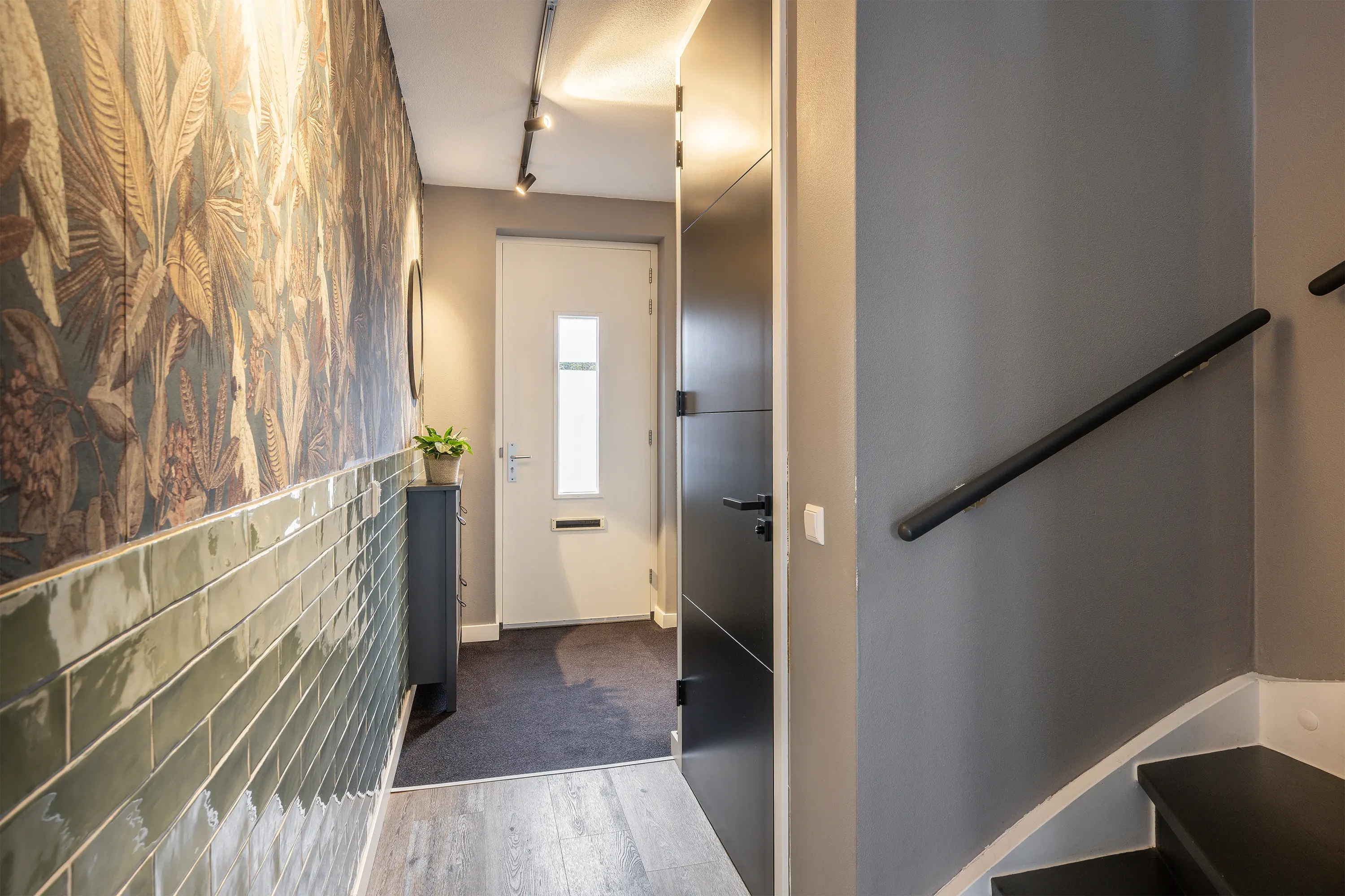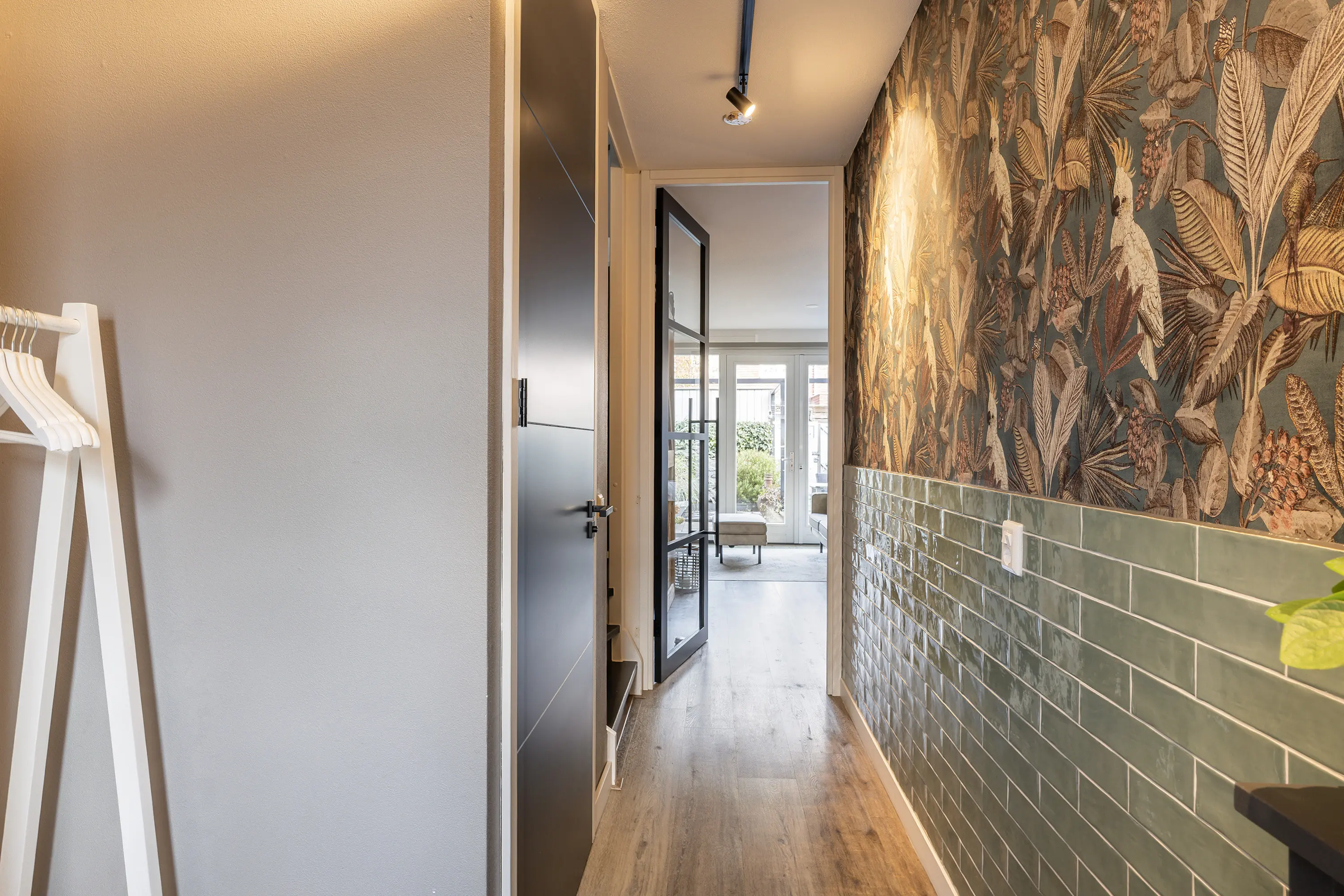 Achter de entree van de woning bevindt zich een knusse hal met betegelde lambrisering, alwaar de meterkast, toiletruimte en vaste trapopgang naar de verdieping. Een hardhouten tussendeur met metaallook leidt naar de sfeervolle woonkamer waar het vele daglicht dat via de openslaande deuren naar binnen valt heel kenmerkend is.