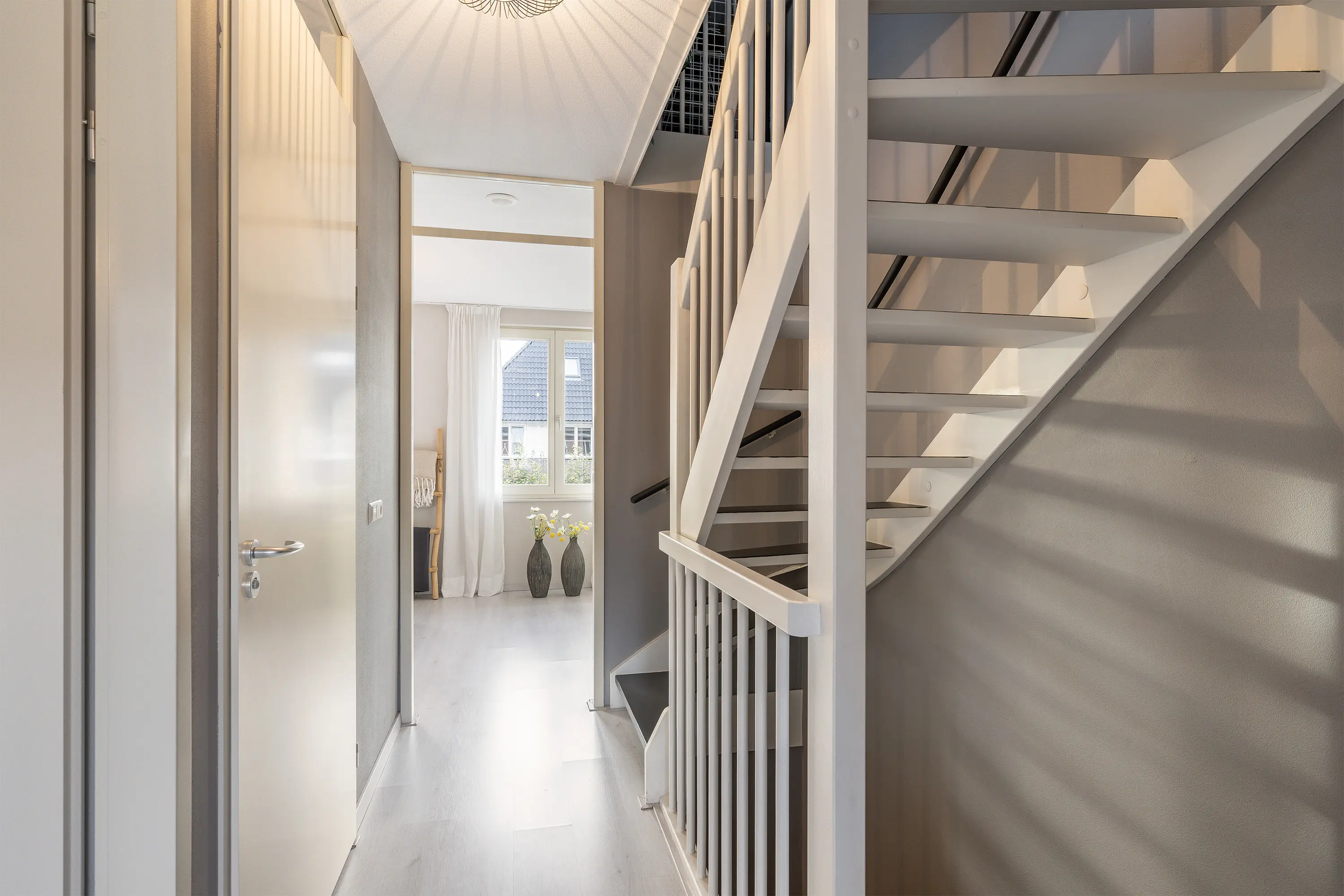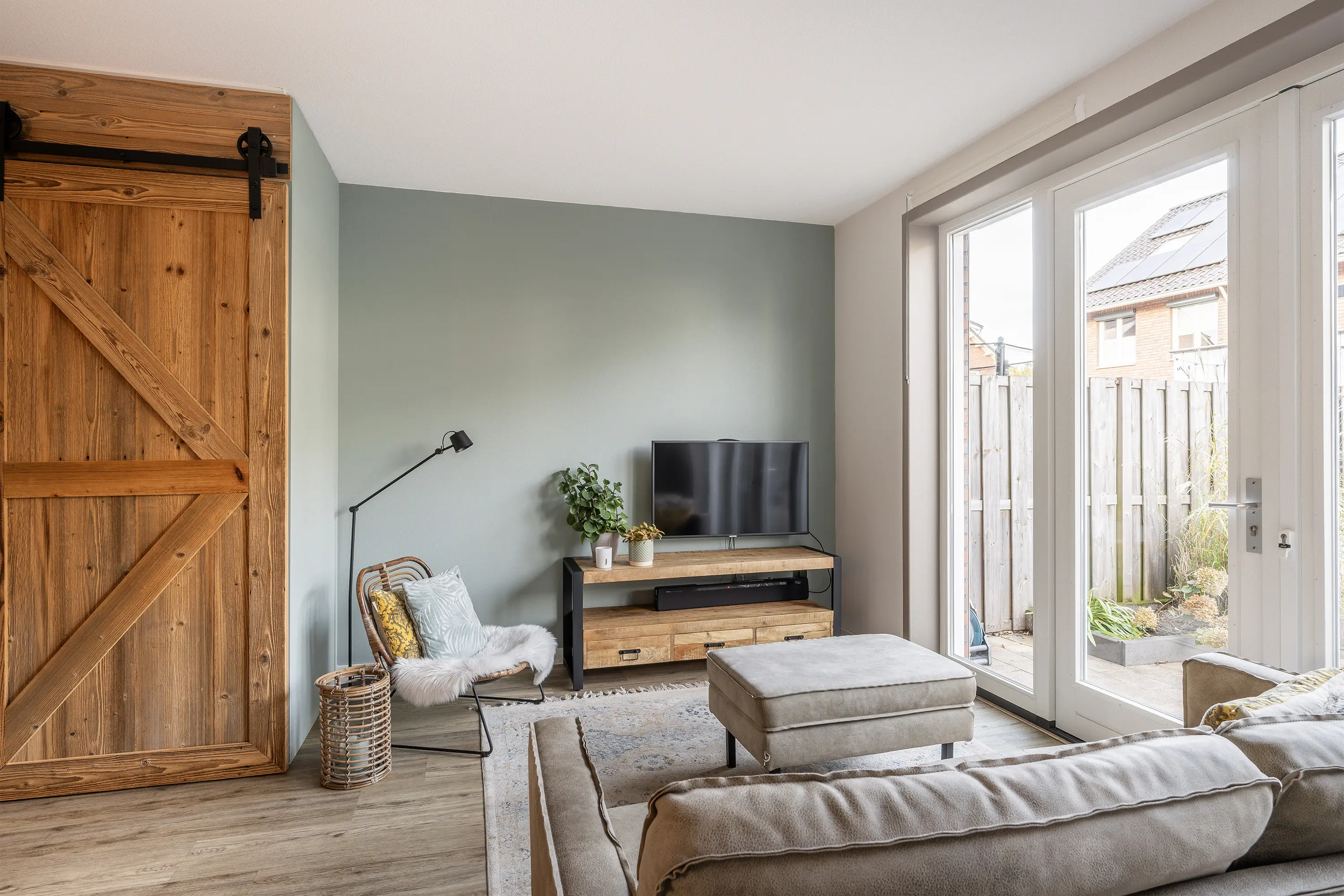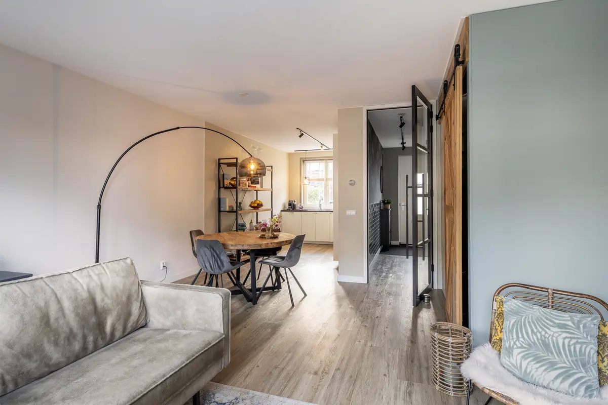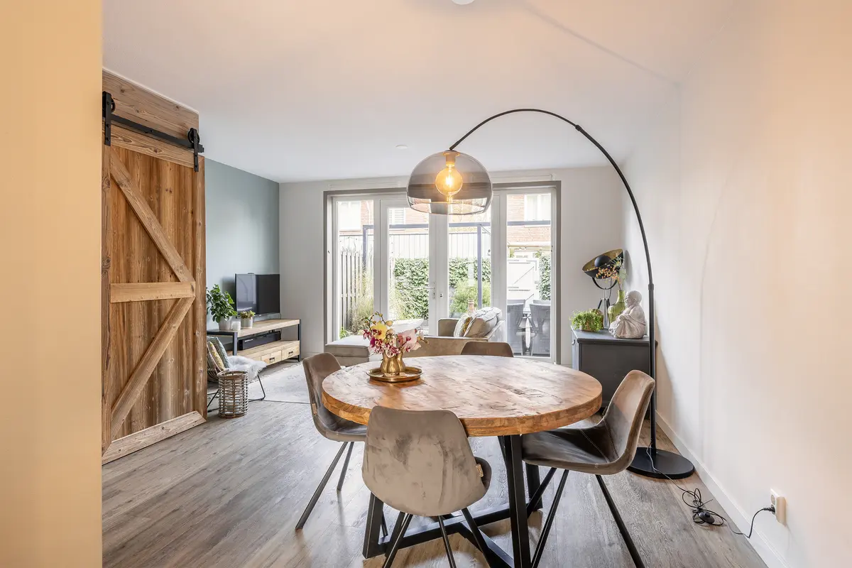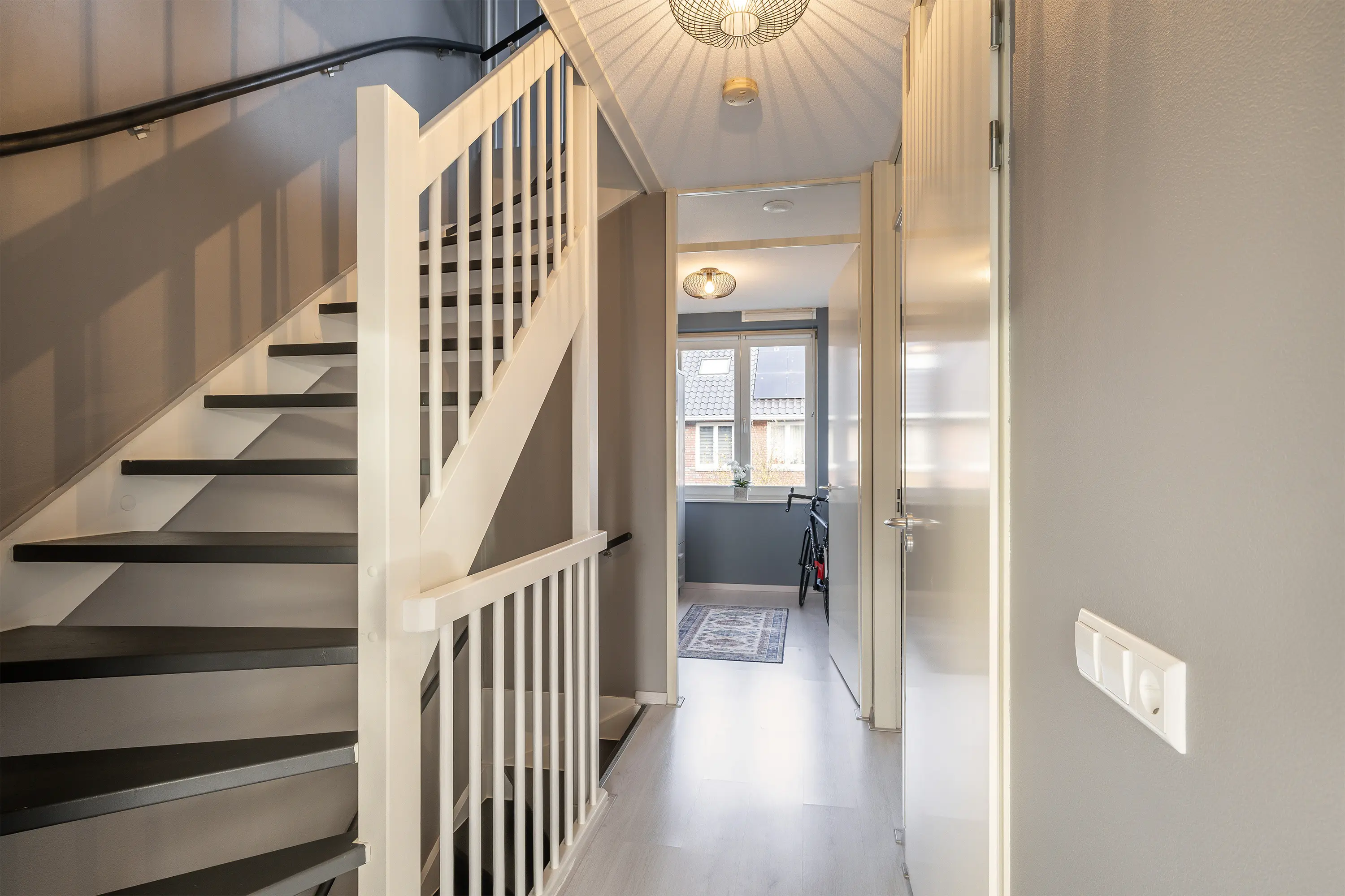 Achter de entree van de woning bevindt zich een knusse hal met betegelde lambrisering, alwaar de meterkast, toiletruimte en vaste trapopgang naar de verdieping. Een hardhouten tussendeur met metaallook leidt naar de sfeervolle woonkamer waar het vele daglicht dat via de openslaande deuren naar binnen valt heel kenmerkend is.