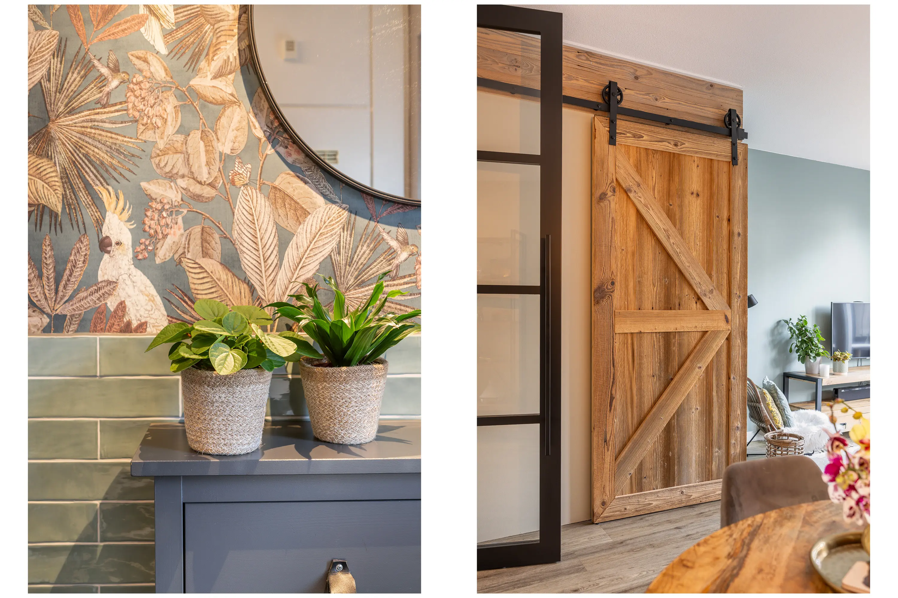 De bergruimte in de trapkast is toegankelijk middels een stoere houten schuifdeur.