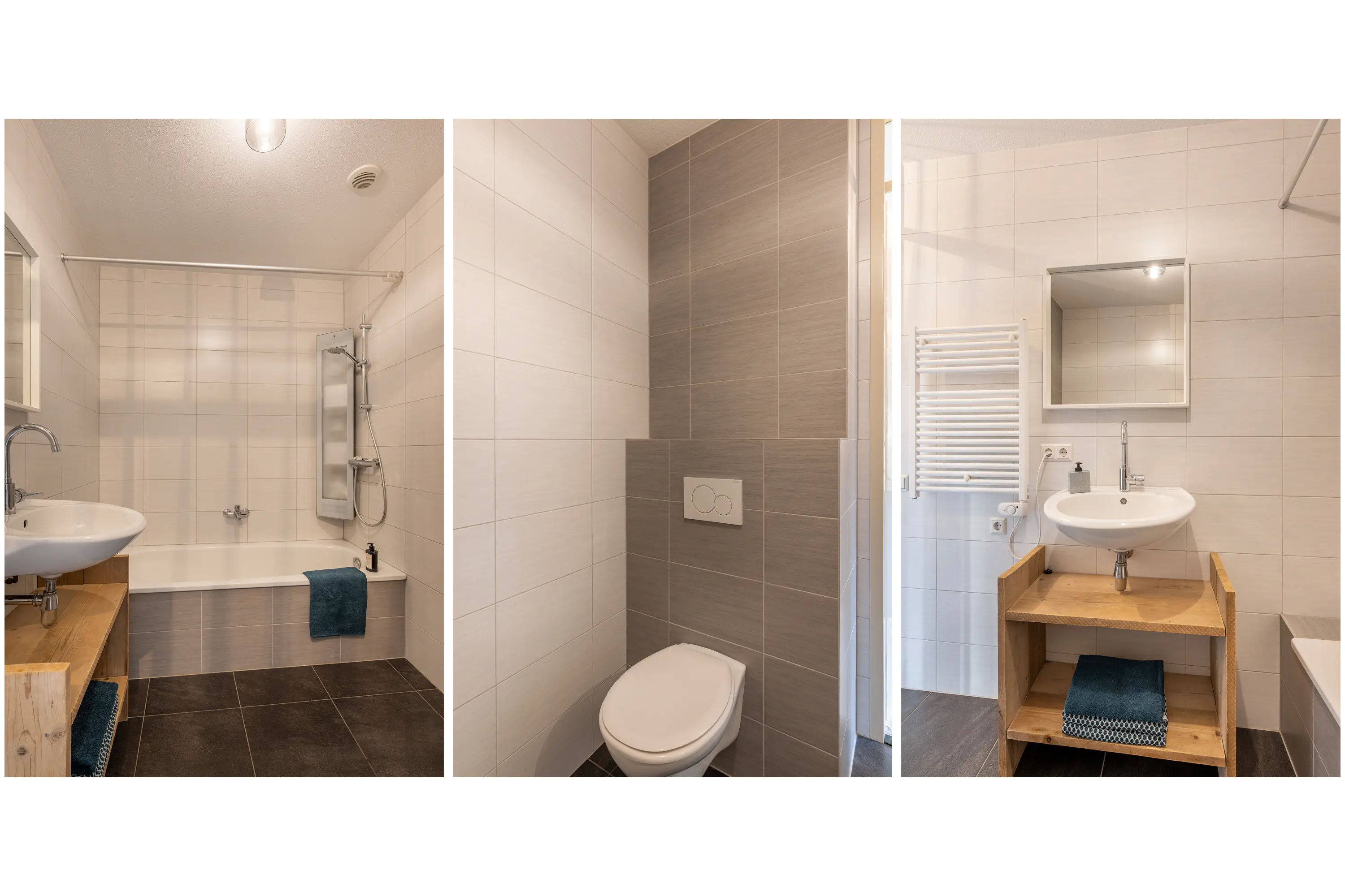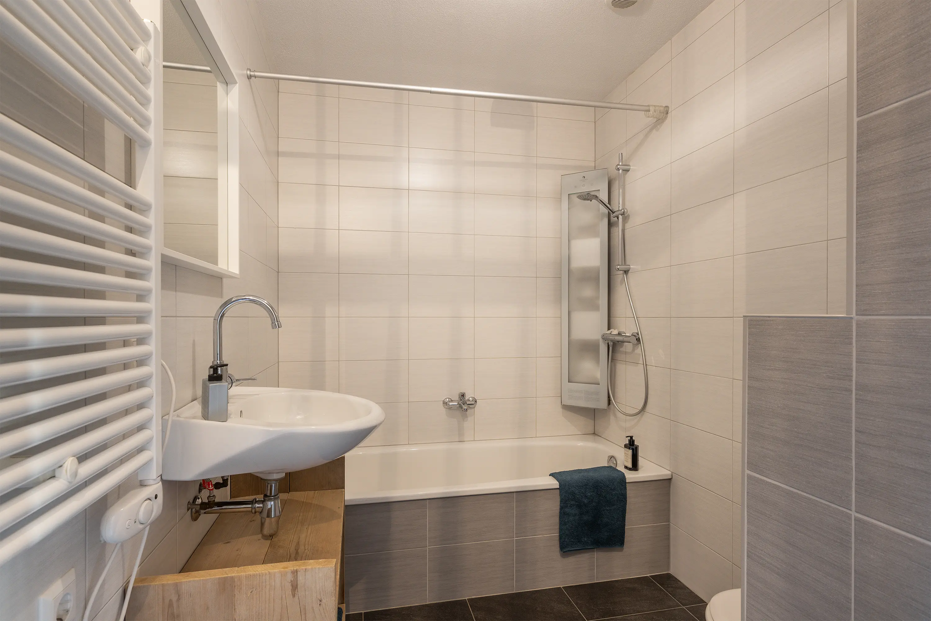 De centraal op de verdieping gevestigde badkamer in neutrale kleurstelling is ingericht met ligbad met douche, wastafel met meubel en tweede toilet.