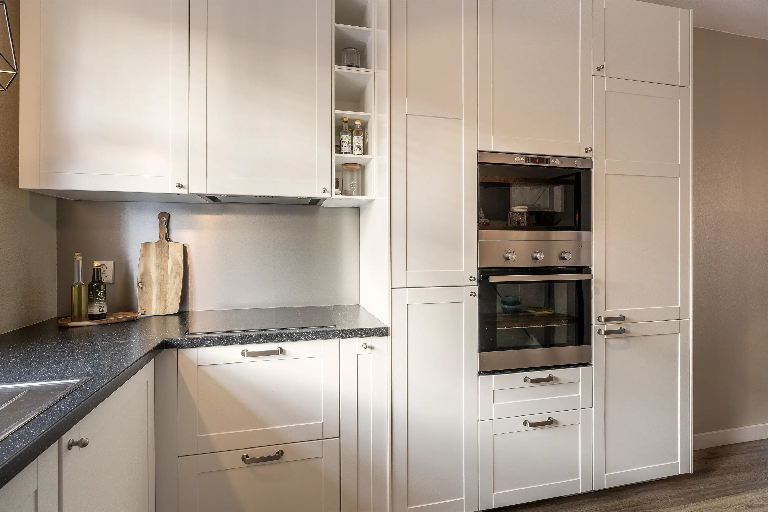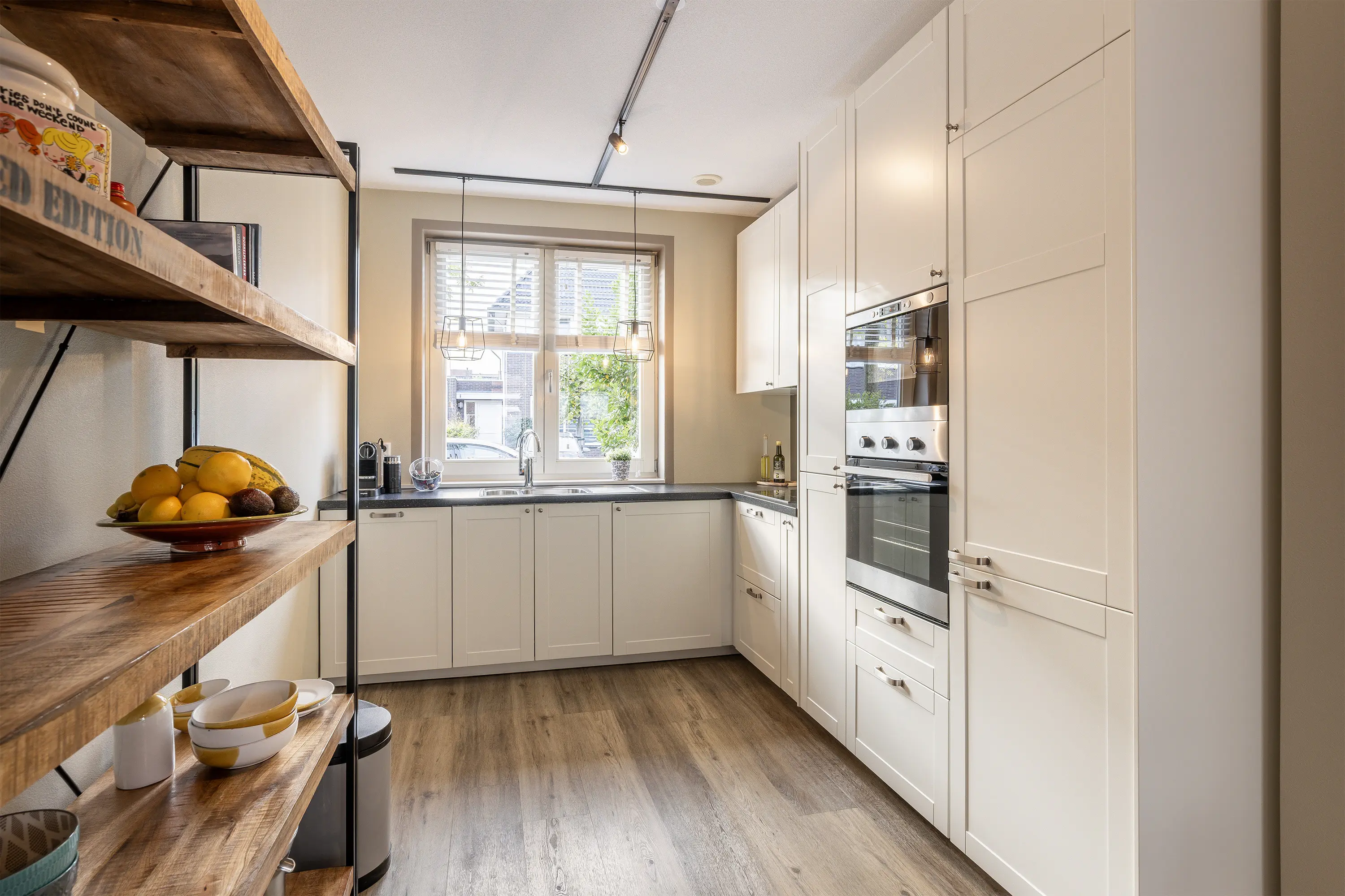 Aan de voorzijde is een open keuken gevestigd, in L-opstelling, met lichte fronten en een donker werkblad.