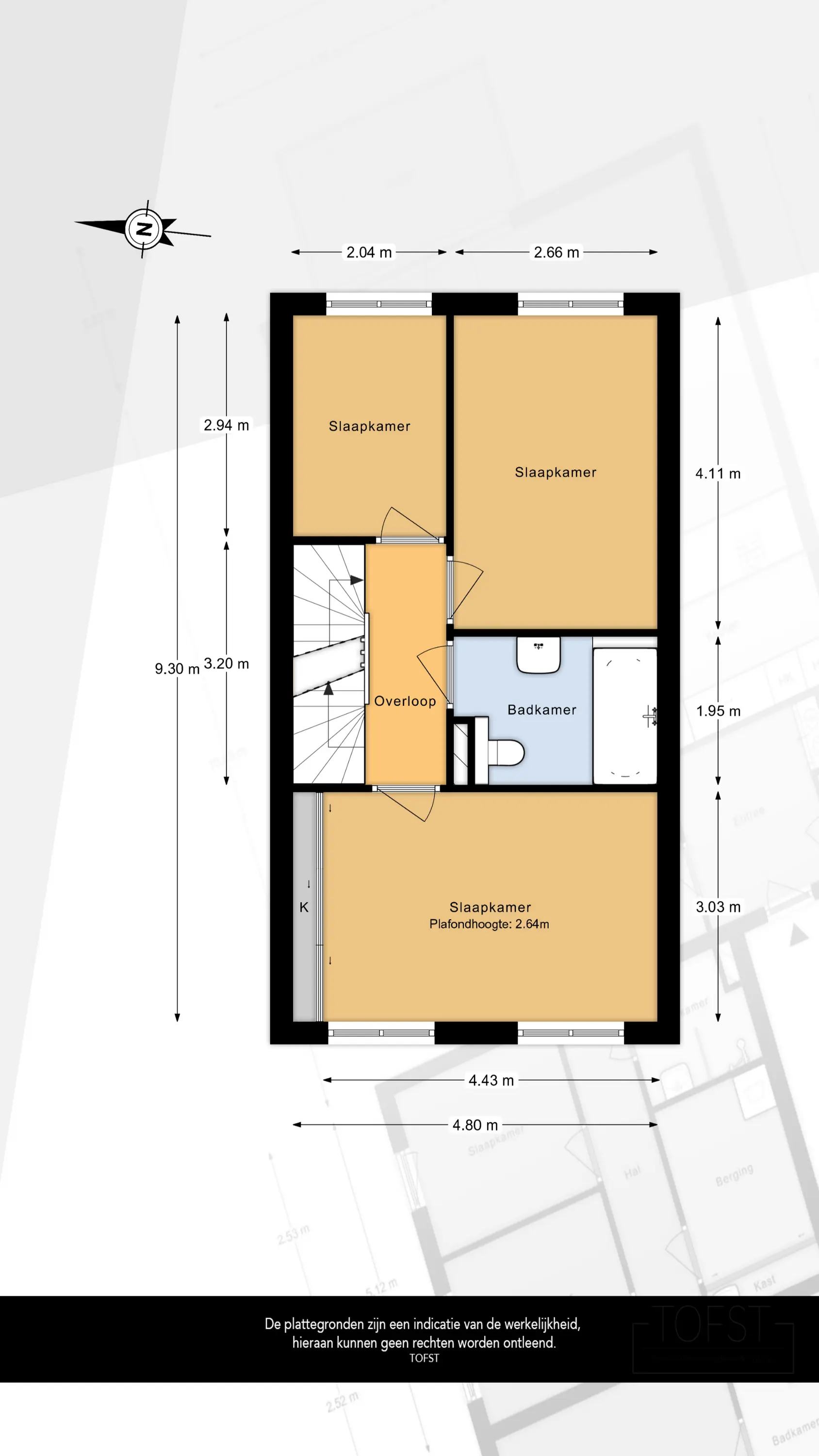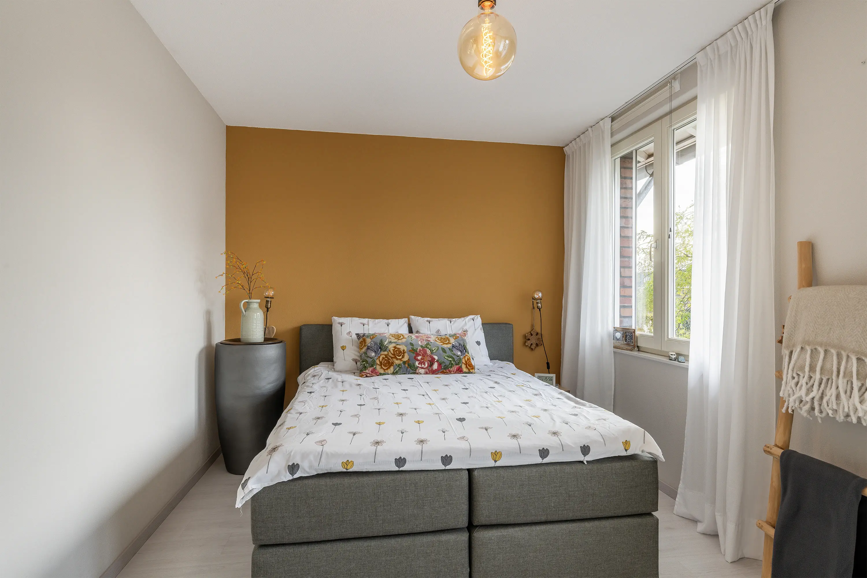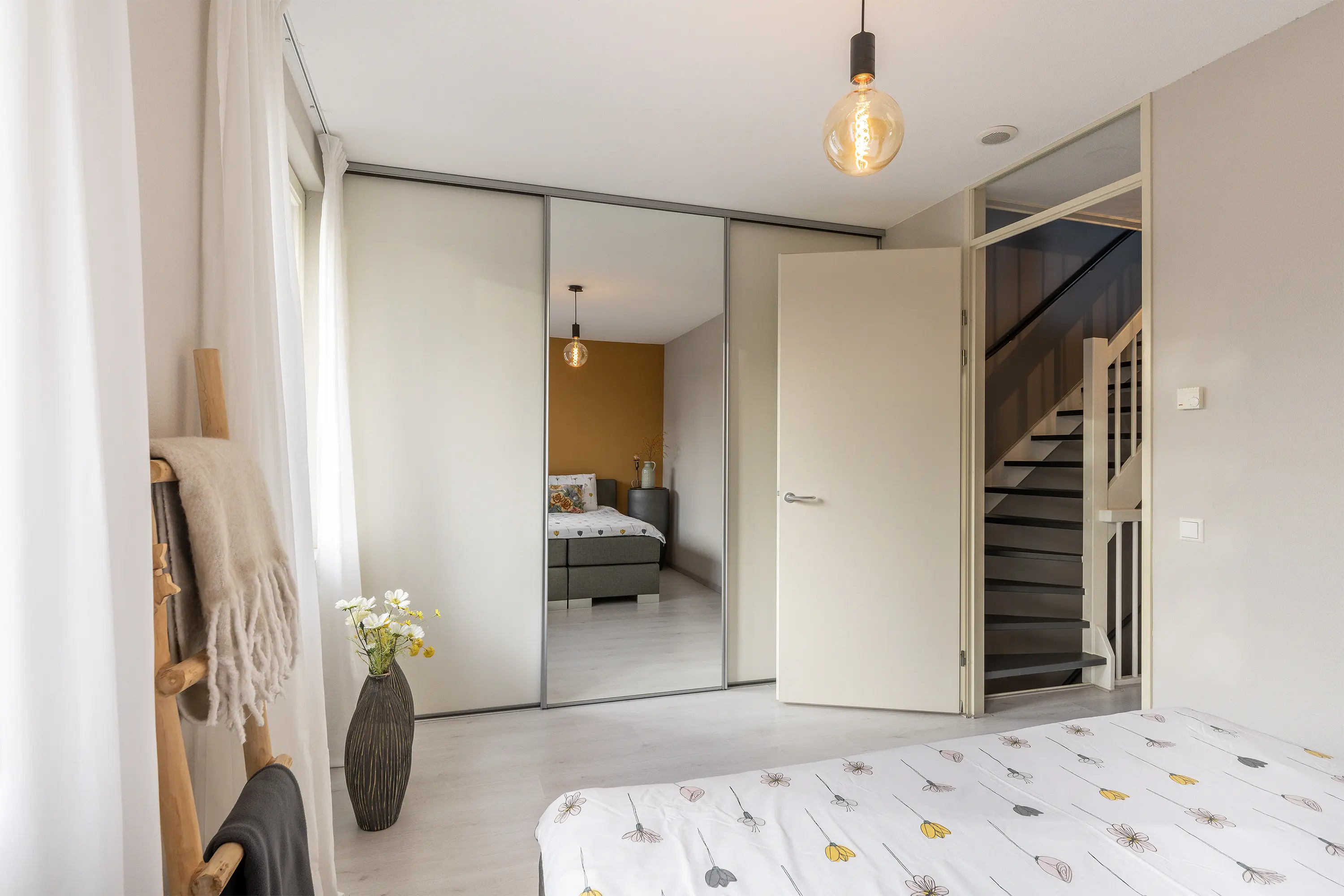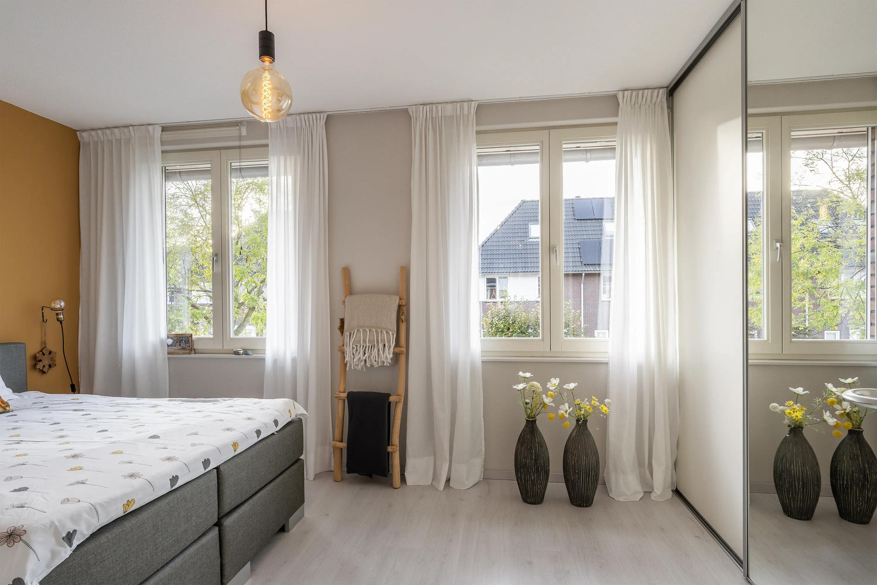 De hoofdslaapkamer aan de voorzijde heeft een dubbele raampartij met te openen draai-/kiepramen en een schuifwandenkast met spiegeldeur en kastindeling (blijft achter).