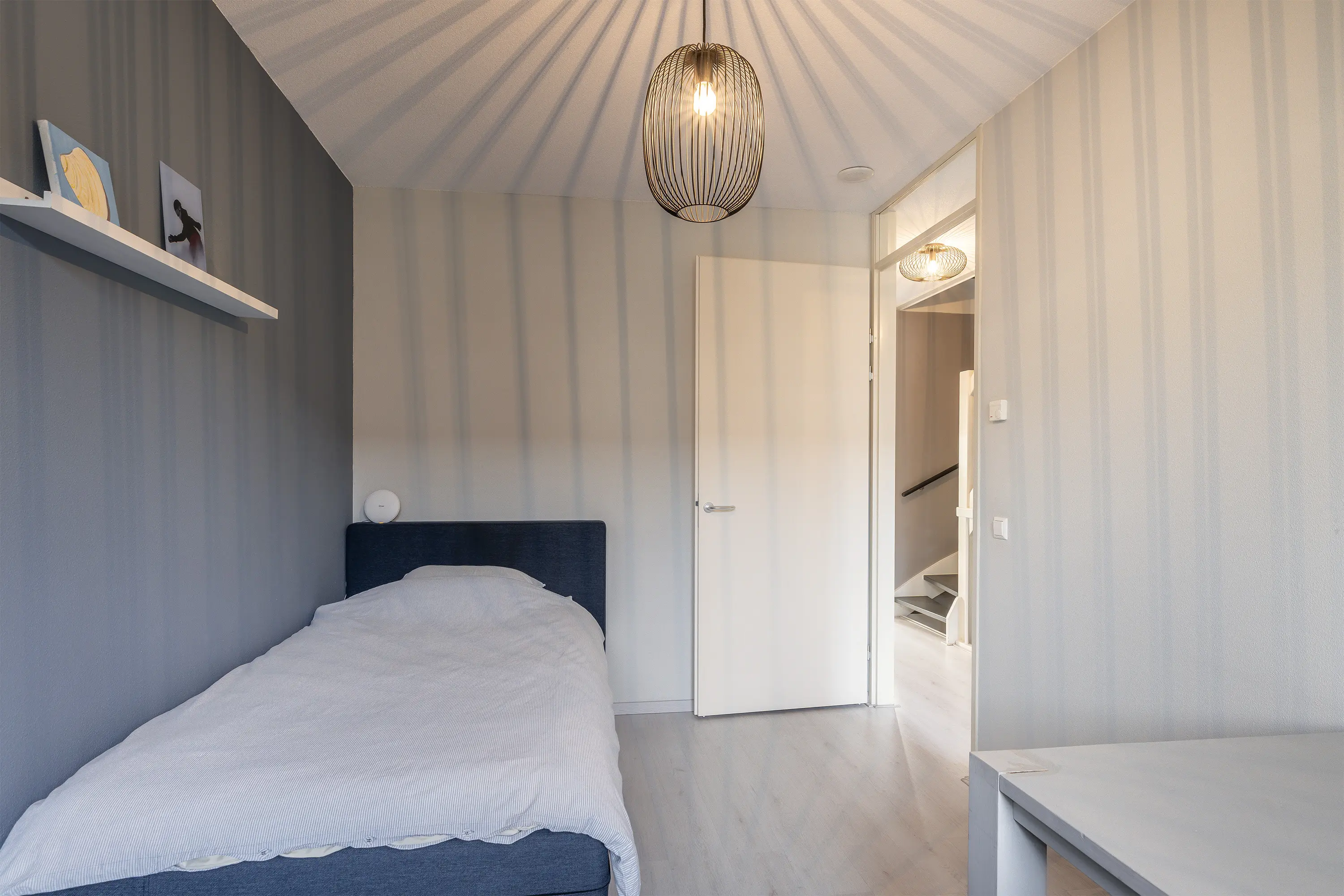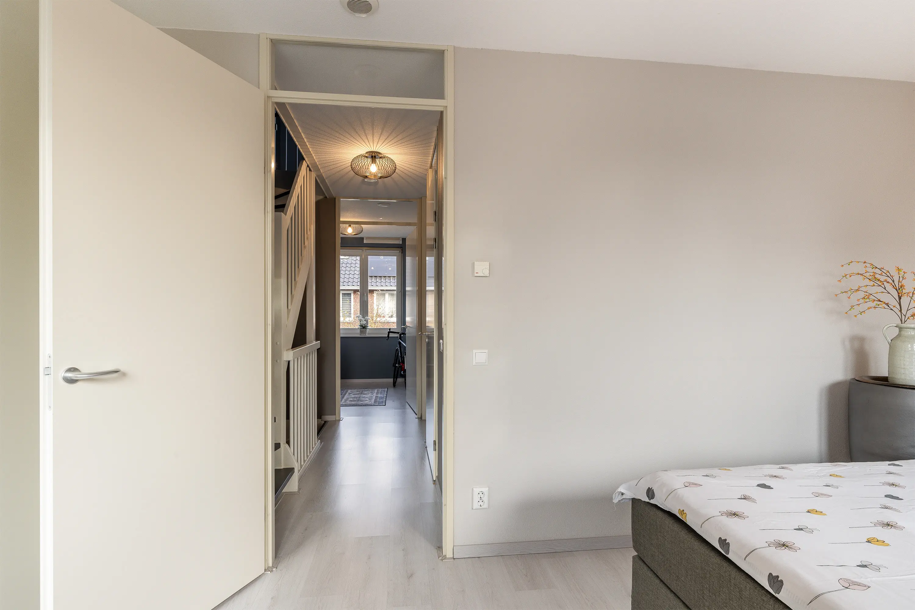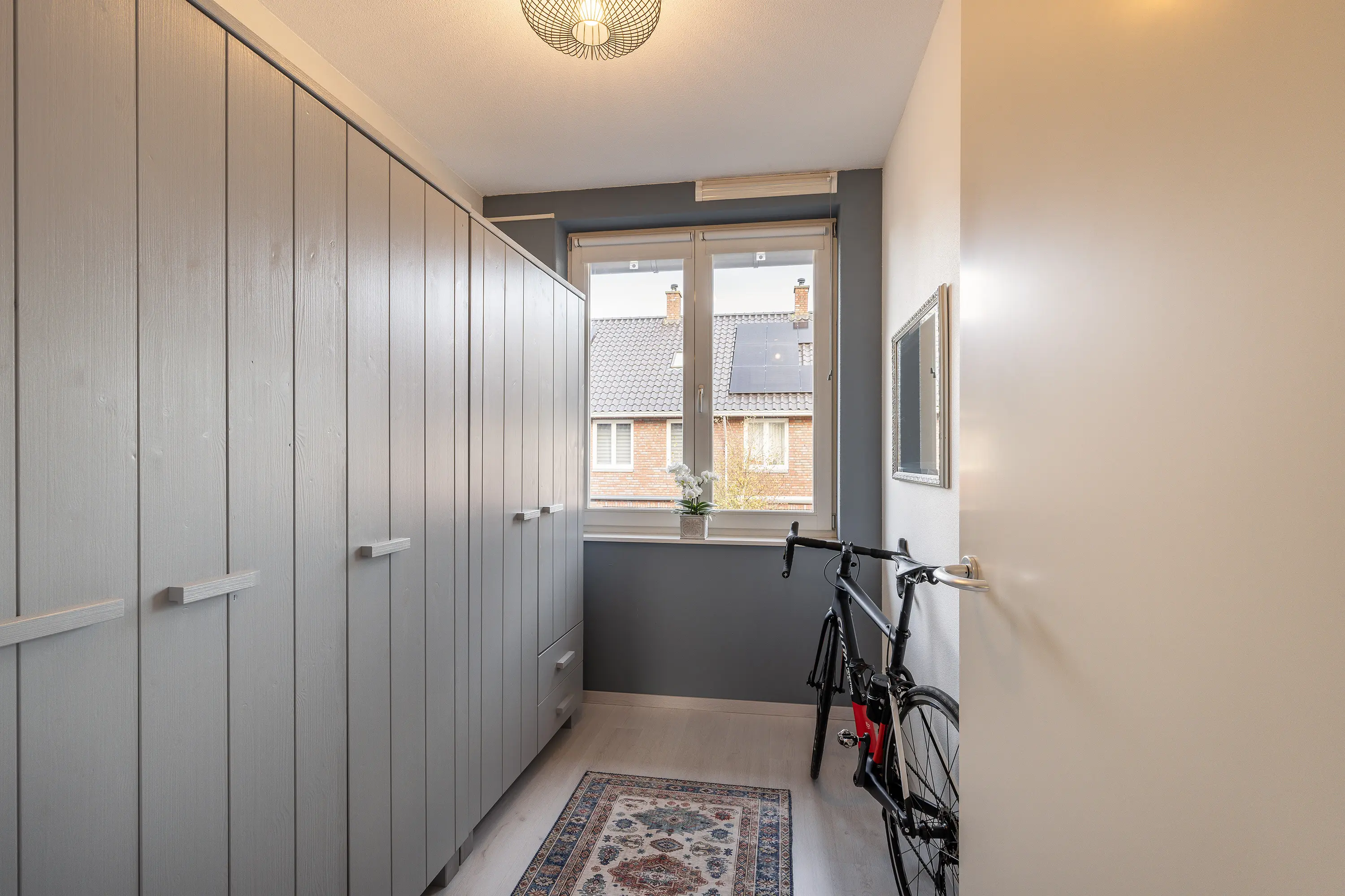 Twee kamers bevinden zich aan de tuinzijde van de woning, waarbij de kleinste momenteel is ingericht als 'inloopkast'. Beide hebben eveneens hardhouten kozijnen met draai-/kiepramen, over de gehele eerste verdieping ligt een neutrale laminaavloet.