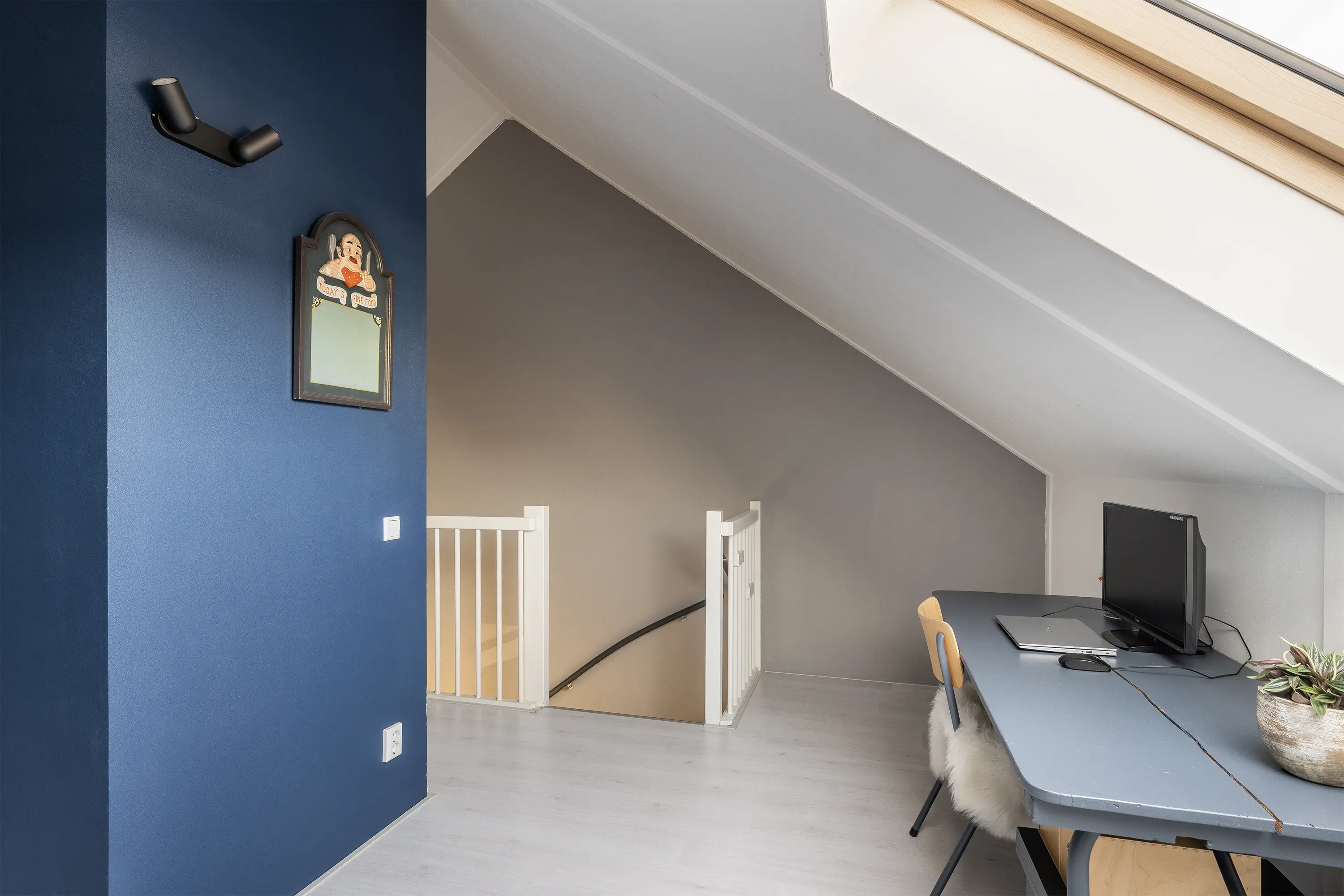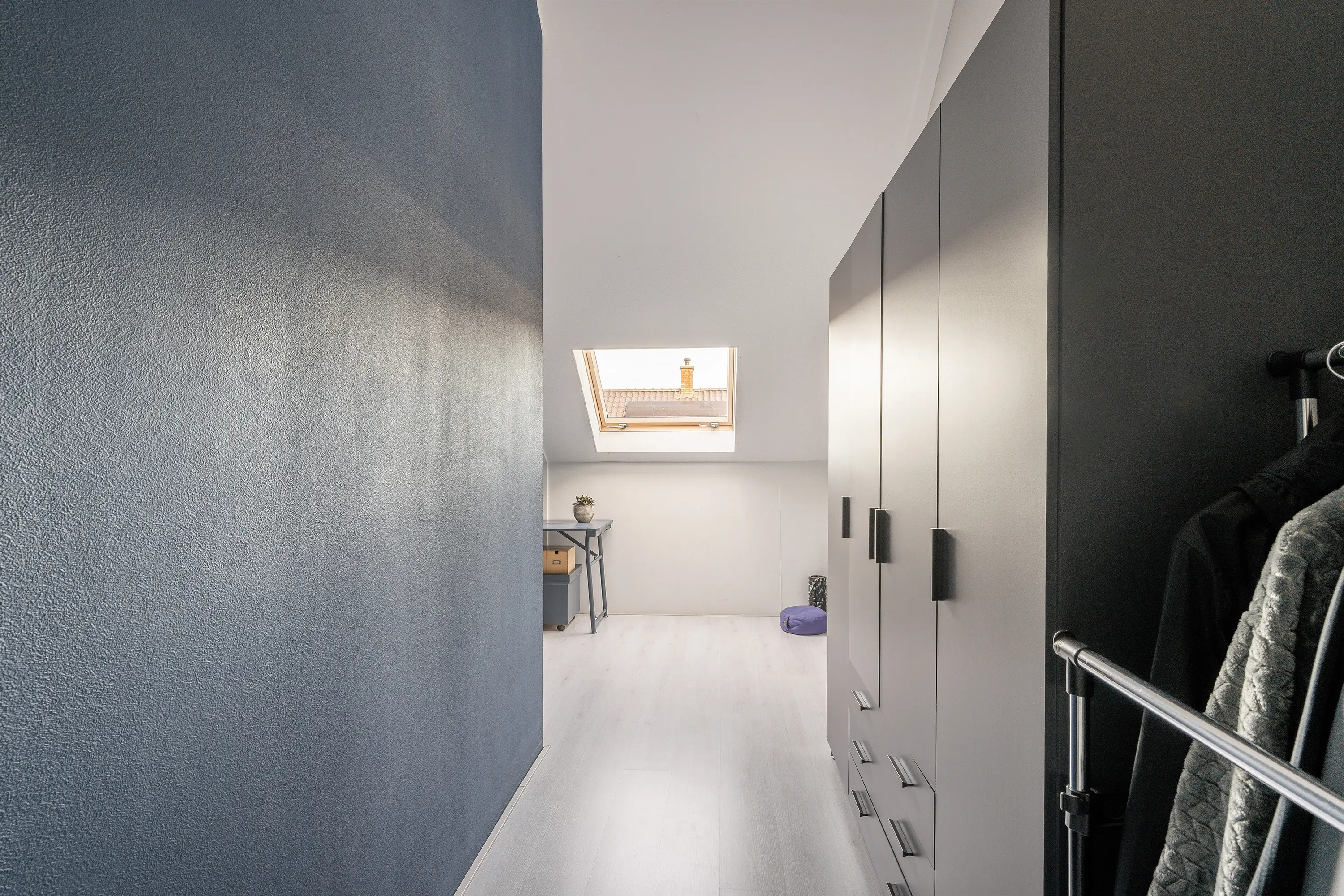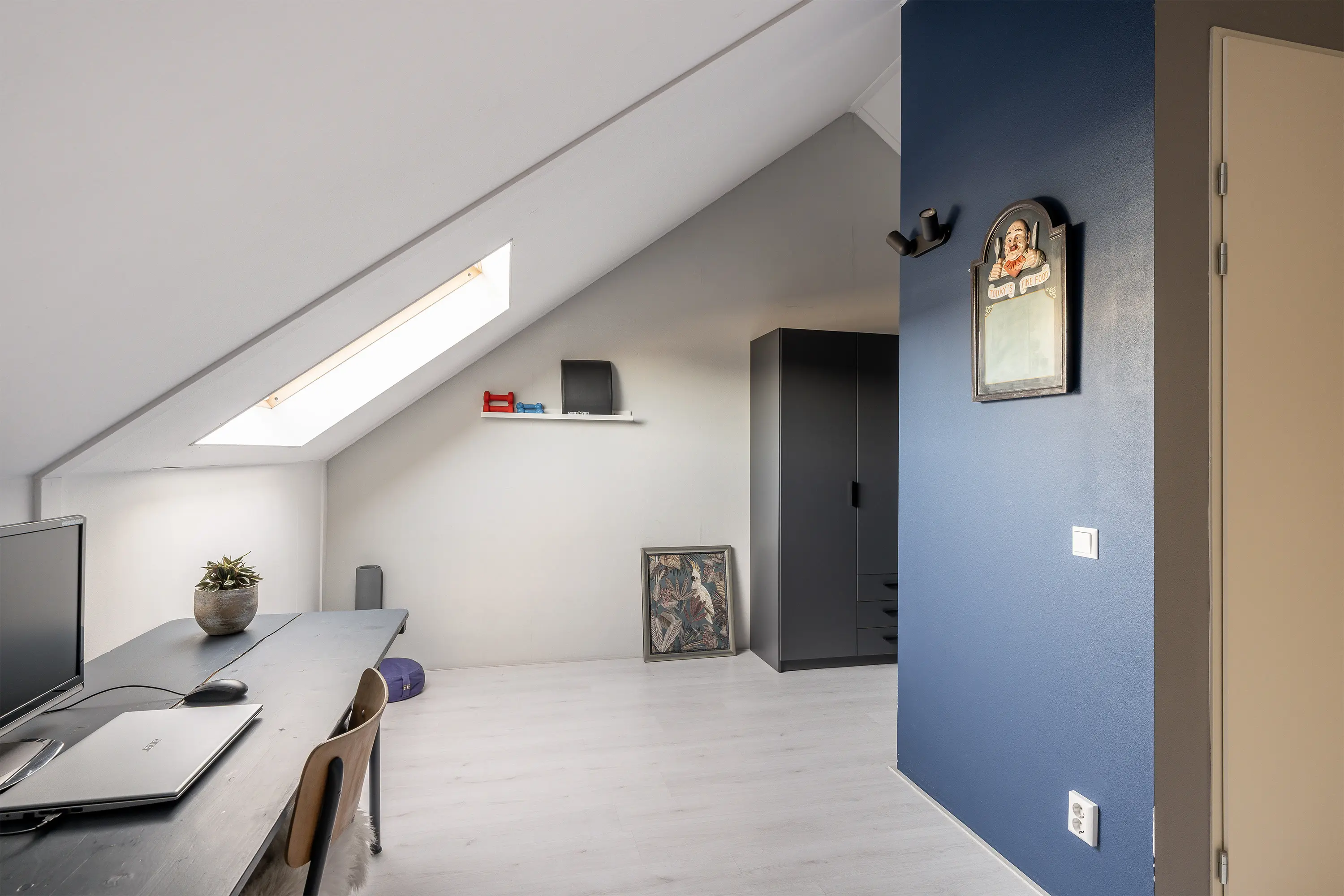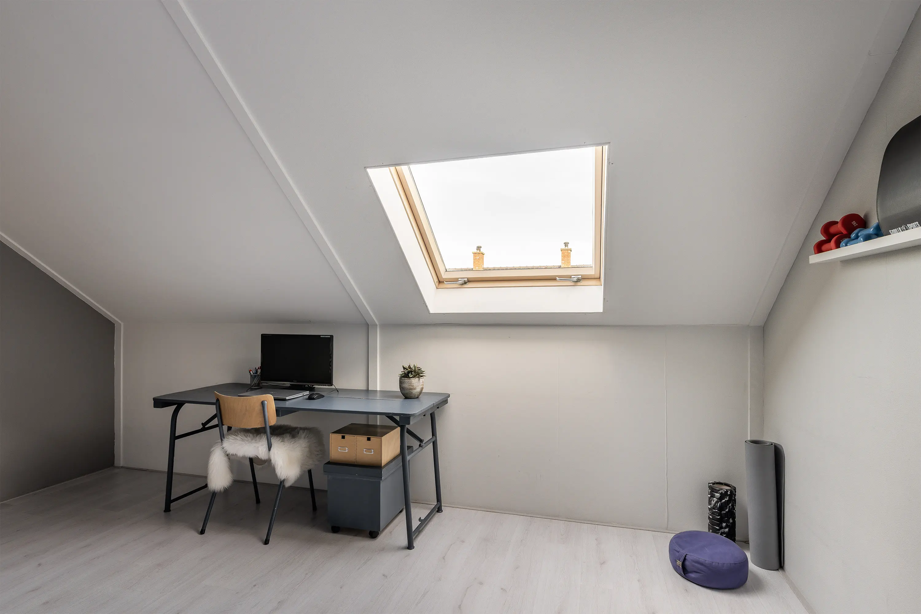 Aan de achterzijde zorgt een groot Velux dakraam voor daglicht toetreding op deze verdieping.