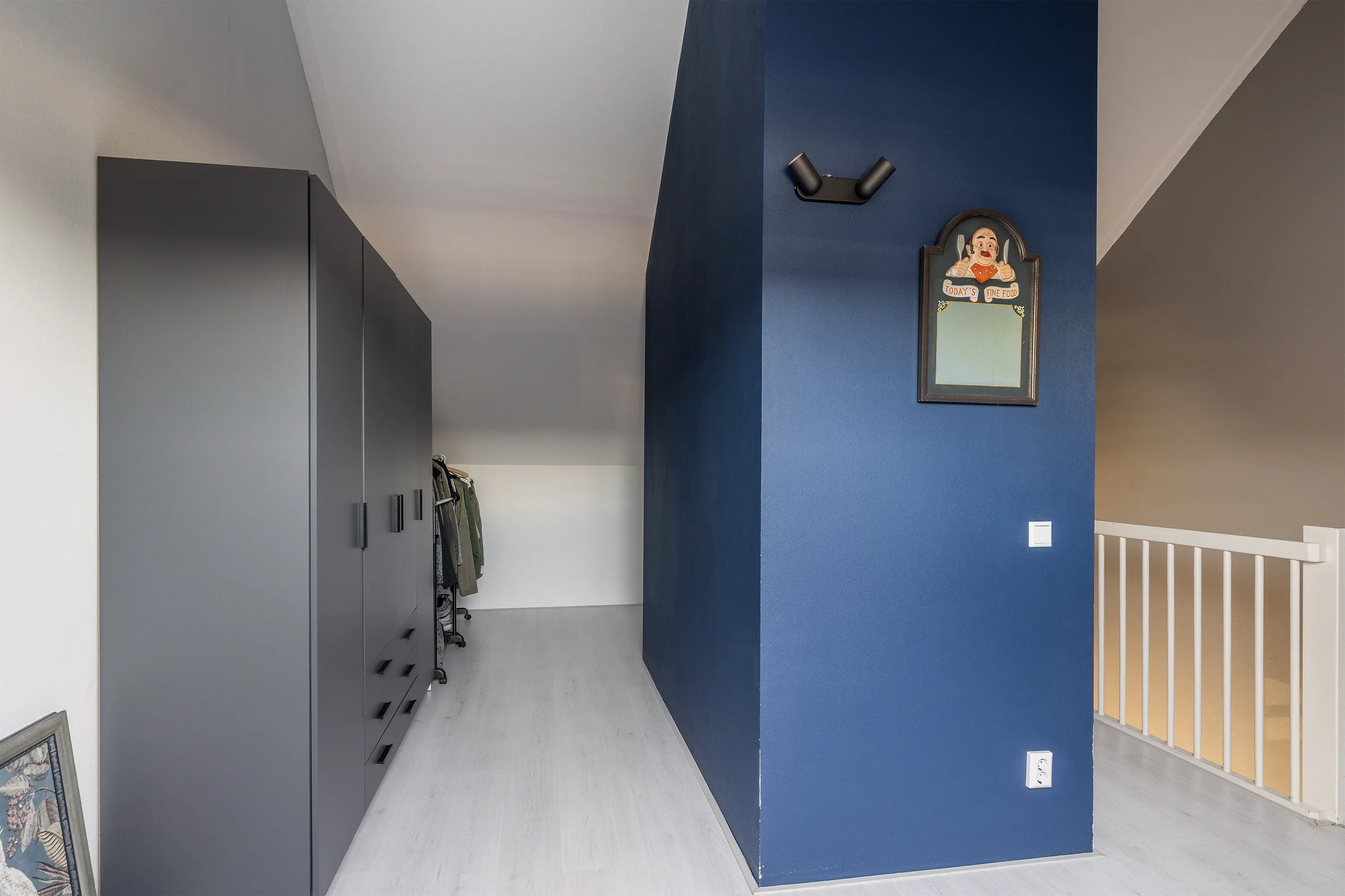 Centraal op de verdieping zijn de diverse installaties voor de warmtepomp, omvormer zonnepanelen en mechanische ventilatie gevestigd, evenals de aansluiting voor wasmachine en droger, netjes weggewerkt in een kast.