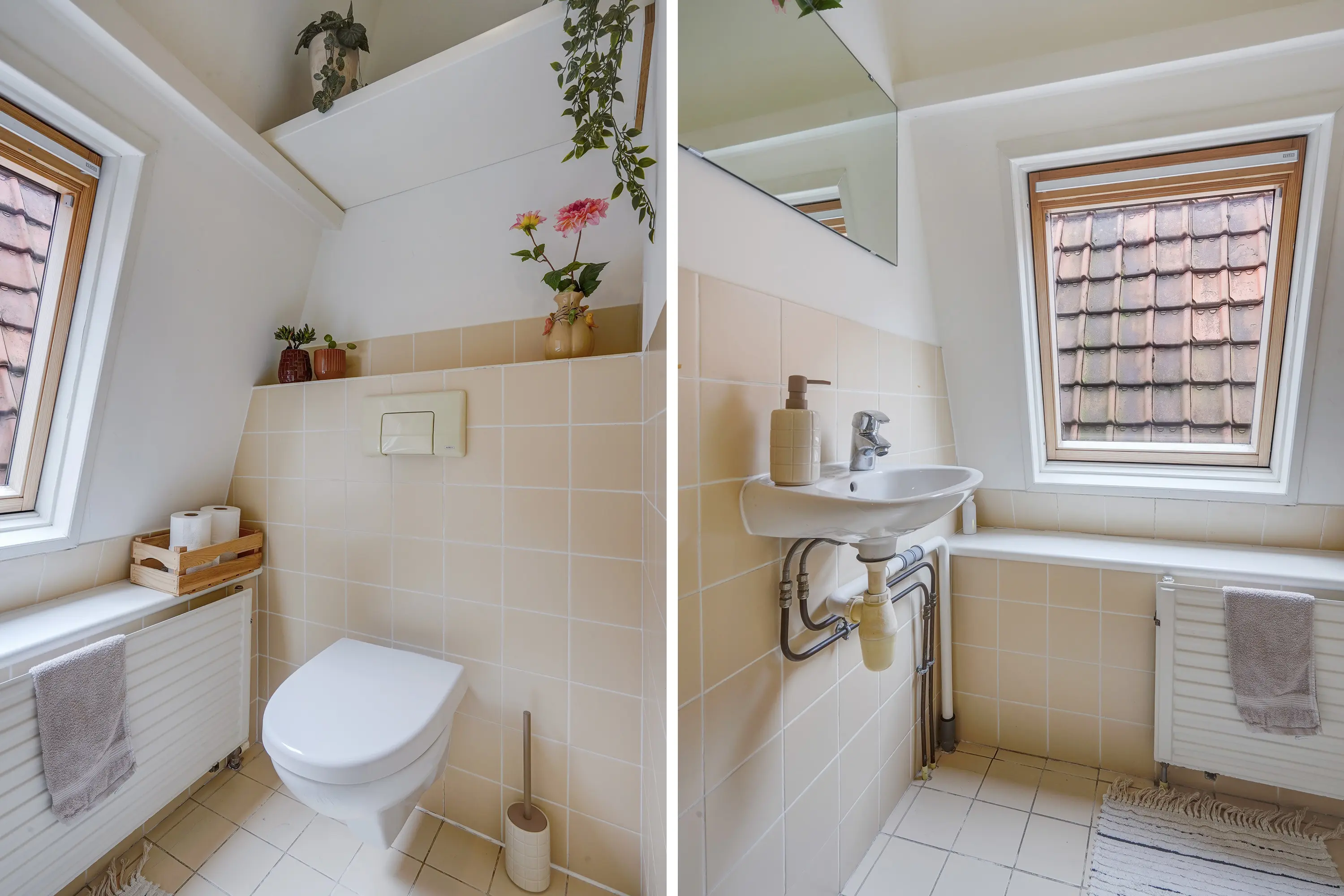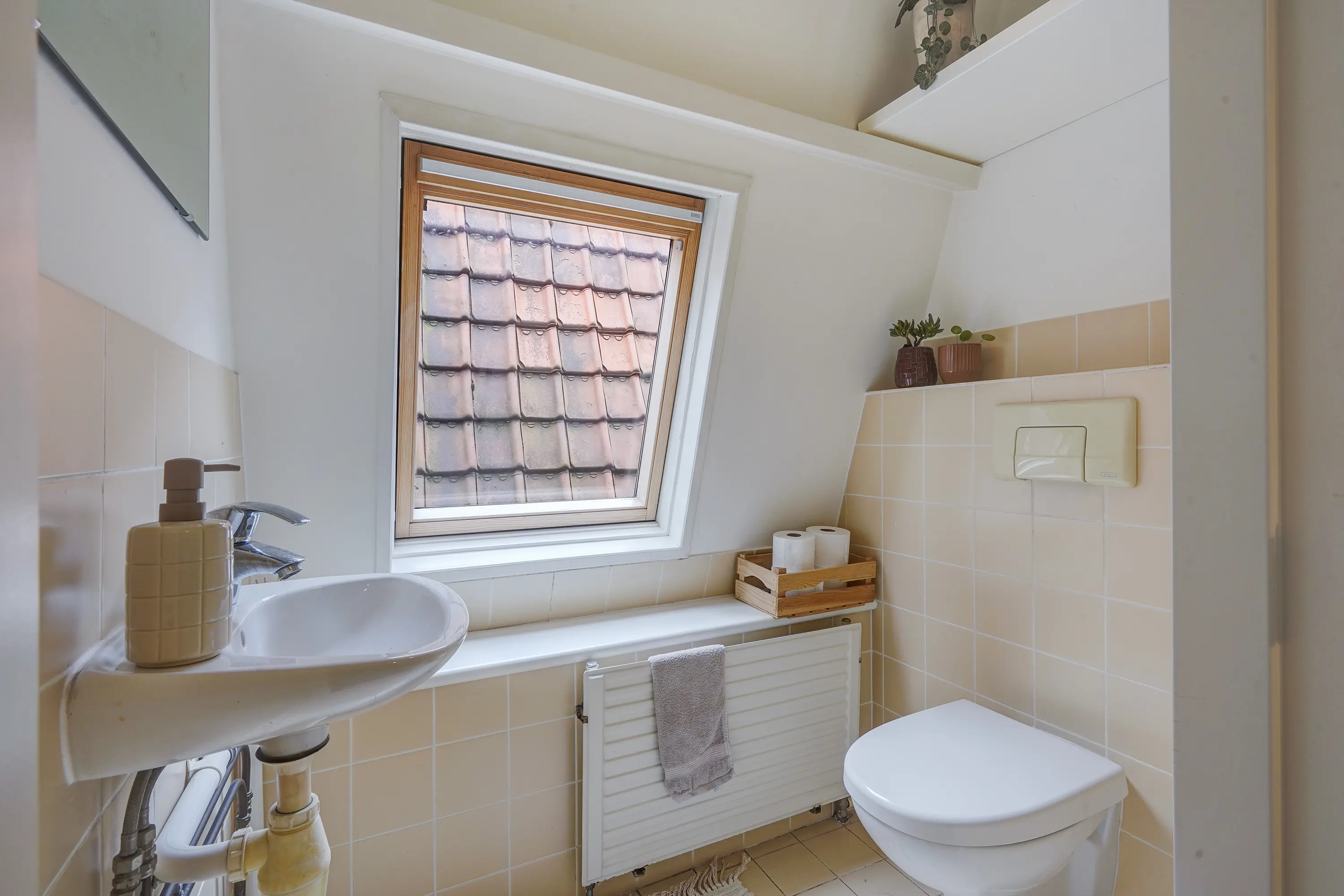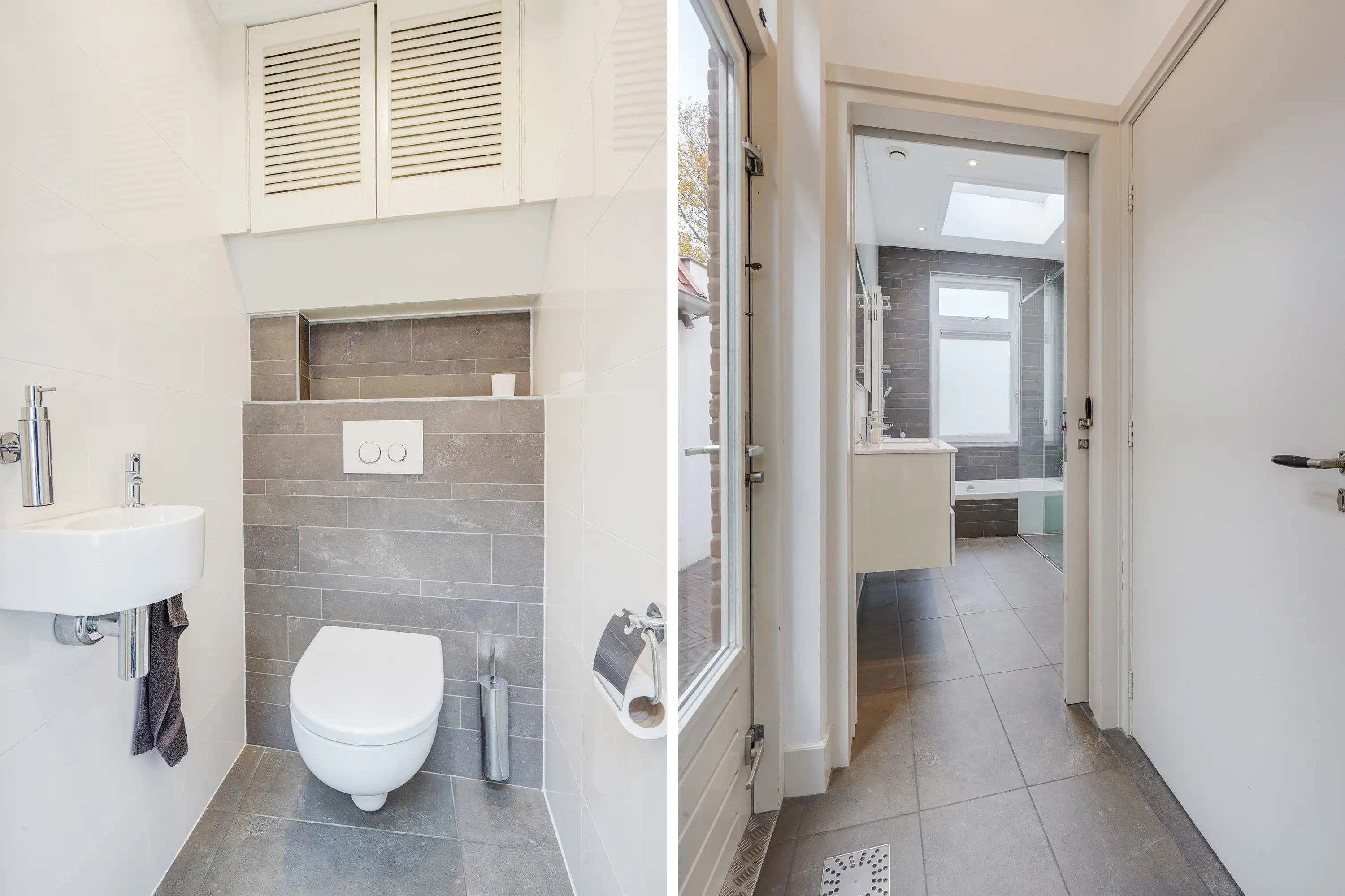 Achter de keuken bevinden zich een separate toiletruimte en de modern ingerichte badkamer, uitgebouwd en vergroot in 2016.