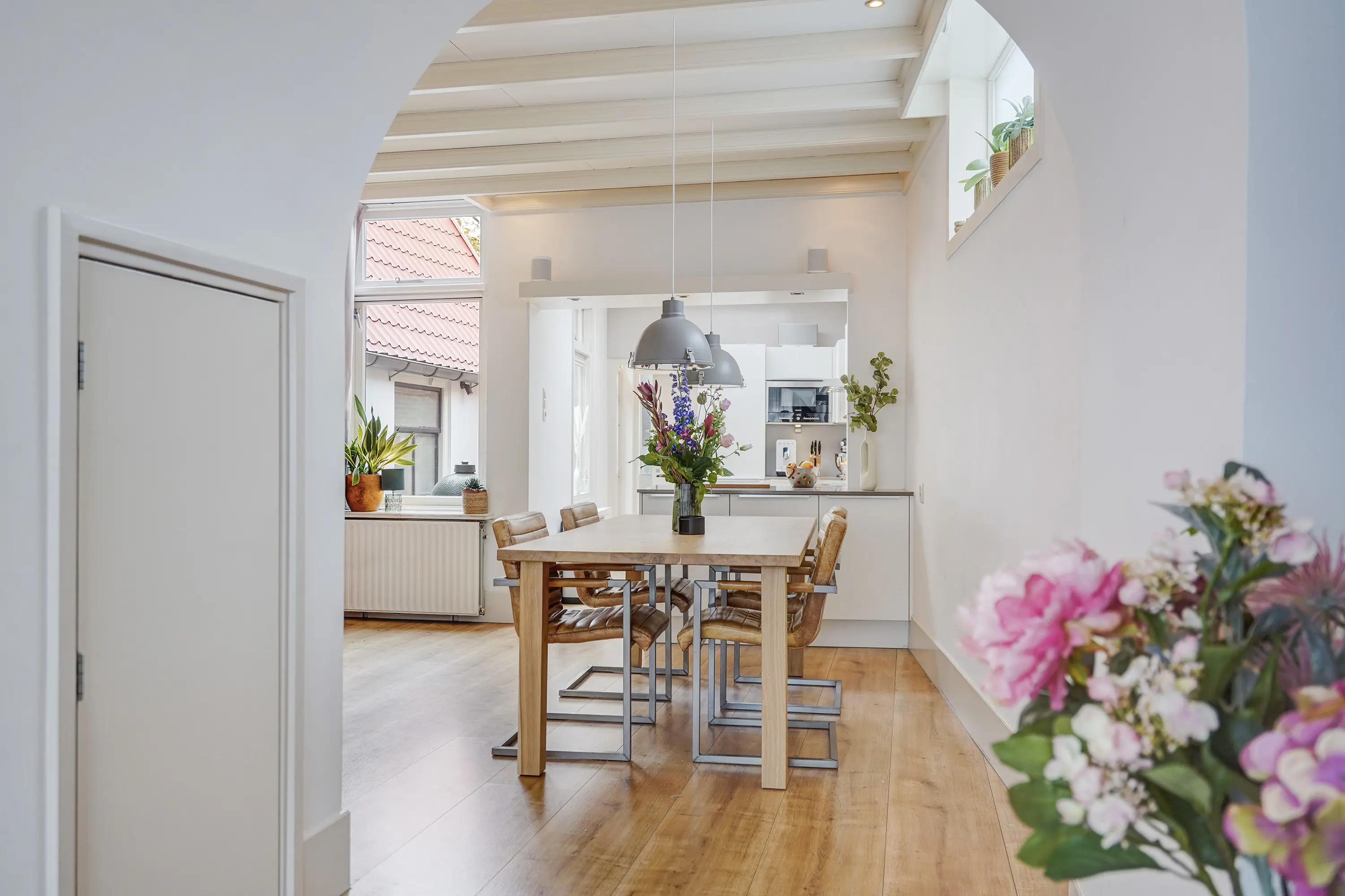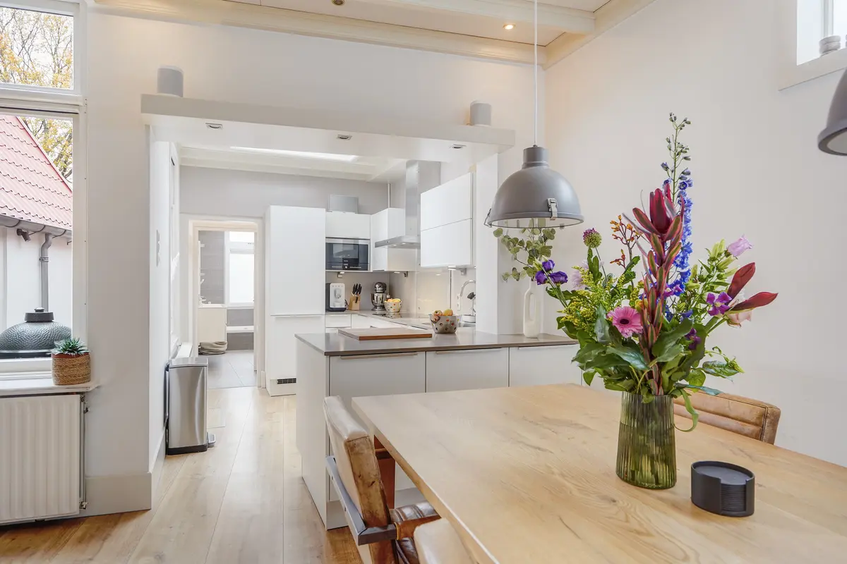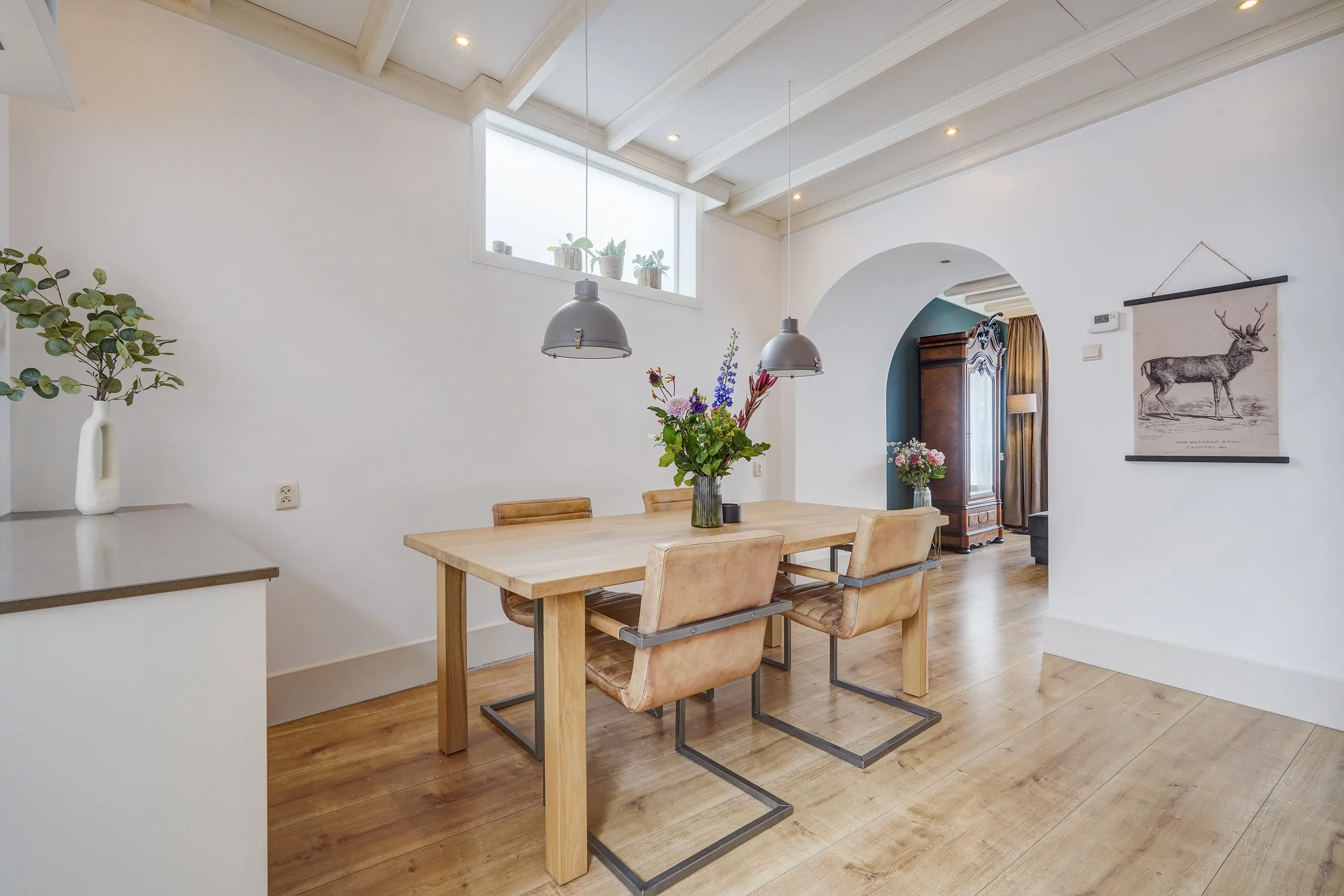 Zowel de grote raampartij aan de voorzijde als de ramen aan de zijkant van de woning en de lichtkoepel boven de keuken bieden voldoende daglicht toetreding en maken de kamer heel ruimtelijk.