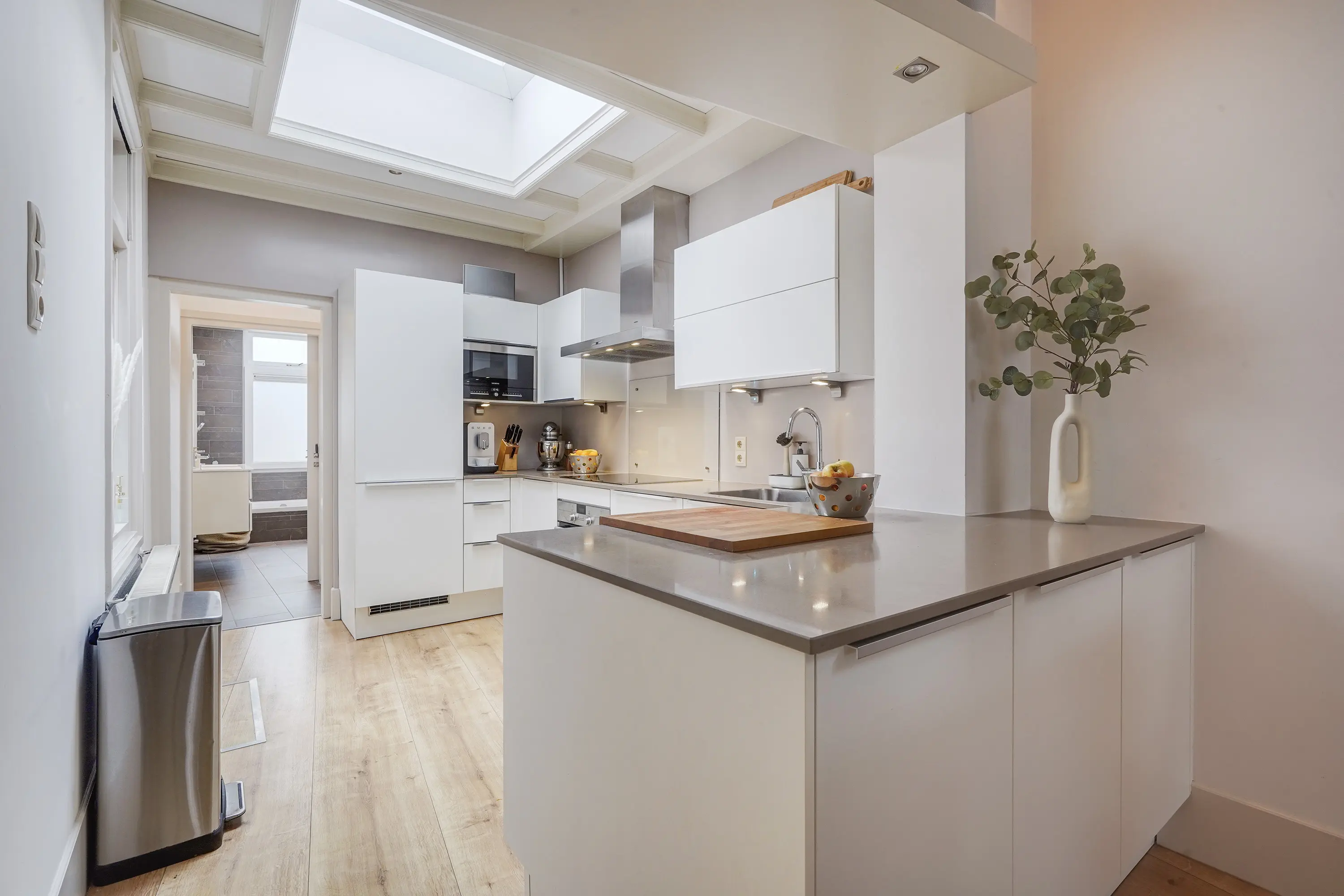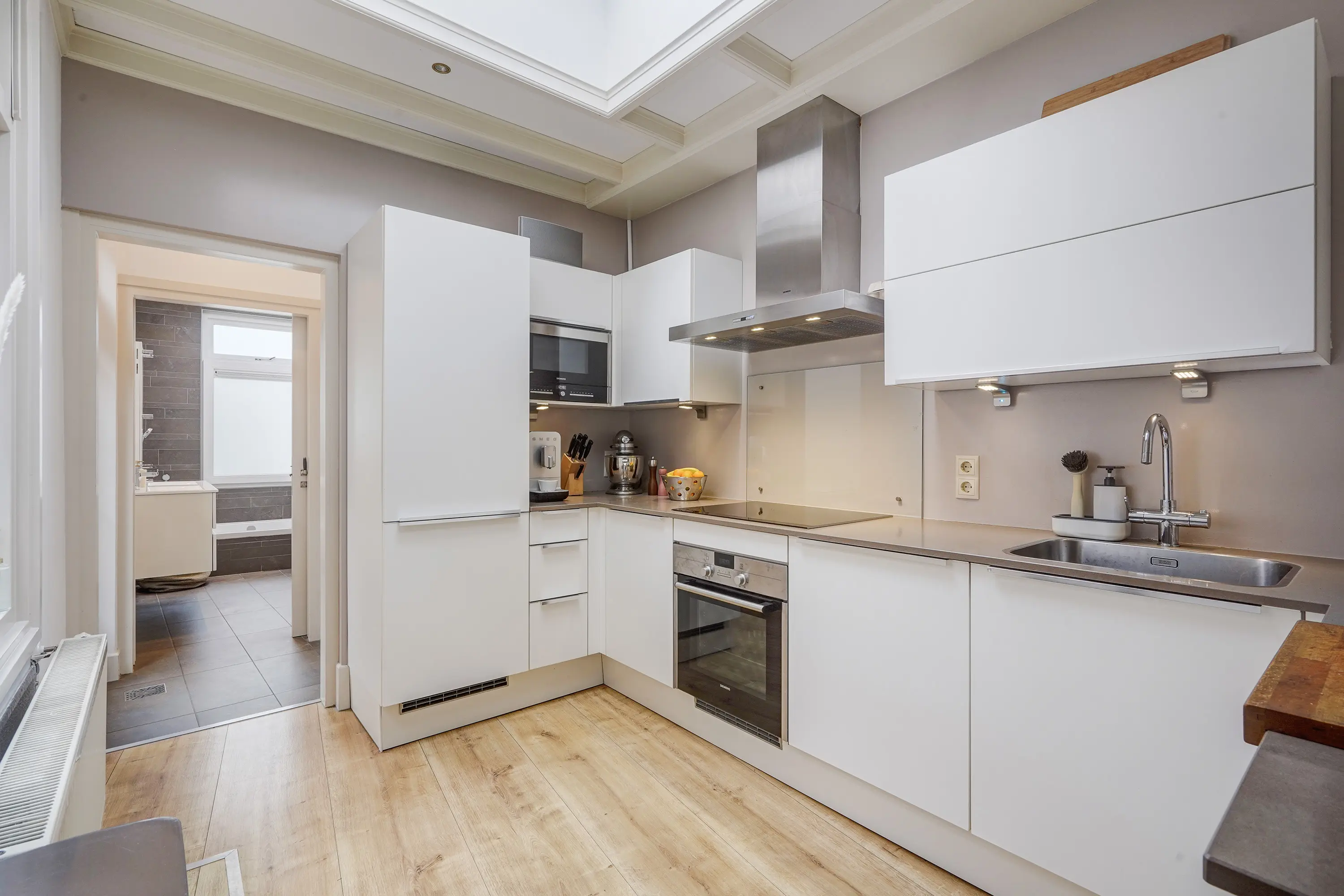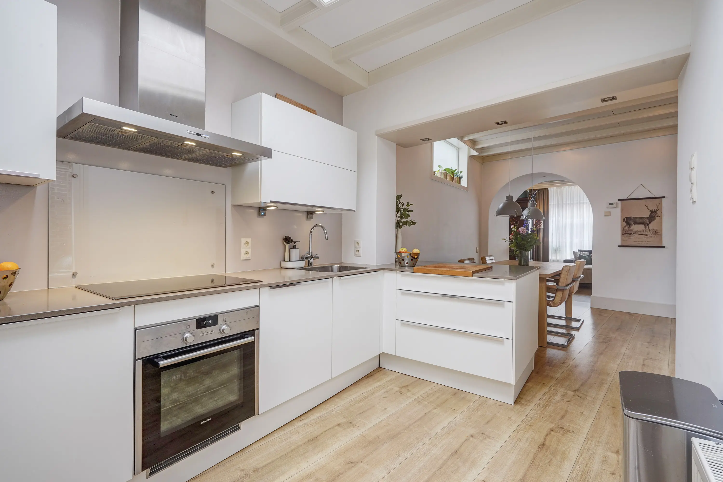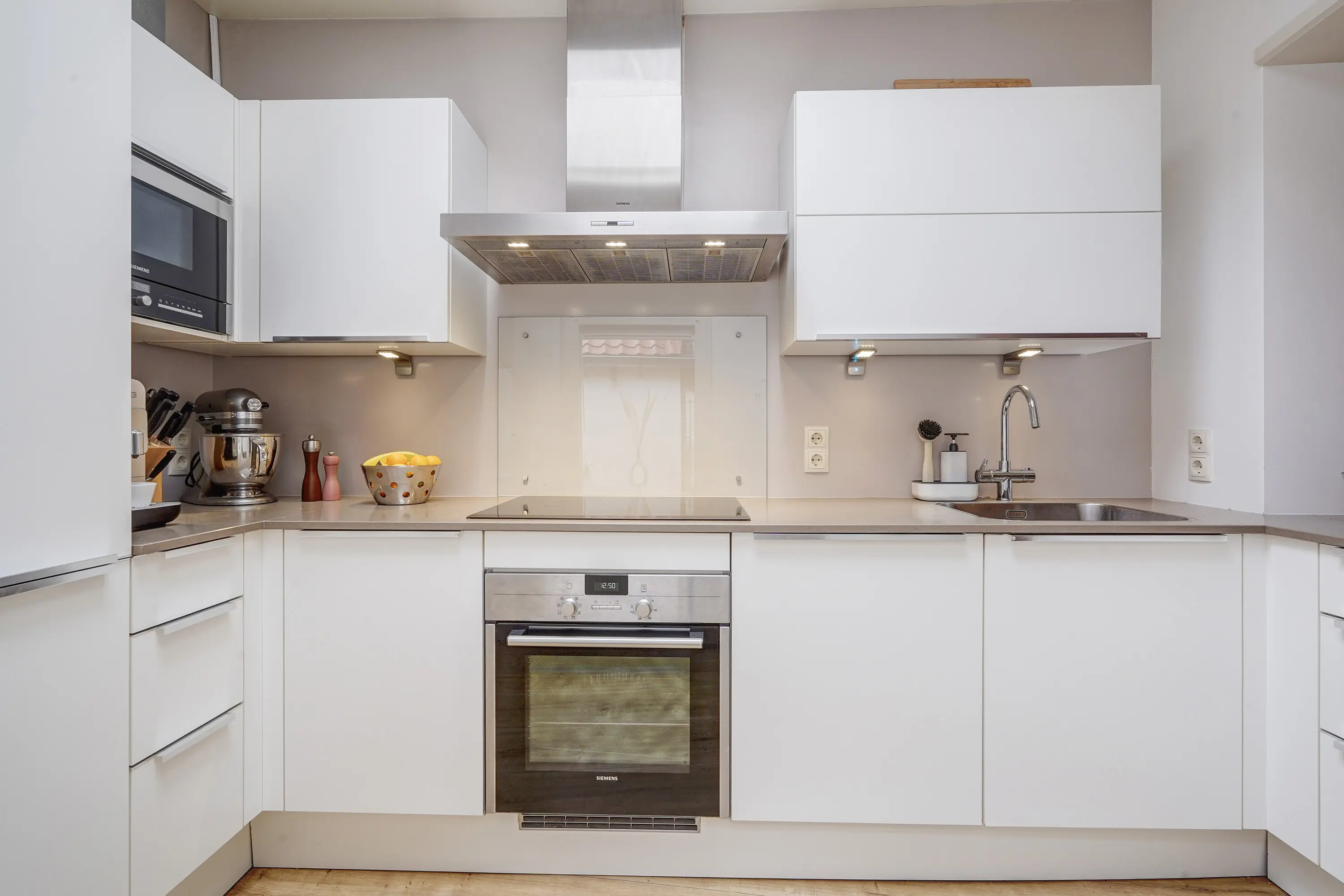 De open keuken is opgesteld in een U-opstelling, waarin diverse kasten en berglades worden afgewisseld met luxe inbouwapparatuur als een inductie kookplaat met RVS afzuigkap, koelkast, vriezer, combi-oven, magnetron, vaatwasser en spoelbak met kokend waterkraan.