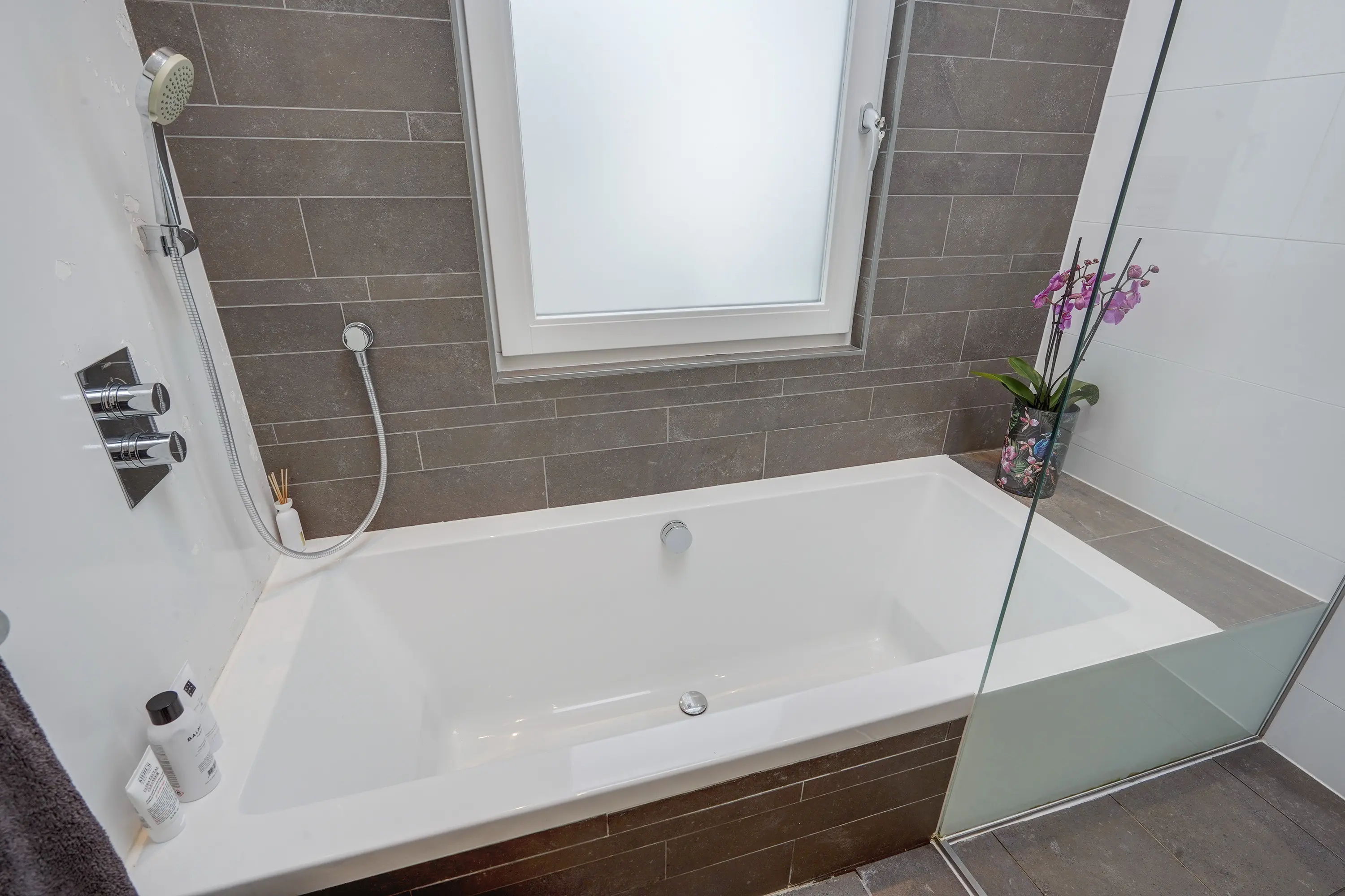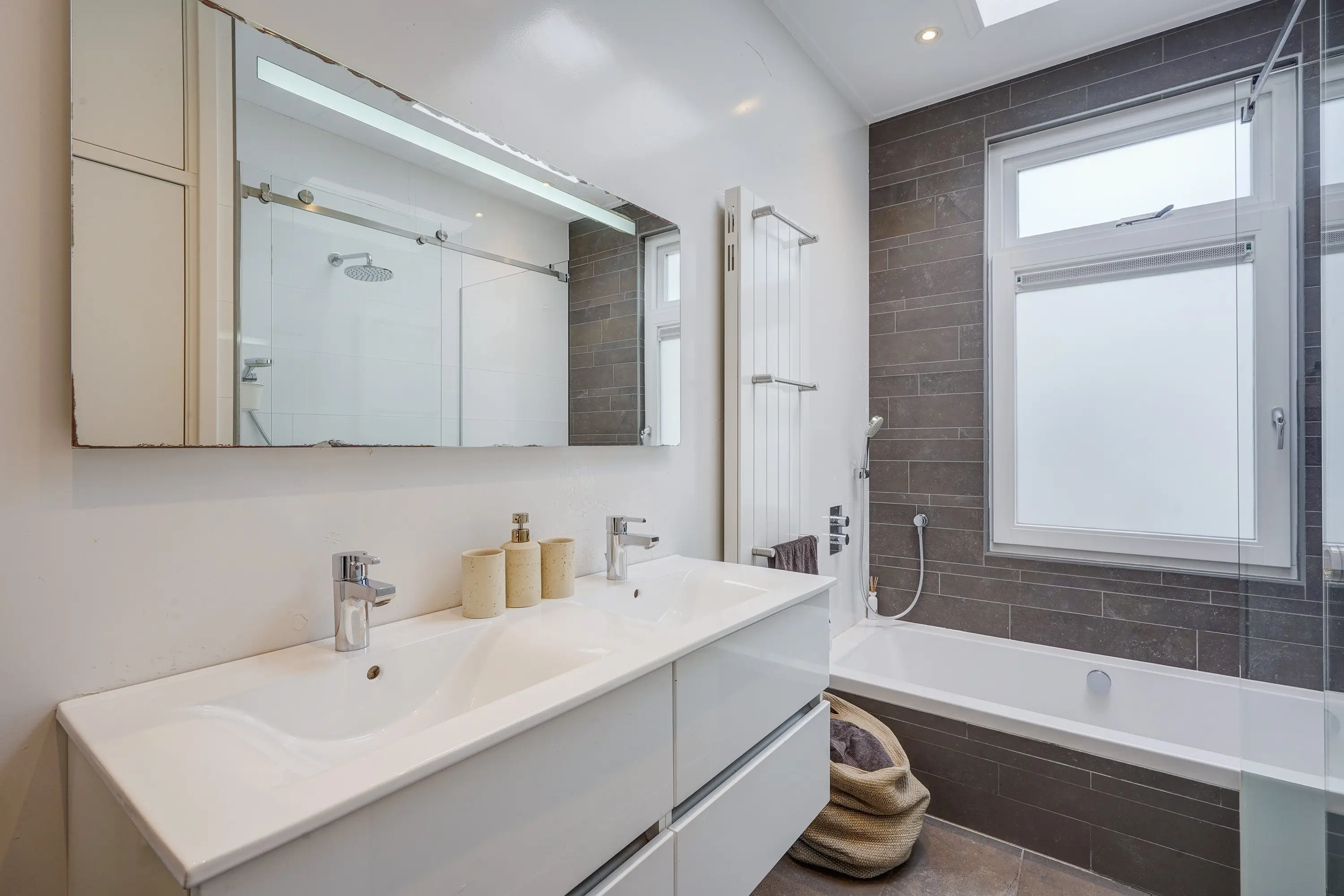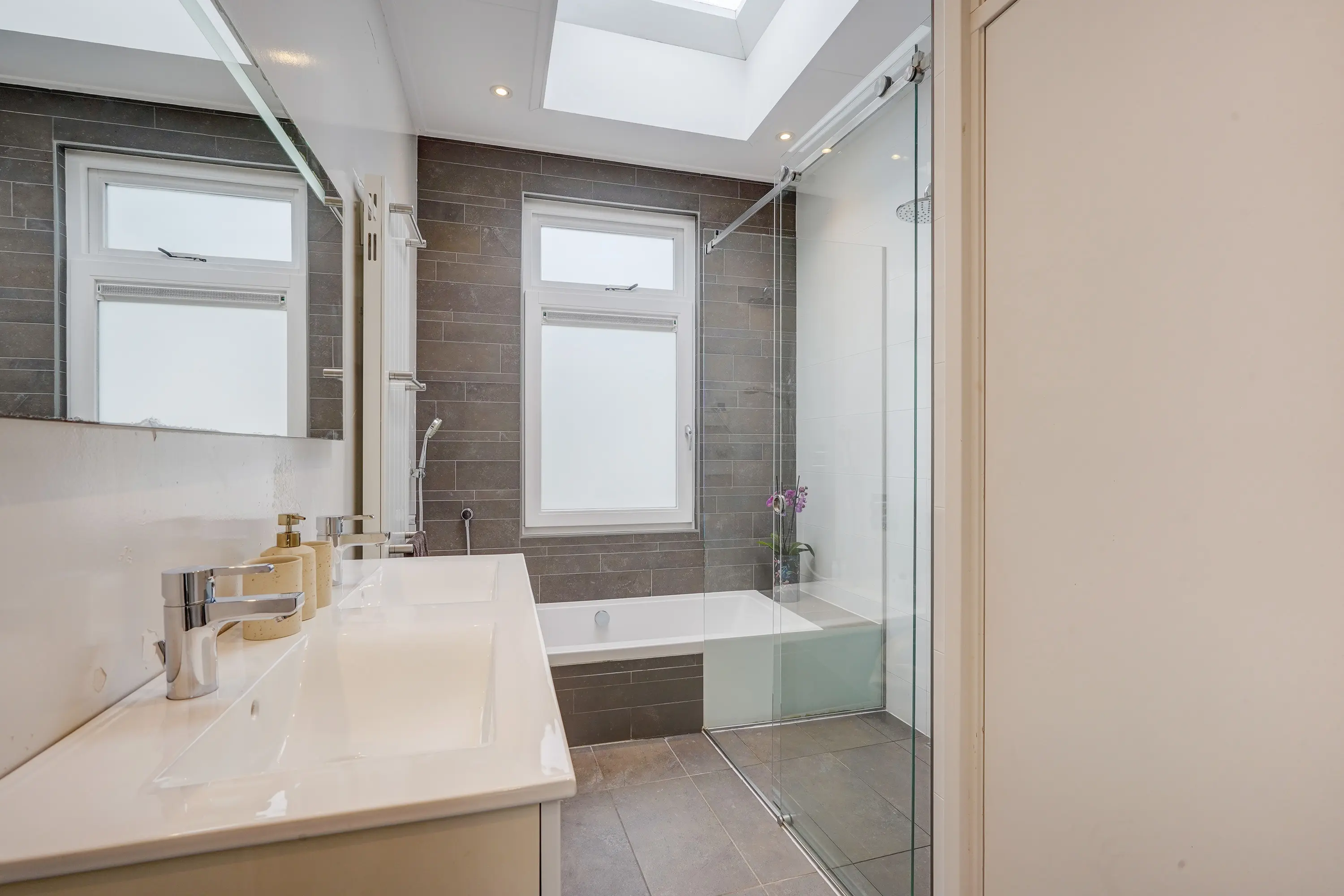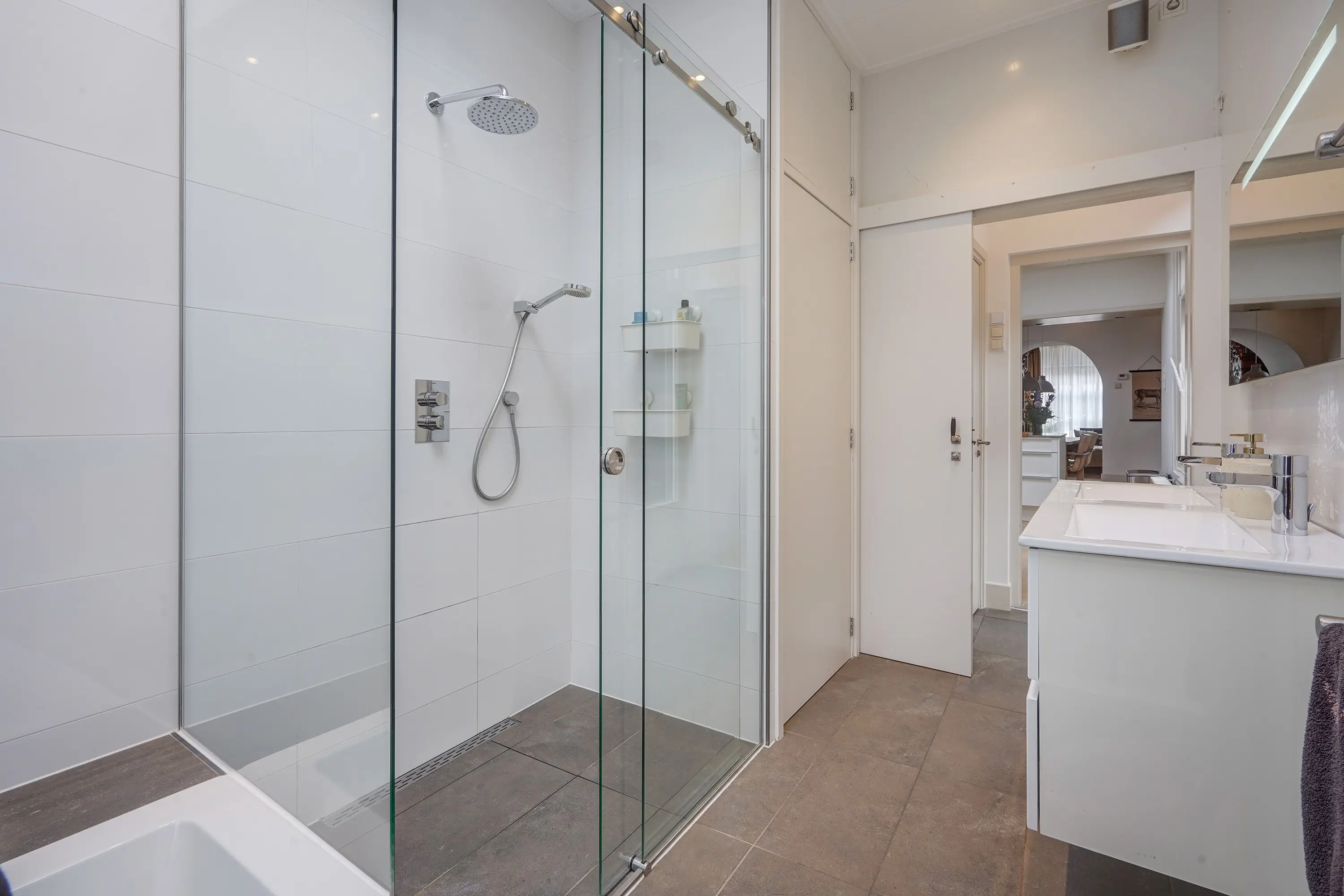 De badkamer is uitgevoerd in neutrale tinten en ingericht met een ligbad, inloopdouche met glazen wand en regendouche, en een dubbel wastafelmeubel met wandspiegel.