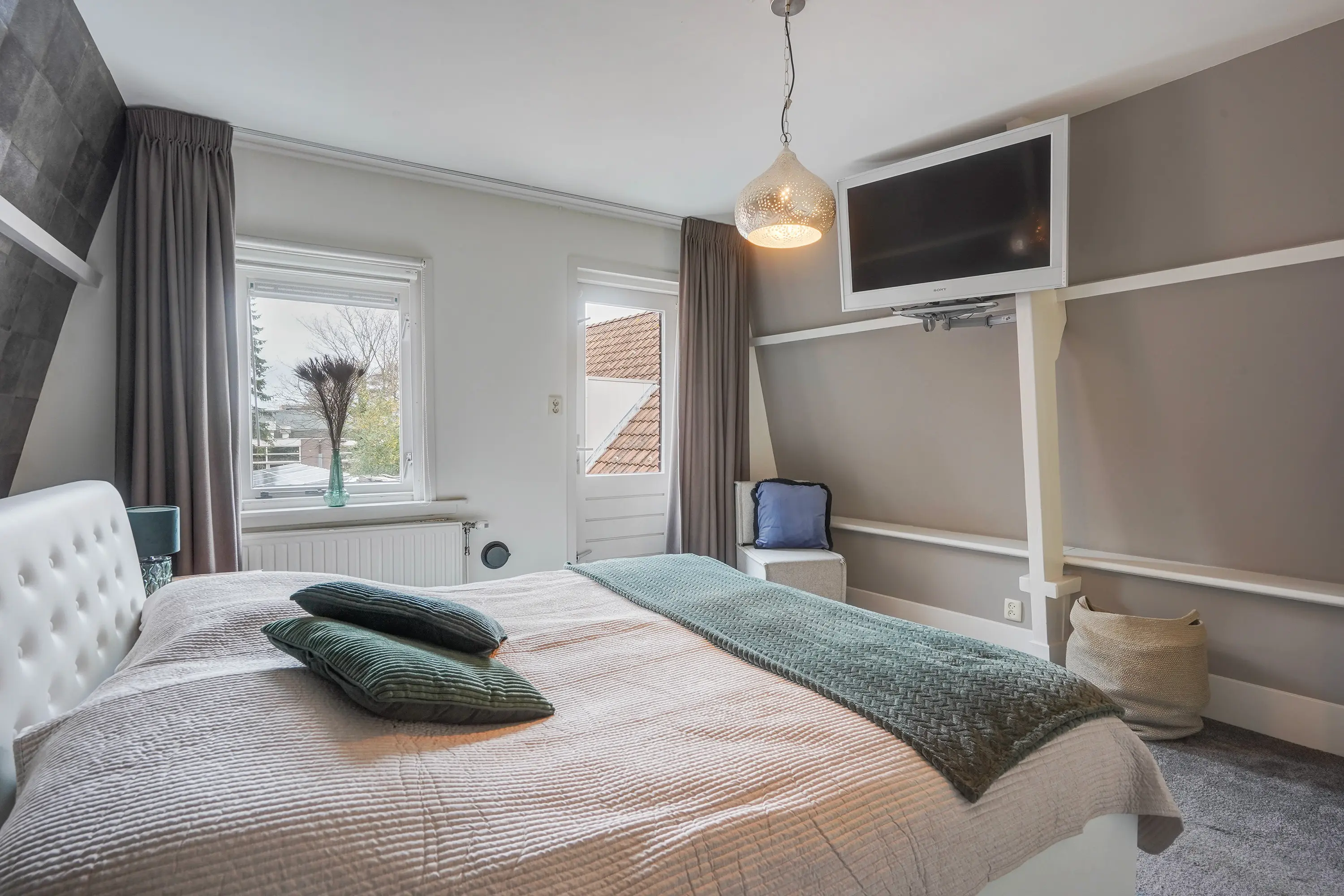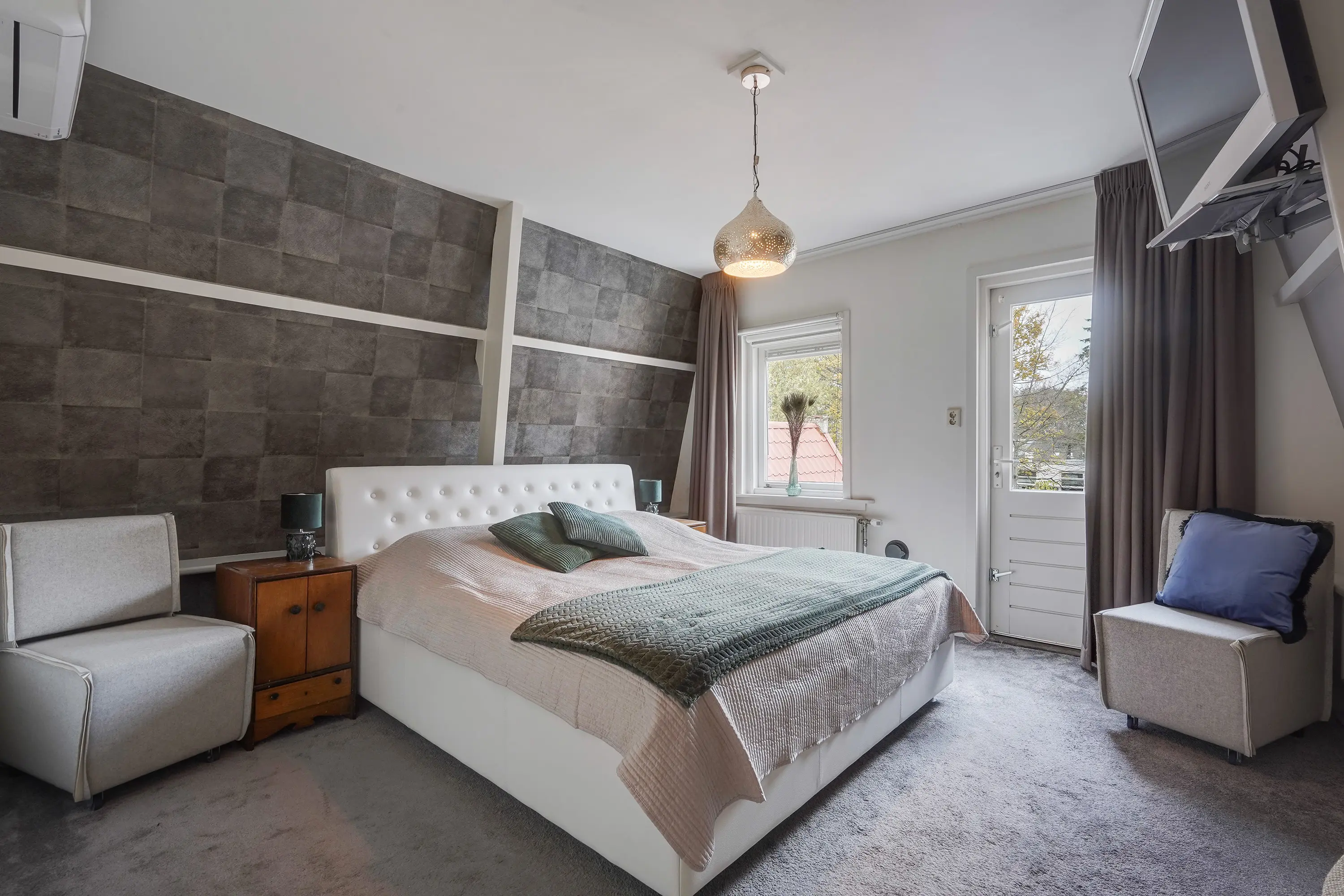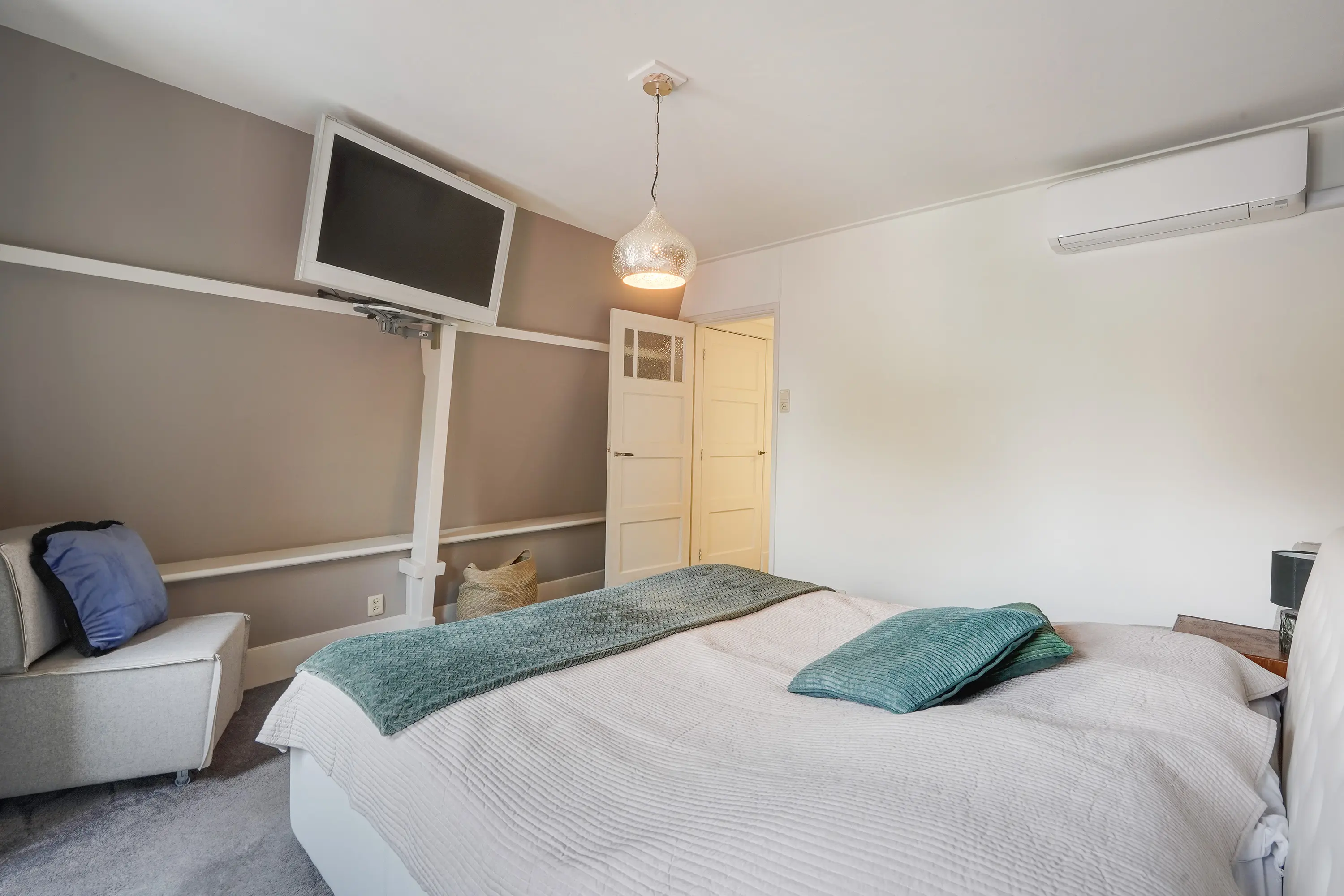 De hoofdslaapkamer, gesitueerd aan de achterzijde, beschikt over airconditioning en tv-aansluiting. Een deur leidt naar het dak van de uitbouw, waar de 13 zonnepanelen zorgen voor het verlagen van uw energierekening.