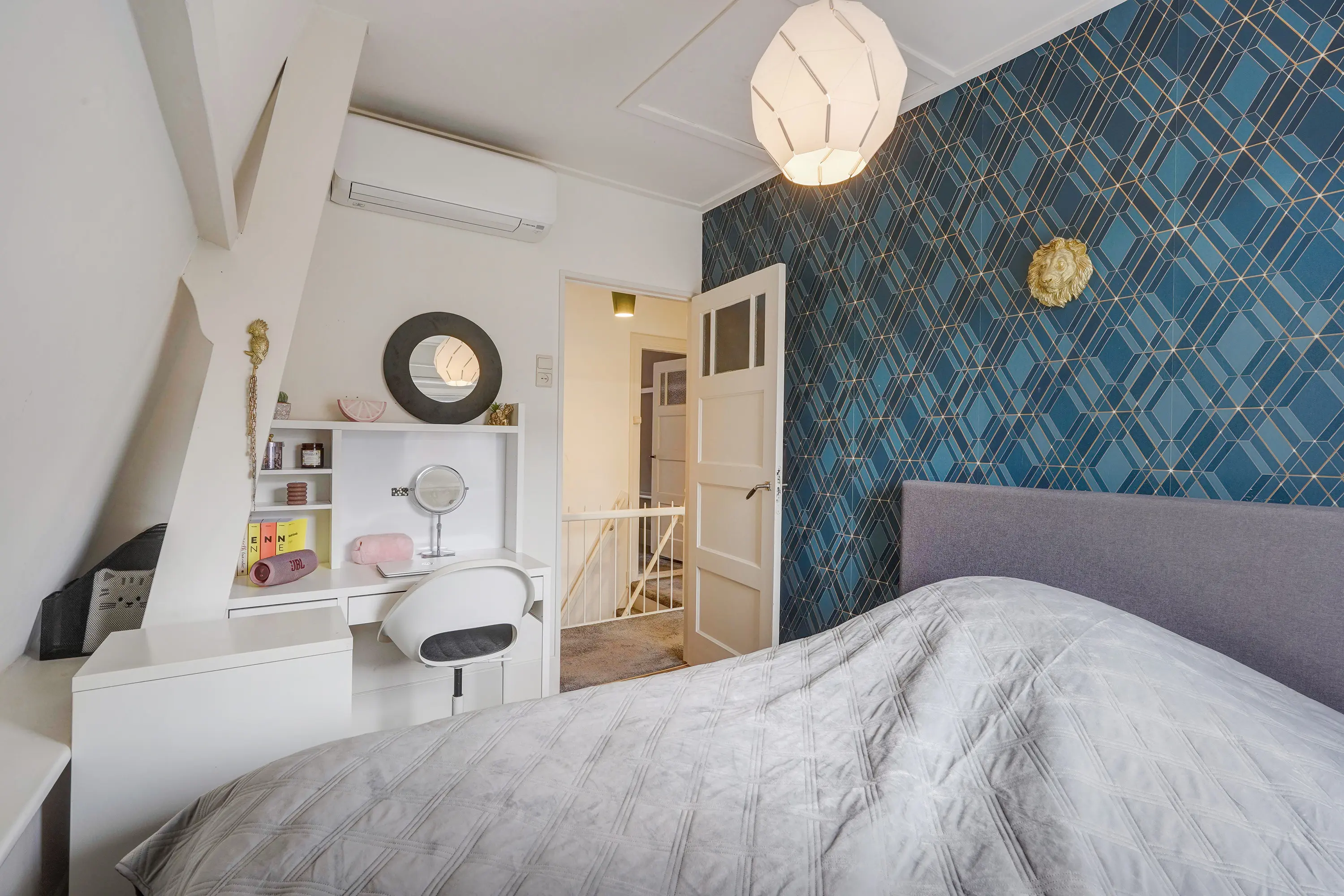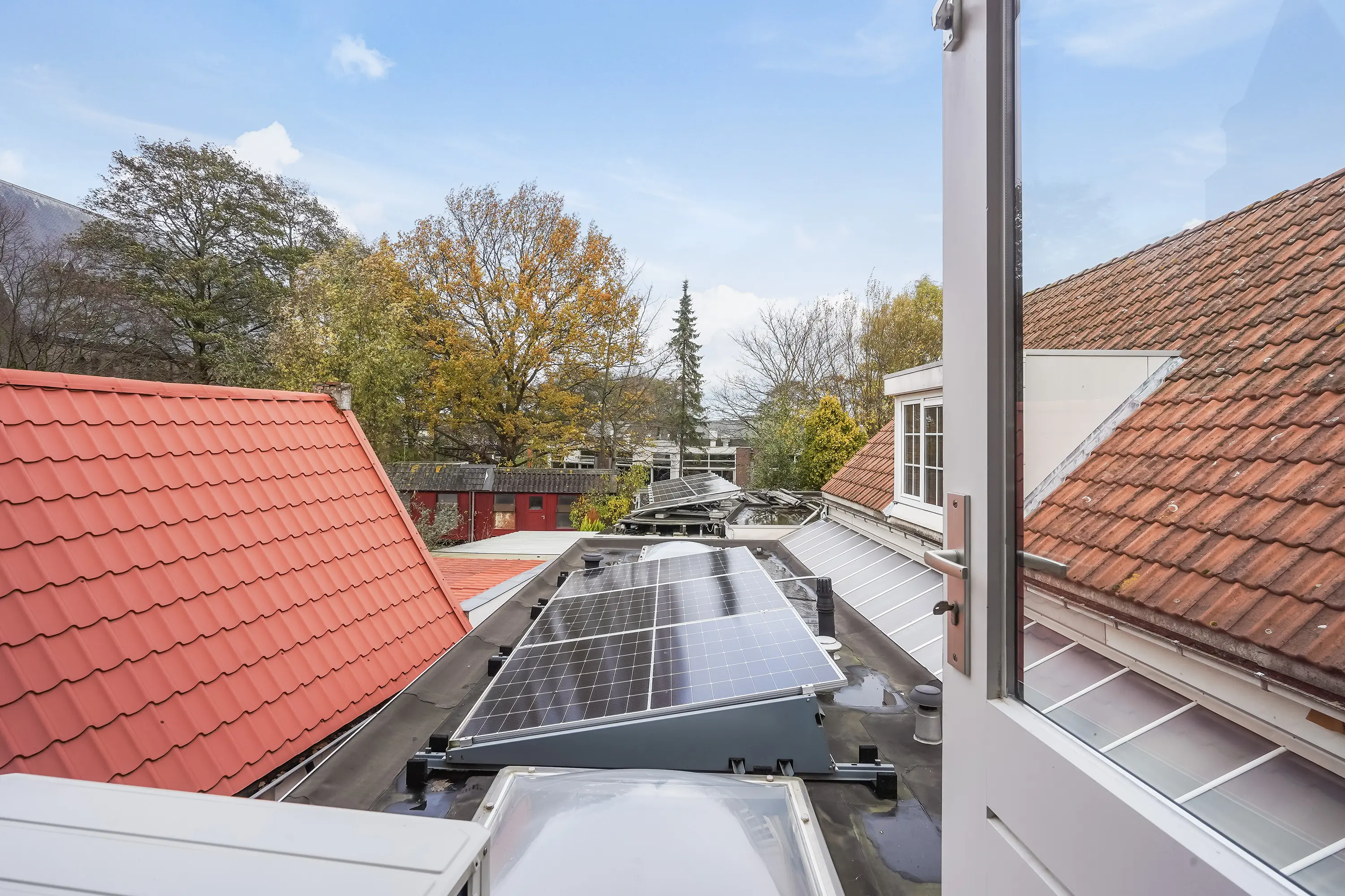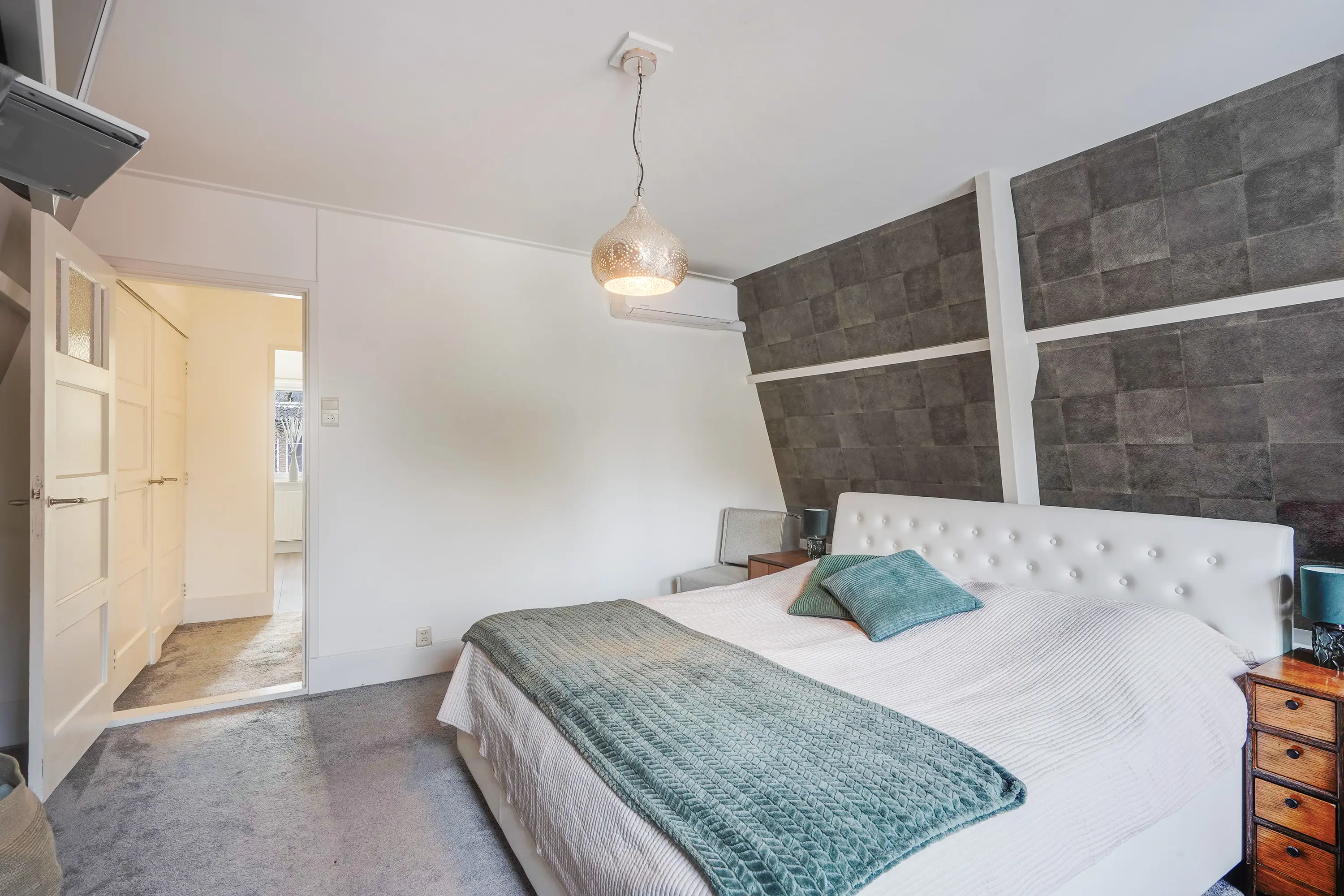 De hoofdslaapkamer, gesitueerd aan de achterzijde, beschikt over airconditioning en tv-aansluiting. Een deur leidt naar het dak van de uitbouw, waar de 13 zonnepanelen zorgen voor het verlagen van uw energierekening.