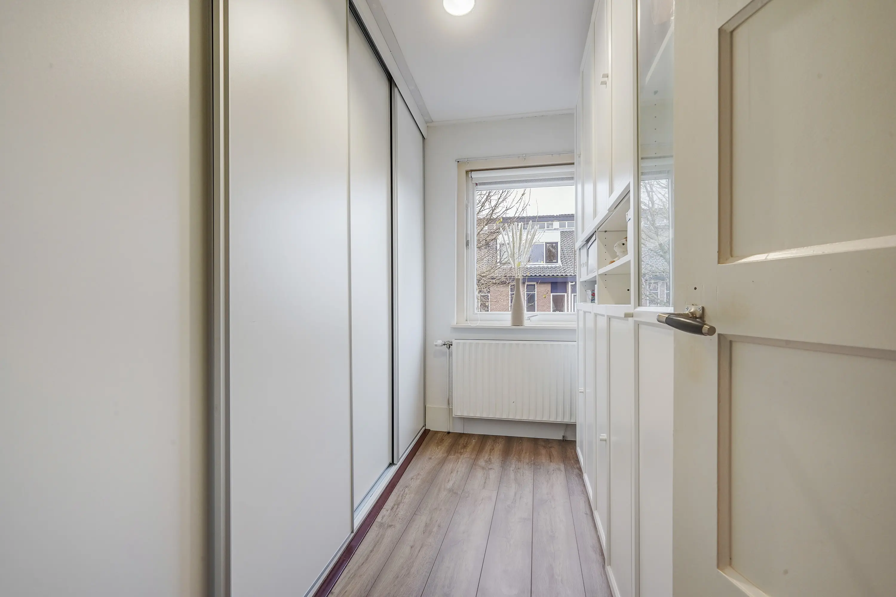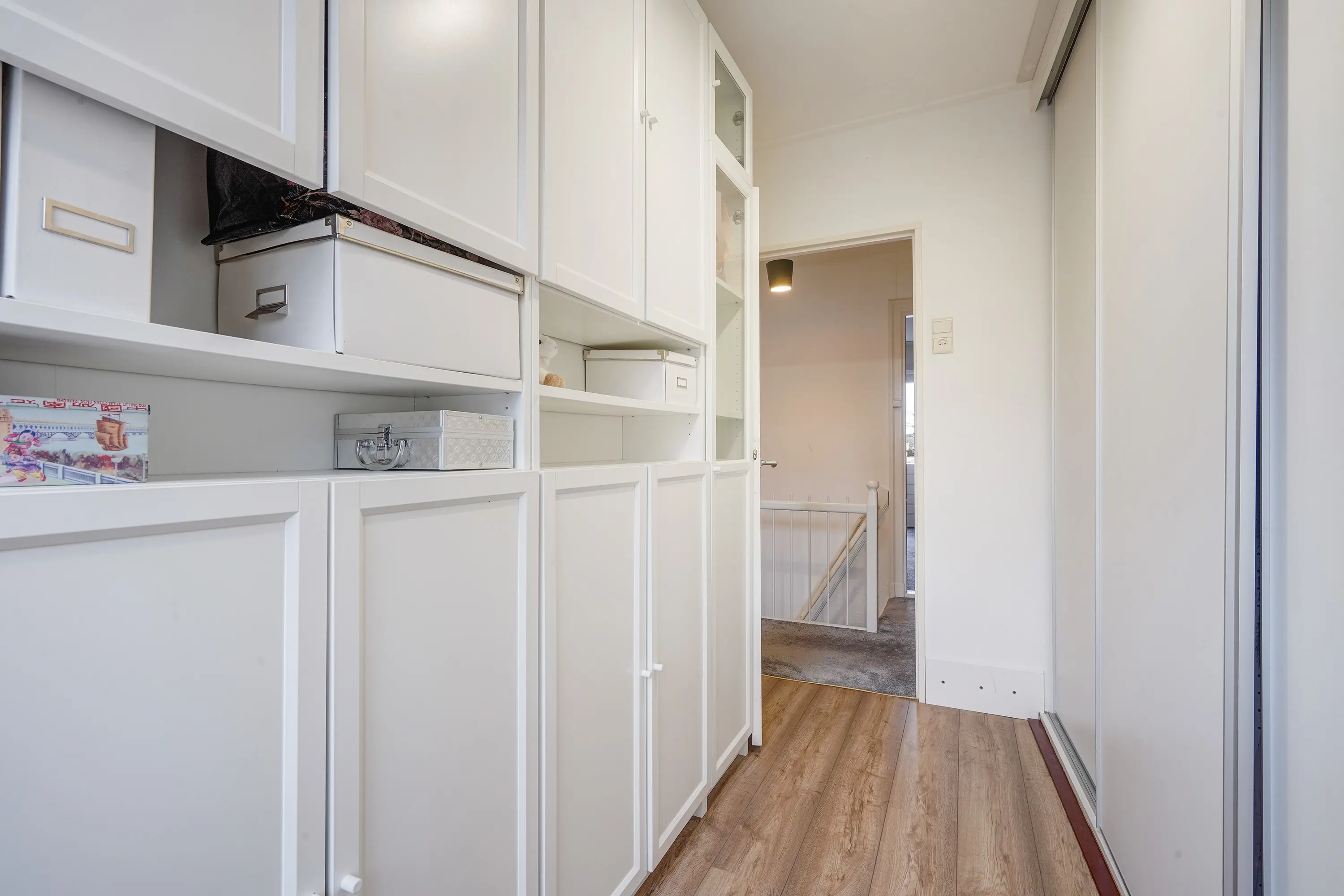 Aan de voorzijde bevinden zich de overige twee (slaap-)kamers, waarvan de één momenteel ingericht is als inloopkast, met plafondhoge kast met schuifdeuren. De kleinere slaapkamer kan, net als de hoofdslaapkamer, heel goed de temperatuur reguleren met de aanwezige airco aan de muur. Via deze kamer is tevens de ruime en praktische bergvliering toegankelijk.