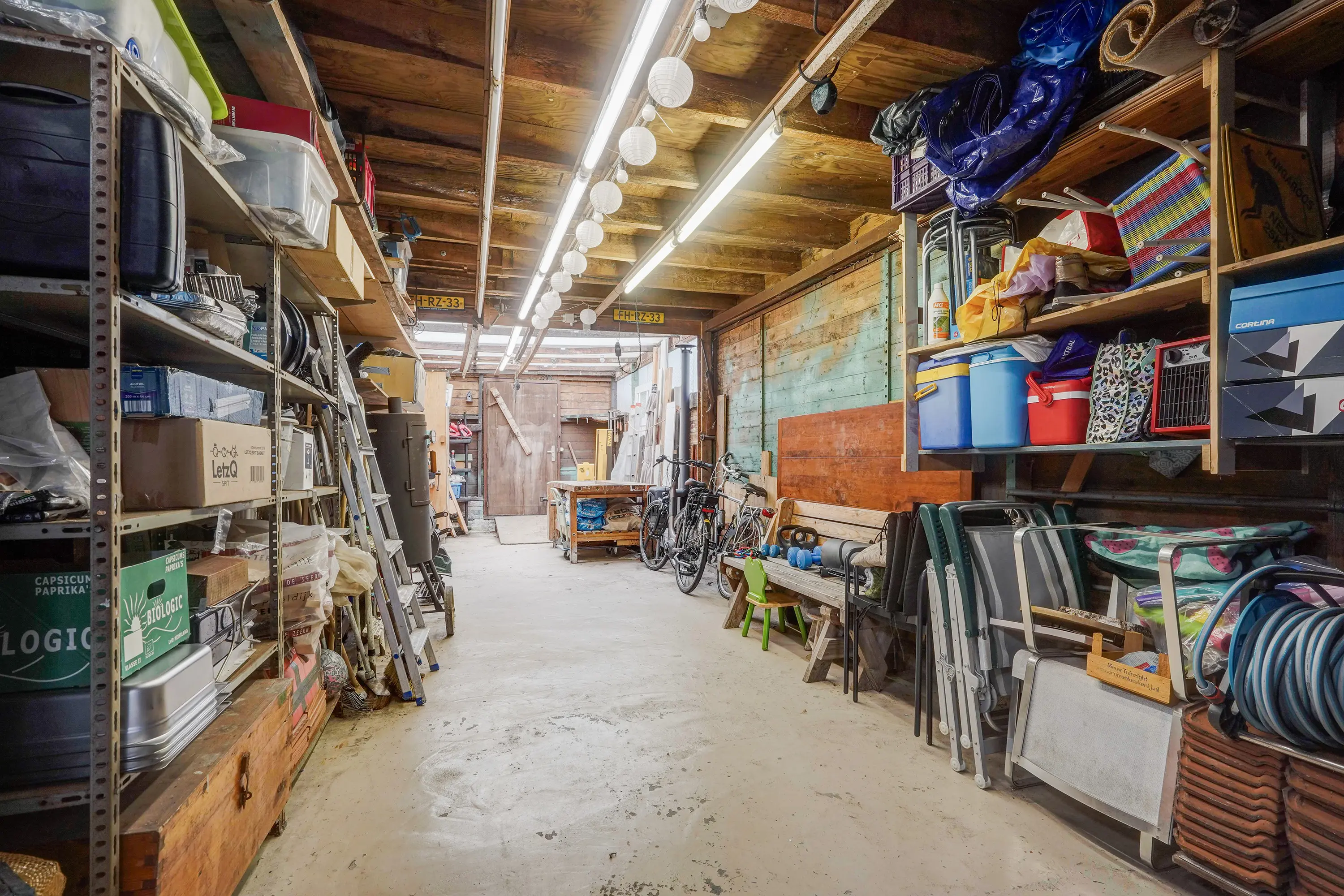 Via de tuin is een multifunctionele berging van ca. 45 m2 toegankelijk. Het voorportaal kunt u ideaal gebruiken als bijvoorbeeld bijkeuken, via een deur komt u in het tweede gedeelte van de berging; een grote ruimte met houten wanden, voorzien van voldoende elektra aansluitingen. Het plafond bestaat deels uit hout en deels uit kunststof golfplaten, zodat er ook daglicht naar binnen valt.