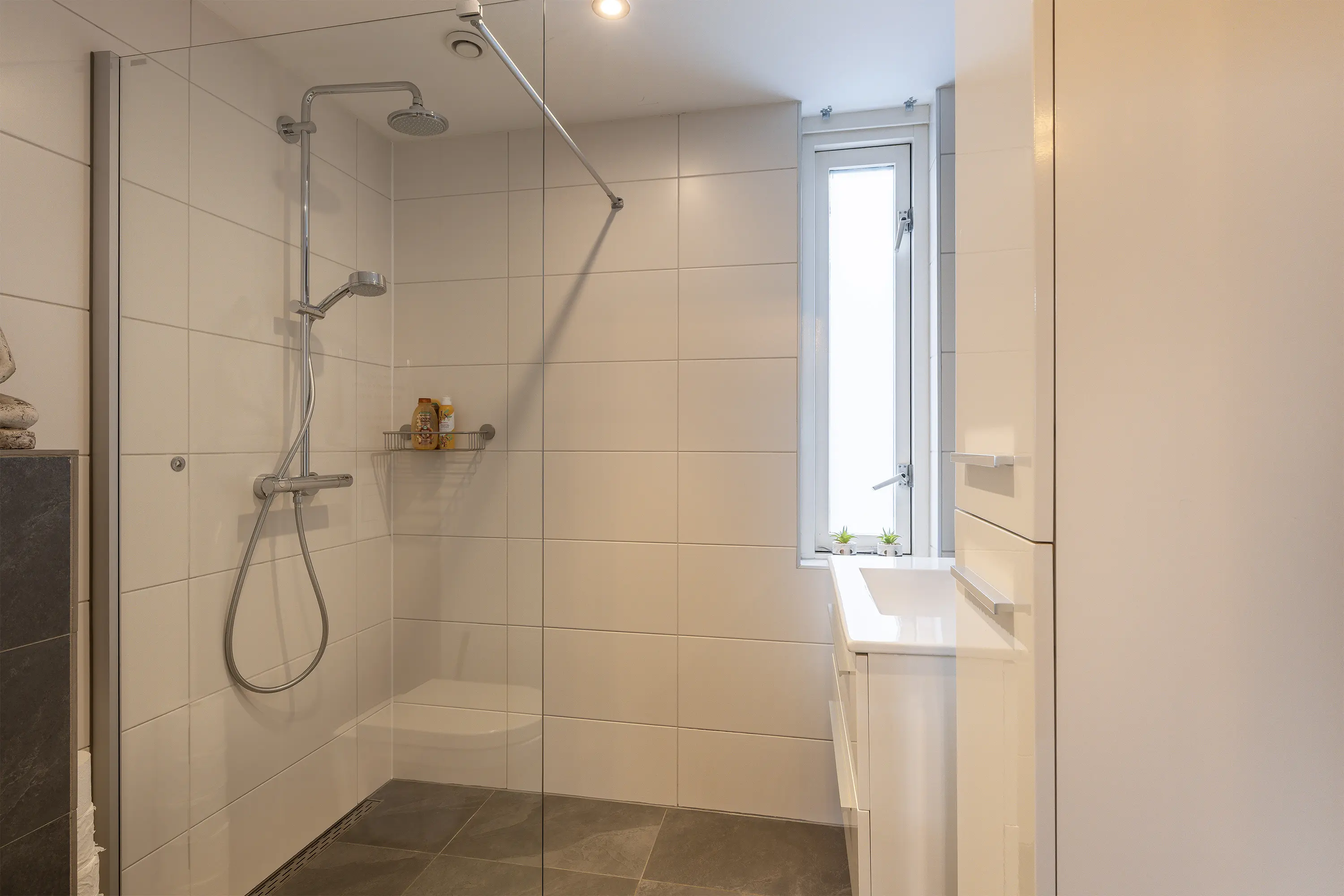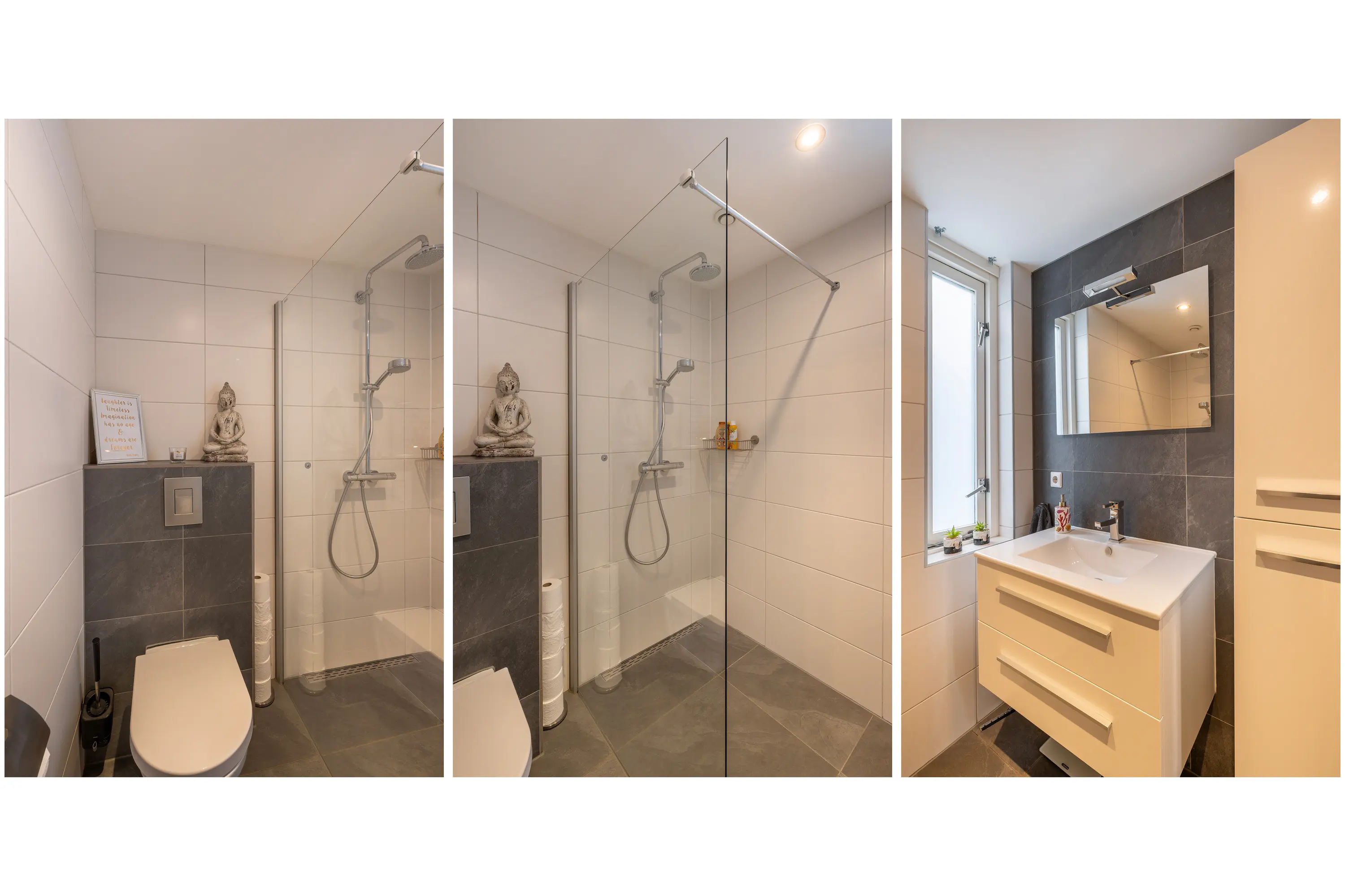 De badkamer bevindt zich aan de voorzijde van de woning. Deze is volledig betegeld en ingericht met een ruime inloopdouche met thermostaatkraan, een wastafelmeubel en een toilet. De badkamer beschikt over vloerverwarming en heeft bovendien een raam, wat ideaal is voor natuurlijke ventilatie.