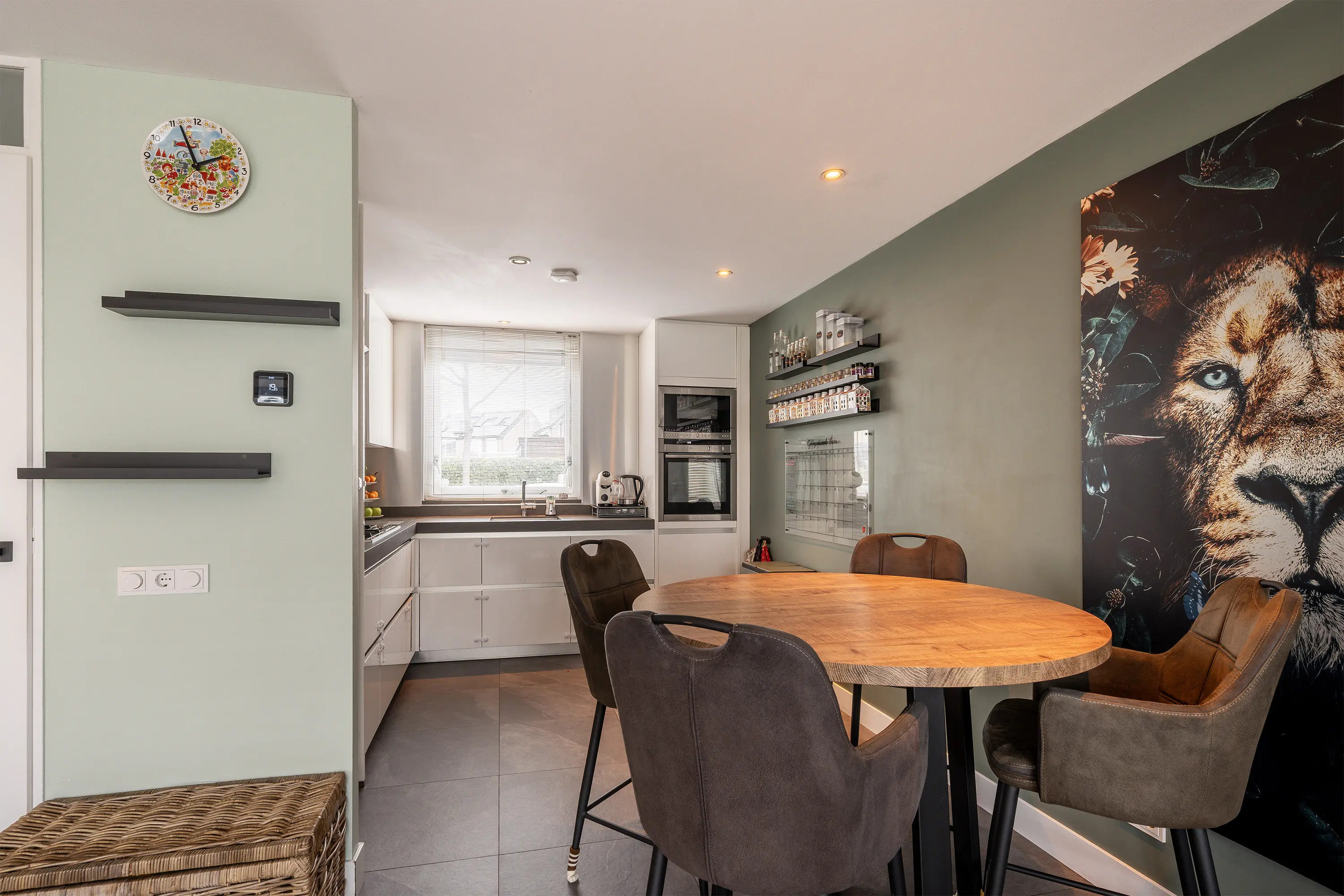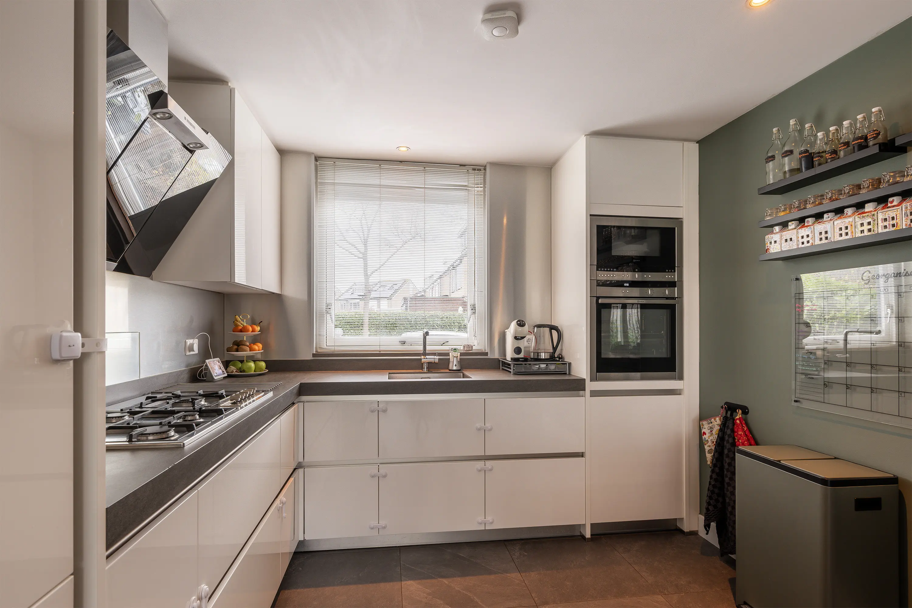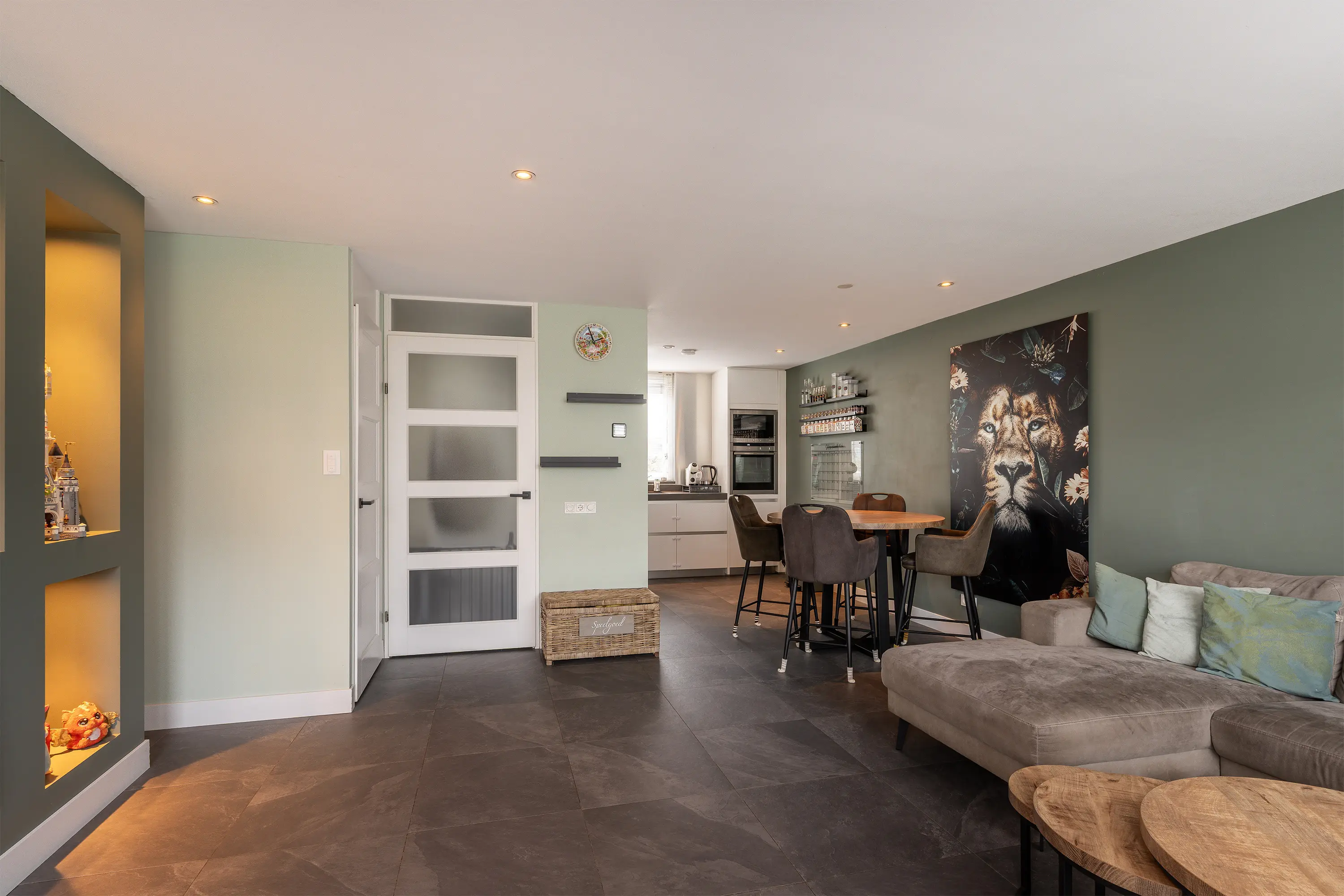 De woonkamer is licht en breed, voorzien van een plavuizen vloer met vloerverwarming, strak gestuukte wanden en inbouwspots. Aan de achterzijde zorgt een grote raampartij met deur naar de tuin voor veel daglicht en een prettige verbinding met buiten. De open keuken in L-opstelling is uitgevoerd in het wit en compleet uitgerust met een gasfornuis, afzuigkap, koelkast, vriezer, heteluchtoven, combimagnetron en vaatwasser.