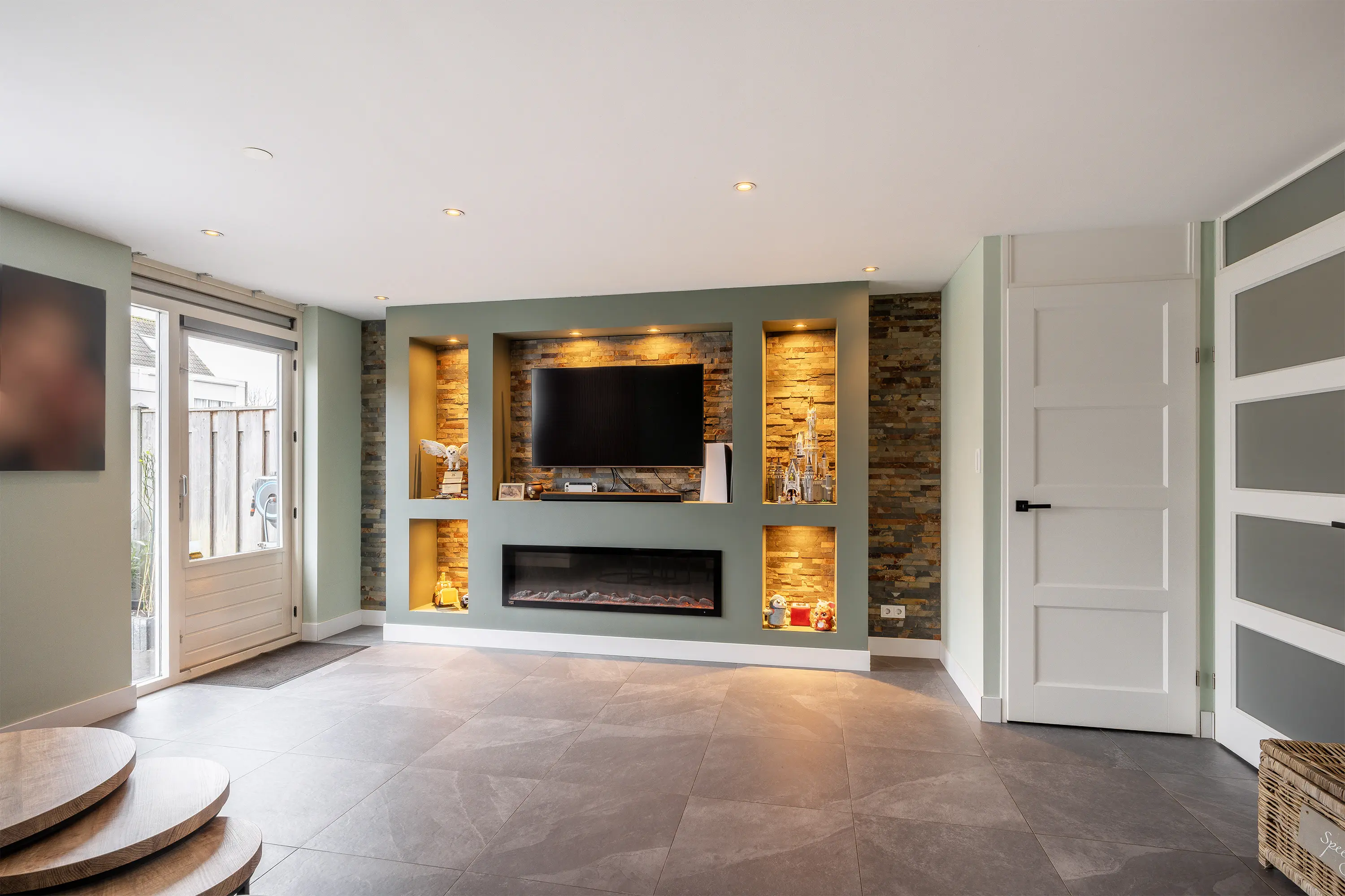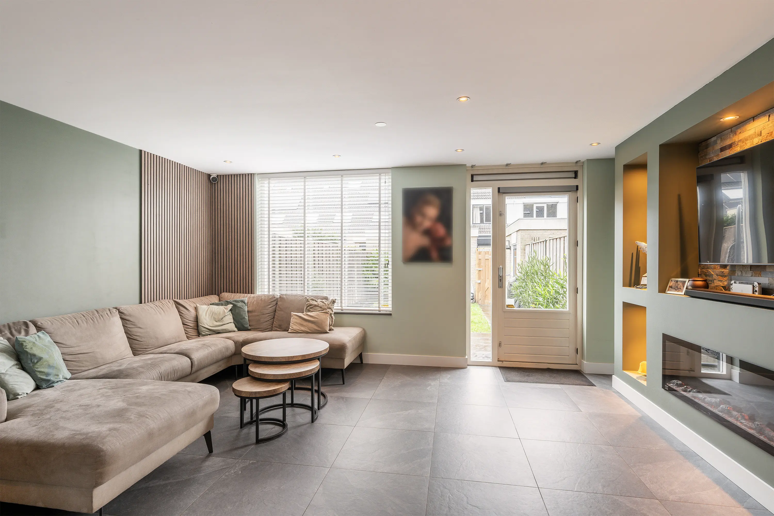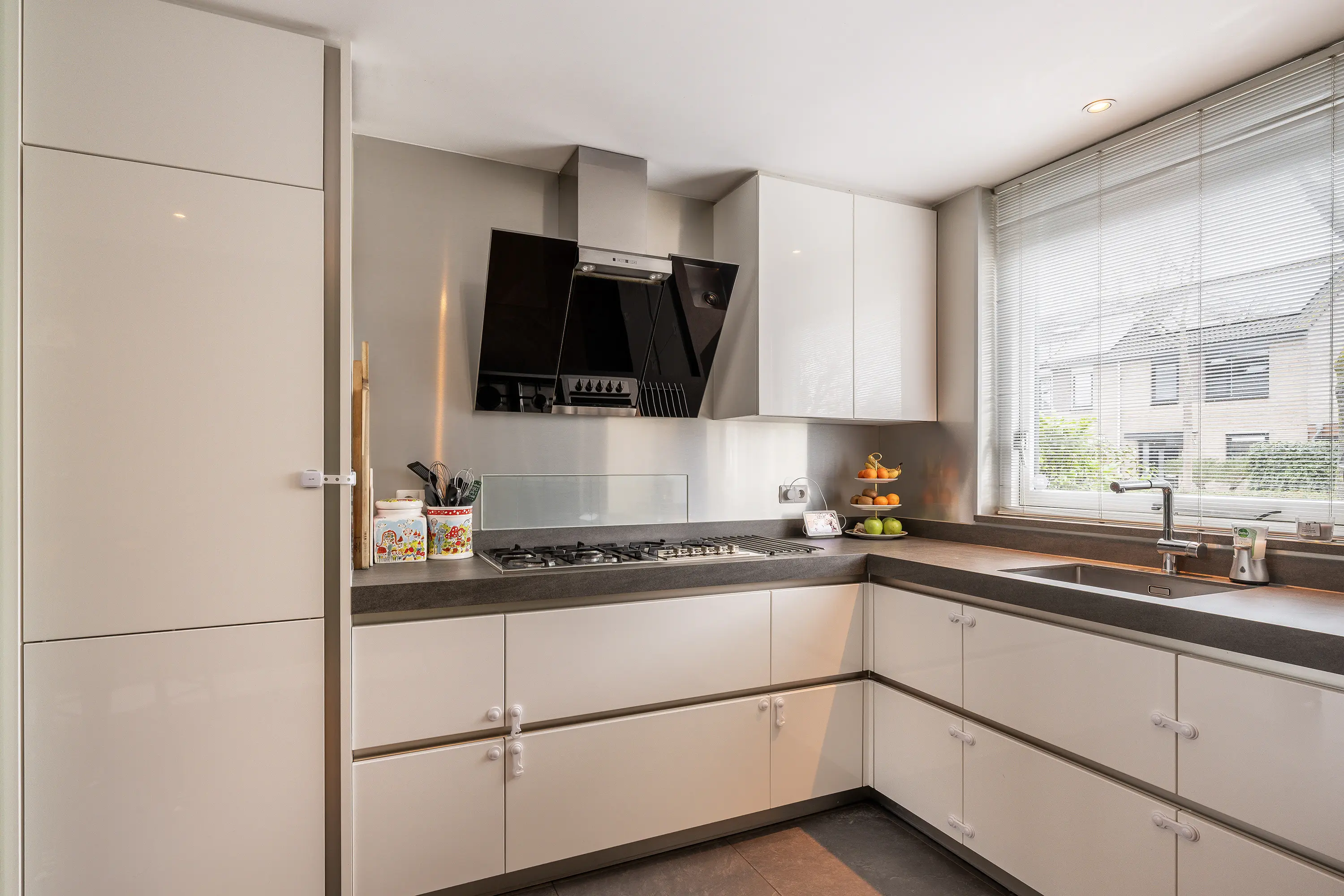De woonkamer is licht en breed, voorzien van een plavuizen vloer met vloerverwarming, strak gestuukte wanden en inbouwspots. Aan de achterzijde zorgt een grote raampartij met deur naar de tuin voor veel daglicht en een prettige verbinding met buiten. De open keuken in L-opstelling is uitgevoerd in het wit en compleet uitgerust met een gasfornuis, afzuigkap, koelkast, vriezer, heteluchtoven, combimagnetron en vaatwasser.