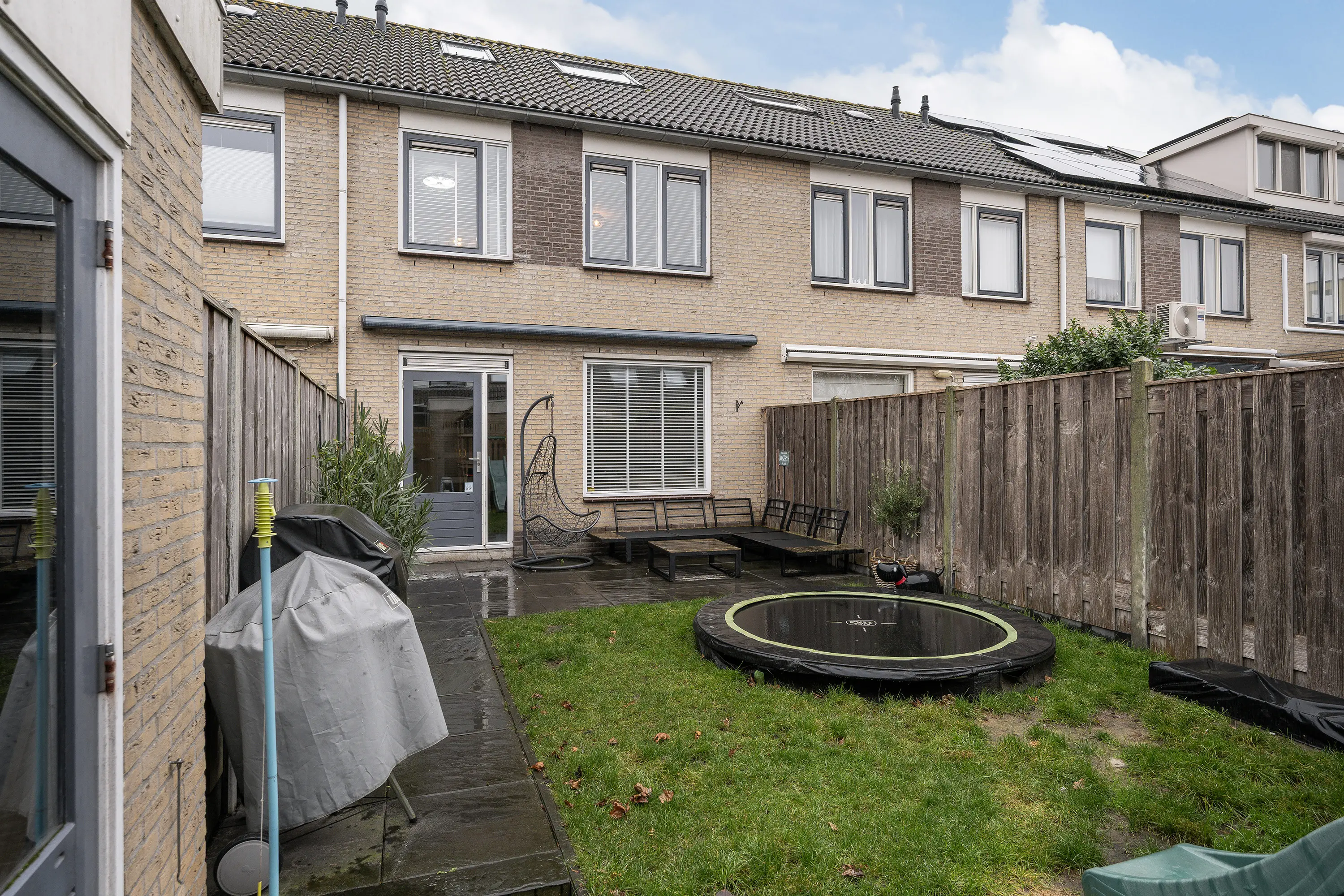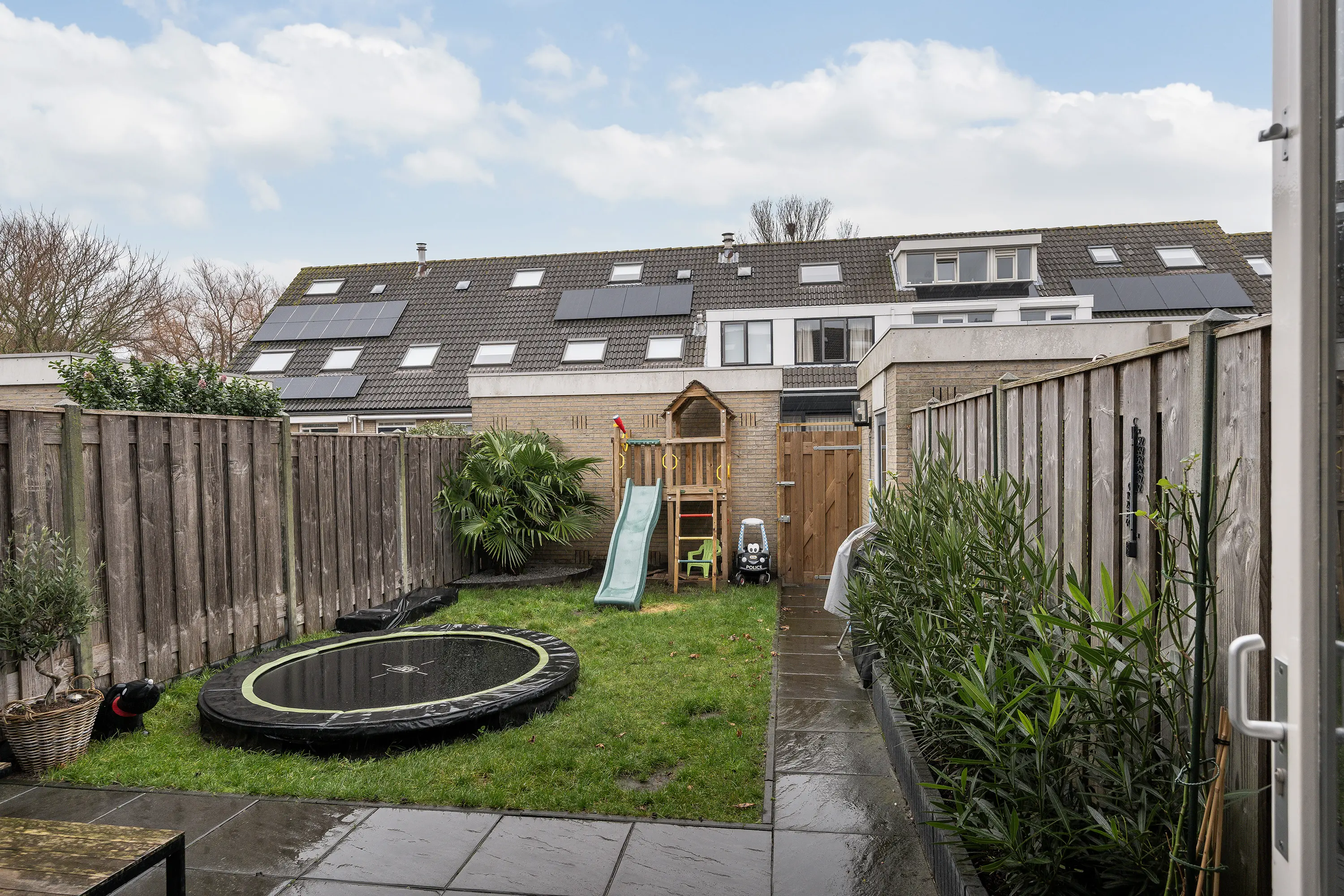 De zonnige achtertuin ligt op het zuidoosten en biedt ruimte voor meerdere zitplekken. Achterin de tuin bevindt zich een stenen berging en een praktische achterom, ideaal voor fietsen of andere spullen.