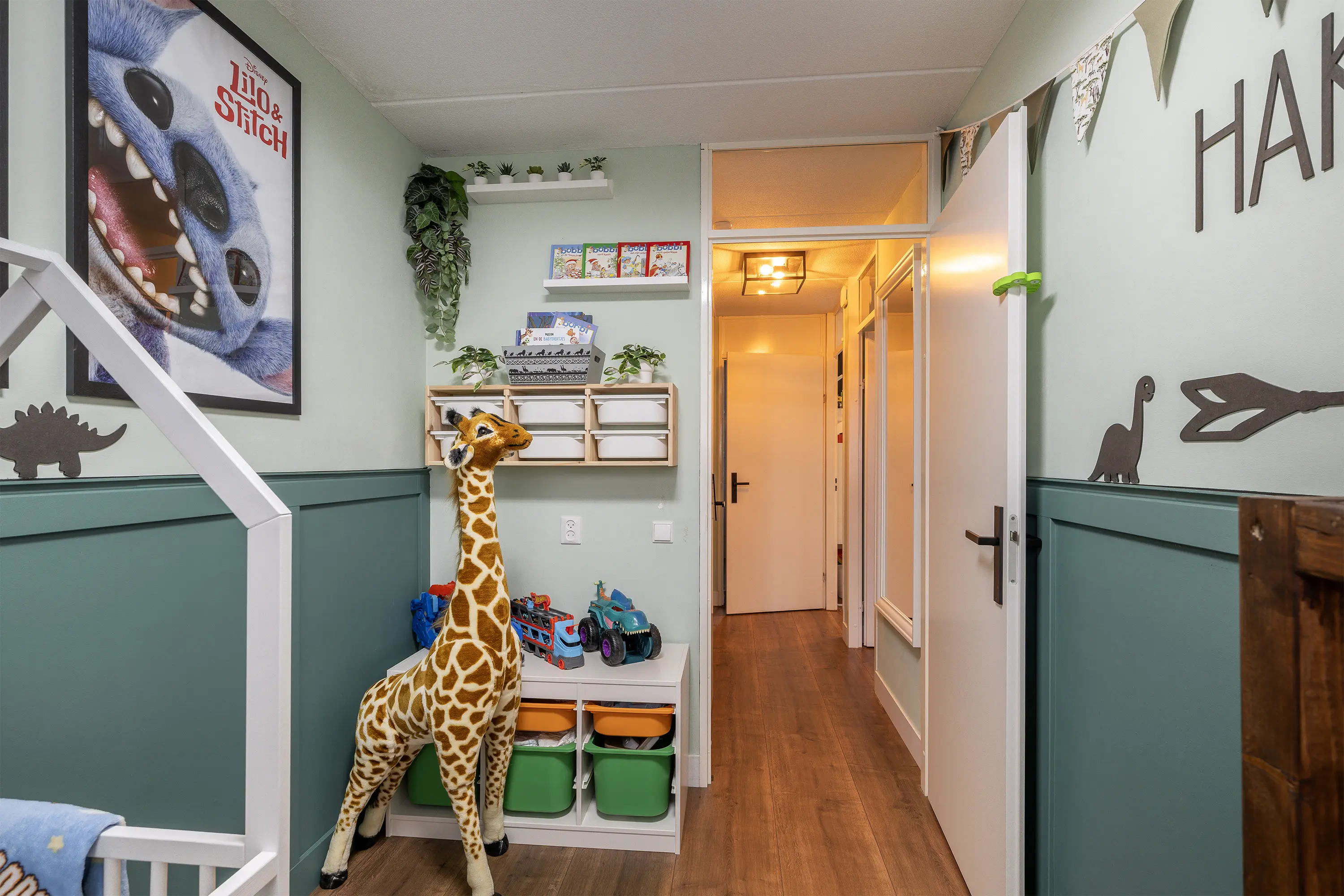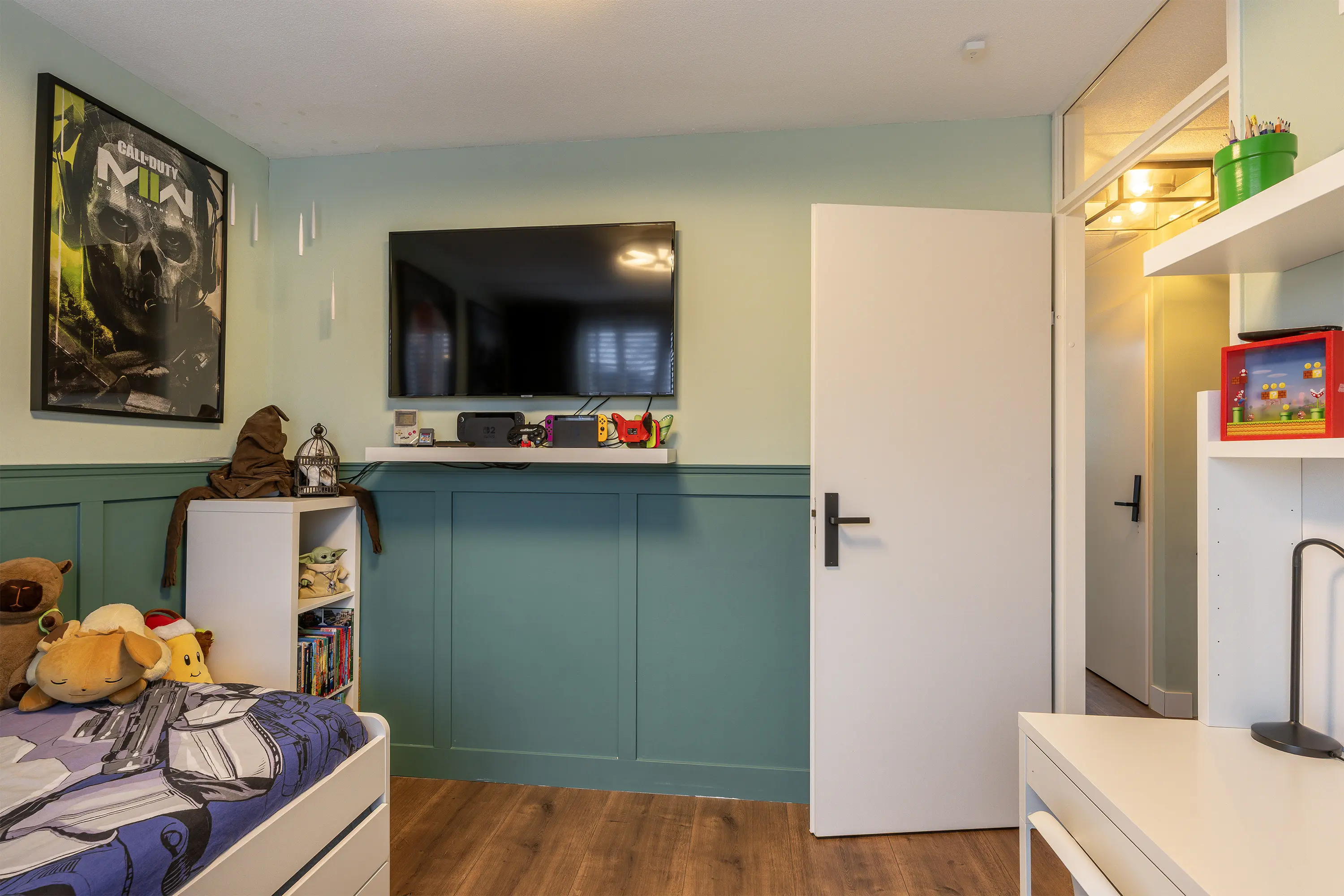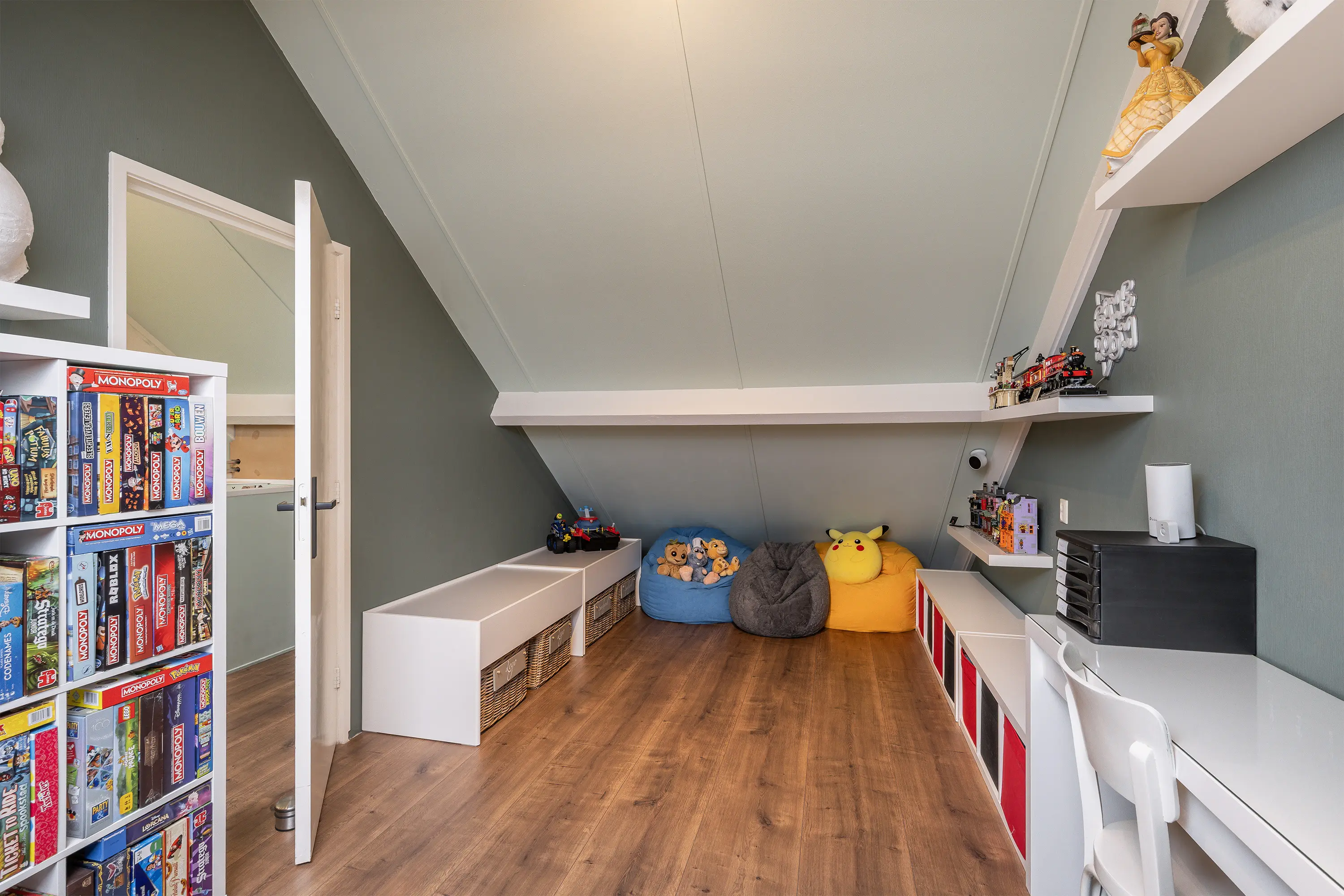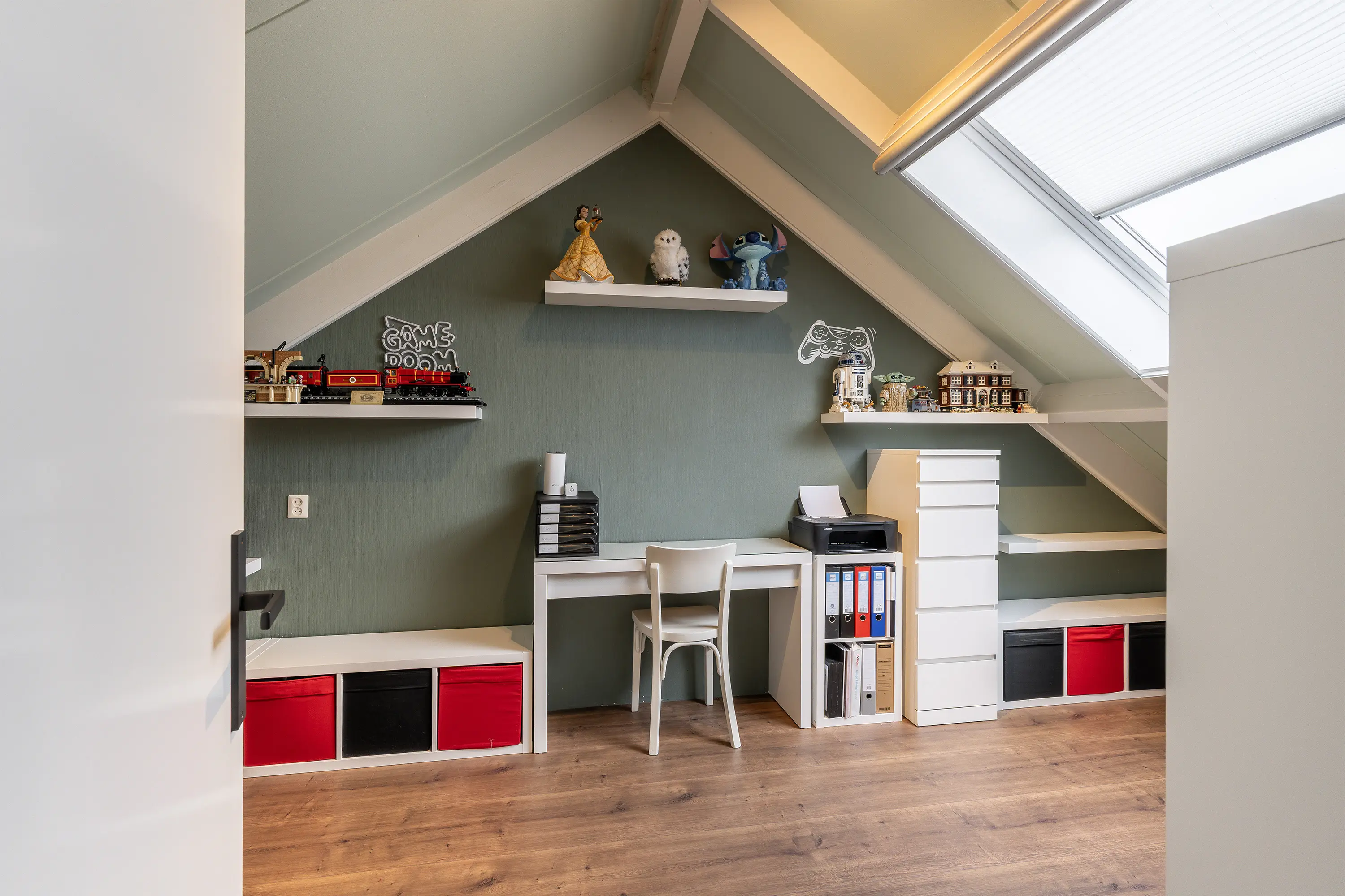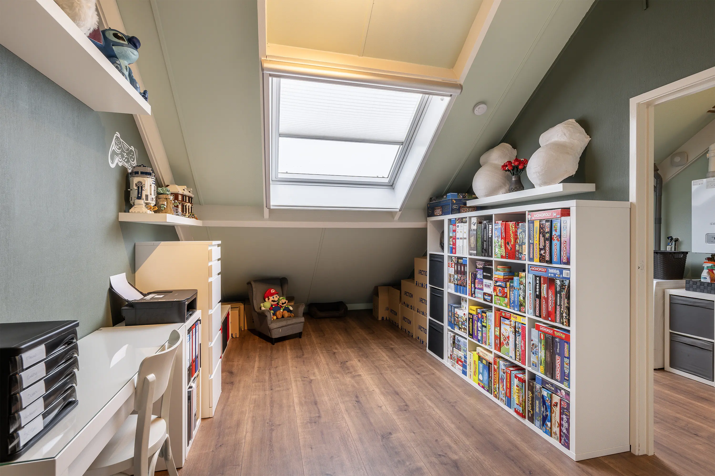 Daarnaast is hier een ruime vierde (slaap)kamer aanwezig, eveneens voorzien van een dakraam. De verdieping is afgewerkt met een onderhoudsvriendelijke laminaatvloer.
