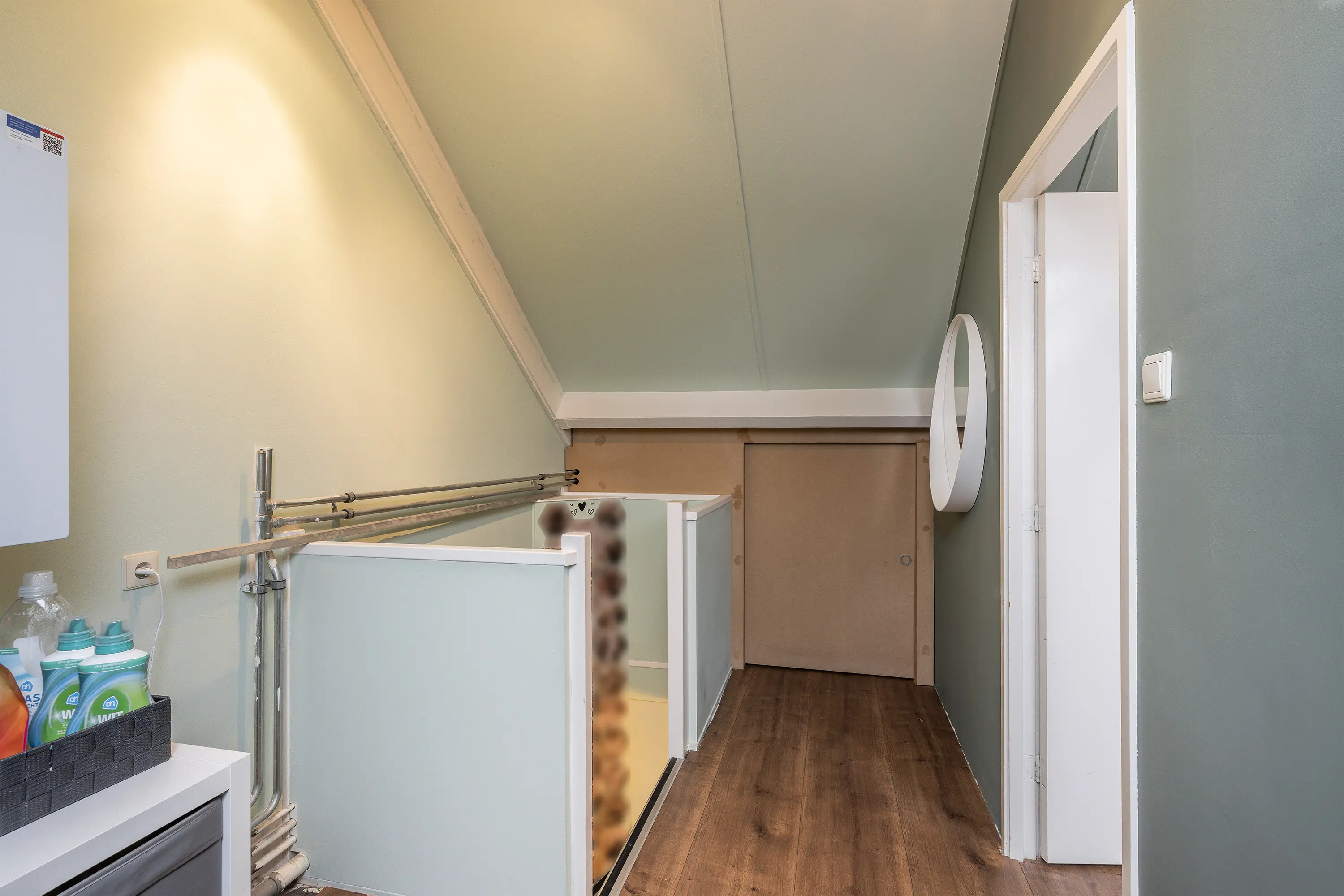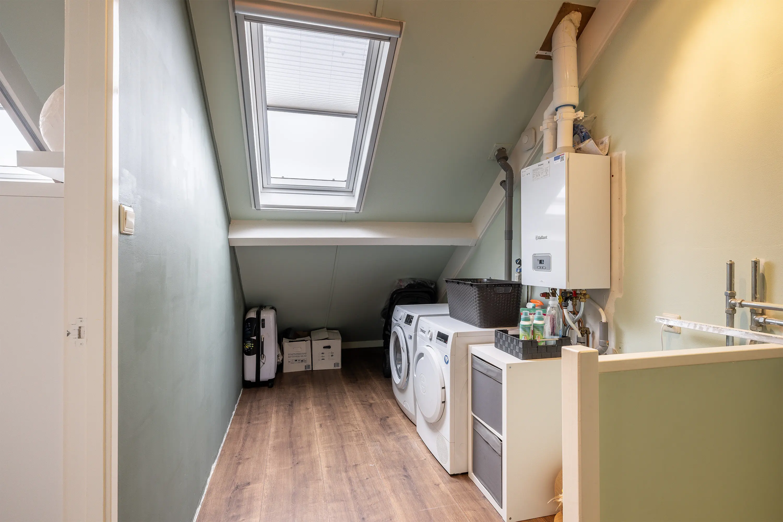 Op de ruime voorzolder bevinden zich de cv-opstelling en de aansluitingen voor wasmachine en droger. Dankzij het Velux dakraam komt hier volop daglicht binnen.