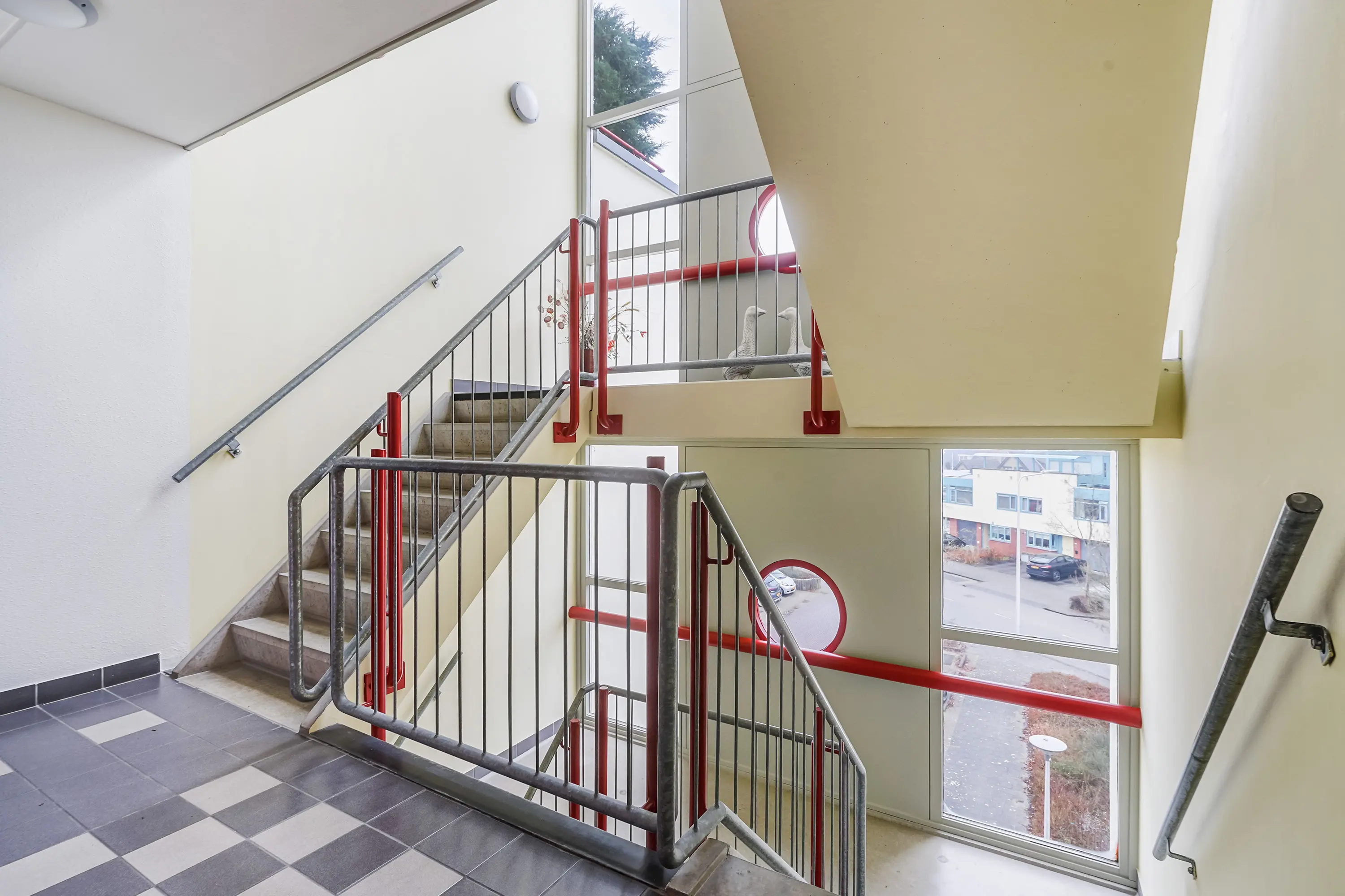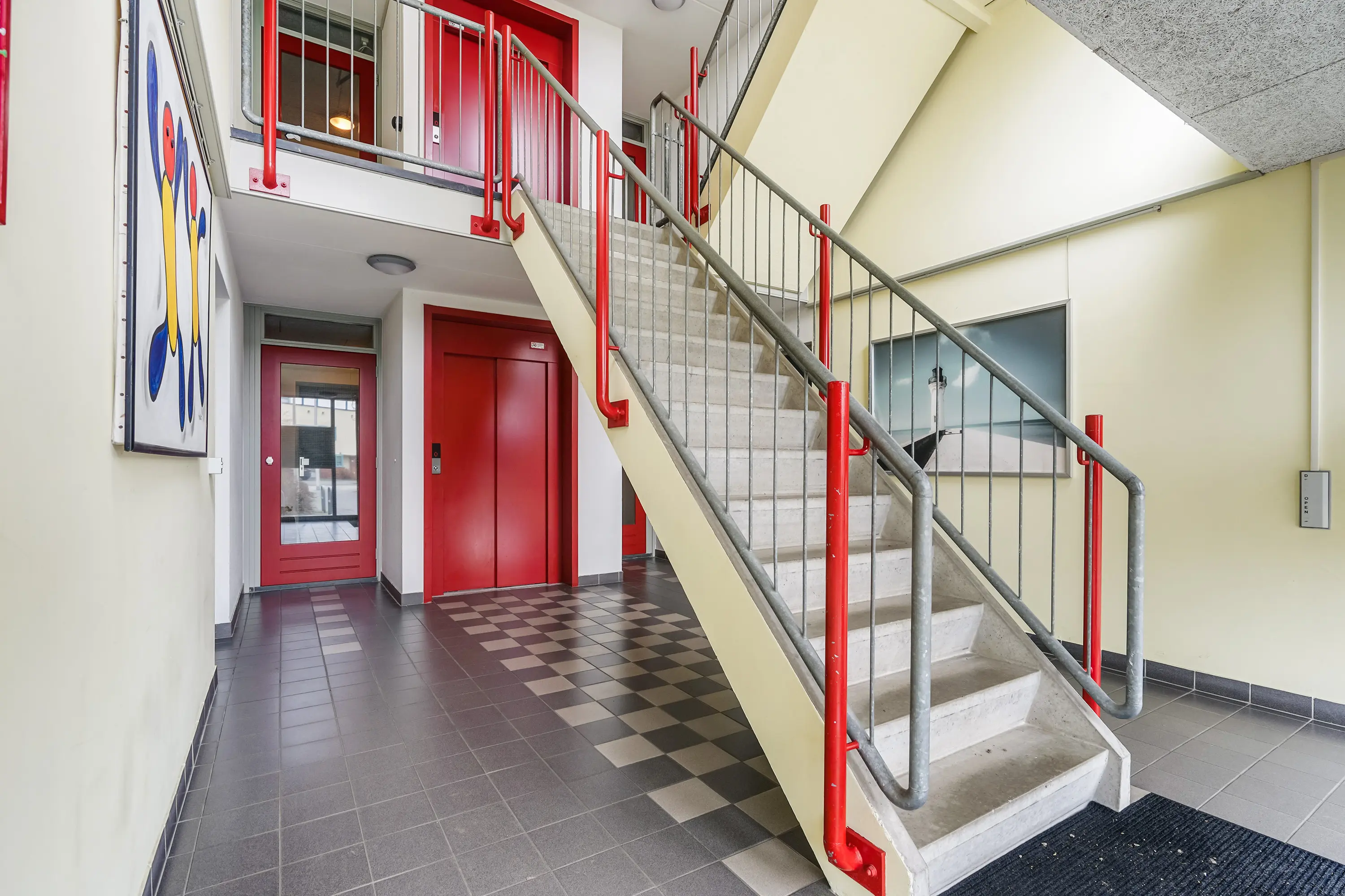 Centrale hal met lift en trapopgang.