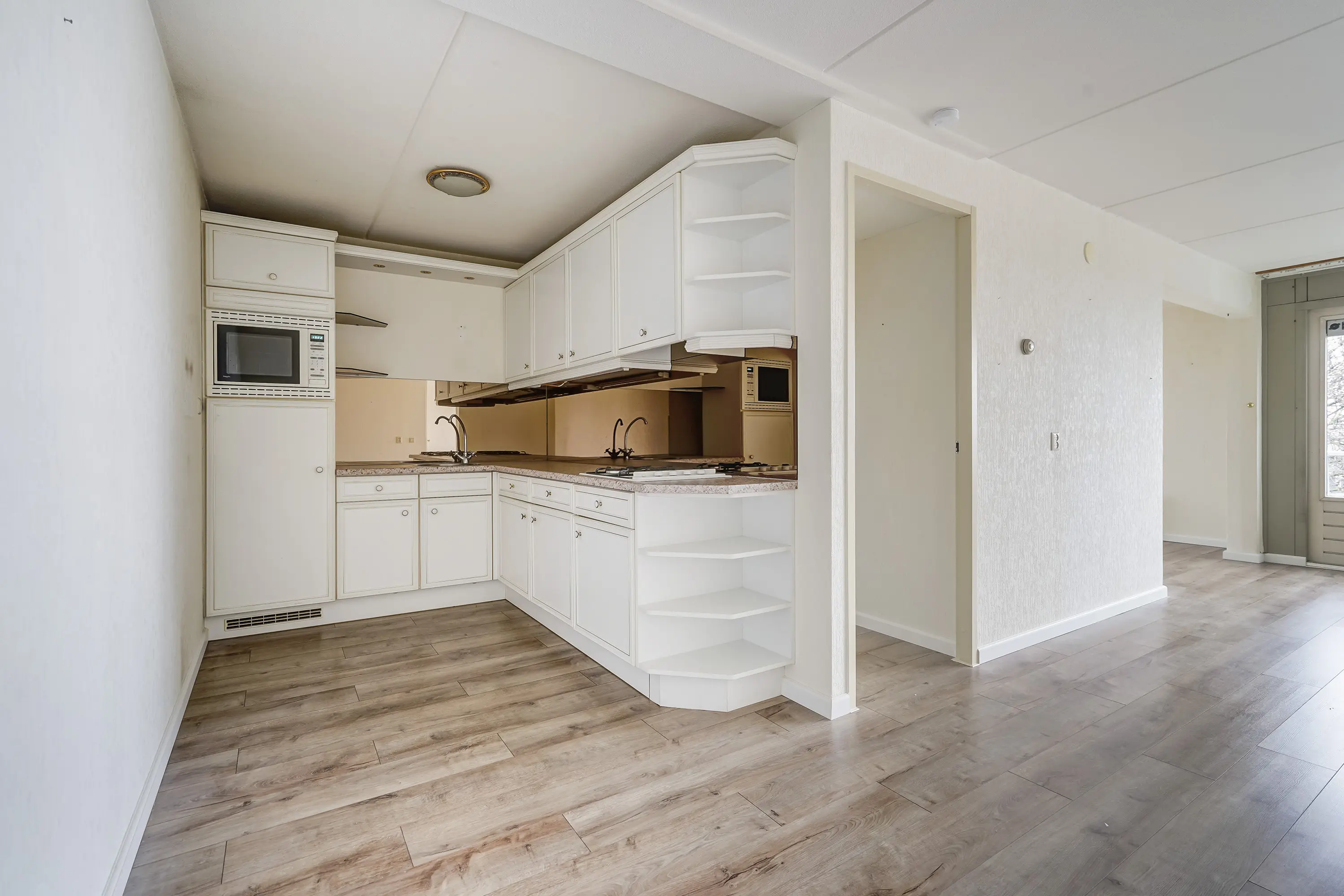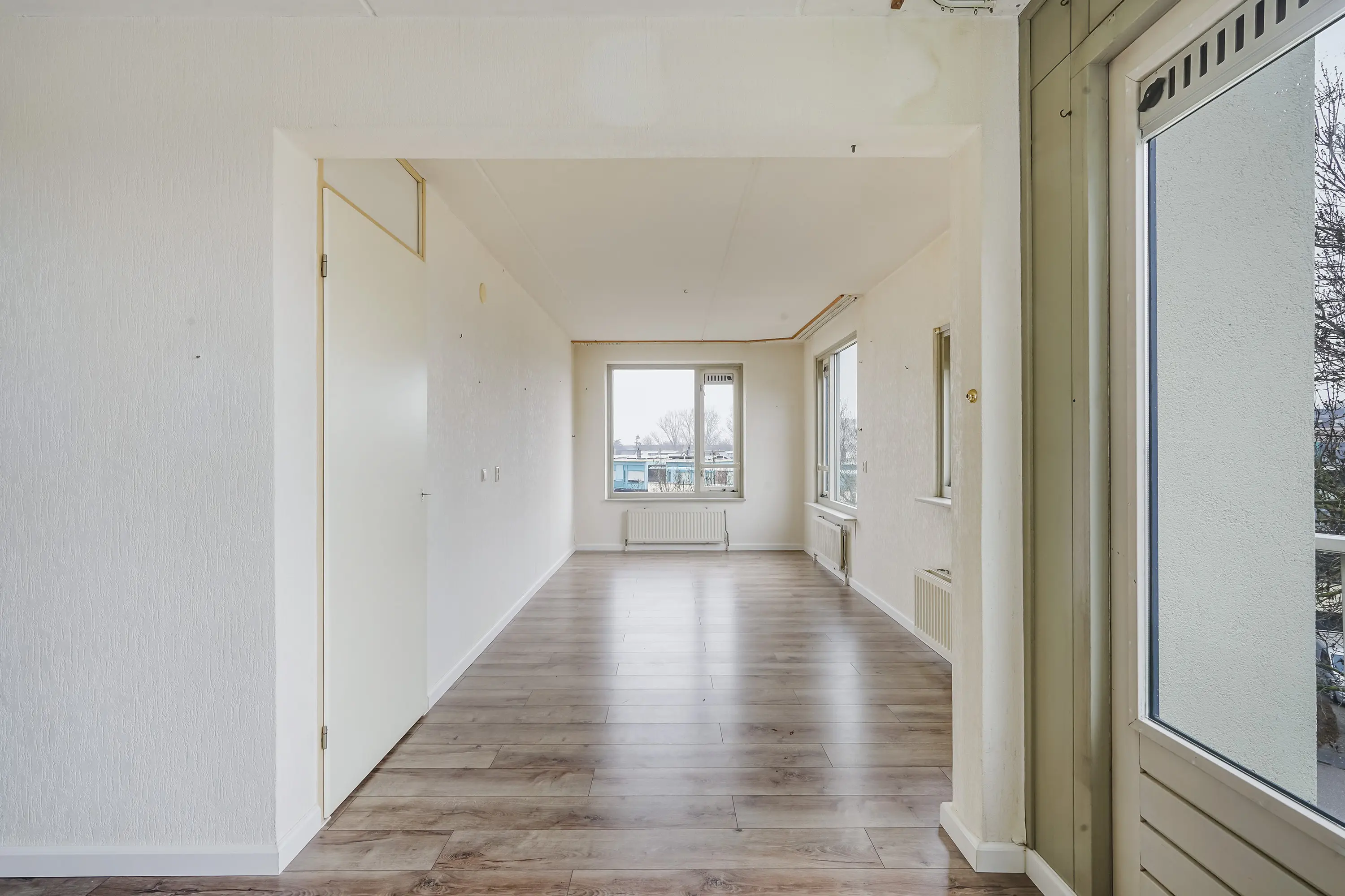 De woonkamer heeft een ruime L-vorm, is voorzien van een laminaatvloer en beschikt over veel raampartijen, wat zorgt voor een prettige en natuurlijke lichtinval. De wanden zijn behangen en in de woonkamer bevindt zich tevens een praktische vaste kast met daarin de cv-ketel en de mechanische ventilatie opgesteld.