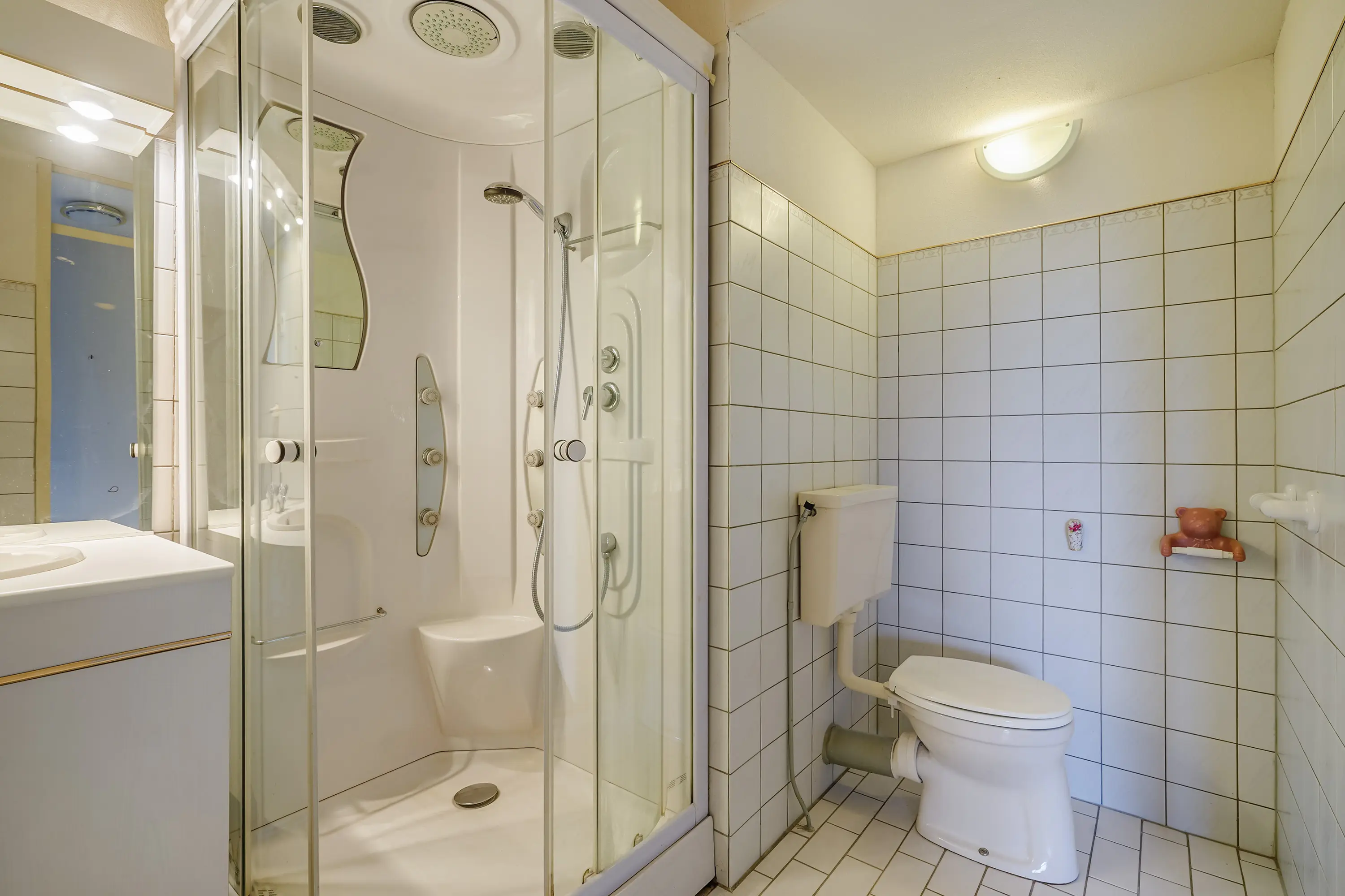 - Badkamer met toilet, douchecabine en wastafelmeubel;