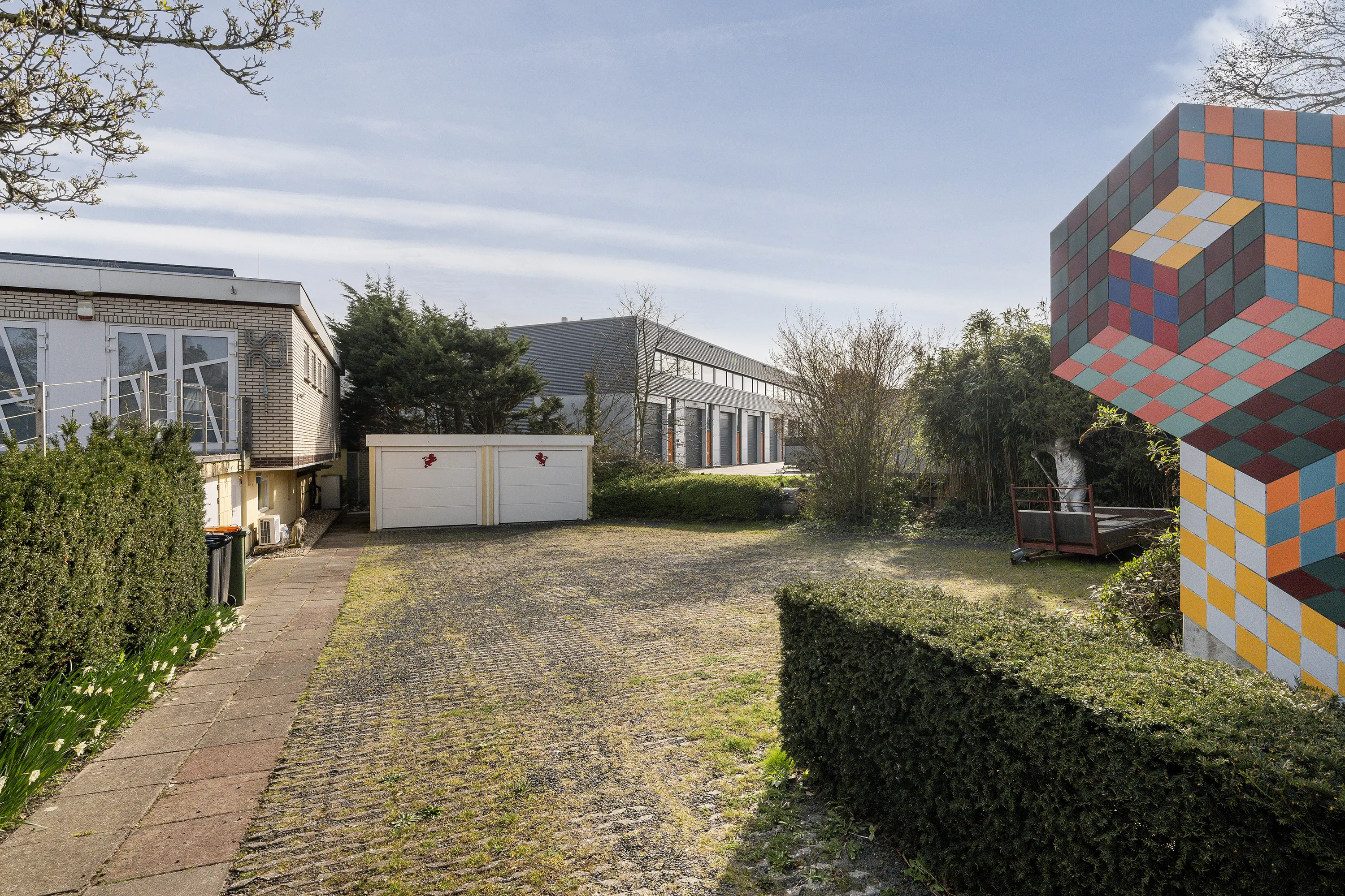 De woning beschikt over een dubbele garage en een grote fietsenberging, beide praktisch bereikbaar en uitstekend geschikt voor opslag, stalling en hobby’s. Op eigen terrein is ruime parkeergelegenheid voor meerdere auto’s.