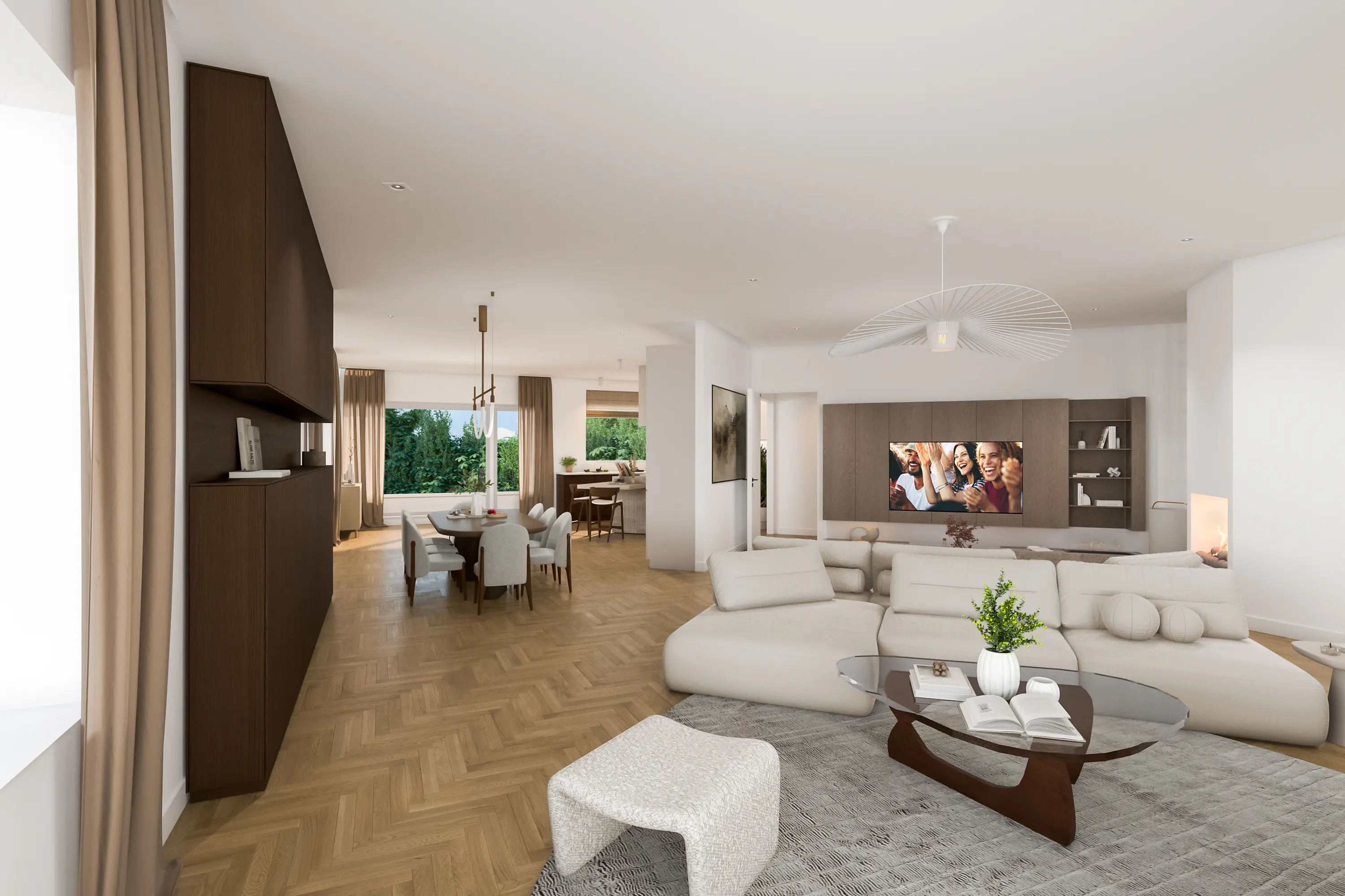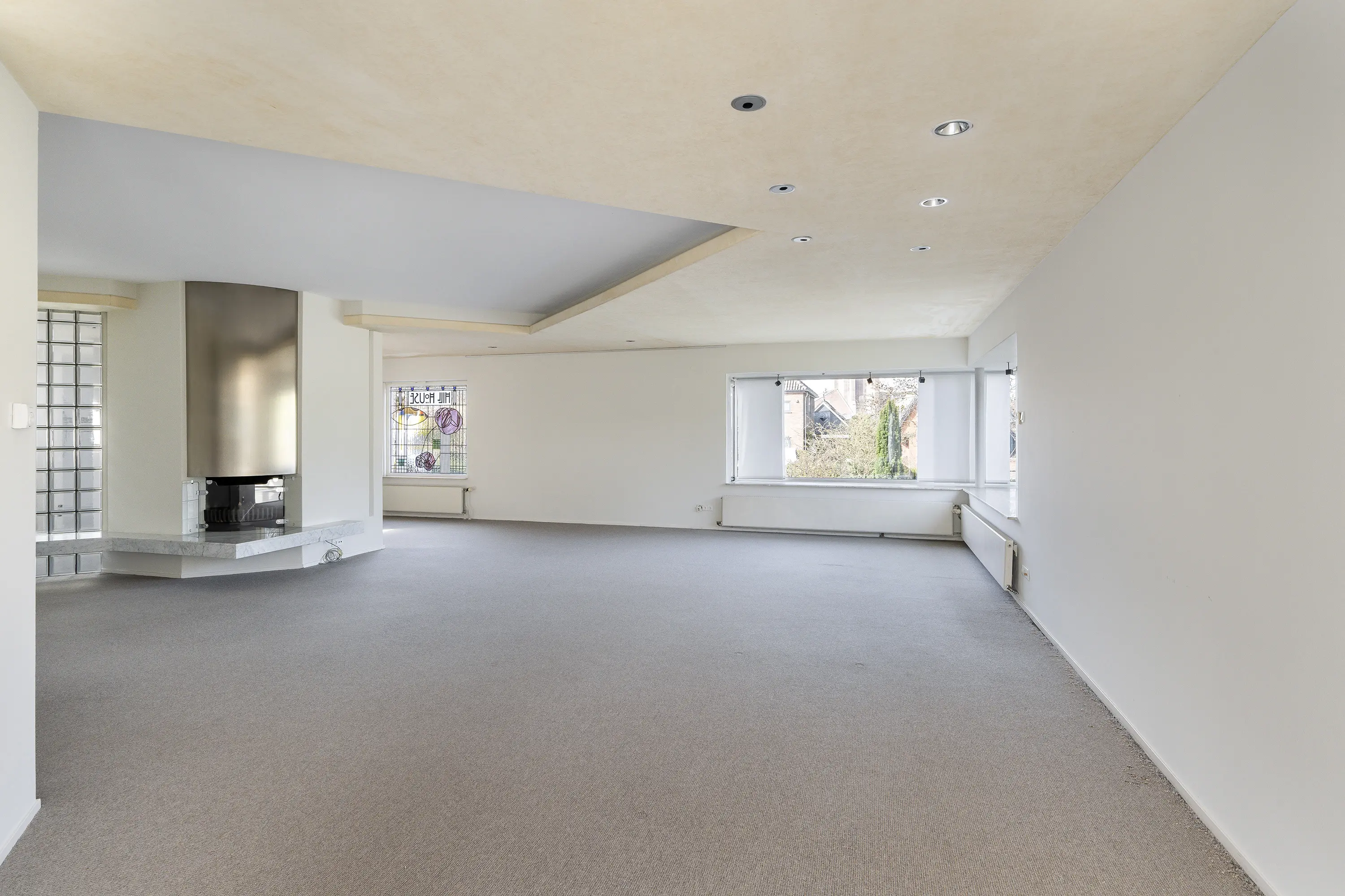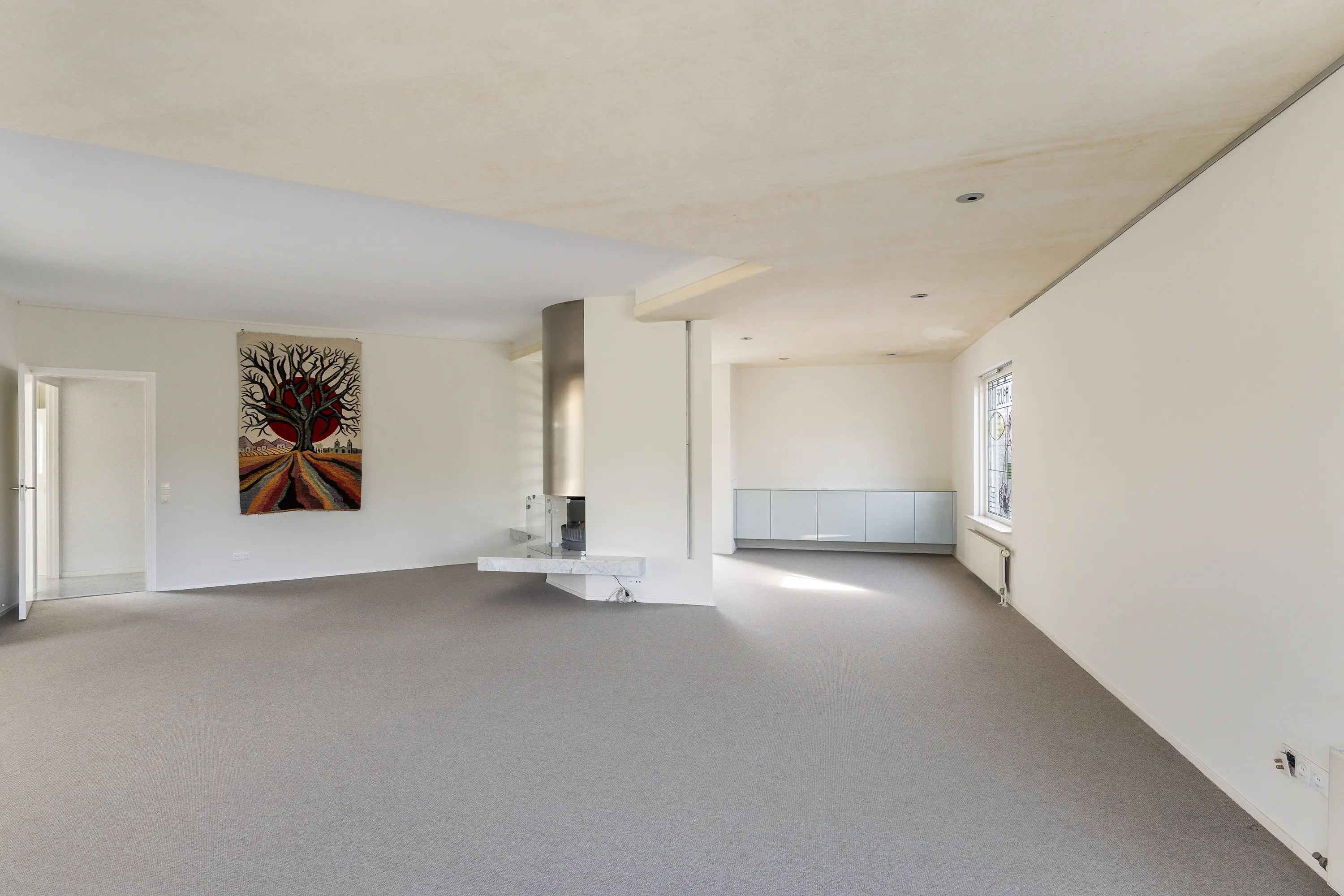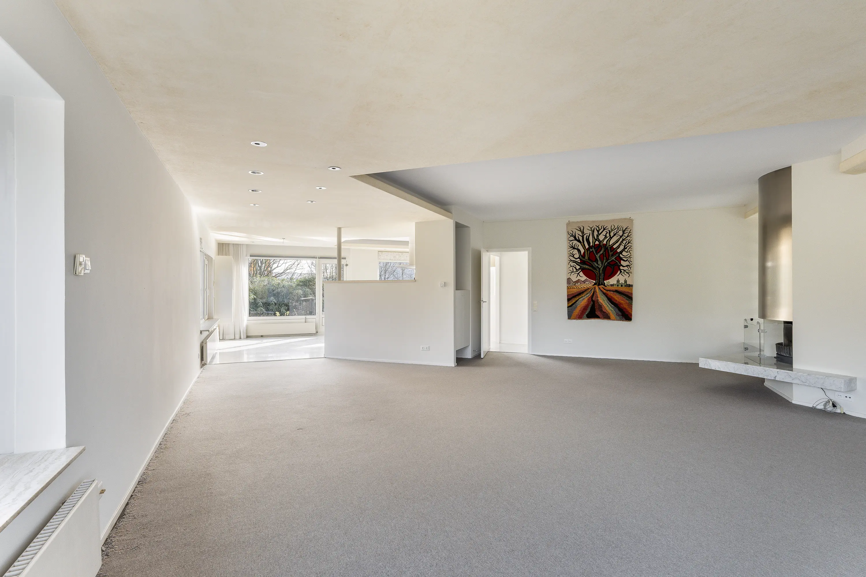 Vanuit de hal bereikt u de riante woonkamer met een sfeervolle haard, grote raampartijen en zicht op de tuin. De living biedt meerdere indelingsvarianten en heeft een warme, uitnodigende sfeer.