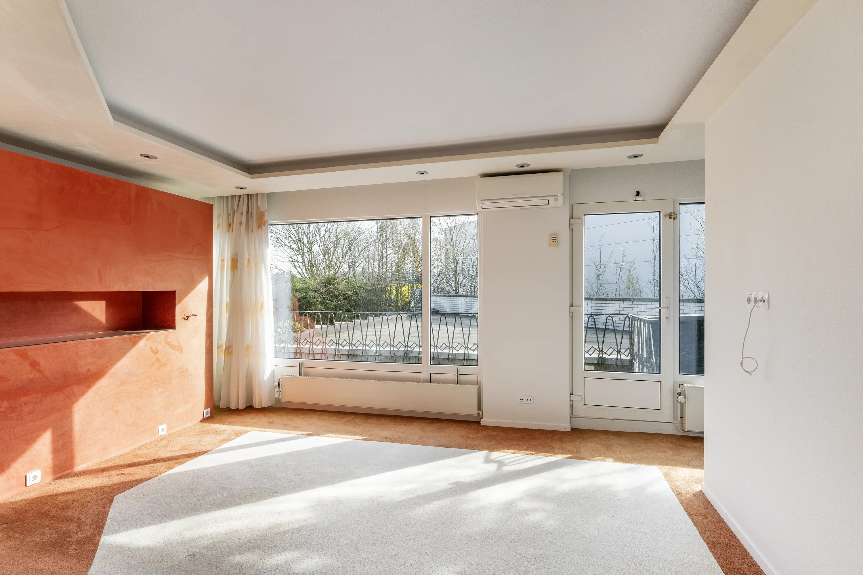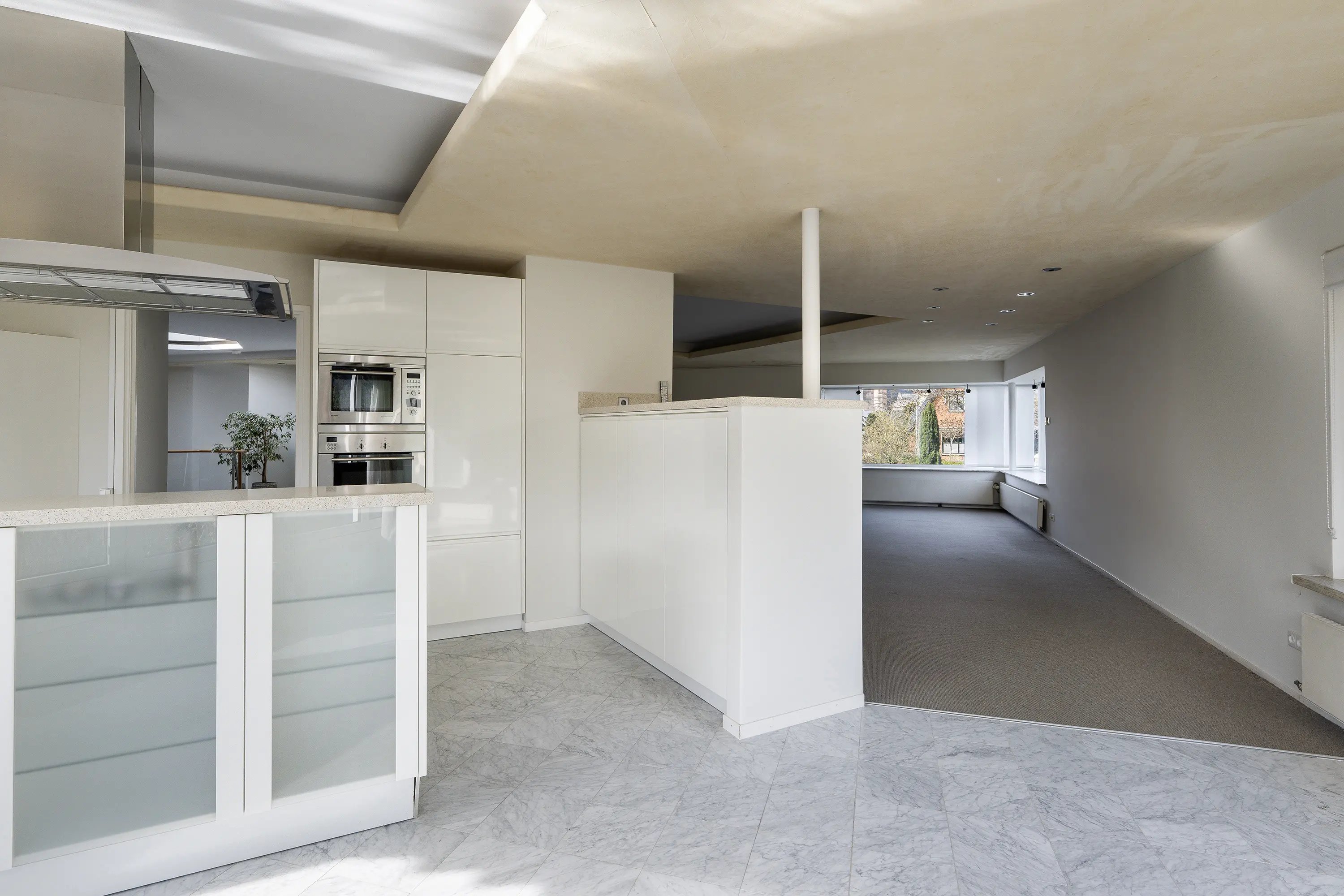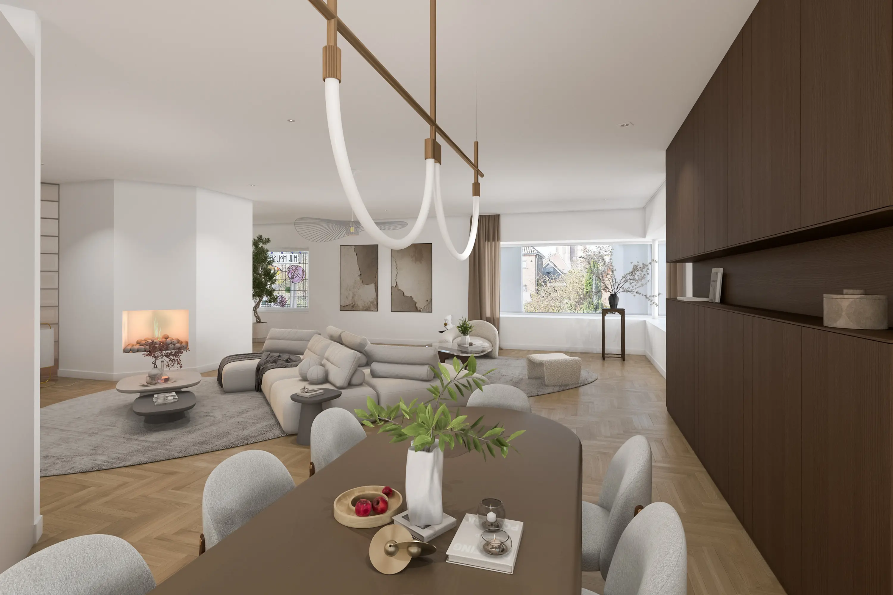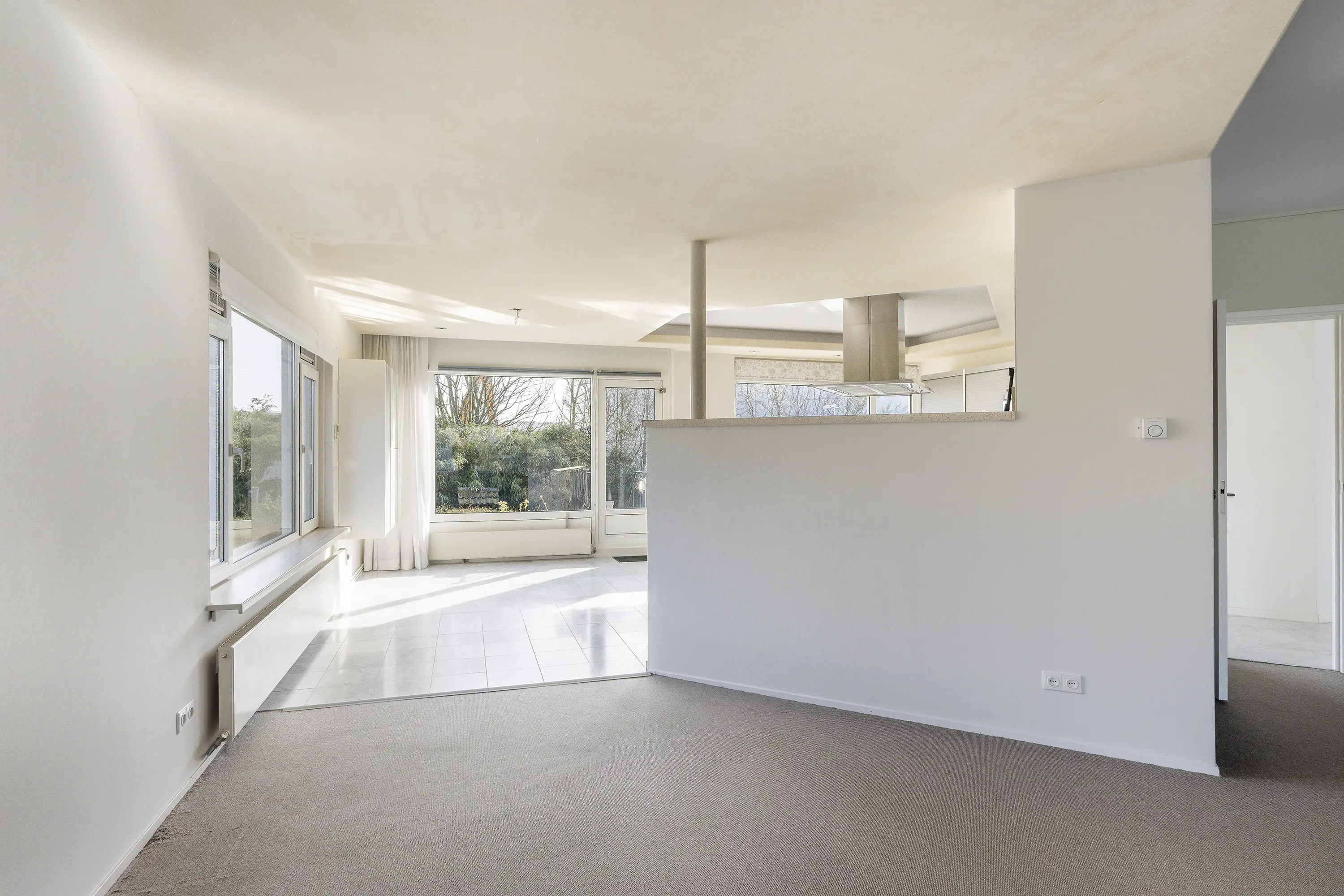 Vanuit de hal bereikt u de riante woonkamer met een sfeervolle haard, grote raampartijen en zicht op de tuin. De living biedt meerdere indelingsvarianten en heeft een warme, uitnodigende sfeer.