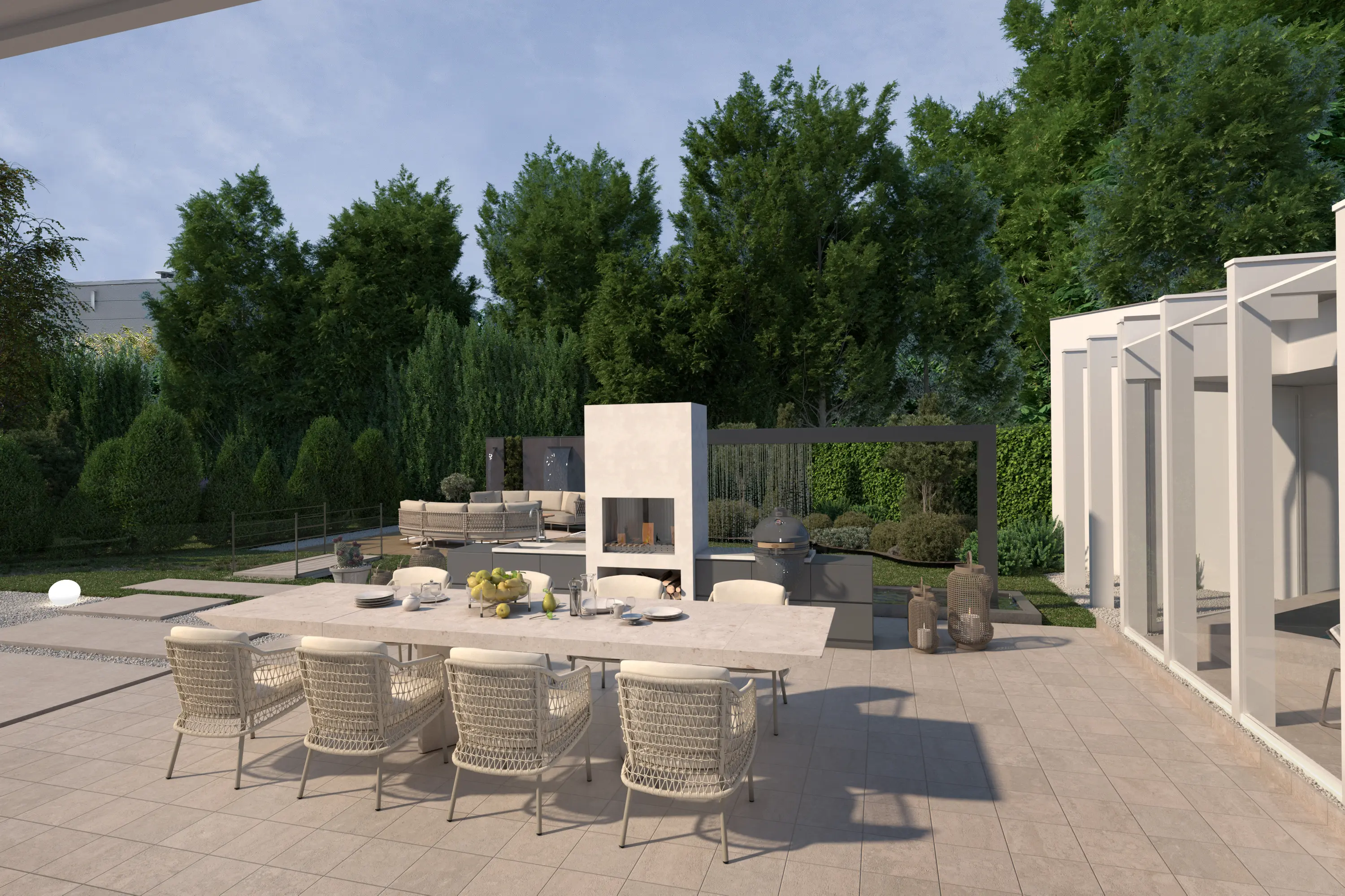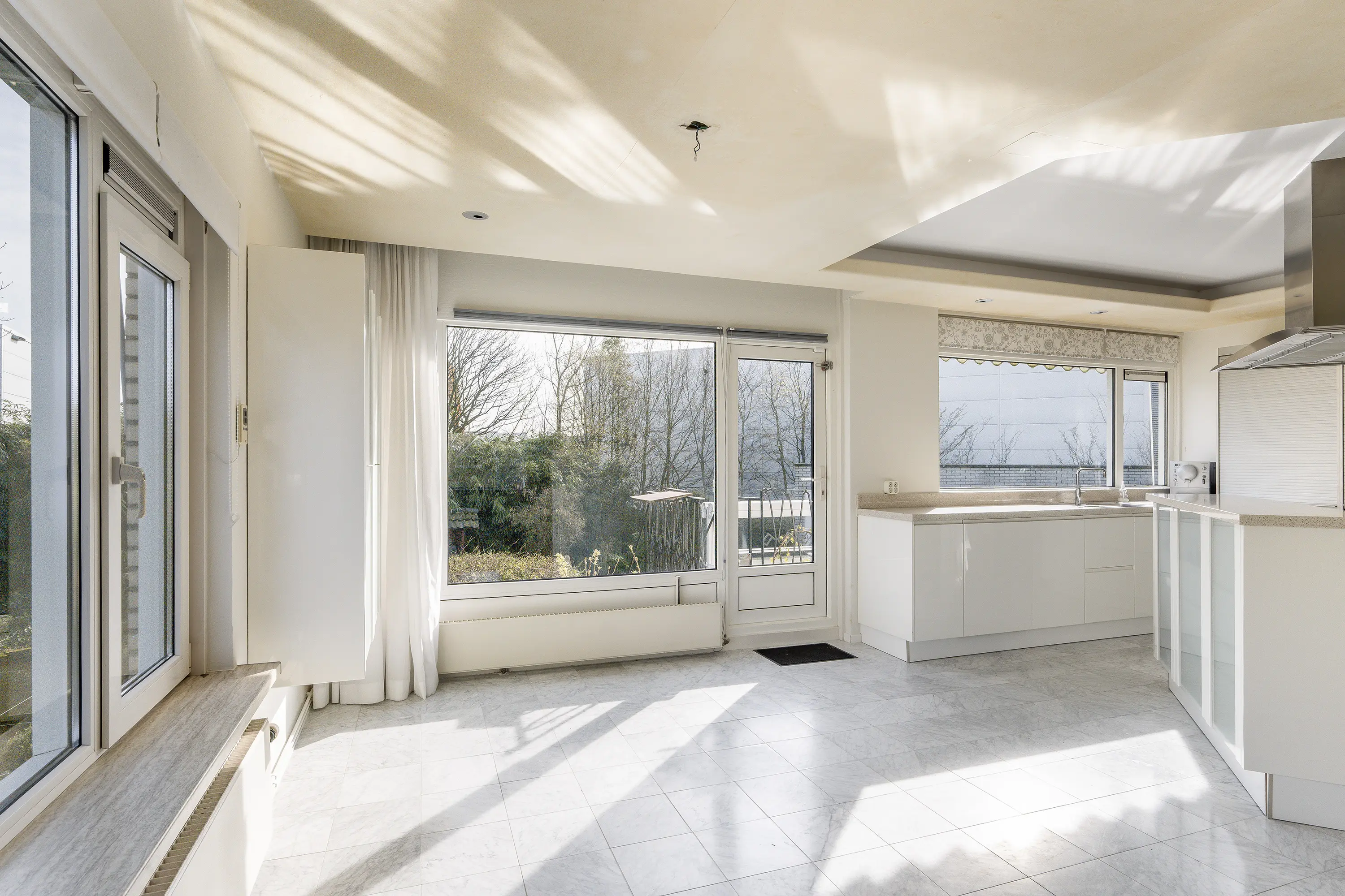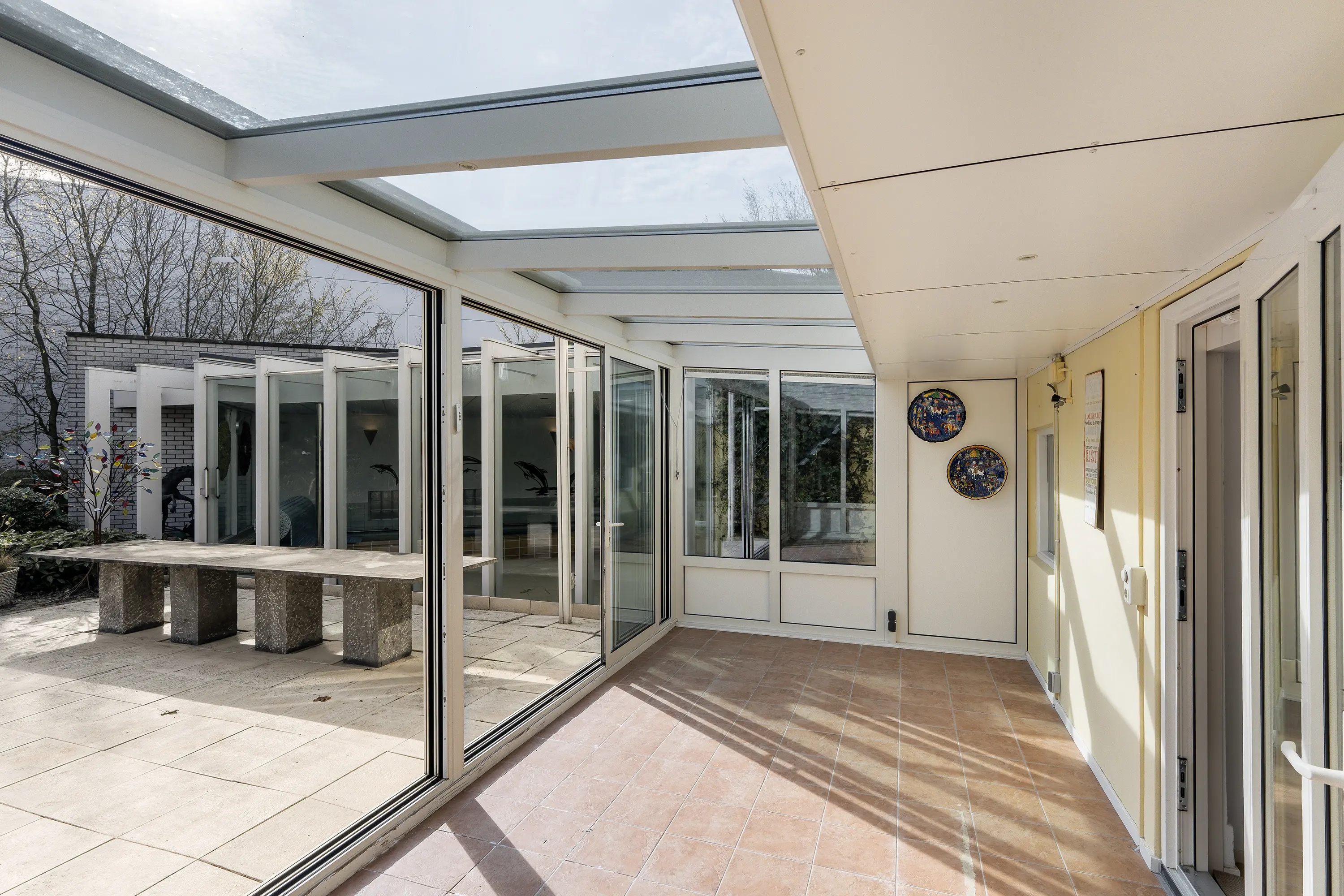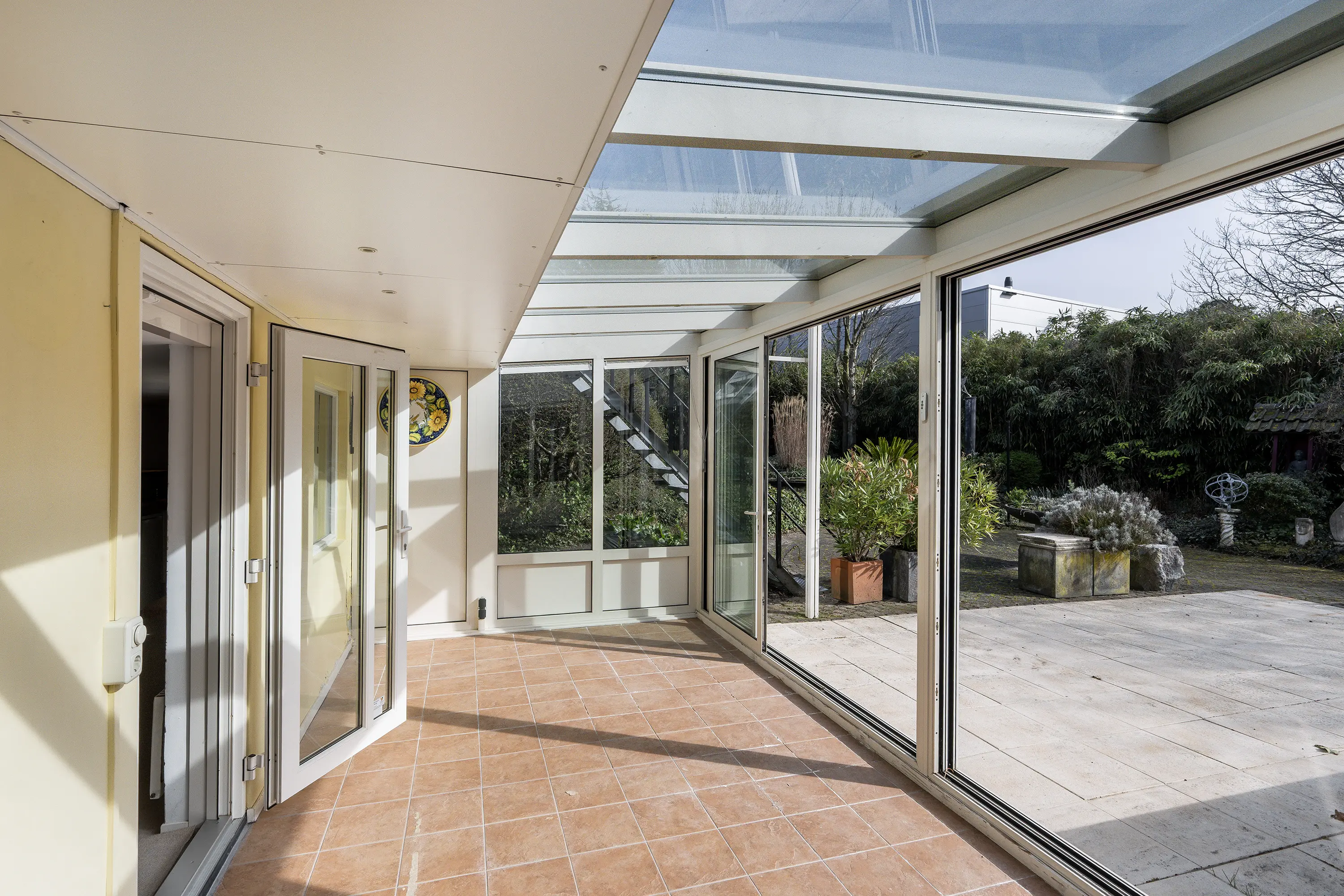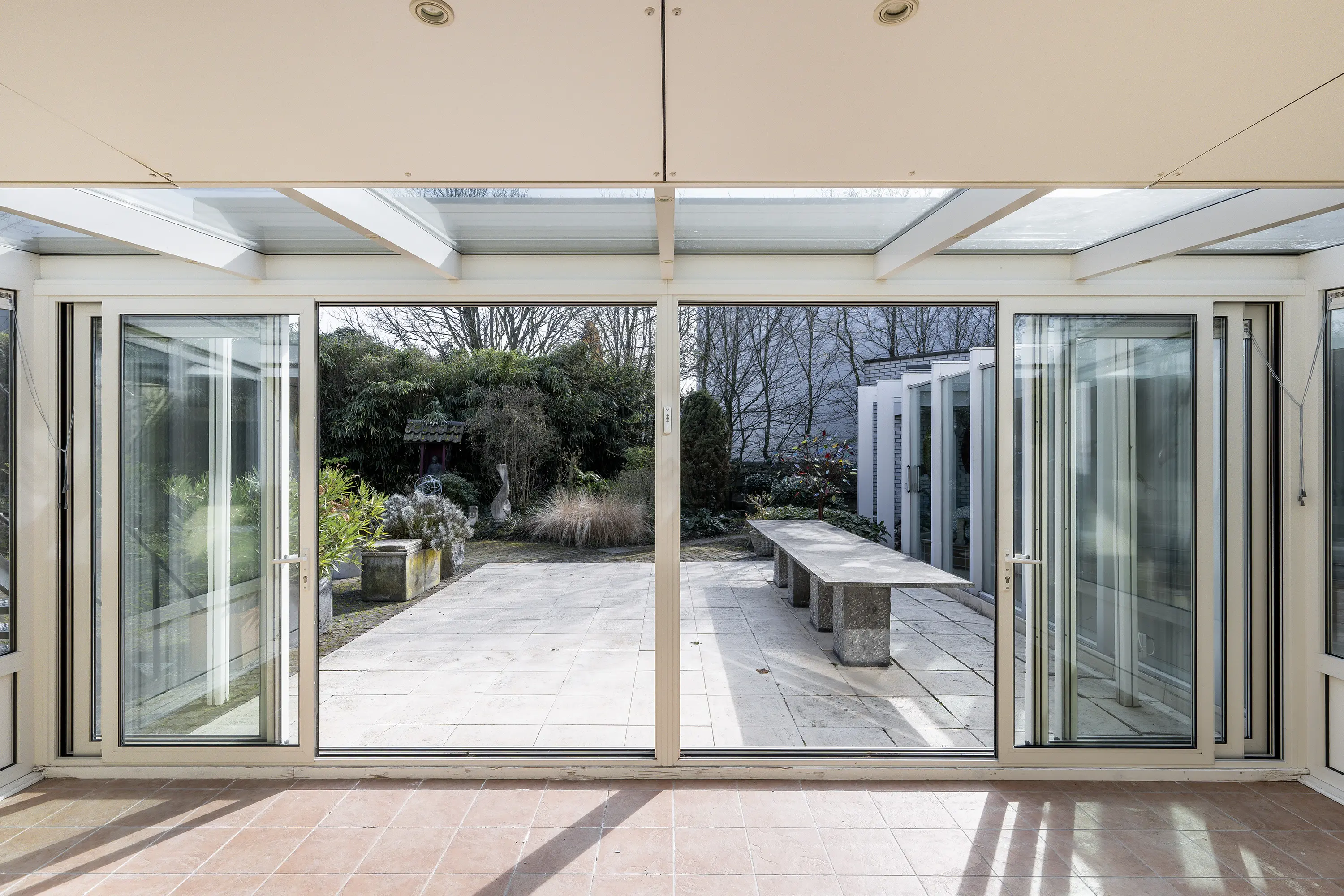 Grenzend aan de recreatieruimte bevindt zich de serre, een lichte en beschutte ruimte aan de achterzijde van de woning. Met de directe verbinding naar buiten en het uitzicht op het omliggende groen vormt dit een ideale plek voor lange diners, ontspanning of een rustig moment met een boek.