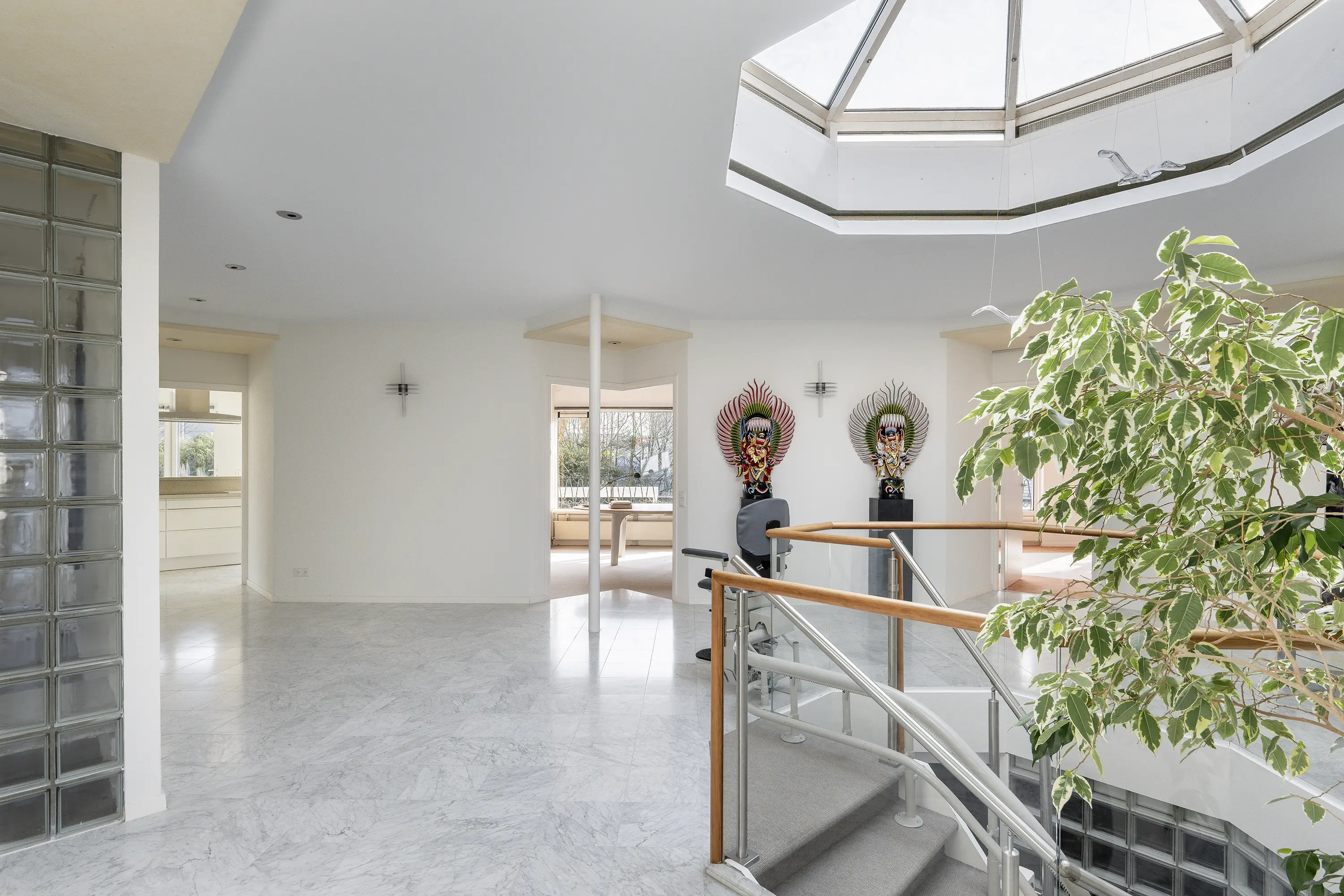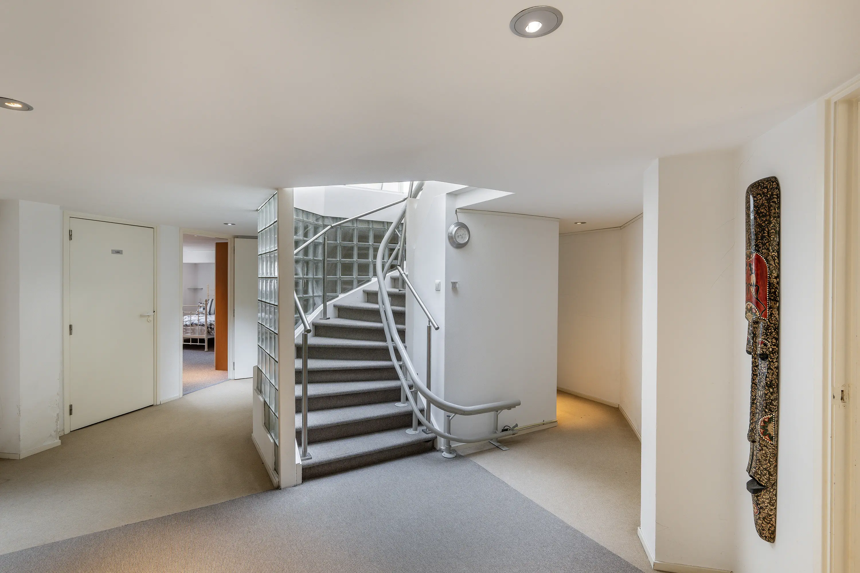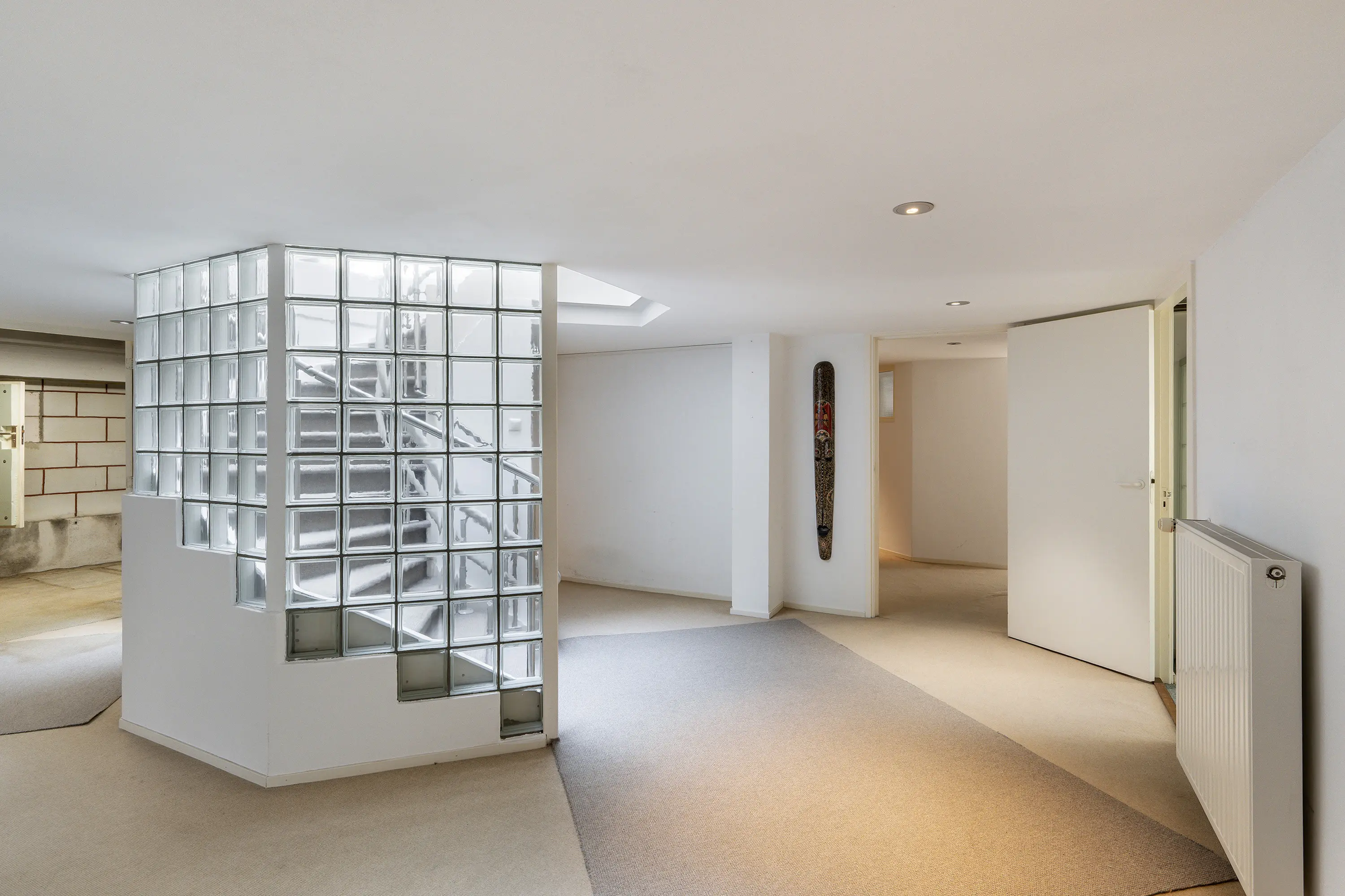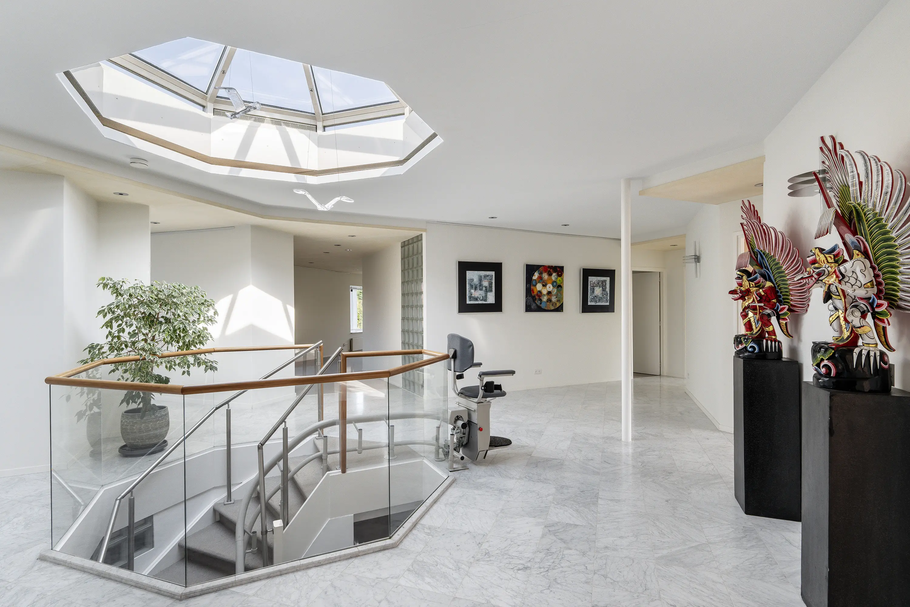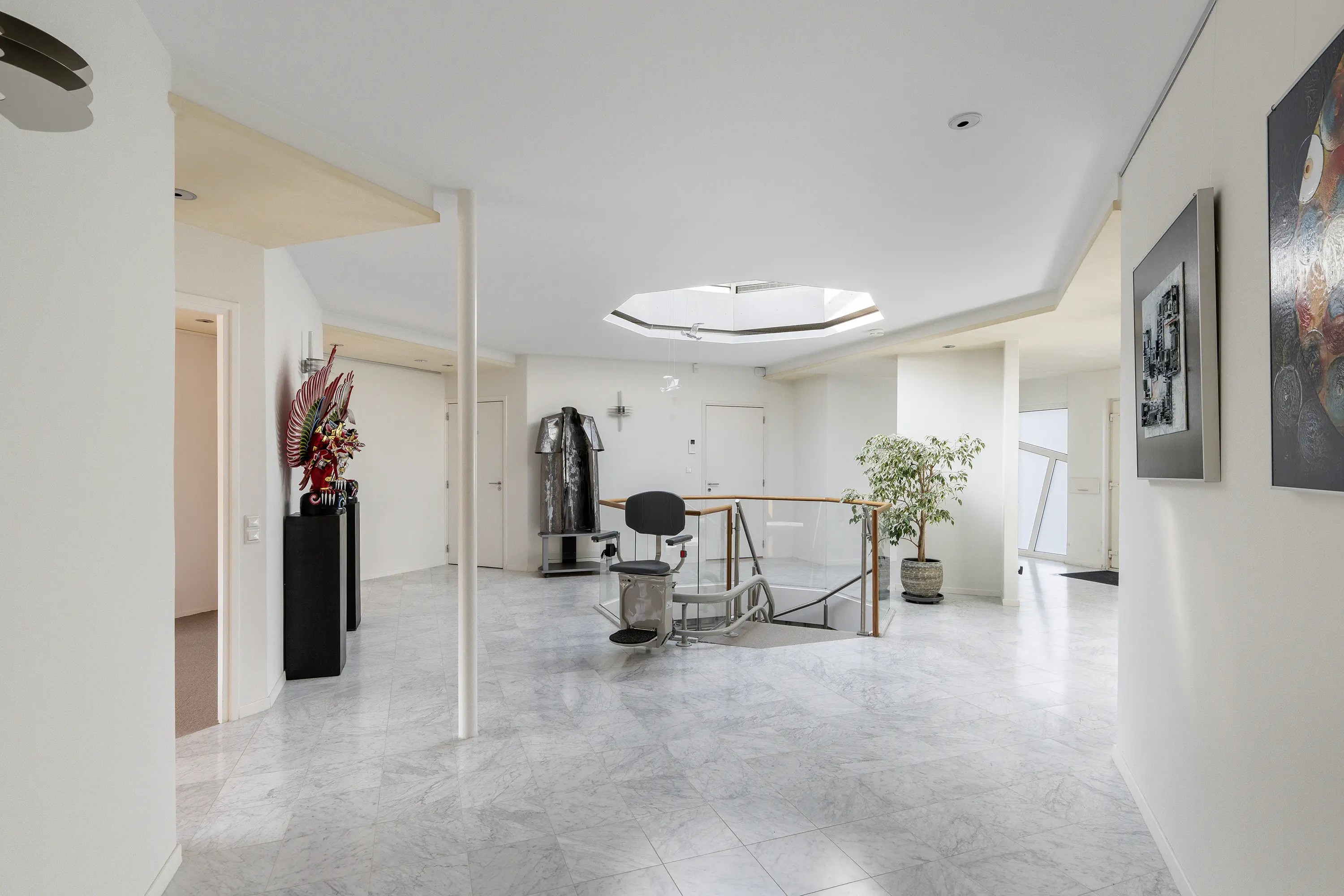 Bij binnenkomst wordt u ontvangen in een royale hal met elegante trap naar het souterrain. Het prachtige daklicht boven de trap zorgt voor een constante instroom van daglicht.