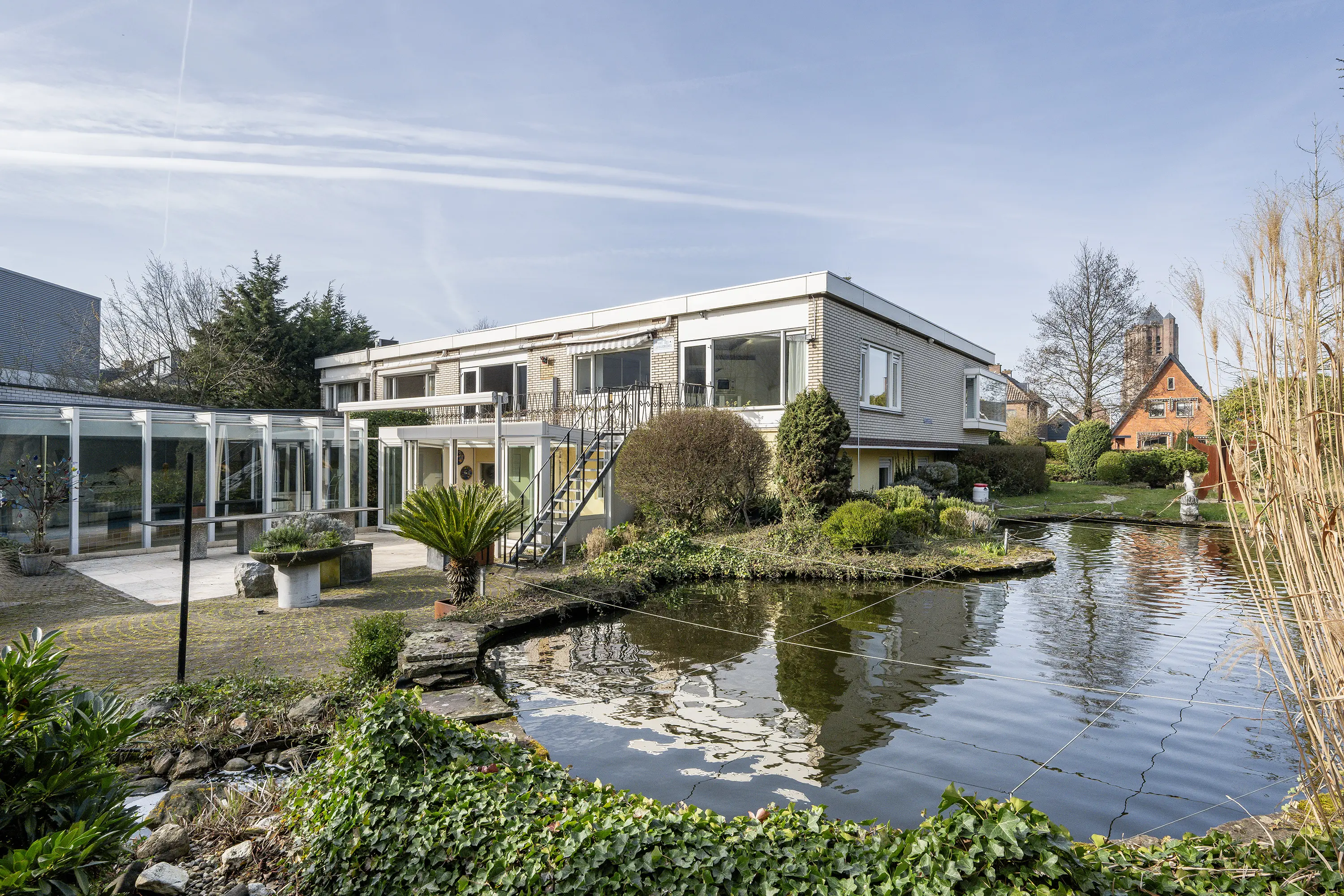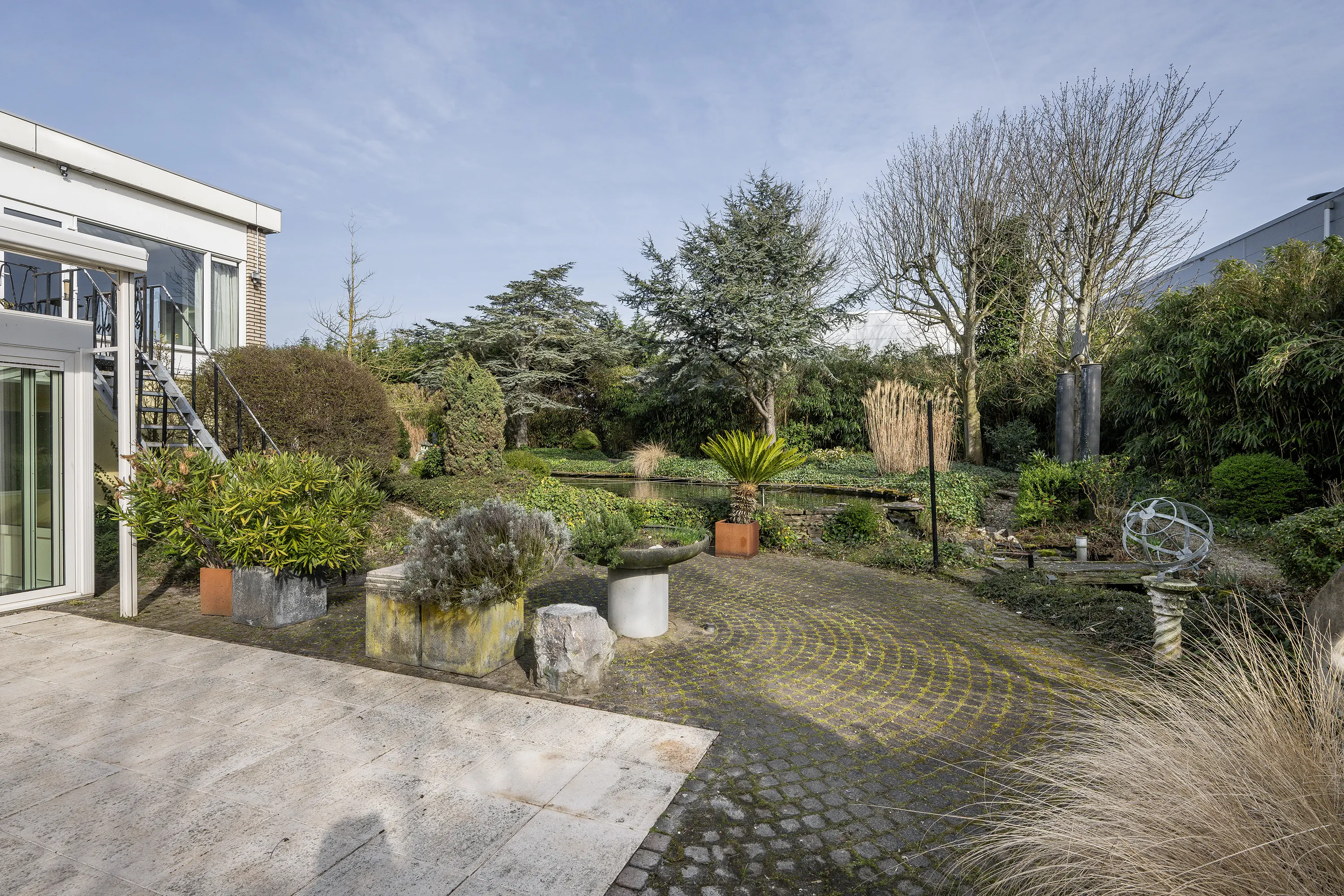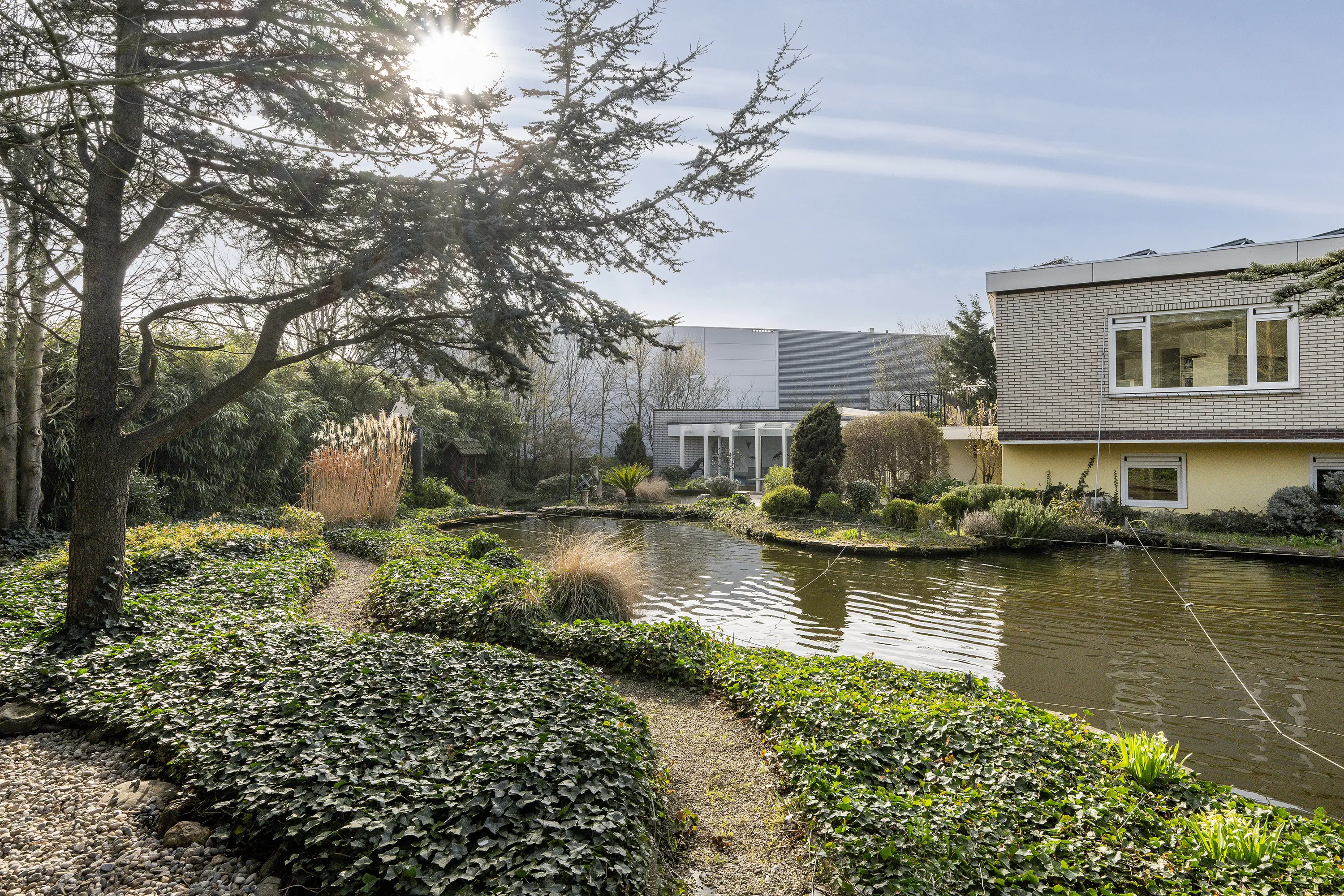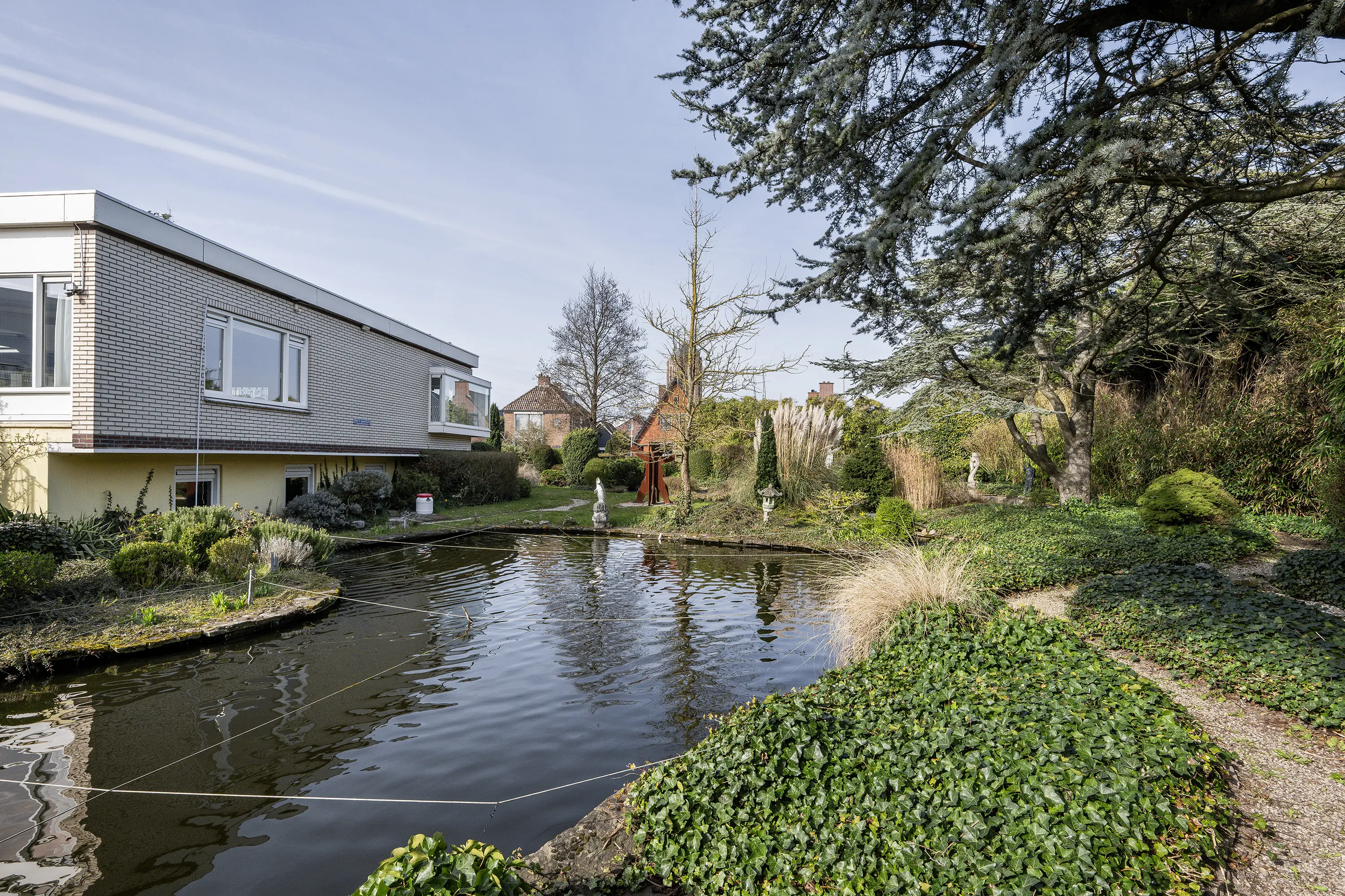 De rondom de woning gelegen volwassen tuin is onder architectuur aangelegd en kenmerkt zich door rijke beplanting, volwassen bomen, veel groen en een fraaie vijverpartij. Dankzij de omvang, de beschutte ligging en meerdere terrassen geniet u hier van maximale rust en privacy, met altijd een plek in zon of schaduw.