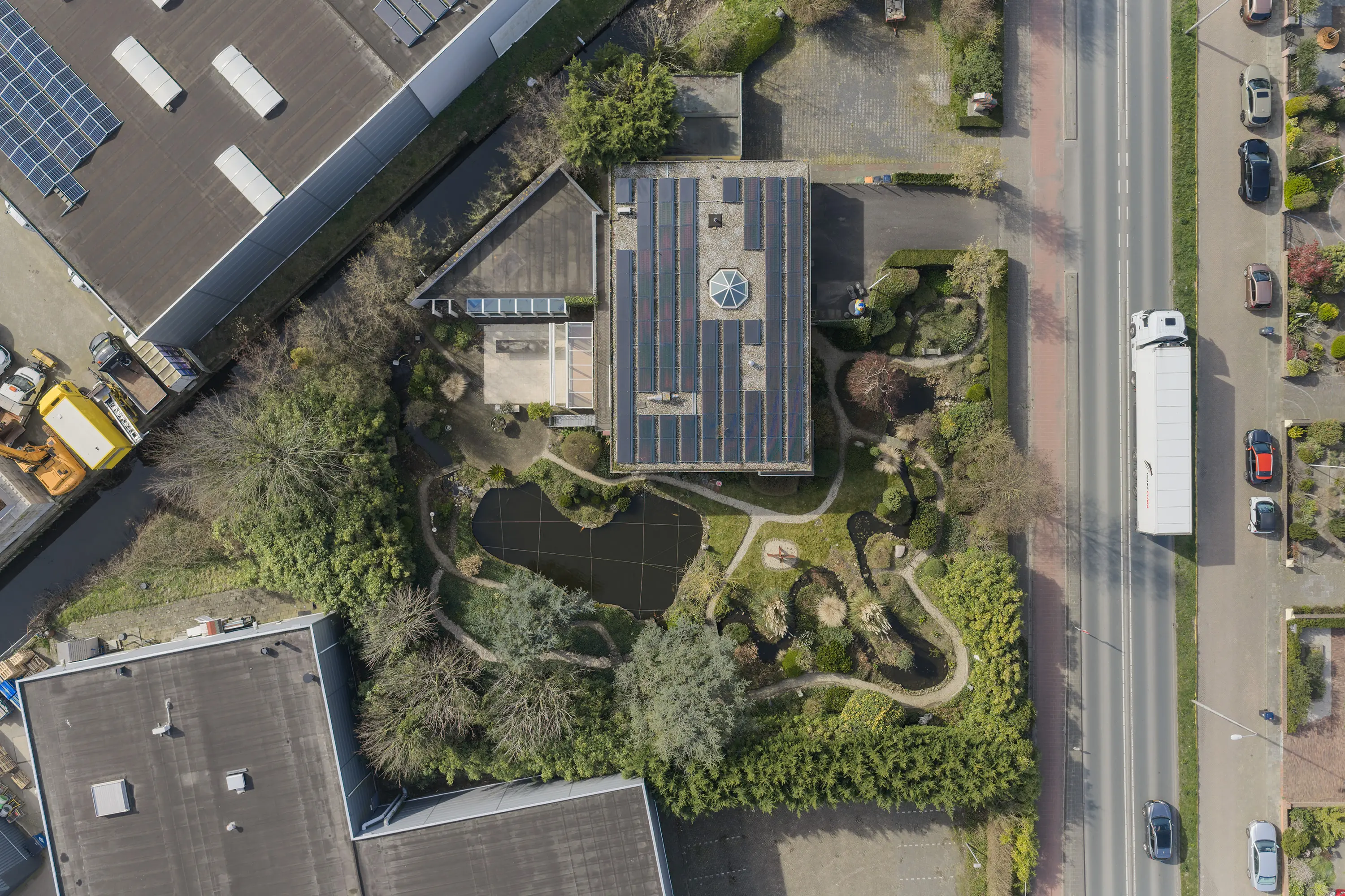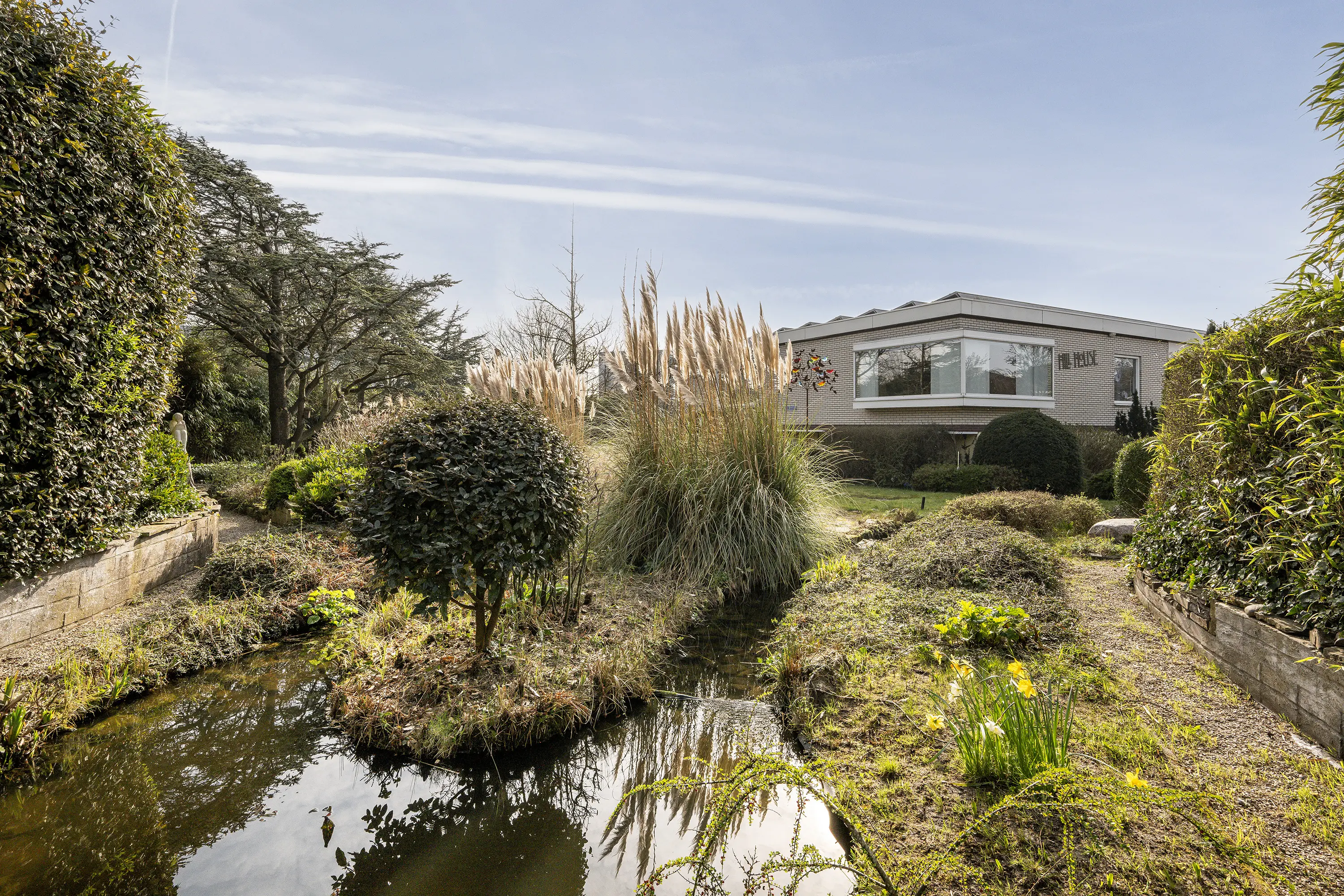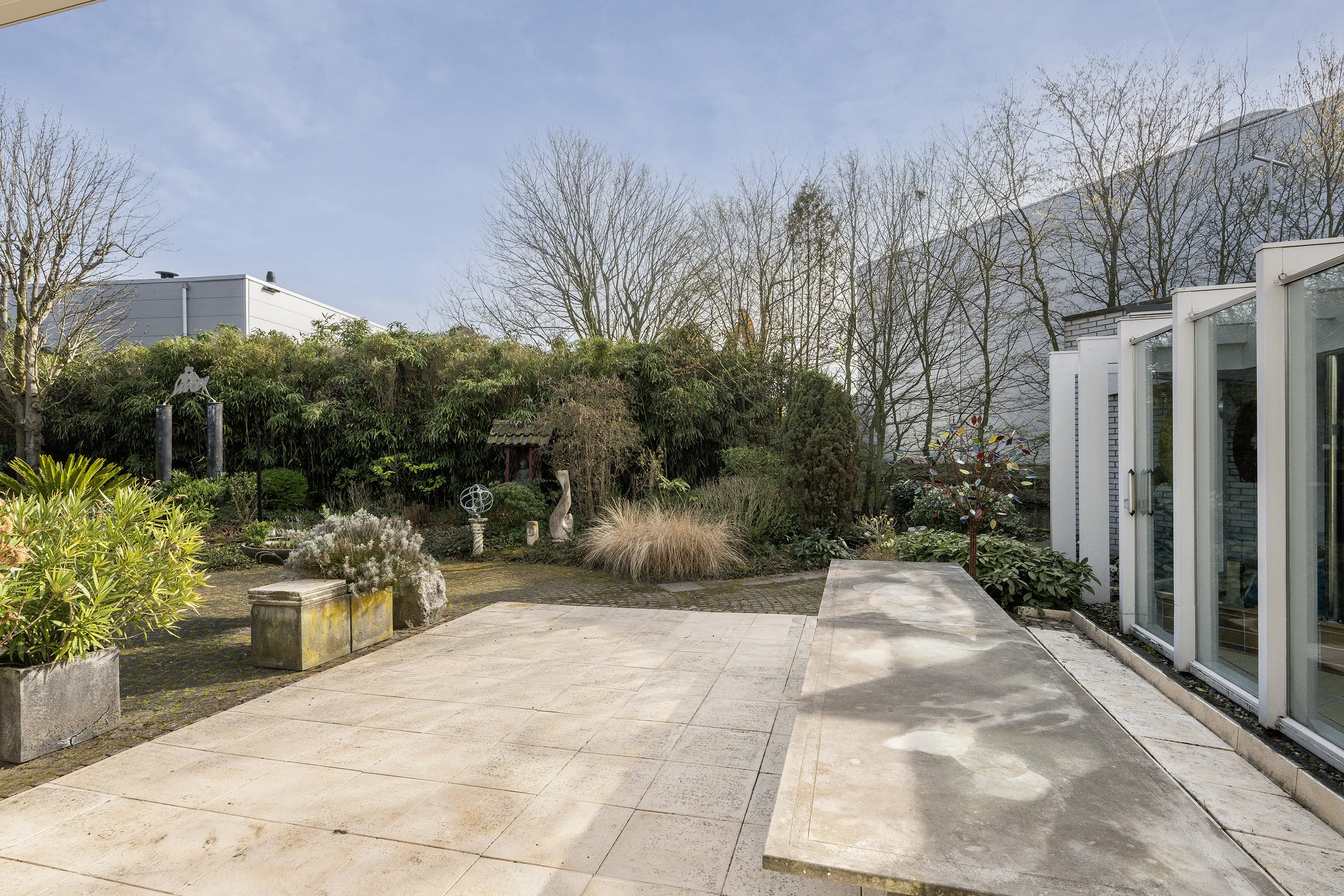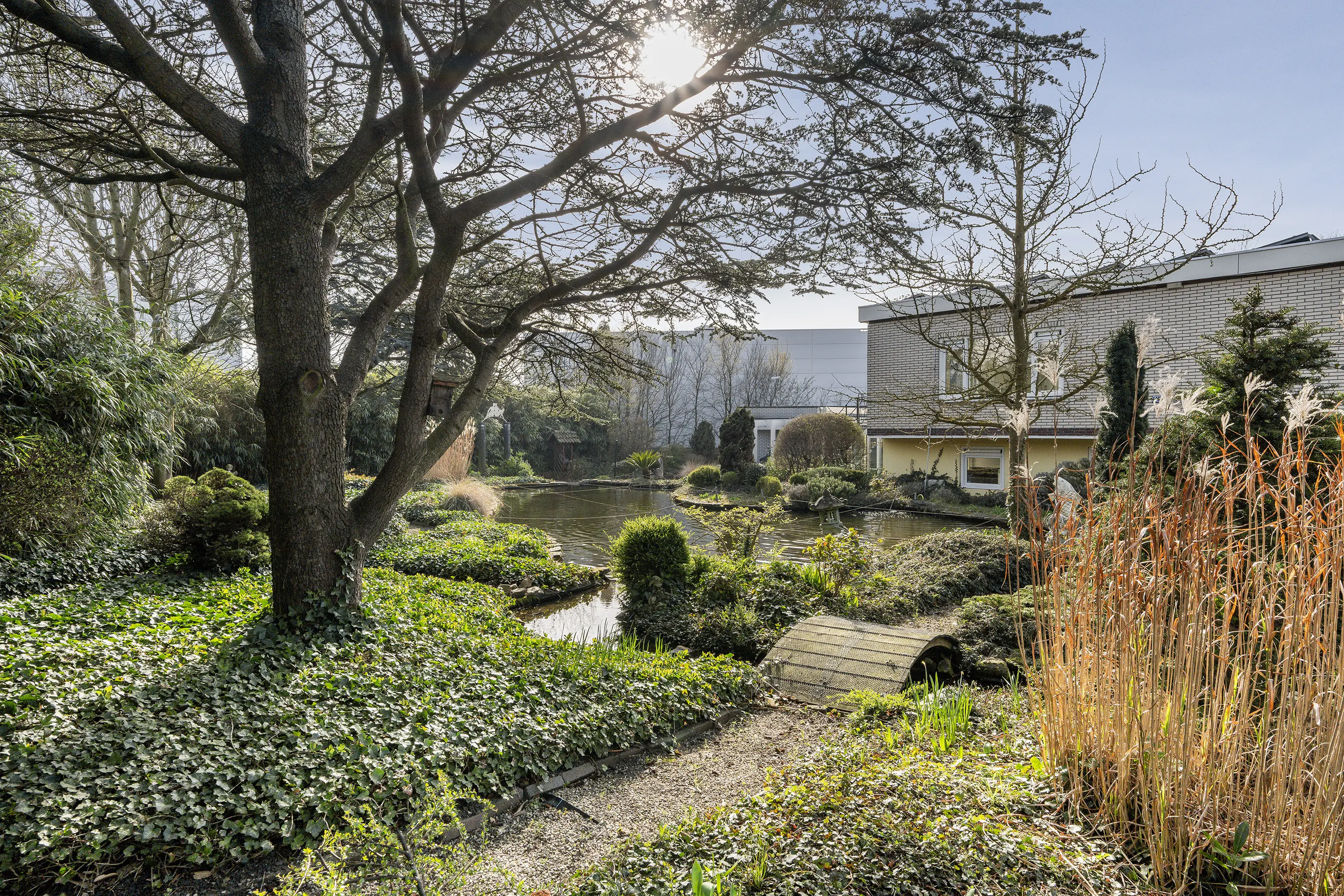 De rondom de woning gelegen volwassen tuin is onder architectuur aangelegd en kenmerkt zich door rijke beplanting, volwassen bomen, veel groen en een fraaie vijverpartij. Dankzij de omvang, de beschutte ligging en meerdere terrassen geniet u hier van maximale rust en privacy, met altijd een plek in zon of schaduw.