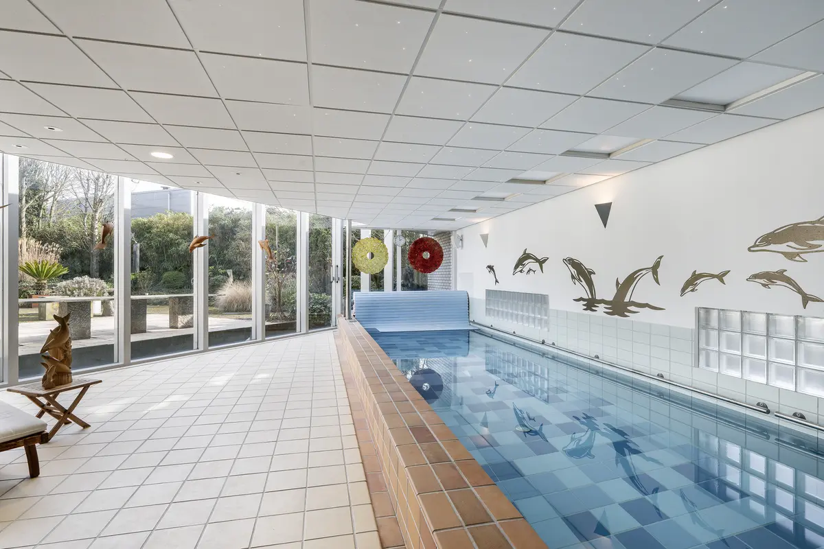In het souterrain bevindt zich een zeer complete wellnessruimte met een royaal verwarmd binnenzwembad, sauna, douche- en relaxruimte. Dankzij de grote glazen puien staat deze ruimte mooi in verbinding met de tuin. Het niveau van afwerking en de ruimte is vergelijkbaar met die van een luxe spa.