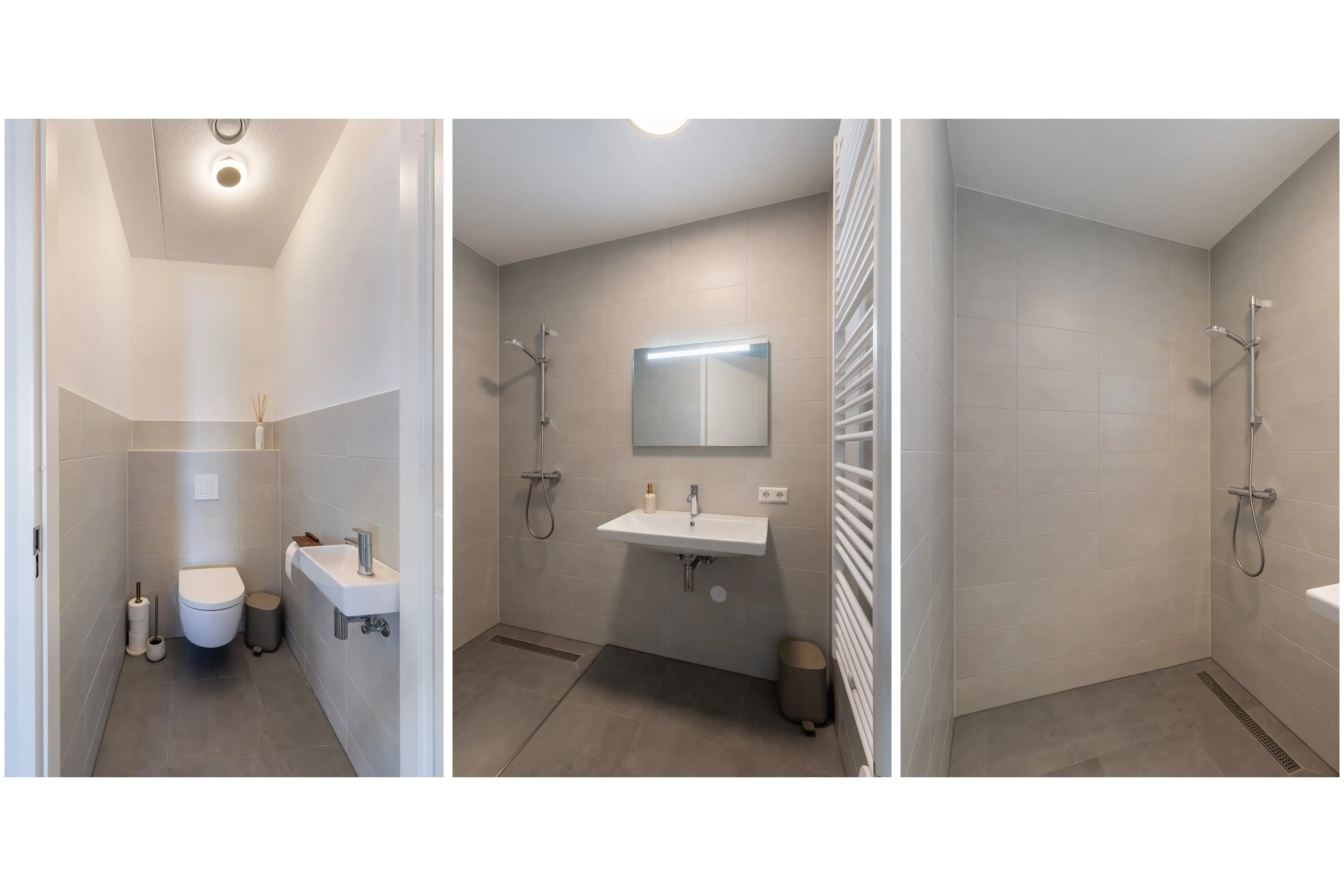 De centraal in het appartement gesitueerde badkamer is modern betegeld en voorzien van een ruime douche, wastafel met mengkraan en een elektrische designradiator. Het separate toilet is uitgevoerd met modern sanitair en dezelfde lichte tegels in zandtinten als de badkamer.