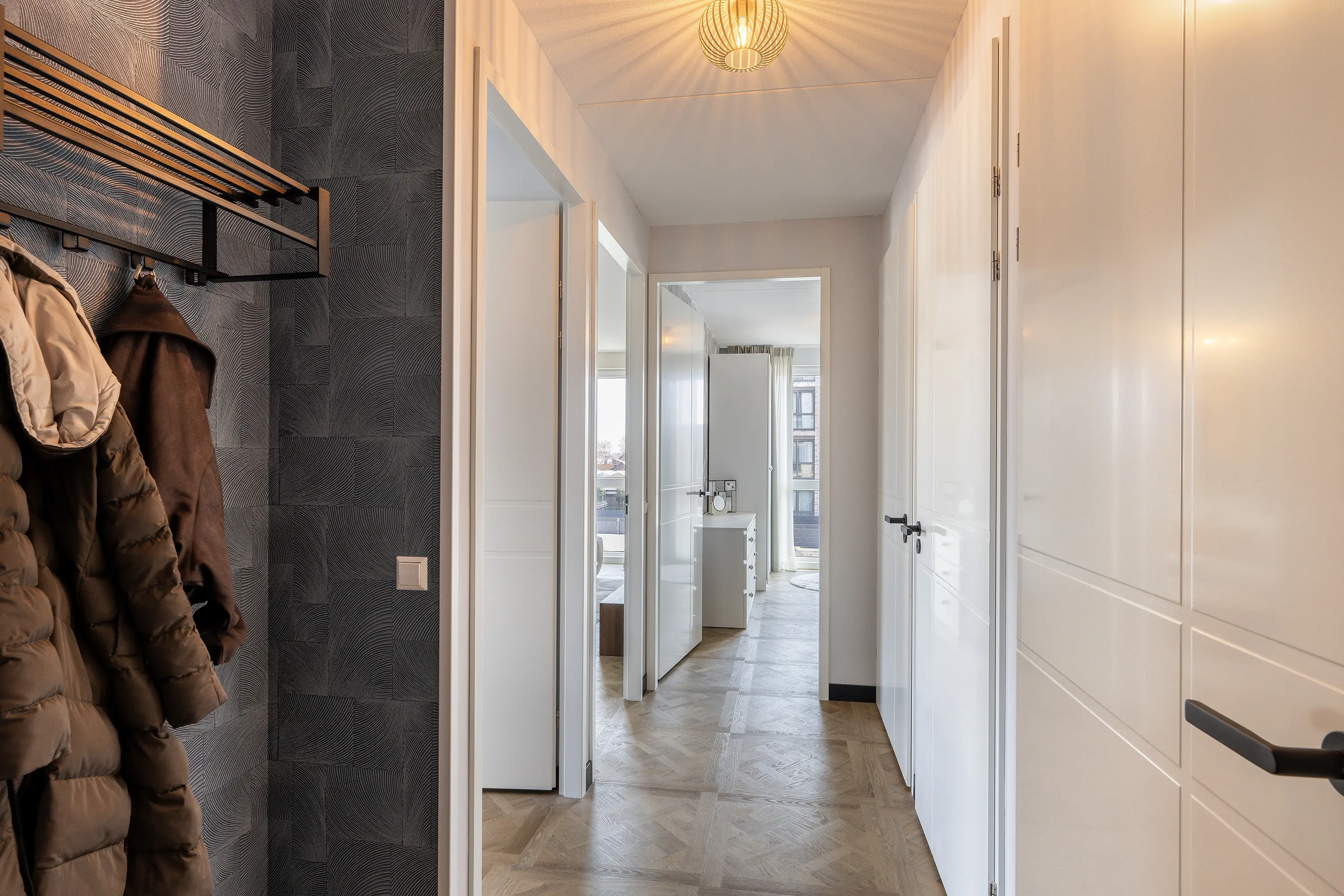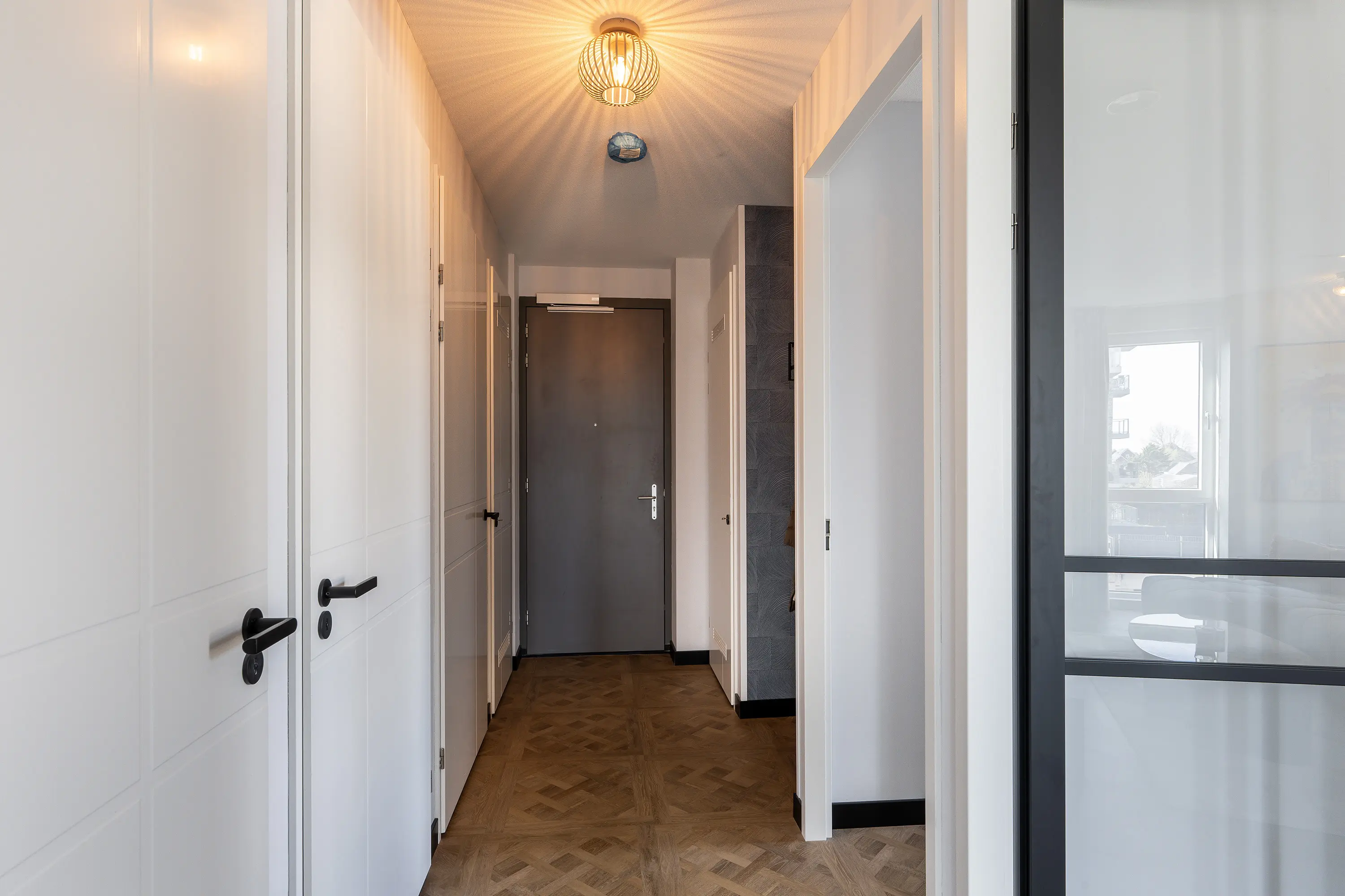Entree in hal met toegang tot de vertrekken. Het appartement biedt een knusse woonkamer, twee slaapkamers, een moderne badkamer en separaat toilet.