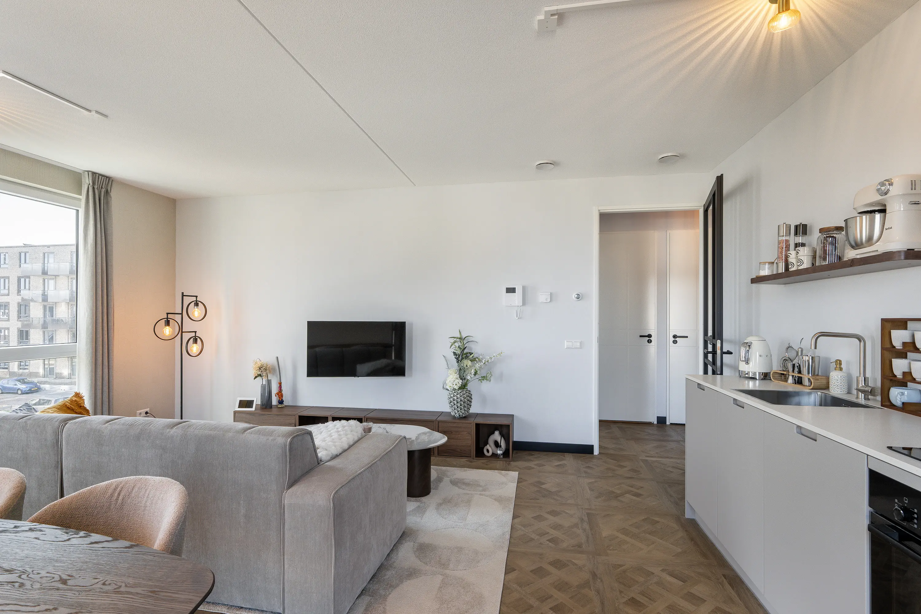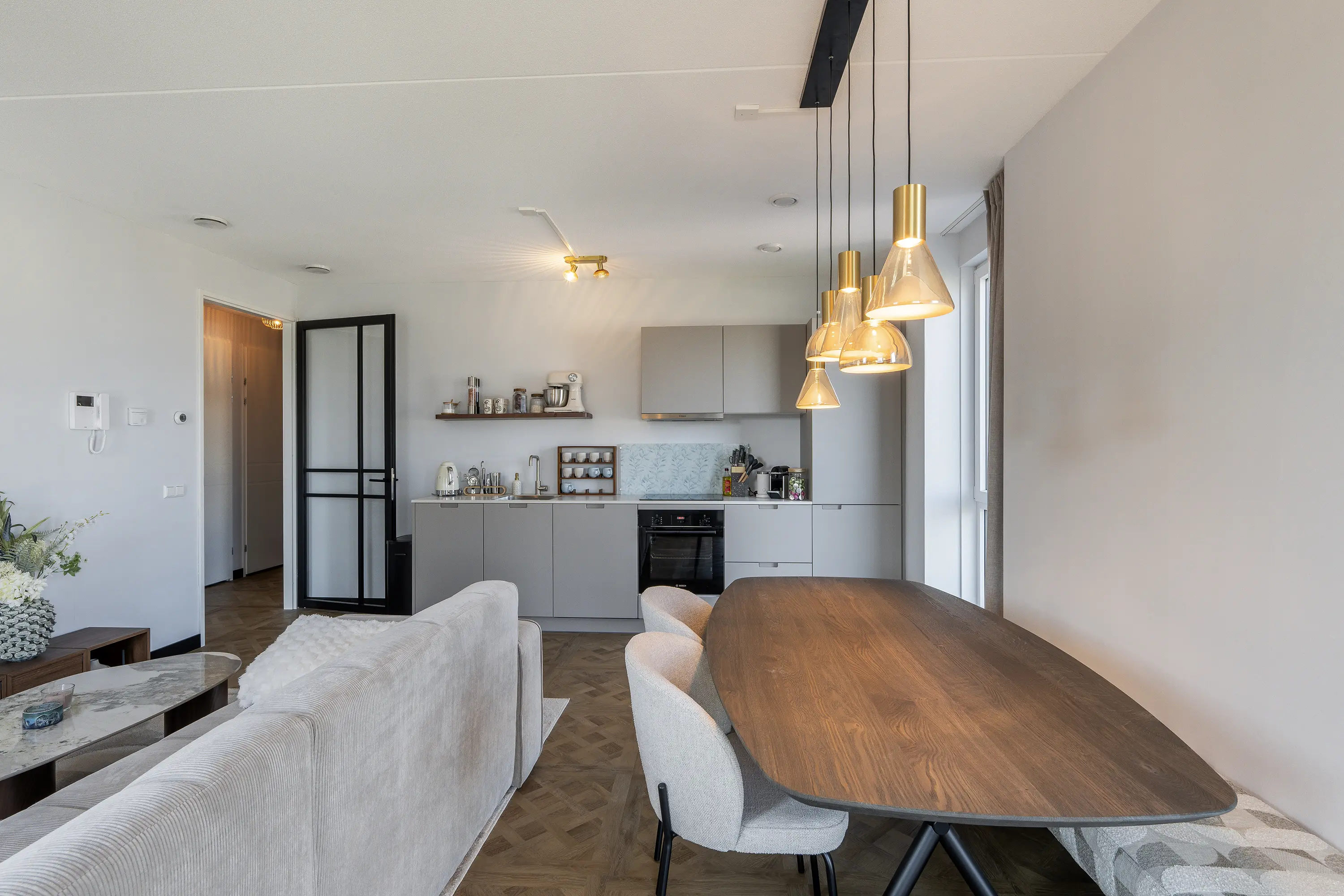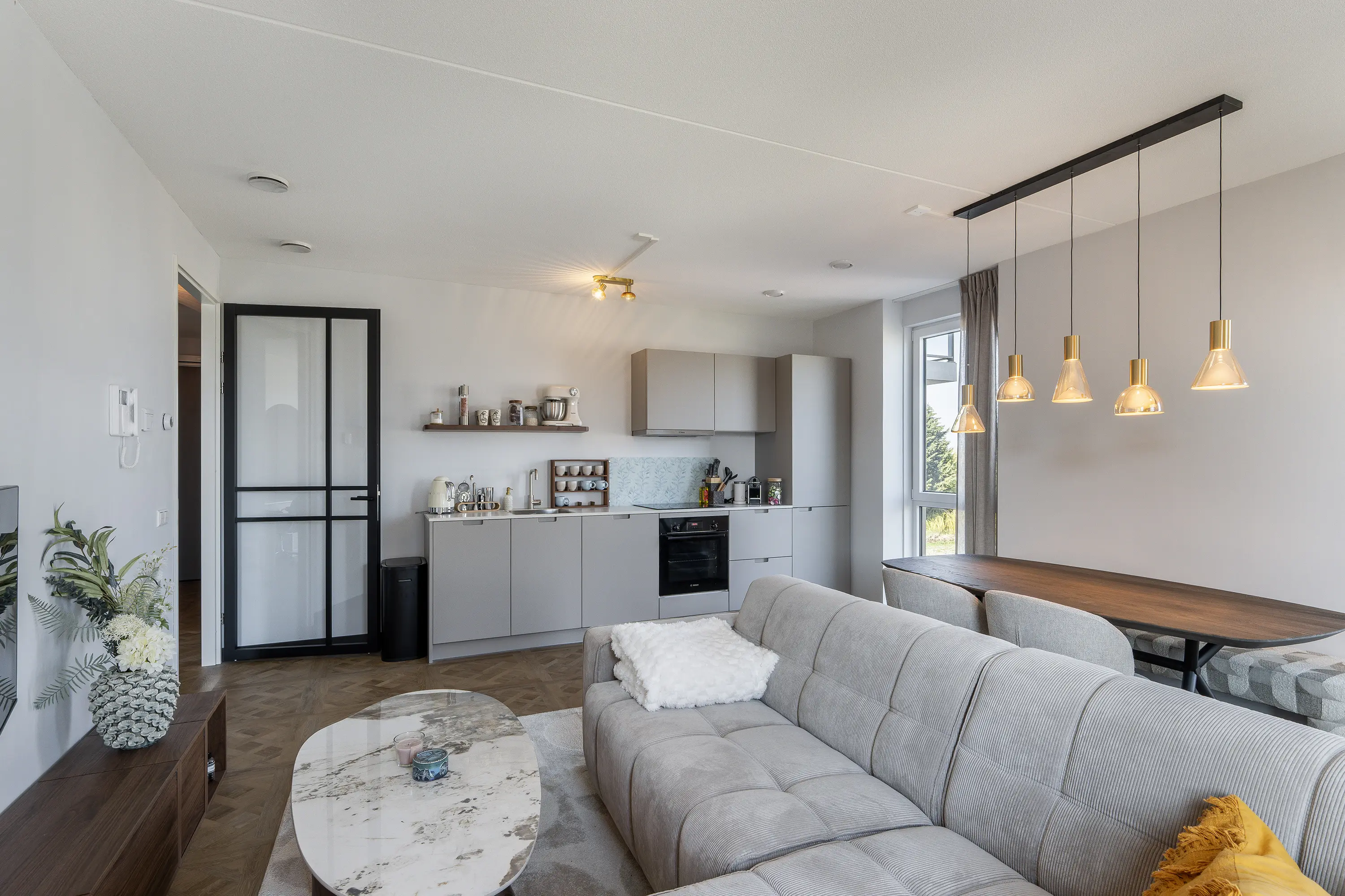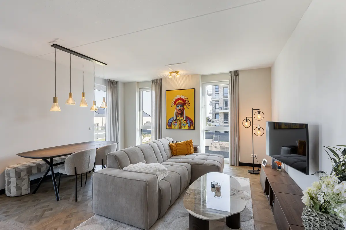 De ruime en lichte woonkamer vormt het hart van de woning. Dankzij de grote raampartijen valt er volop daglicht binnen en geniet je van een prettige sfeer. De moderne open keuken is strak vormgegeven en voorzien van alle benodigde apparatuur, met onder andere een inductiekookplaat, oven, koelkast, vaatwasser en voldoende opbergruimte. De combinatie van warme tinten, een houten vloerlook en stalen details maken de ruimte helemaal van nu.