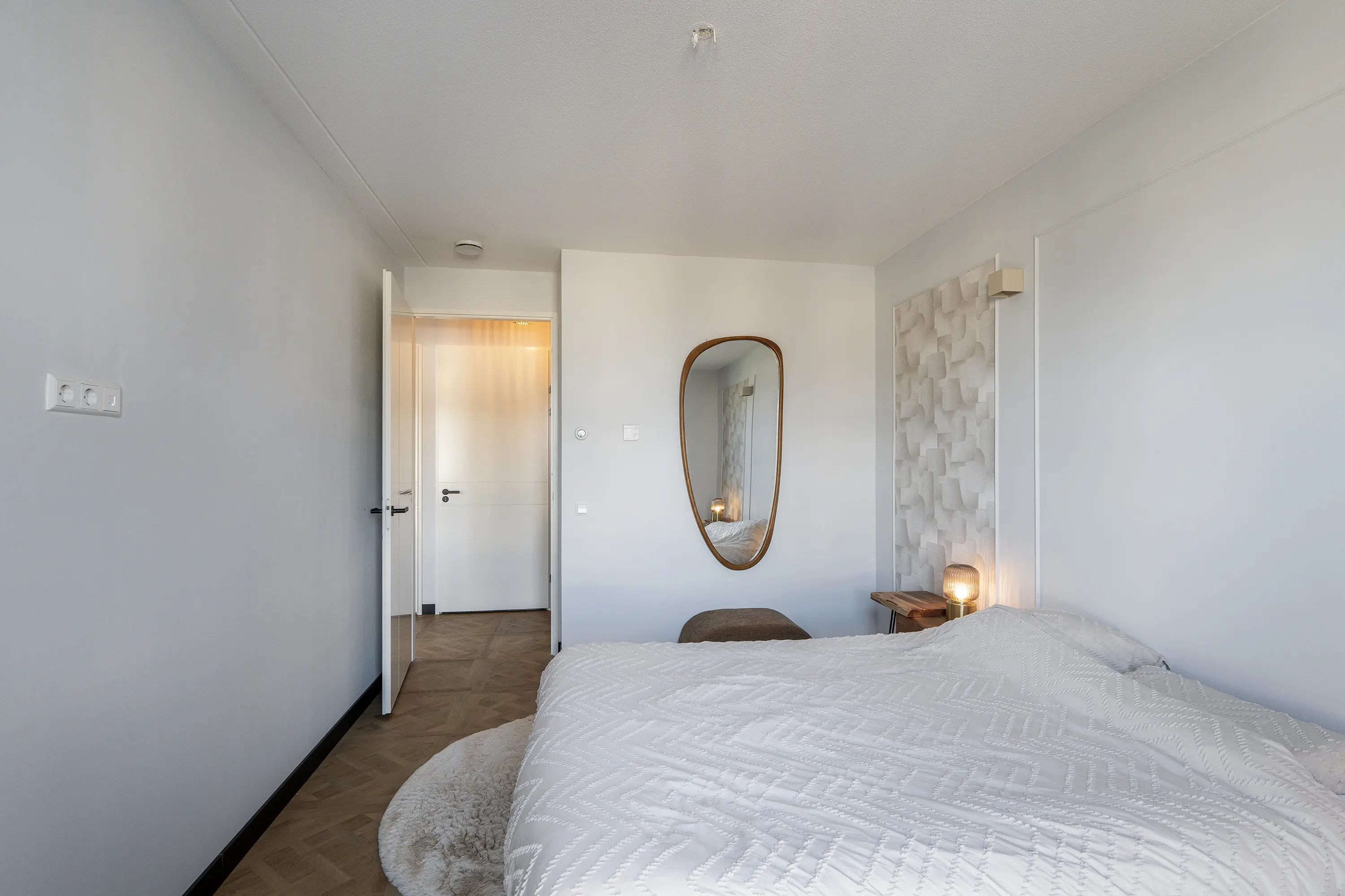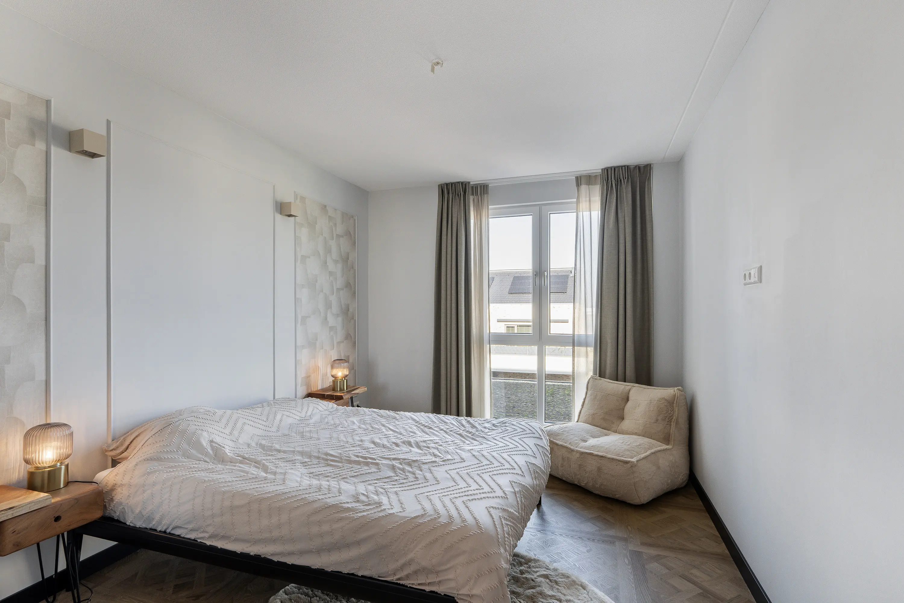 De slaapkamer is royaal opgezet en biedt voldoende ruimte voor een tweepersoonsbed en kastruimte. De kamer heeft een rustige uitstraling door de neutrale kleuren en nette afwerking.