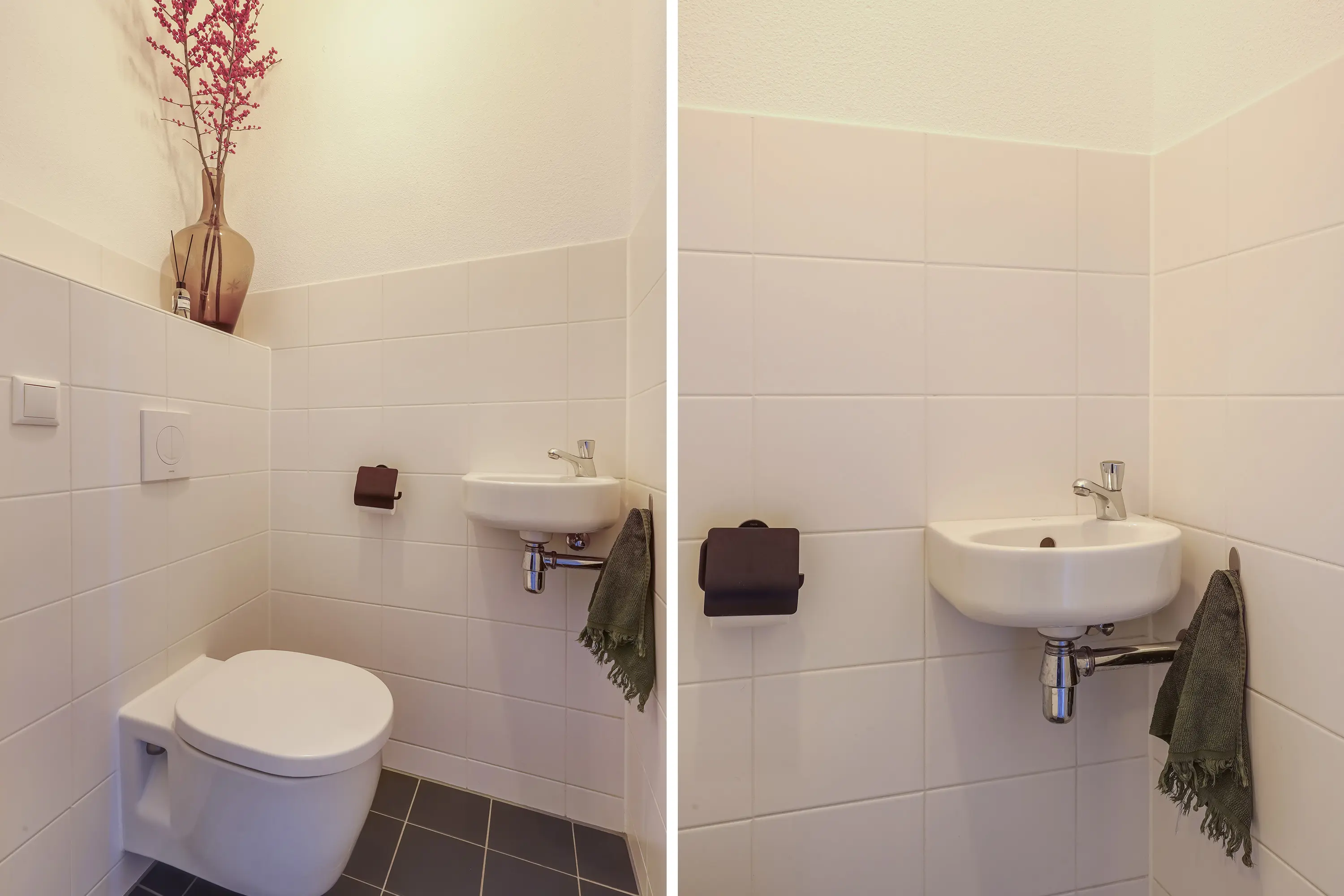 Entree, hal, meterkast, garderobe, toilet met fontein, type wandcloset met antraciet vloertegel en witte wandtegel.