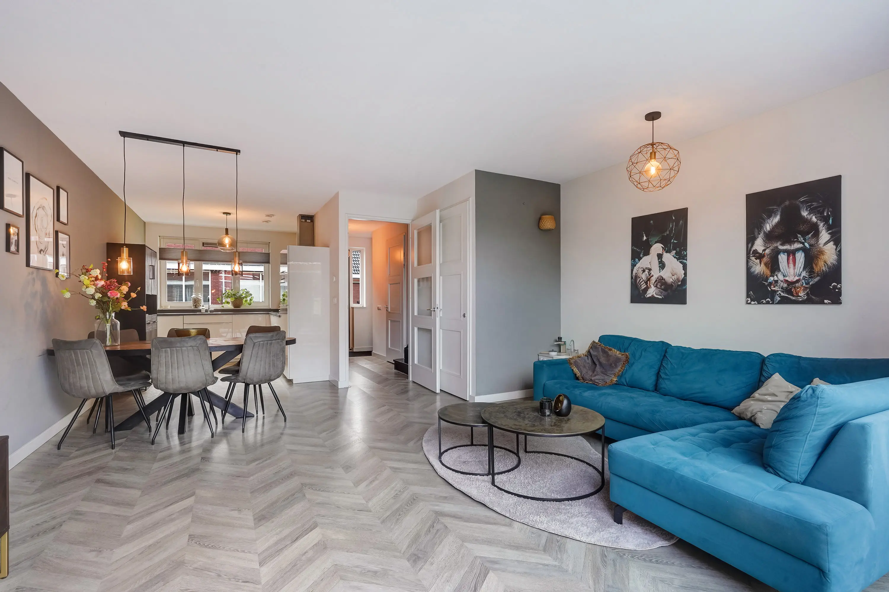 Woonkamer met laminaatvloer in Hongaarse punt, trapkast met bergruimte en verdeelset voor vloerverwarming.