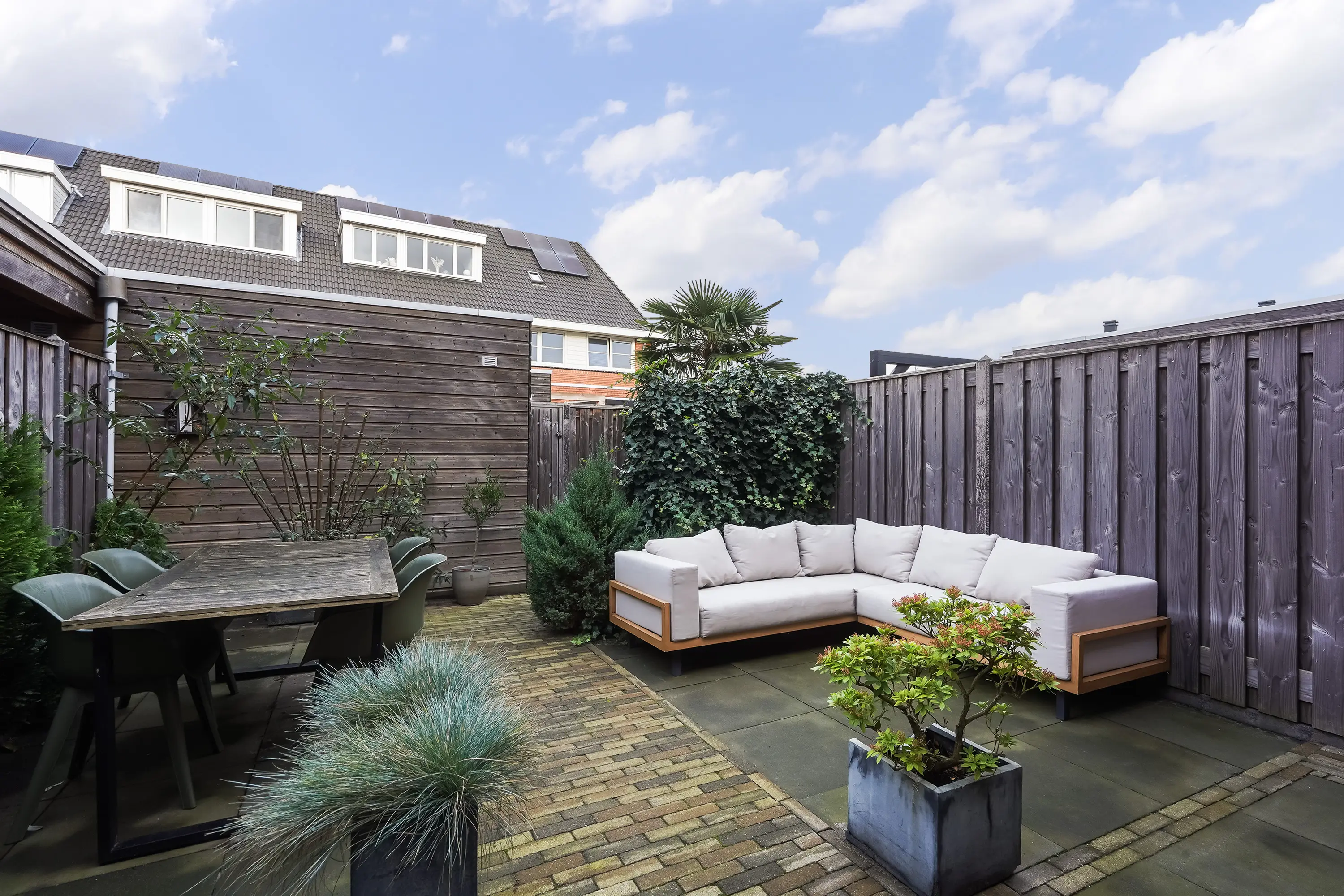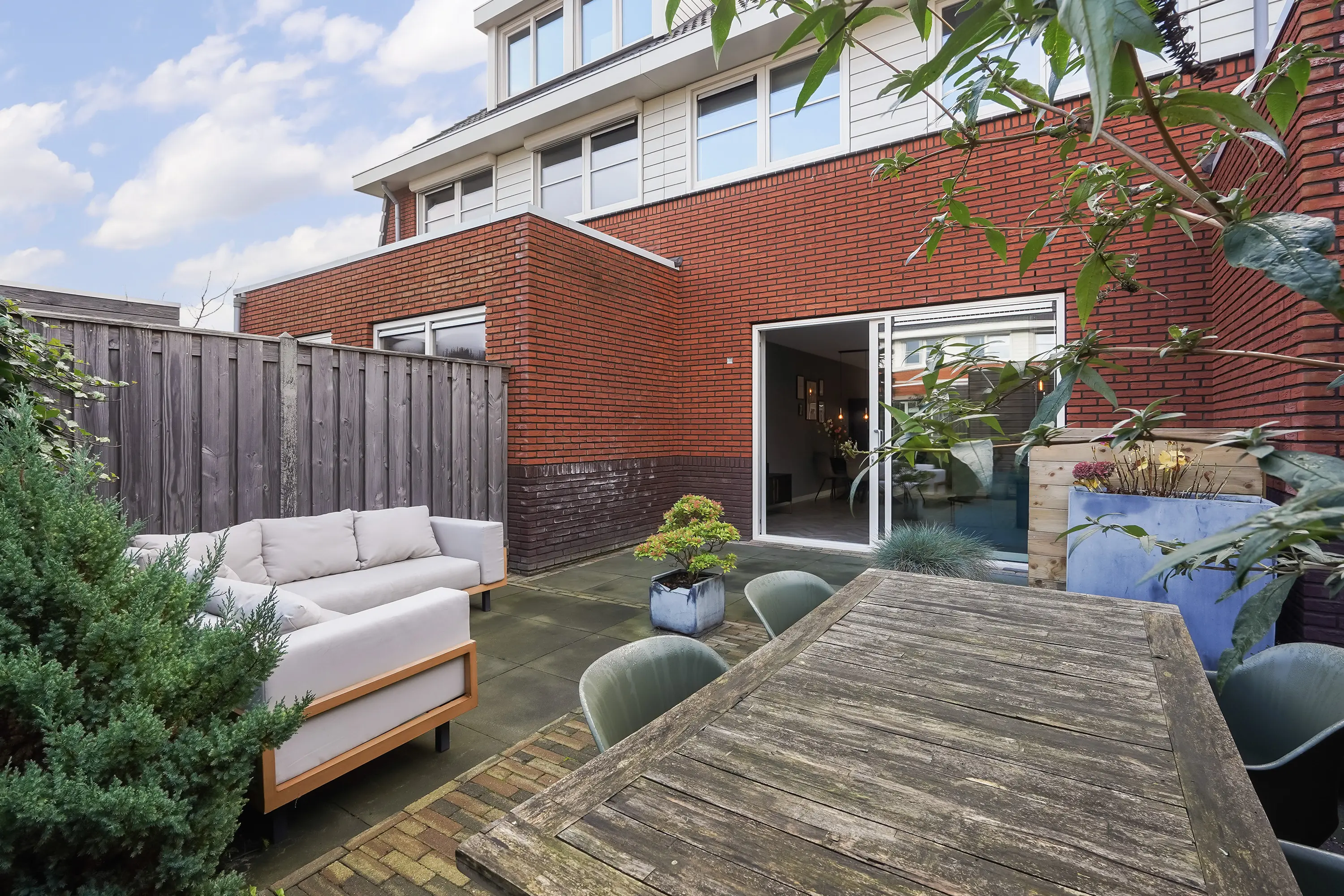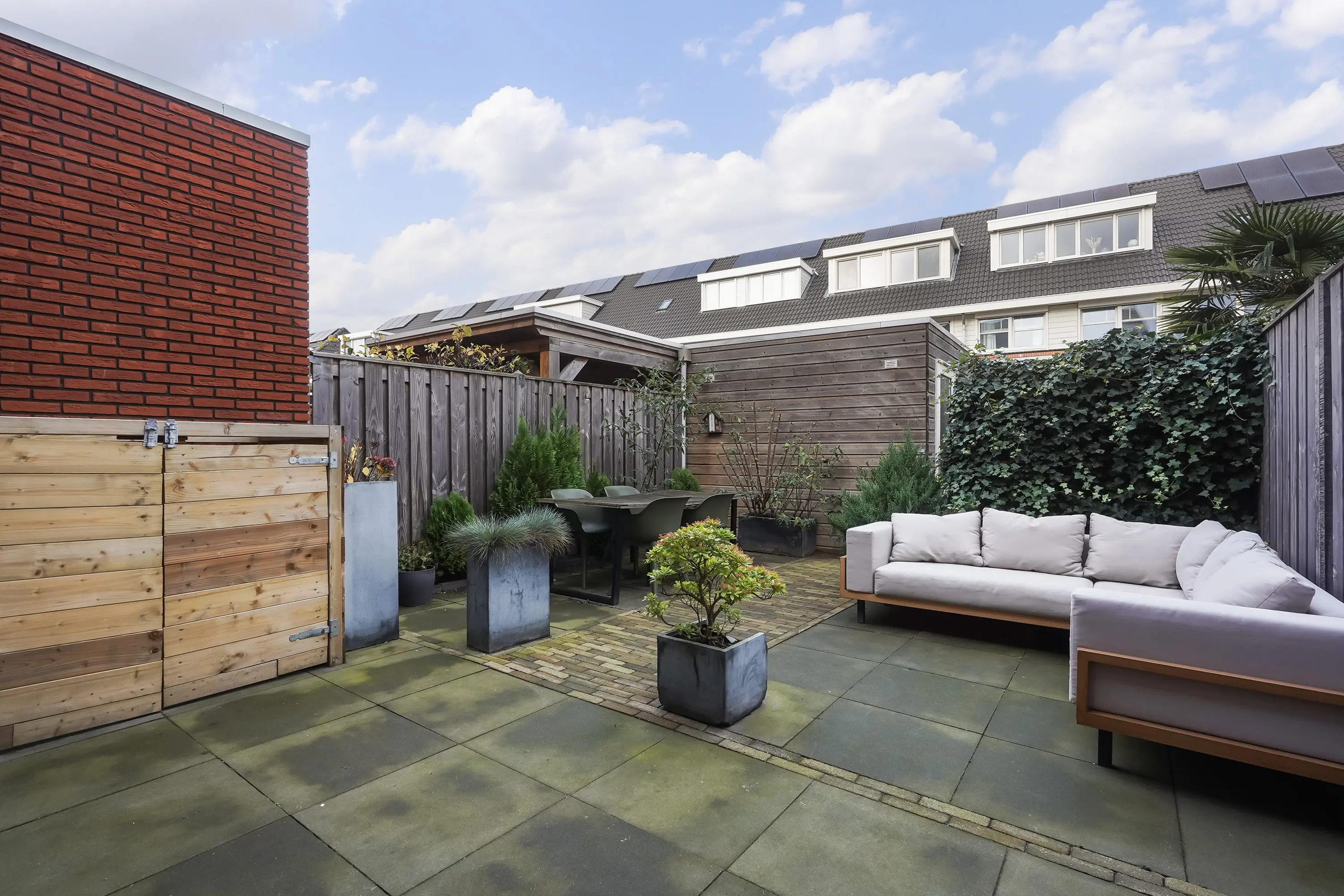 Aluminium schuifpui naar zonnige achtertuin met terras, straatwerk met betontegels en klinkers, houten berging met betonnen vloer en elektra. De achtertuin, gesitueerd op het noorden, is via achterom te bereiken.