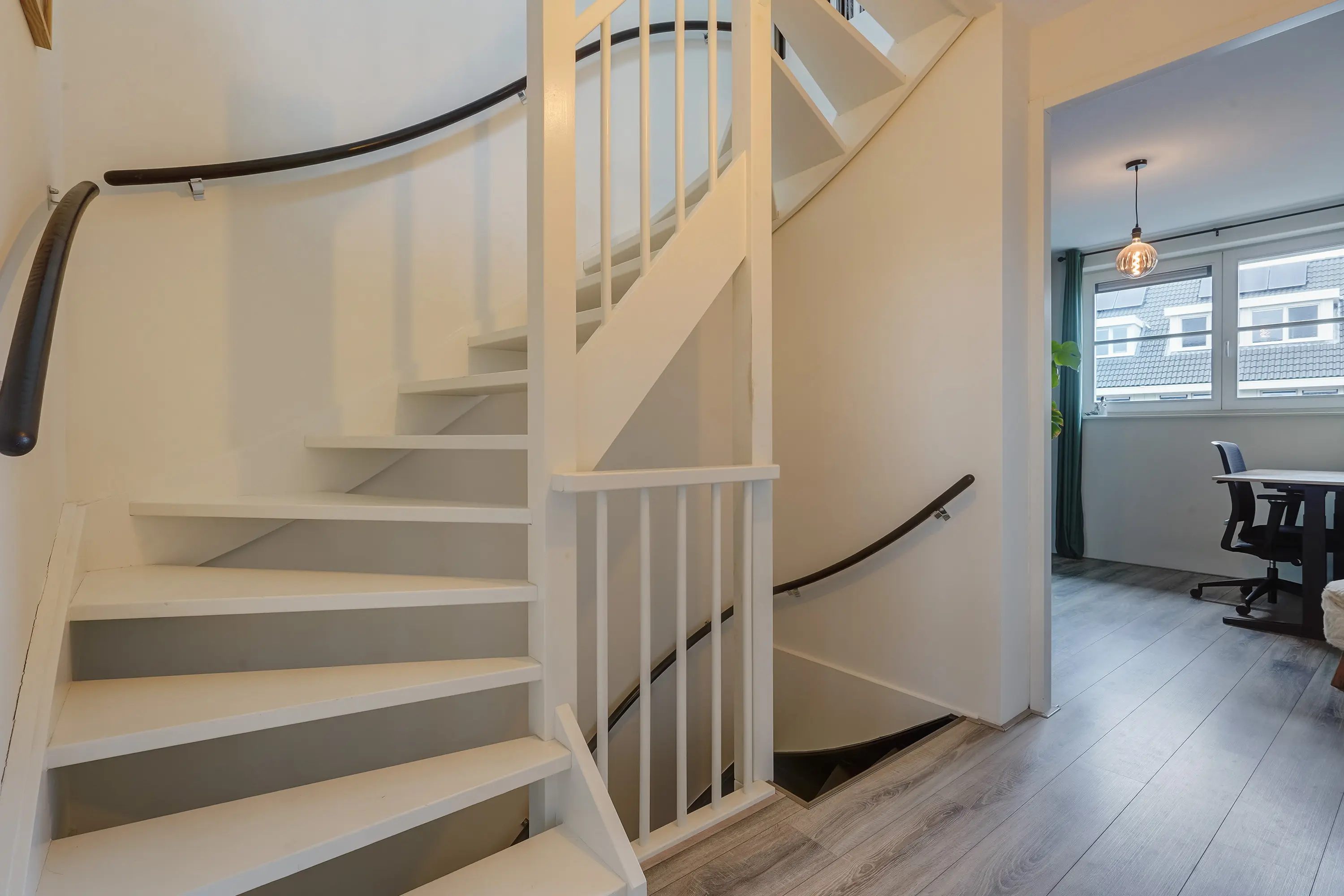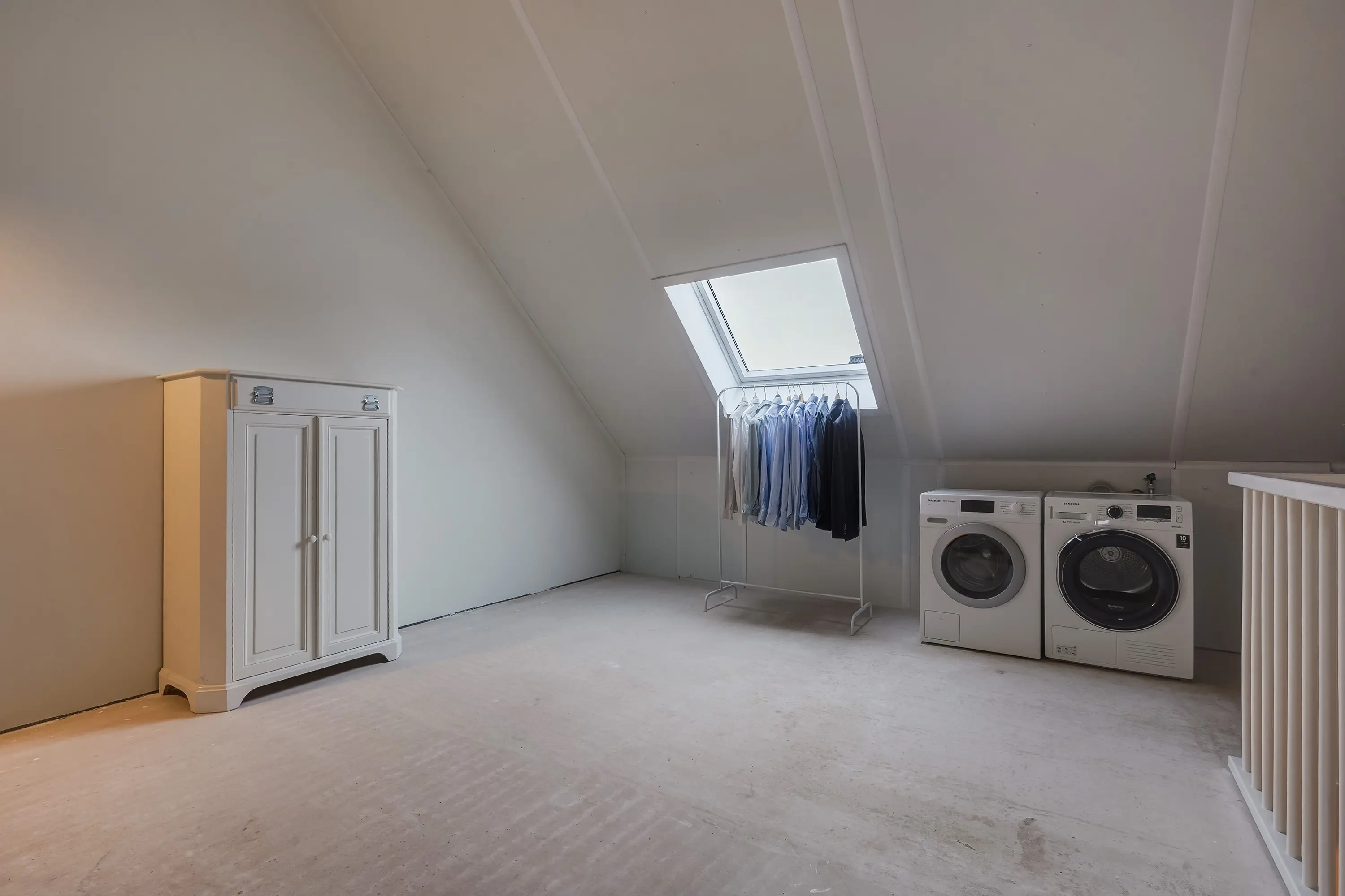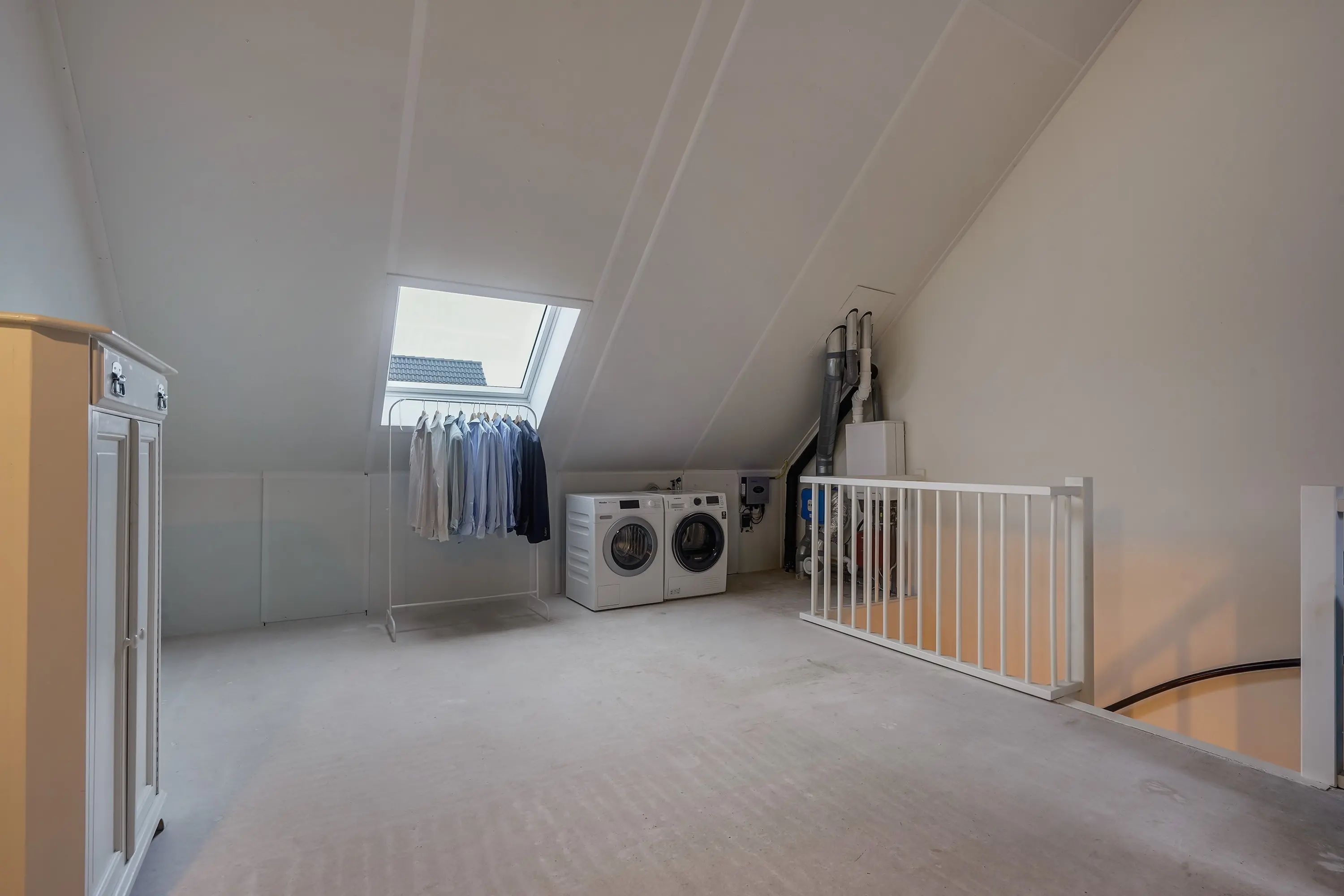 Vaste, open trap naar tweede verdieping. Deze ruime open zolderverdieping heeft twee dakramen en opstelplaats voor wasmachine, droger, mv-unit, cv combiketel (Intergas, 2019), omvormers voor zonnepanelen en veel bergruimte achter schotten.