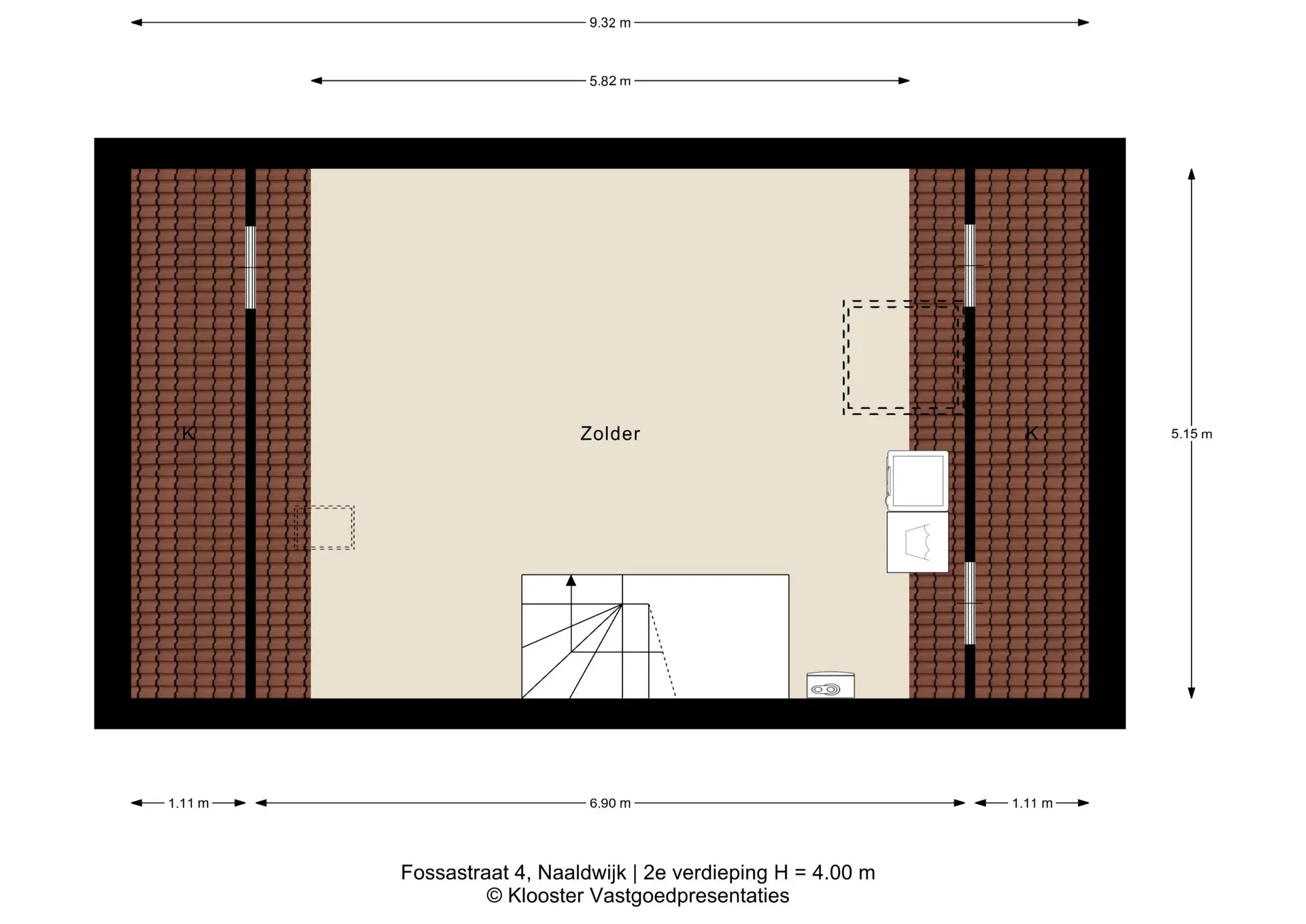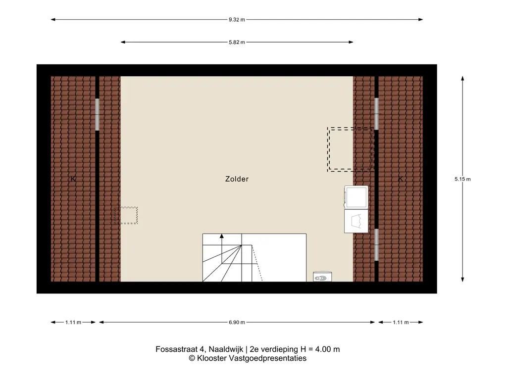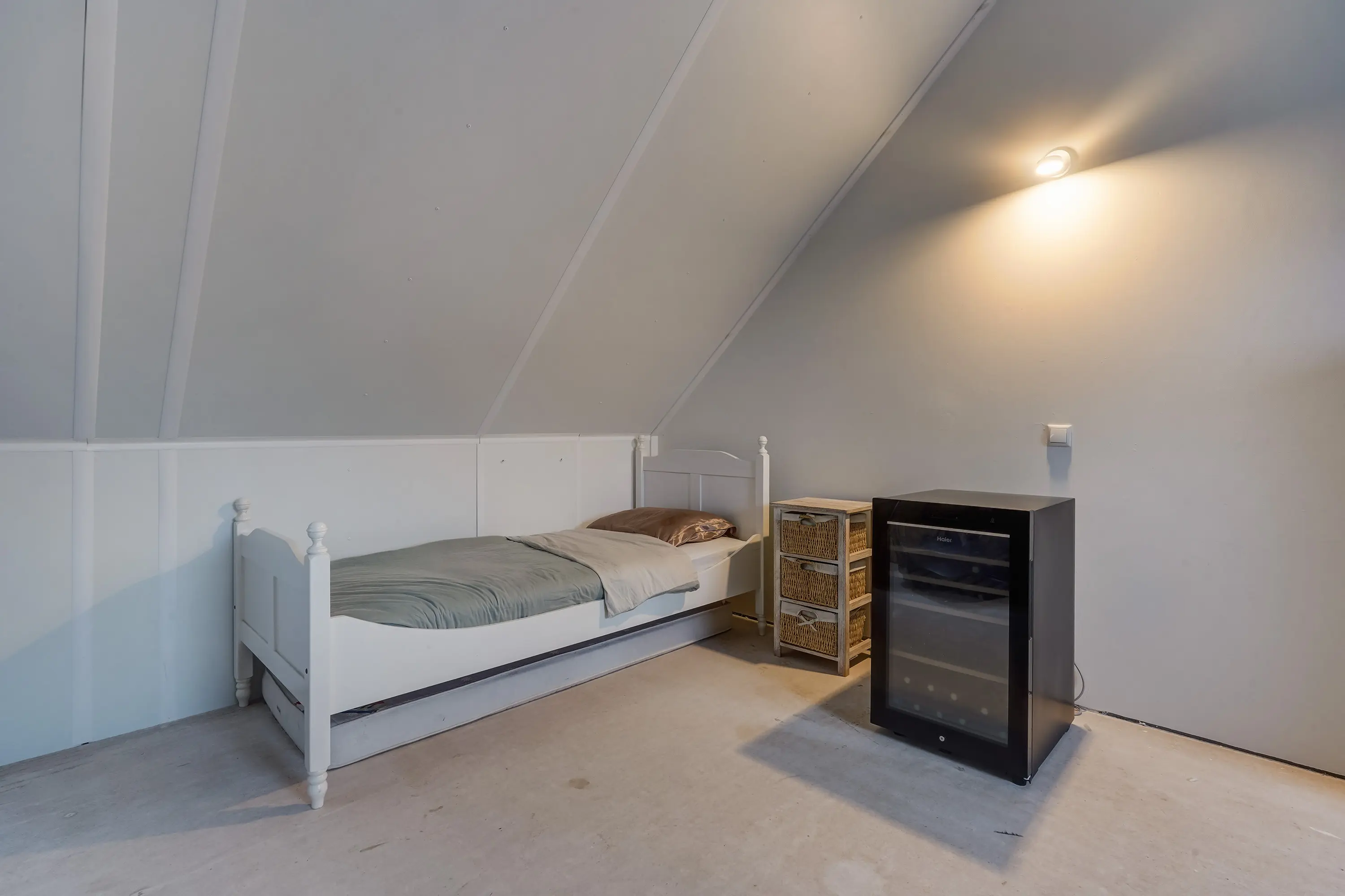 Vaste, open trap naar tweede verdieping. Deze ruime open zolderverdieping heeft twee dakramen en opstelplaats voor wasmachine, droger, mv-unit, cv combiketel (Intergas, 2019), omvormers voor zonnepanelen en veel bergruimte achter schotten.