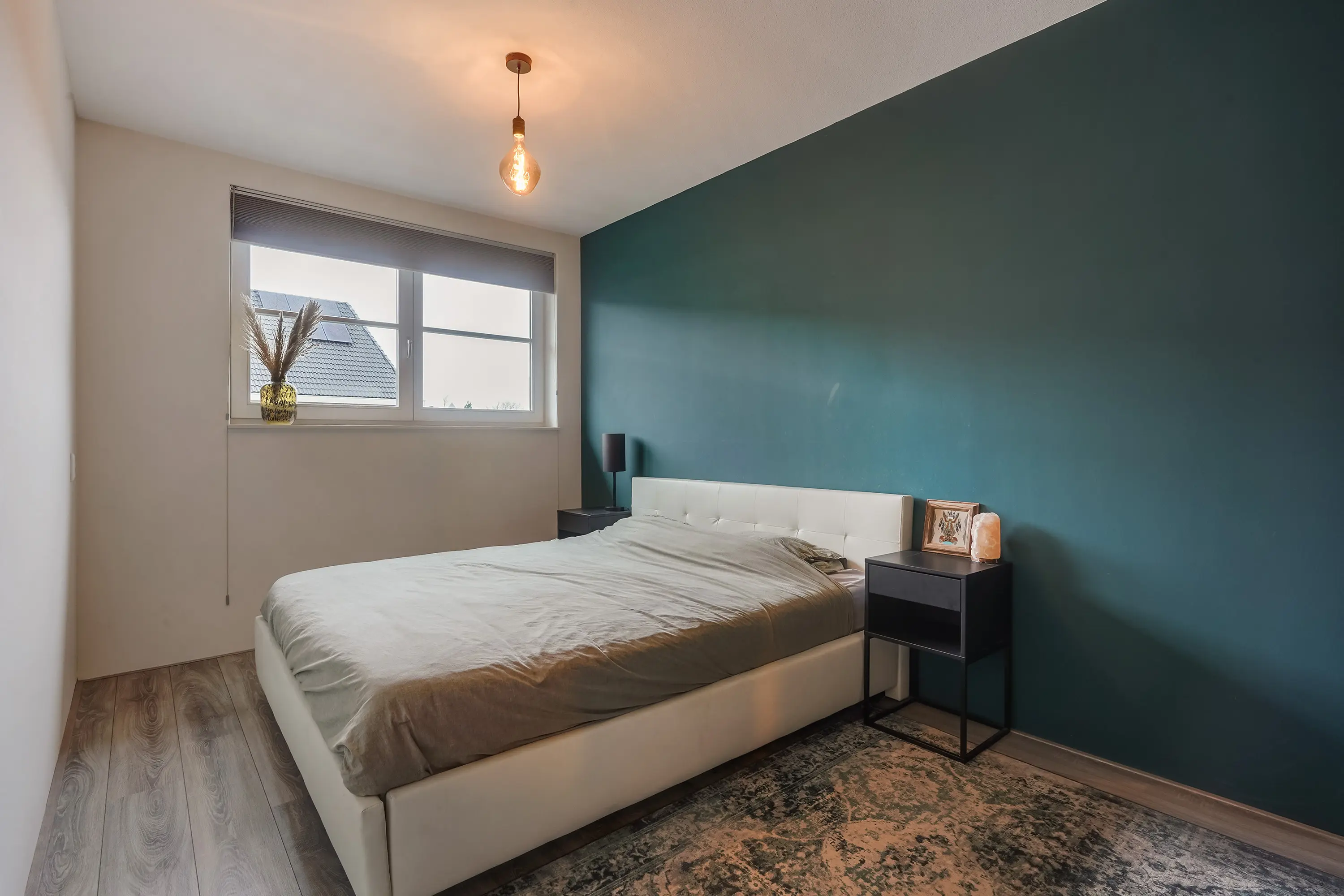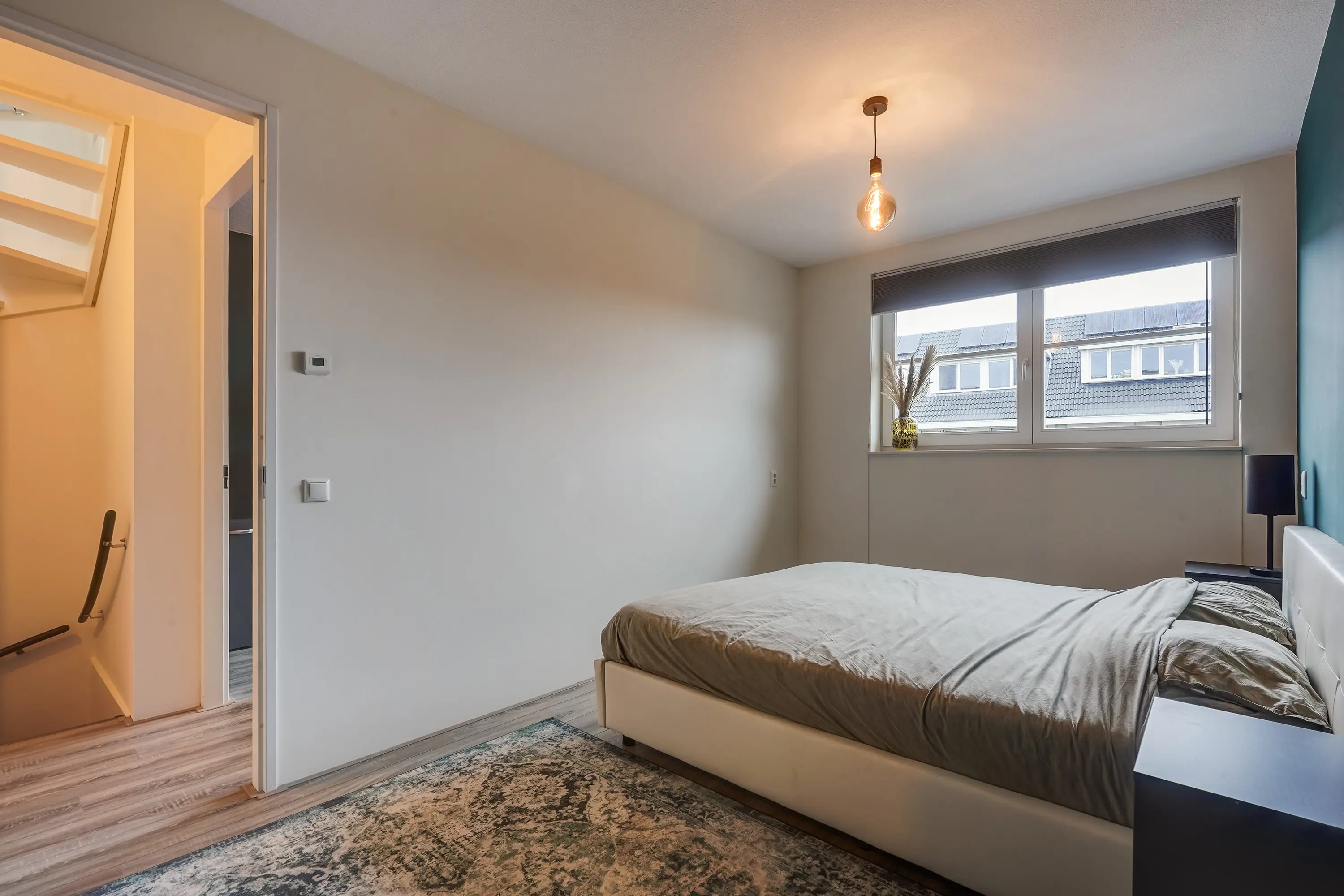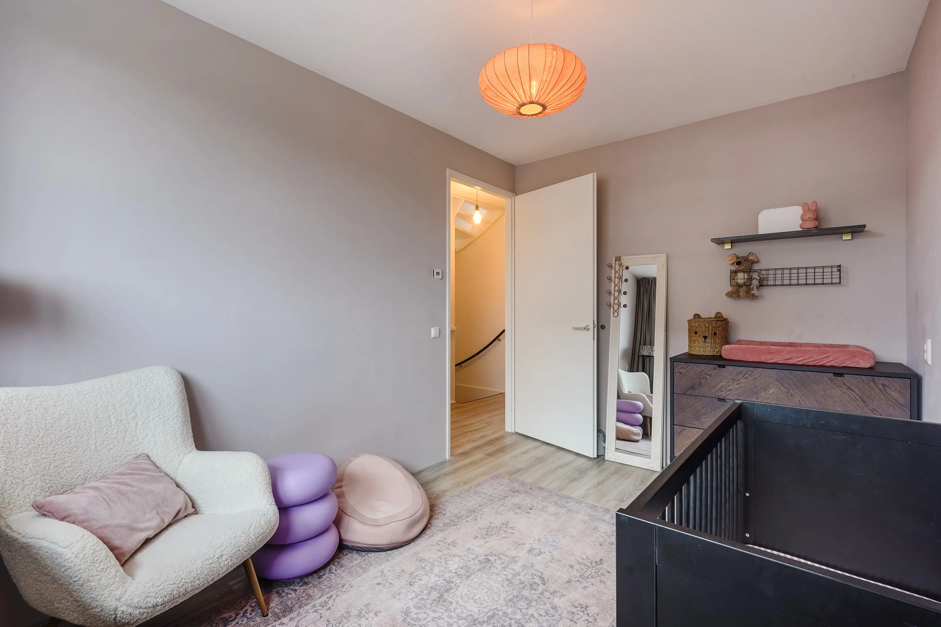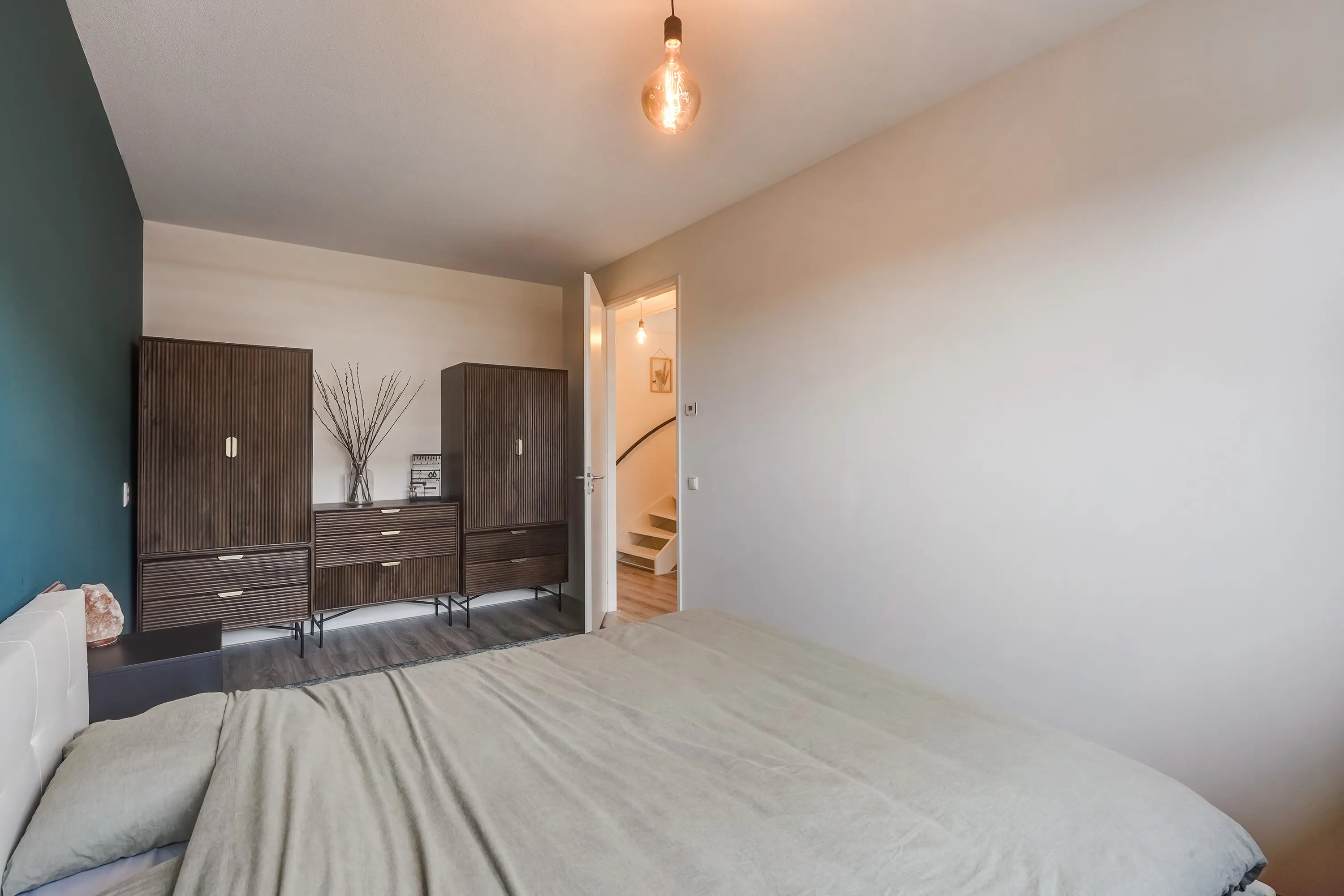 Overloop met toegang tot de vertrekken. De hoofdslaapkamer is gesitueerd aan de achterzijde van de woning en biedt voldoende ruimte voor een grote kastenwand. Een tweede slaapkamer bevindt zich eveneens aan de achterzijde, aan de voorzijde een derde slaapkamer. Over de gehele eerste verdieping (m.u.v. de badkamer) ligt een onderhoudsvriendelijke, neutrale laminaatvloer met vloerverwarming, welke in elke ruimte separaat te bedienen is.