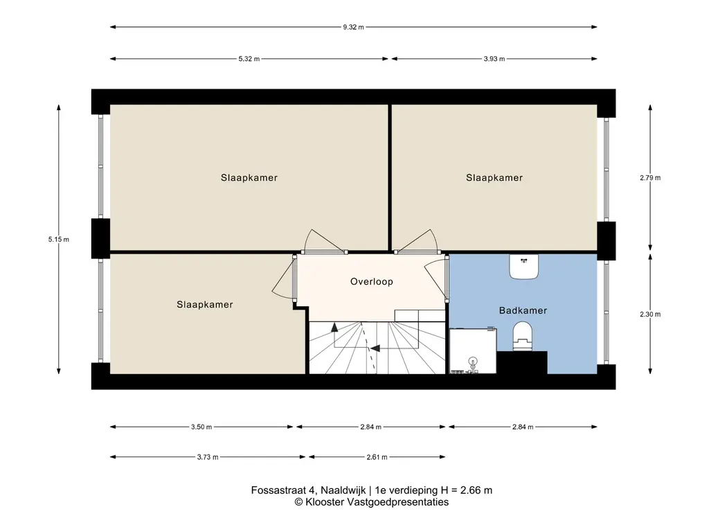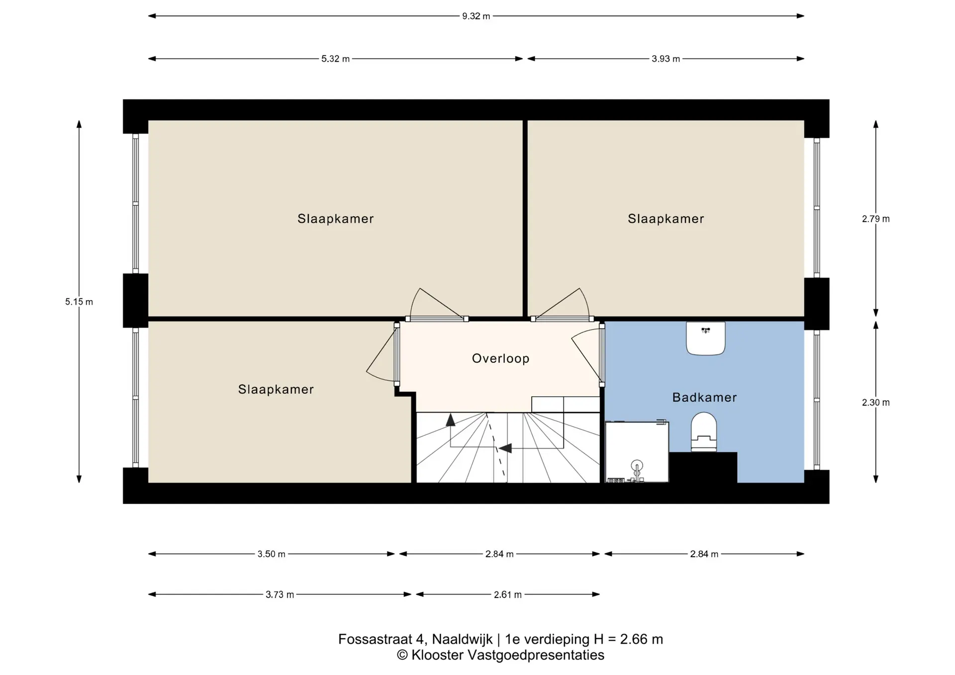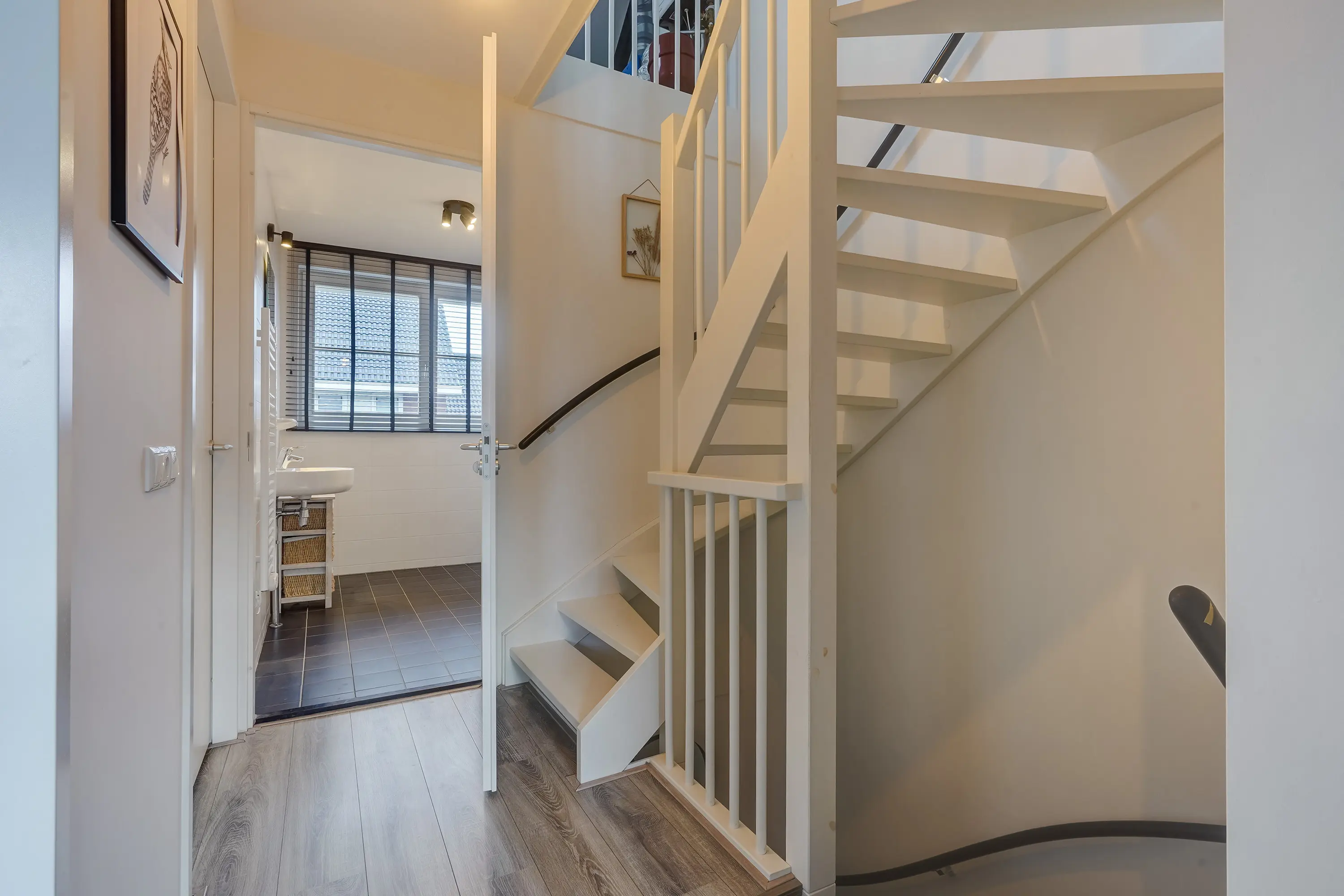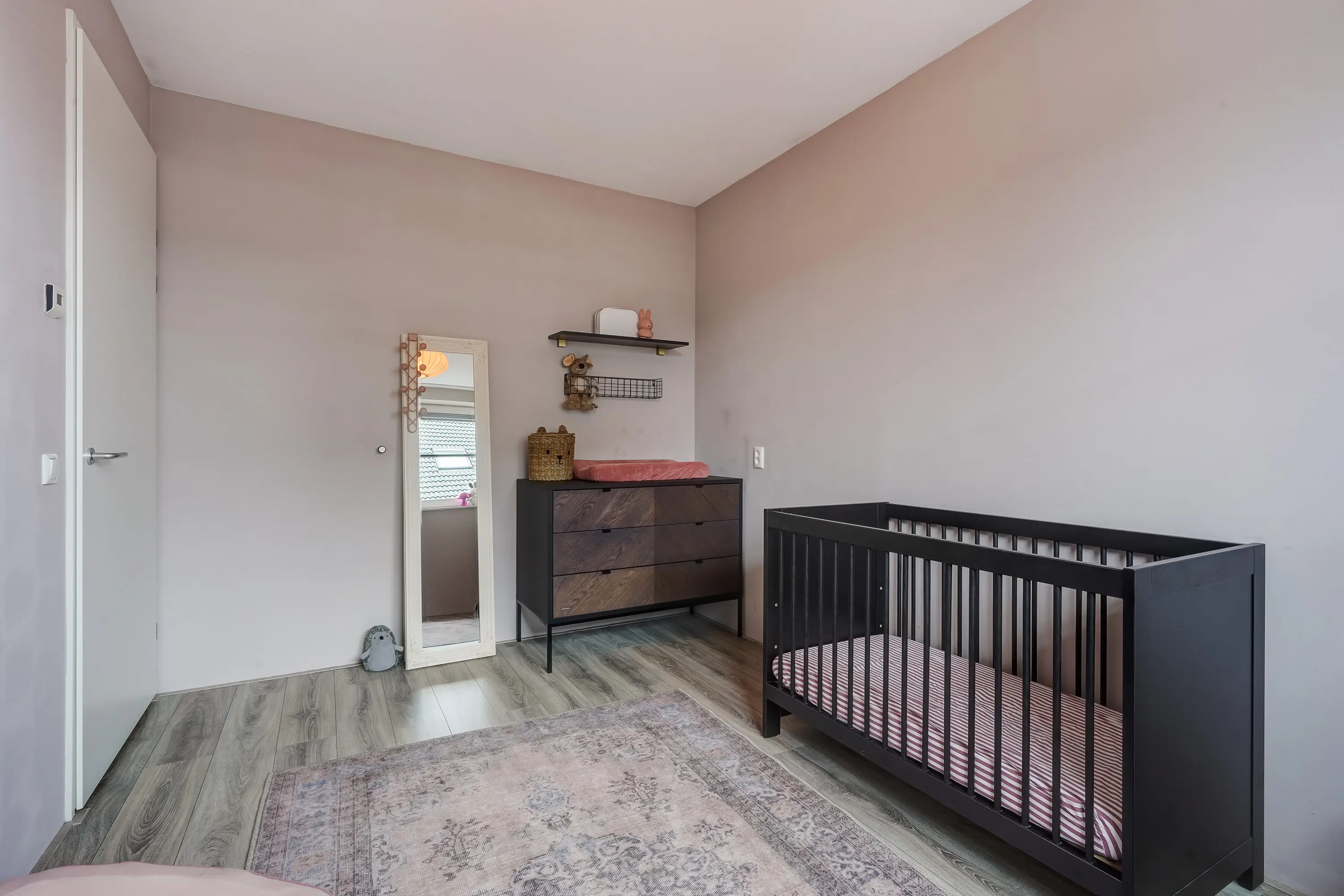 Overloop met toegang tot de vertrekken. De hoofdslaapkamer is gesitueerd aan de achterzijde van de woning en biedt voldoende ruimte voor een grote kastenwand. Een tweede slaapkamer bevindt zich eveneens aan de achterzijde, aan de voorzijde een derde slaapkamer. Over de gehele eerste verdieping (m.u.v. de badkamer) ligt een onderhoudsvriendelijke, neutrale laminaatvloer met vloerverwarming, welke in elke ruimte separaat te bedienen is.