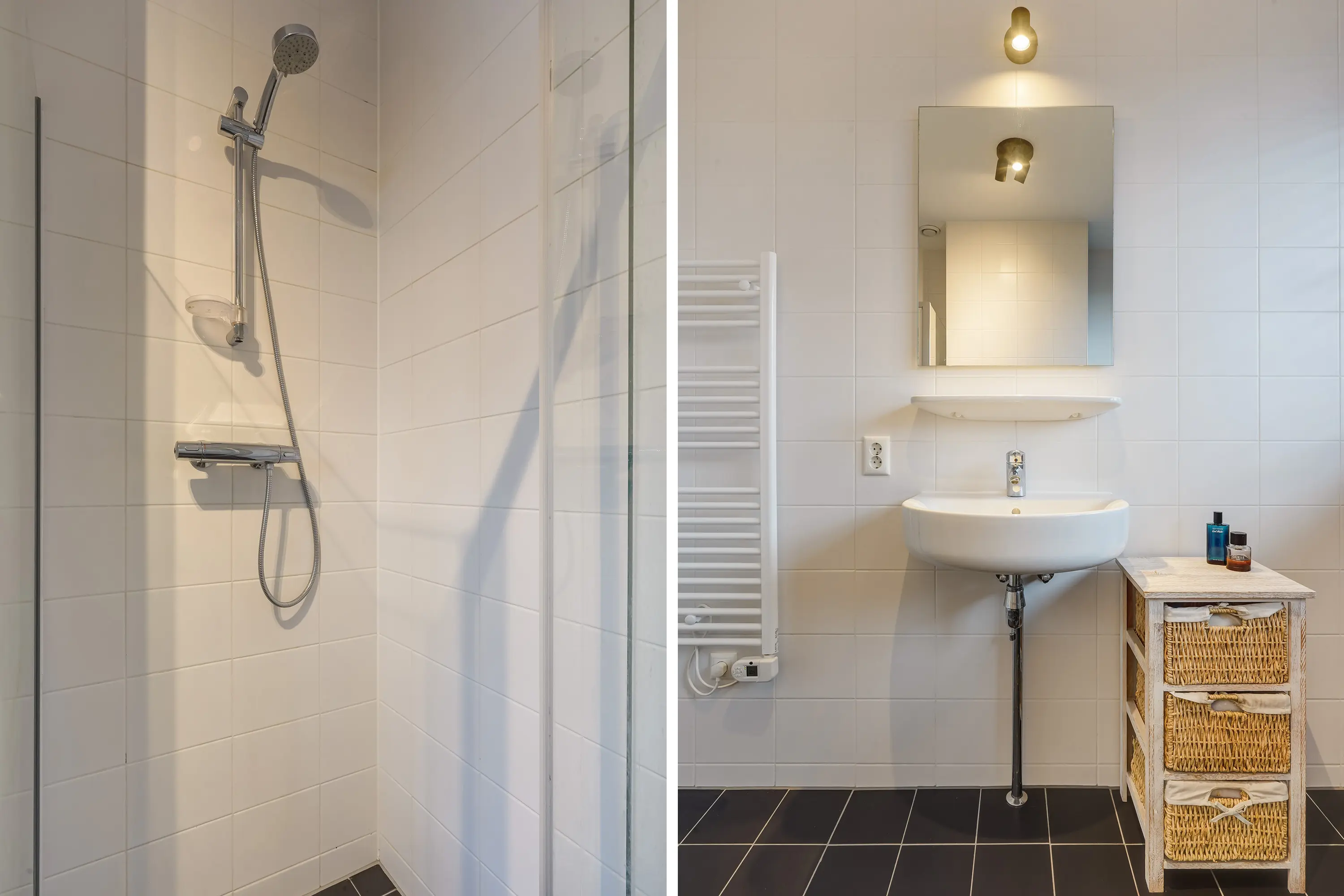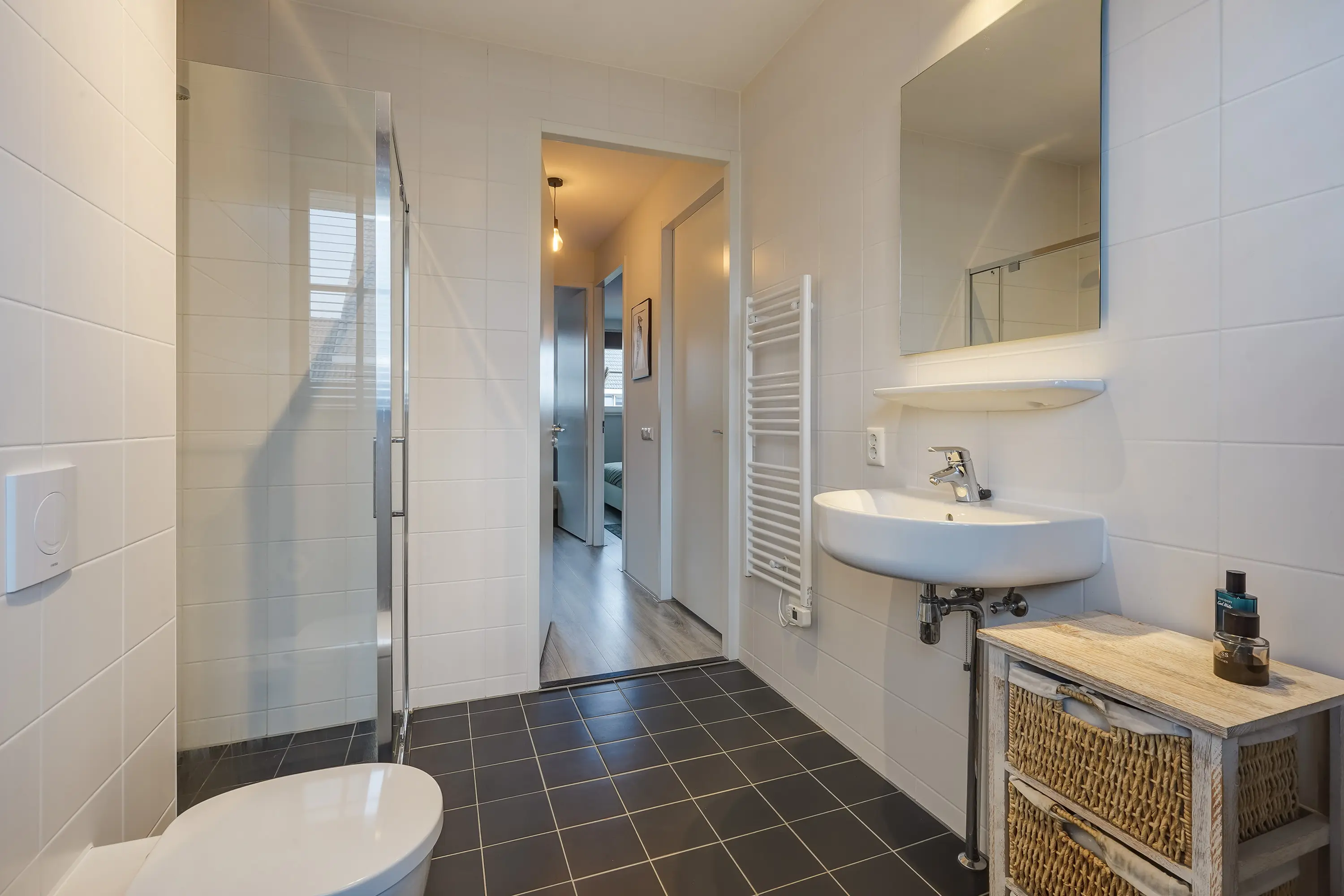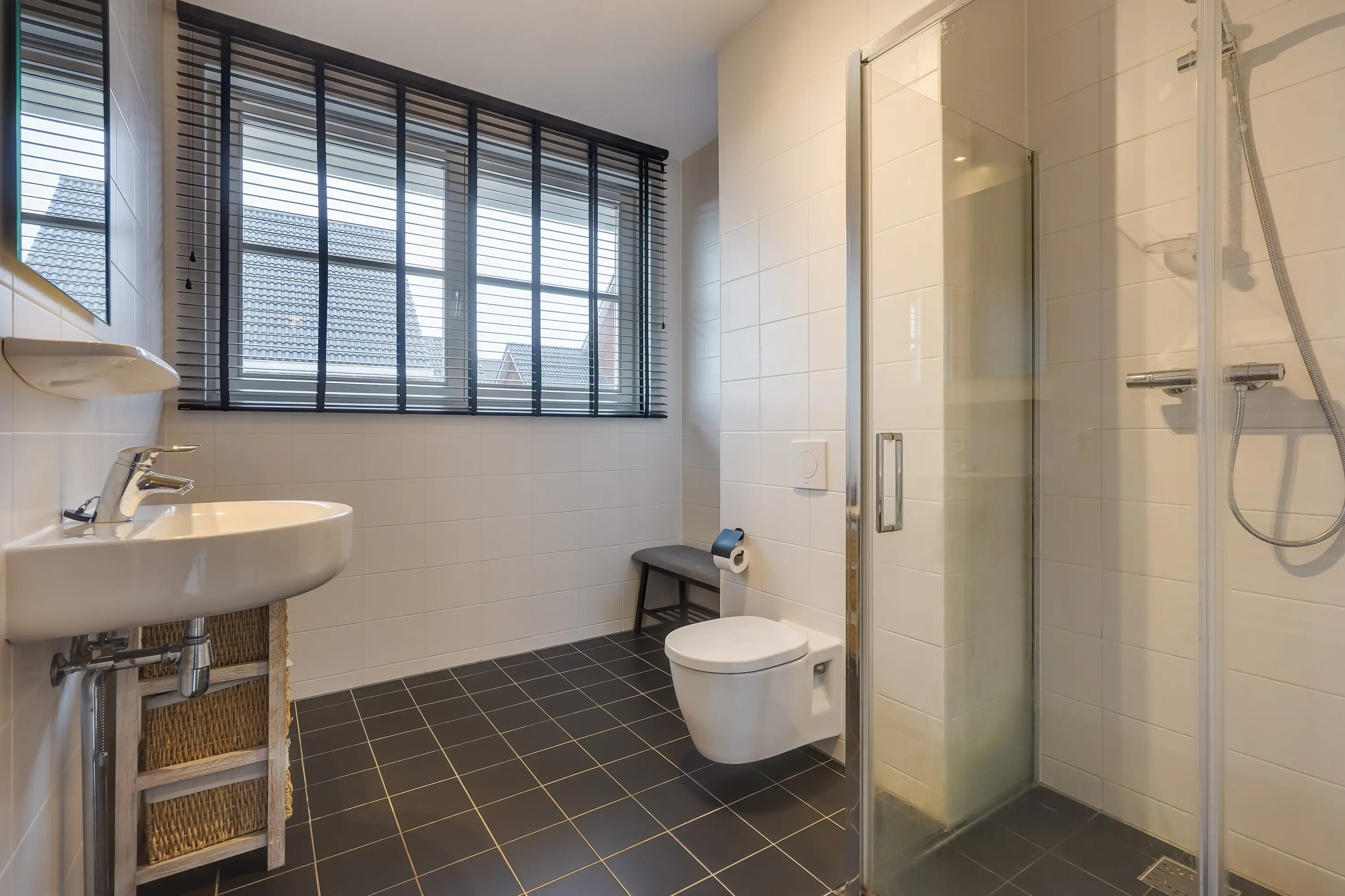 Een ruime badkamer aan de voorzijde is uitgevoerd met antraciet vloertegel en neutraal witte wandtegels. De ruimte is ingericht met een douche met glazen scherm en thermostaatkraan, een wastafel met mengkraan en wandspiegel, tweede toilet (type wandcloset), mechanische ventilatie en te openen raam. De badkamer biedt voldoende ruimte om een ligbad te plaatsen.