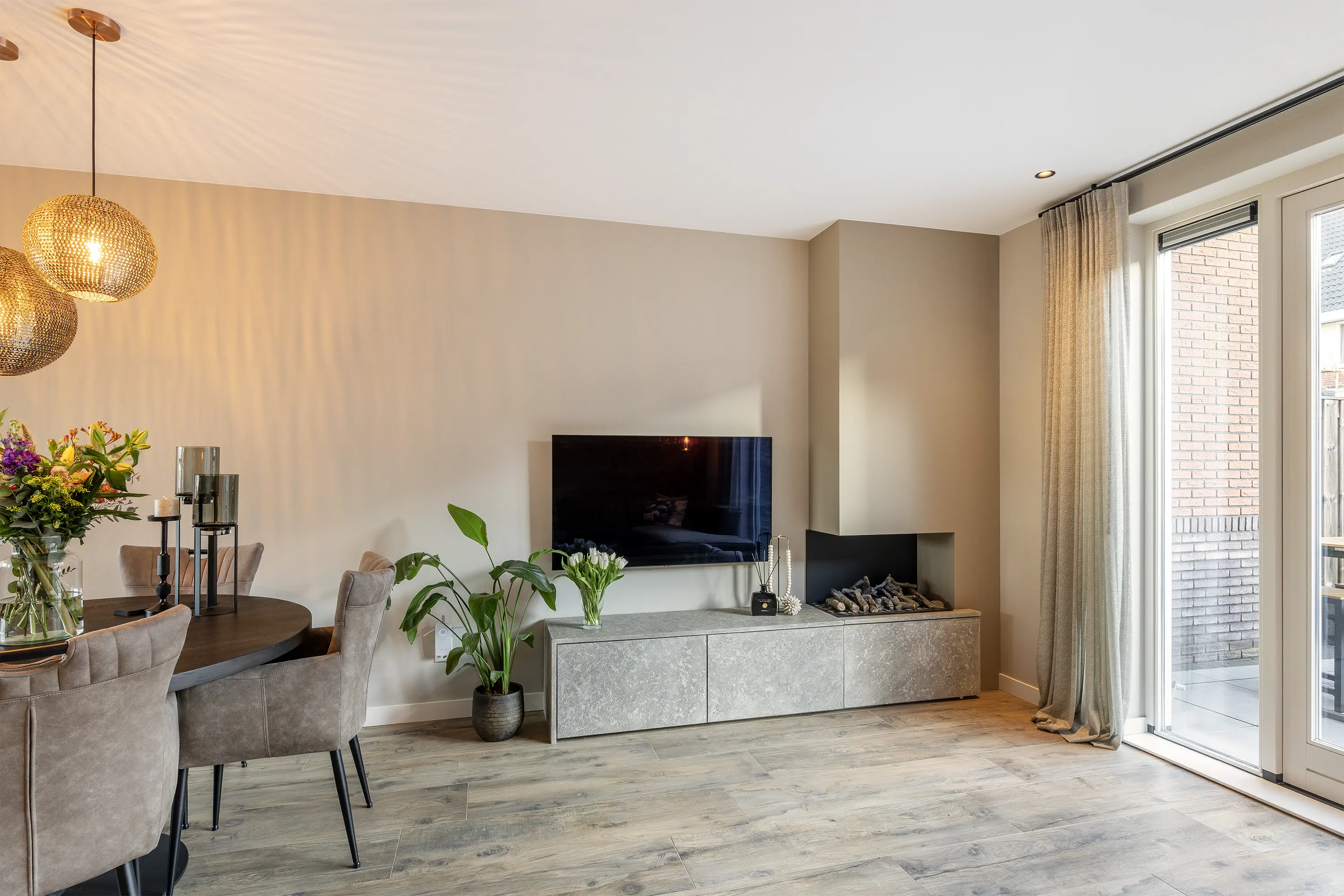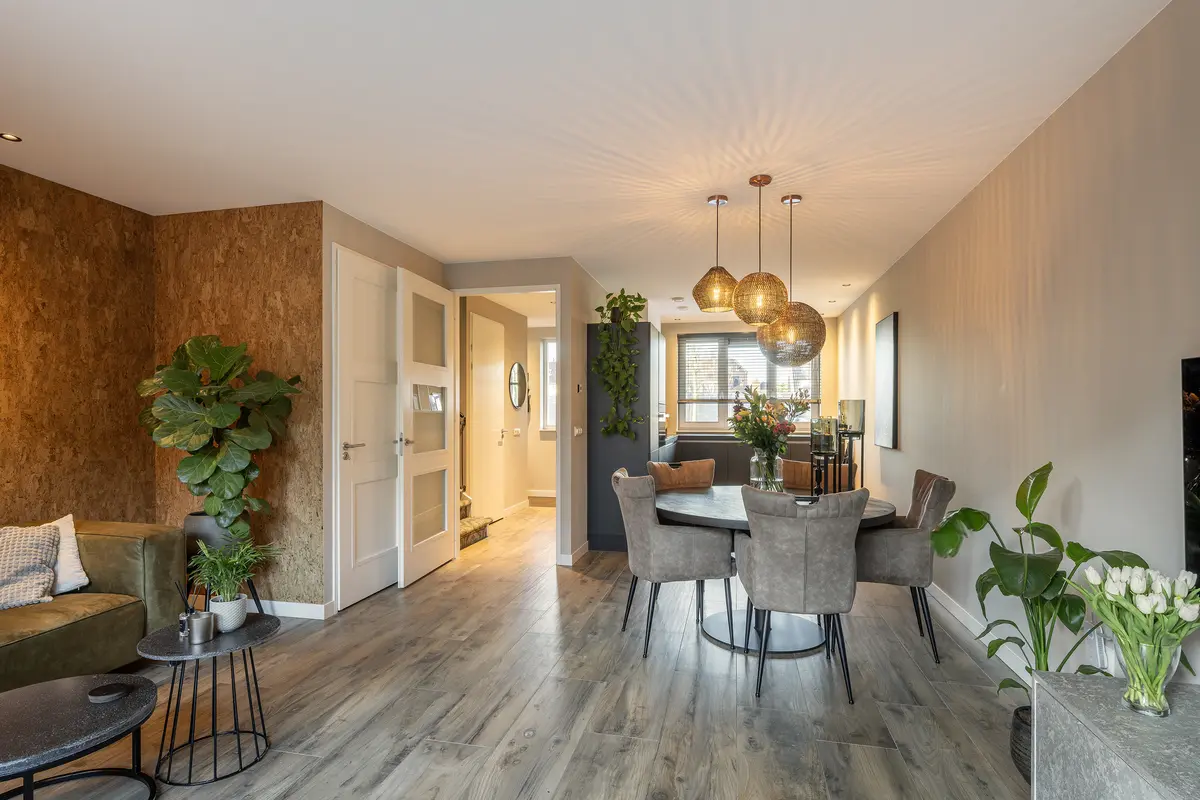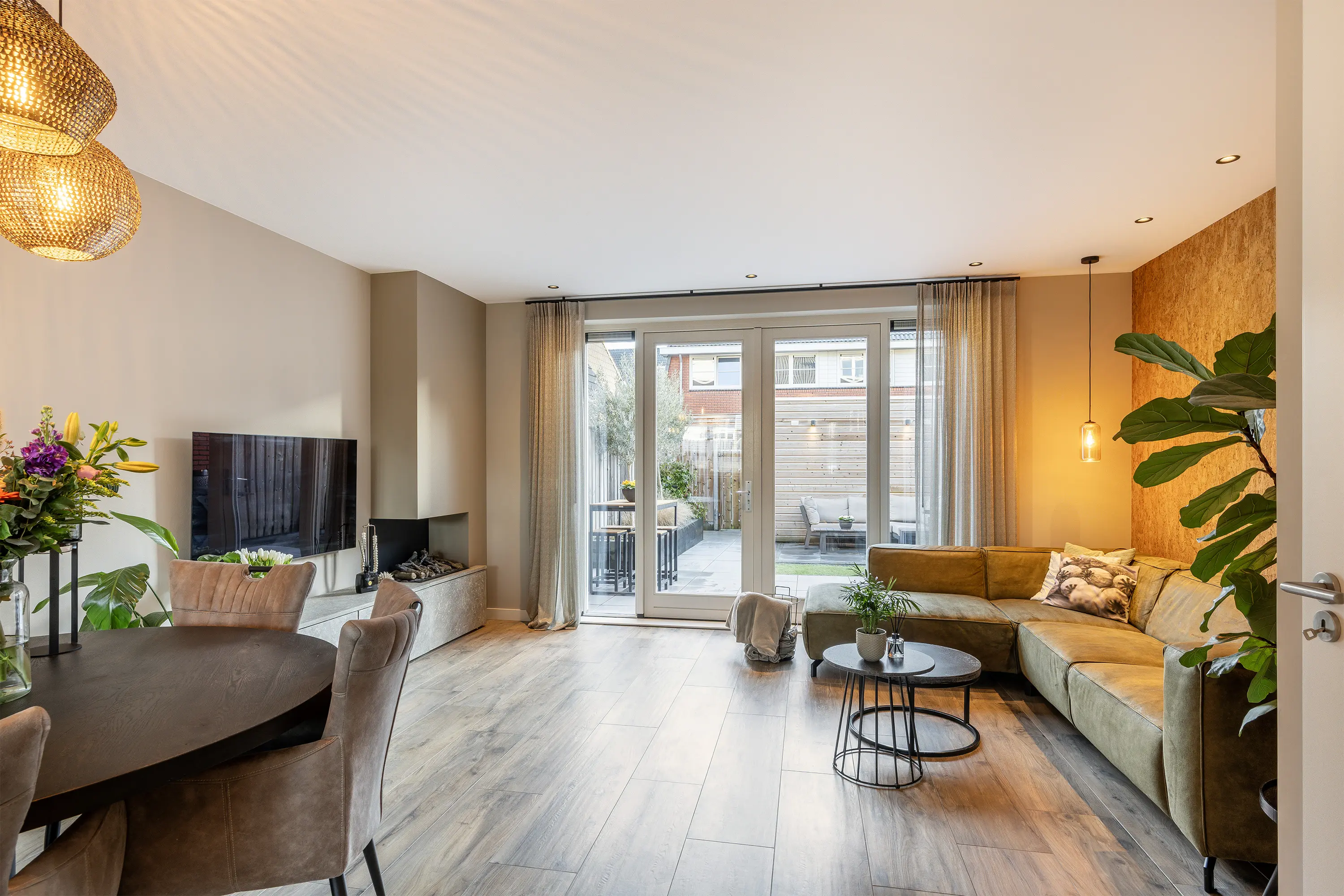 De woonkamer is royaal van opzet en afgewerkt met een stijlvolle stenen vloer met houtlook. Aan de achterzijde van de woning bevindt zich de comfortabele zithoek, grenzend aan de openslaande deuren naar de tuin. Naast de tv is een sfeervolle haard gesitueerd, wat bijdraagt aan een warme en gezellige uitstraling.