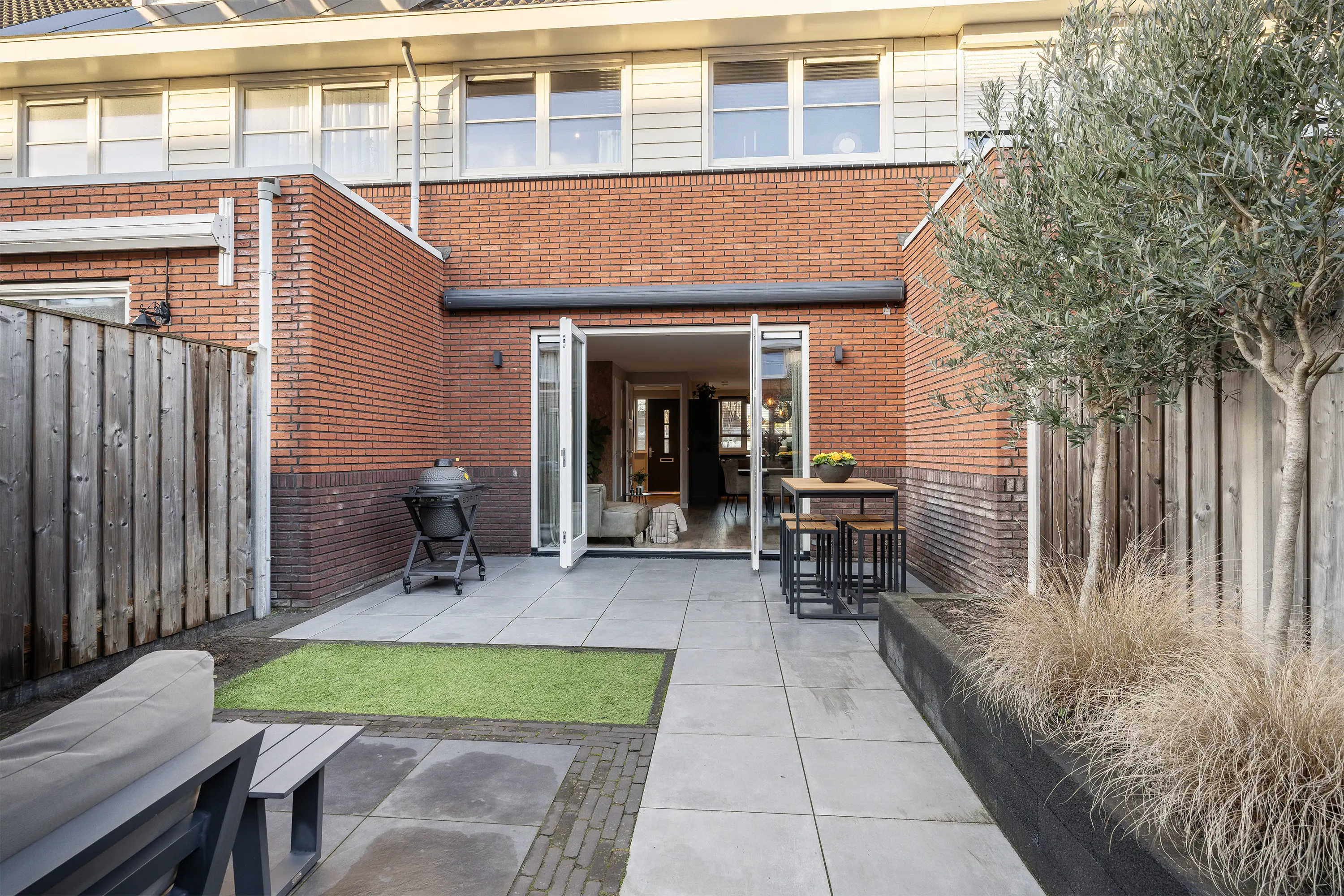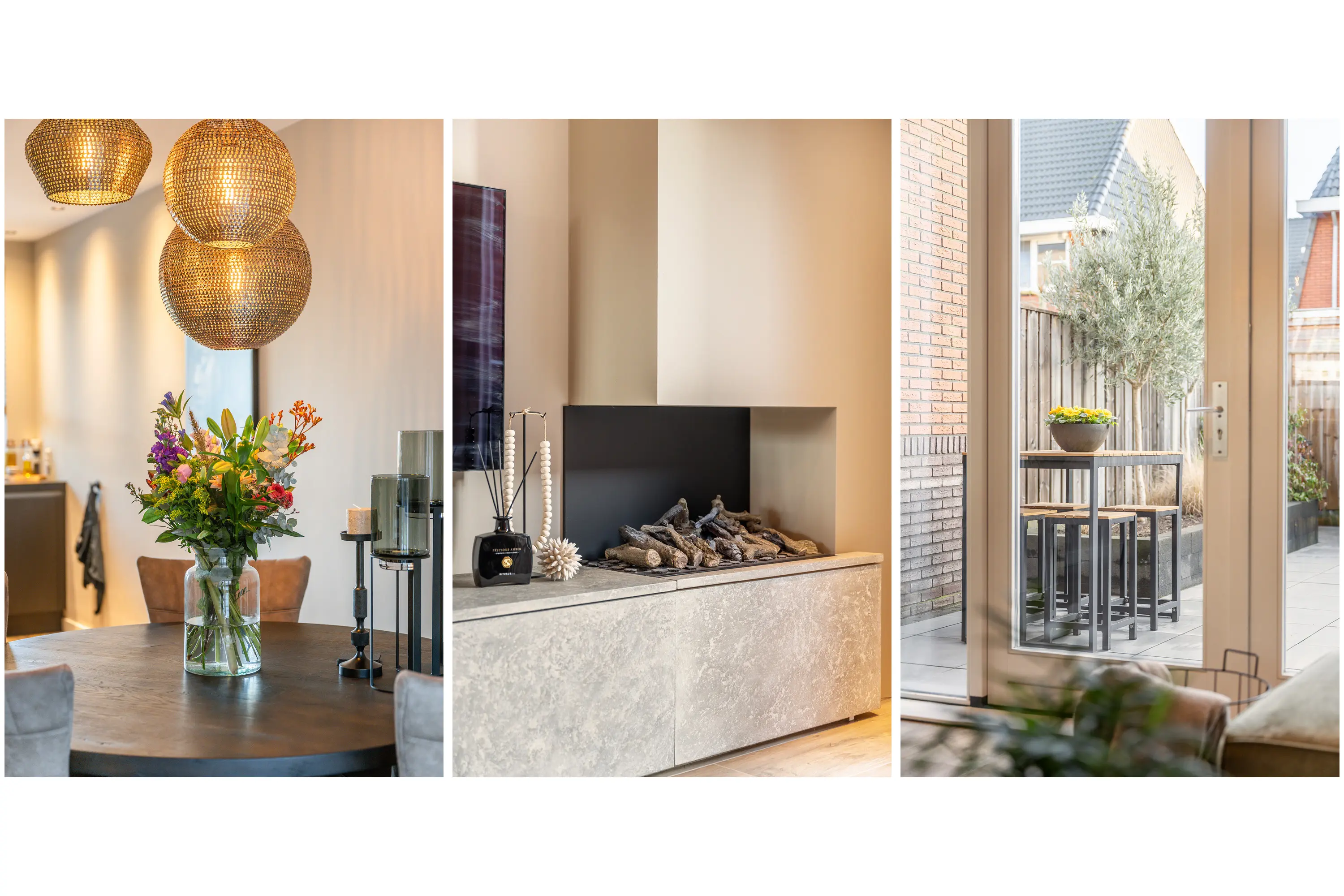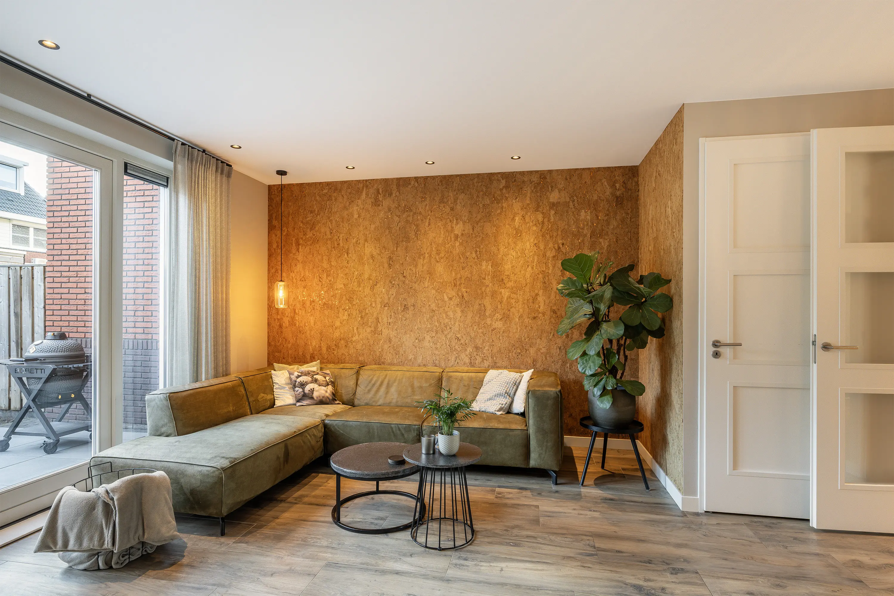 De woonkamer is royaal van opzet en afgewerkt met een stijlvolle stenen vloer met houtlook. Aan de achterzijde van de woning bevindt zich de comfortabele zithoek, grenzend aan de openslaande deuren naar de tuin. Naast de tv is een sfeervolle haard gesitueerd, wat bijdraagt aan een warme en gezellige uitstraling.