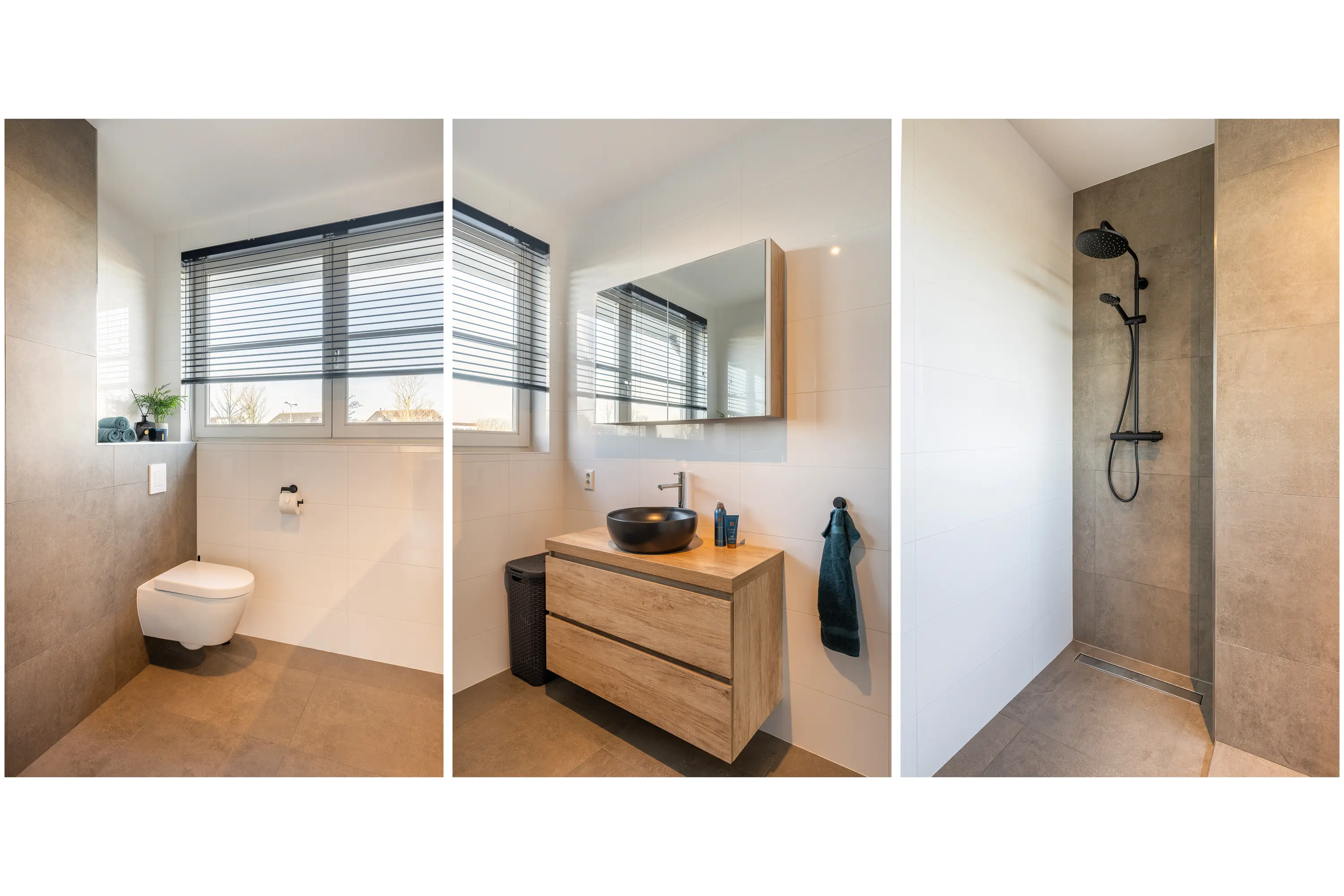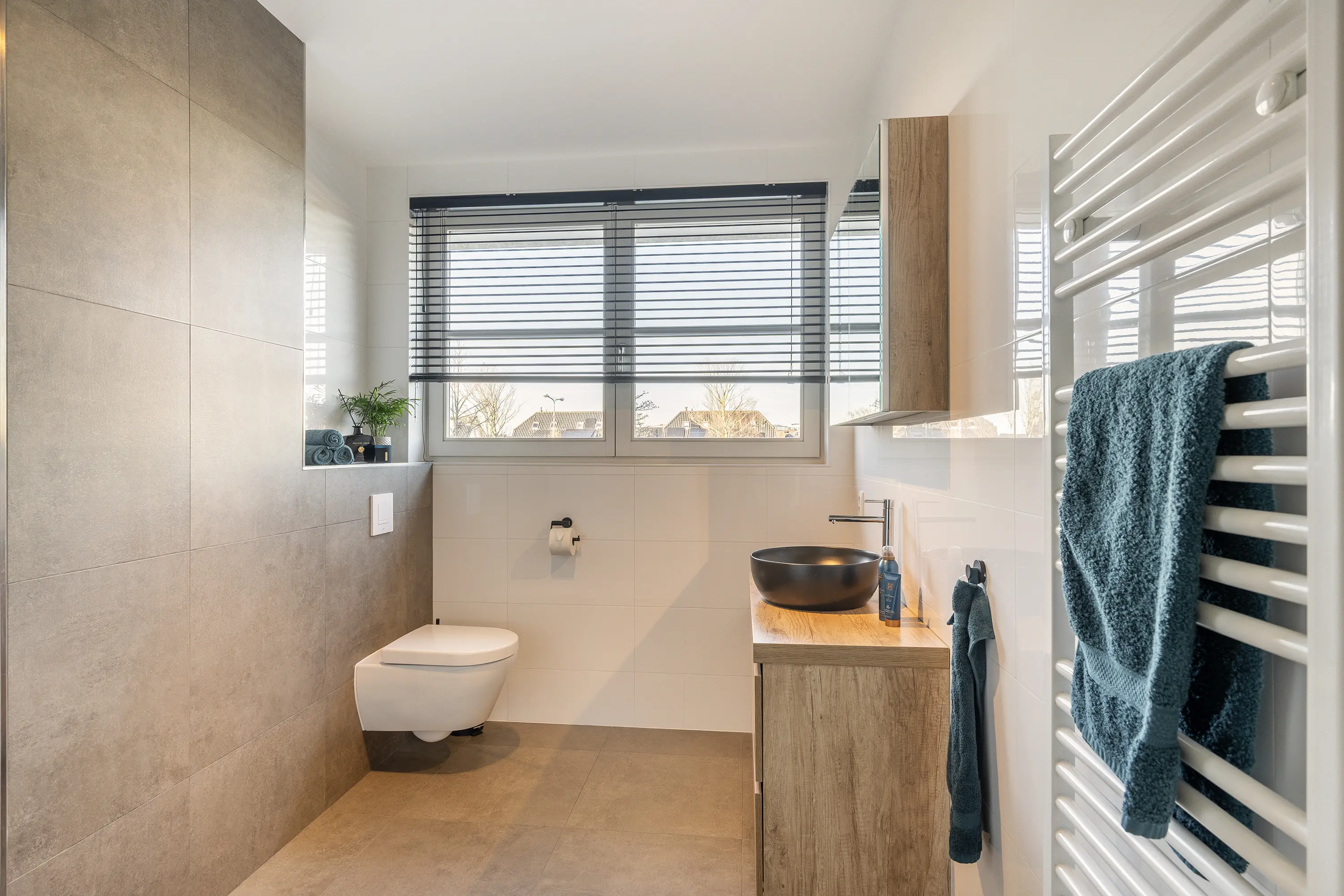 De badkamer is eveneens aan de voorzijde van de woning gesitueerd. Deze is voorzien van een inloopdouche, een wastafelmeubel en een toilet. Daarnaast beschikt de badkamer over een raampartij, waardoor natuurlijke ventilatie mogelijk is. De badkamer is afgewerkt met een combinatie van witte tegels en bruin/grijs getinte tegels, wat zorgt voor een tijdloze en verzorgde uitstraling.