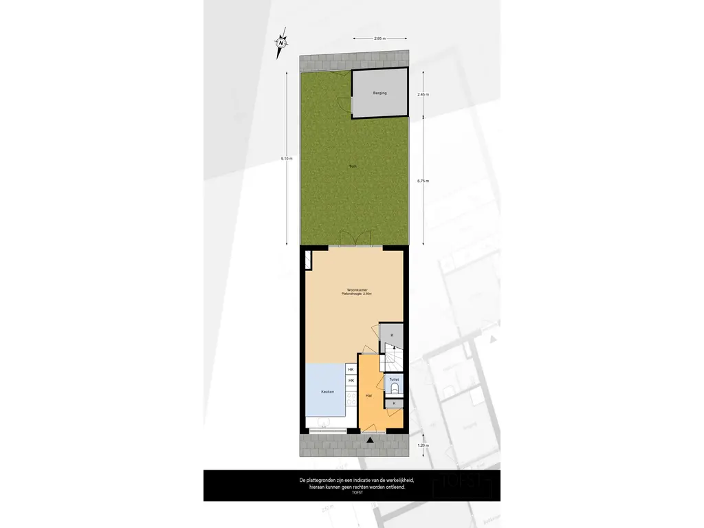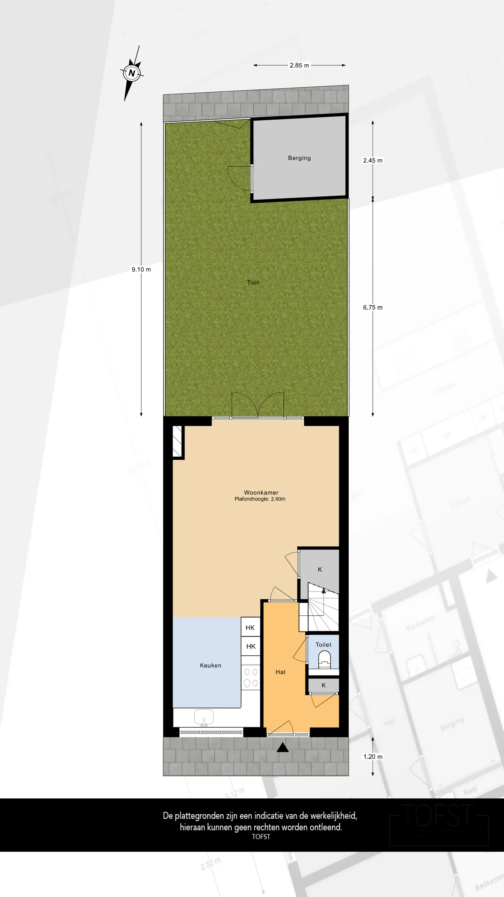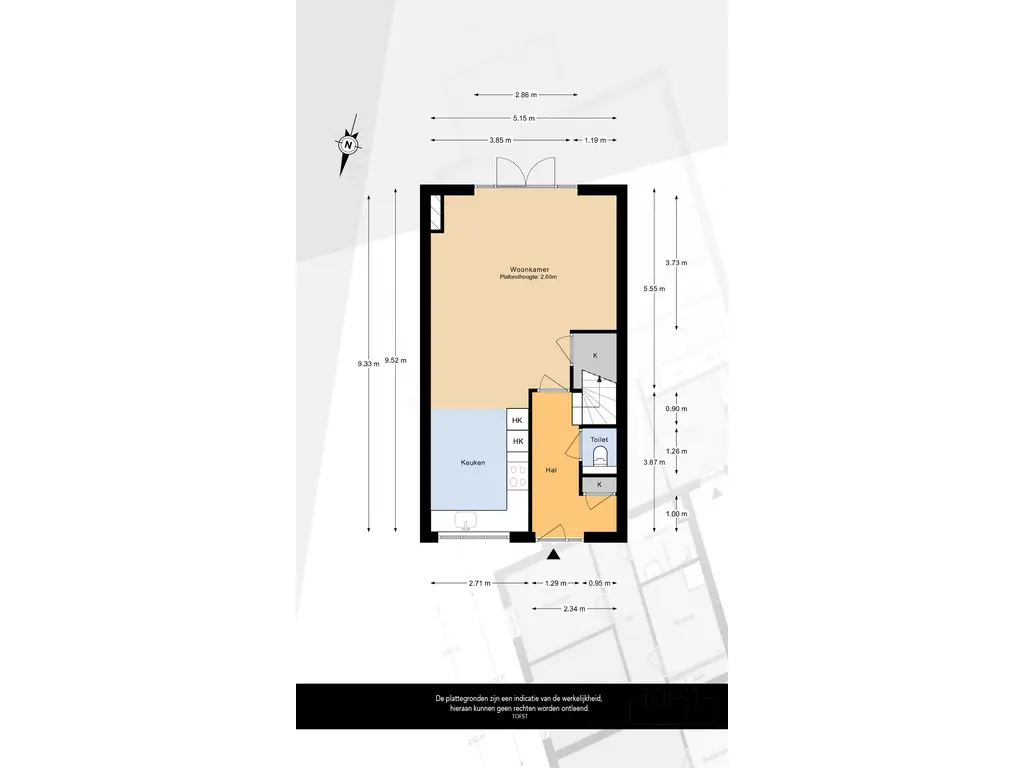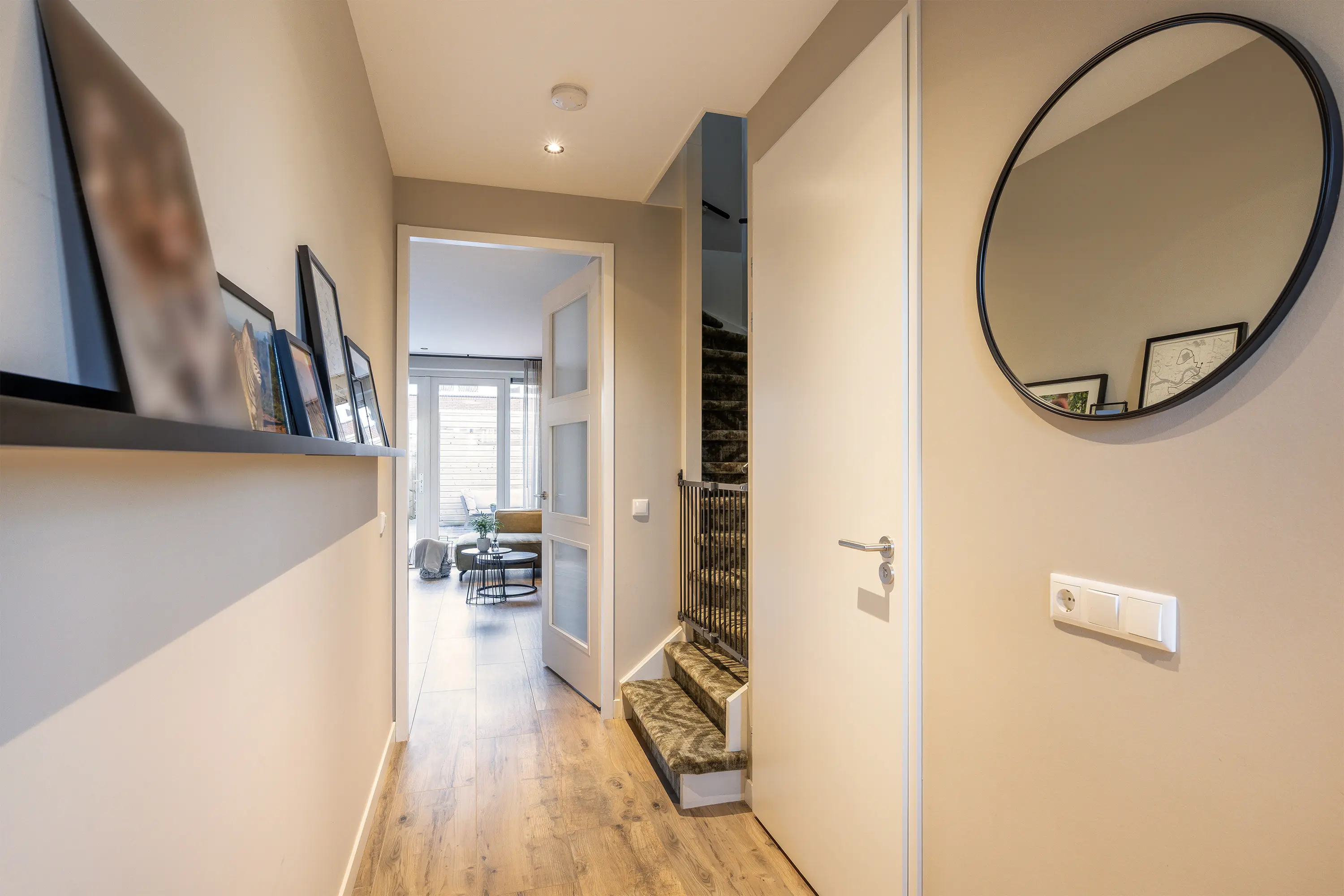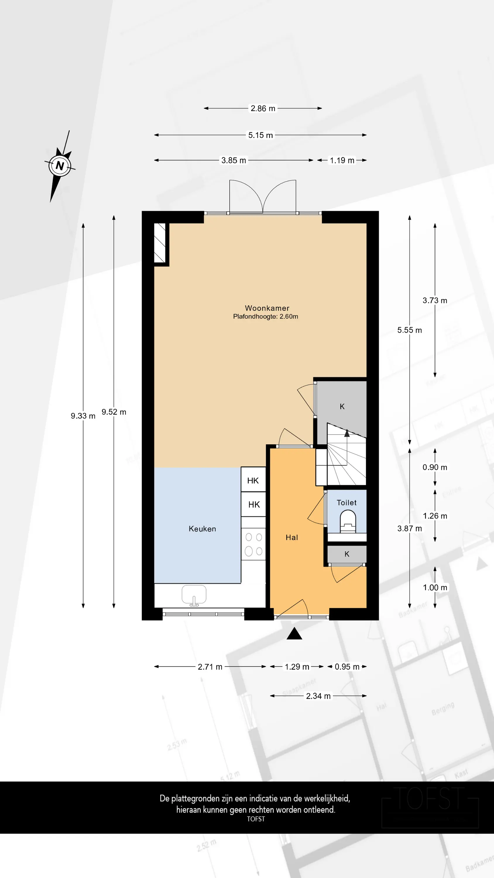 Via de Fossastraat bereikt u de entree van de woning. Bij binnenkomst komt u in de hal, die toegang biedt tot het toilet, de meterkast, de trap naar de eerste verdieping en de deur naar de woonkamer.